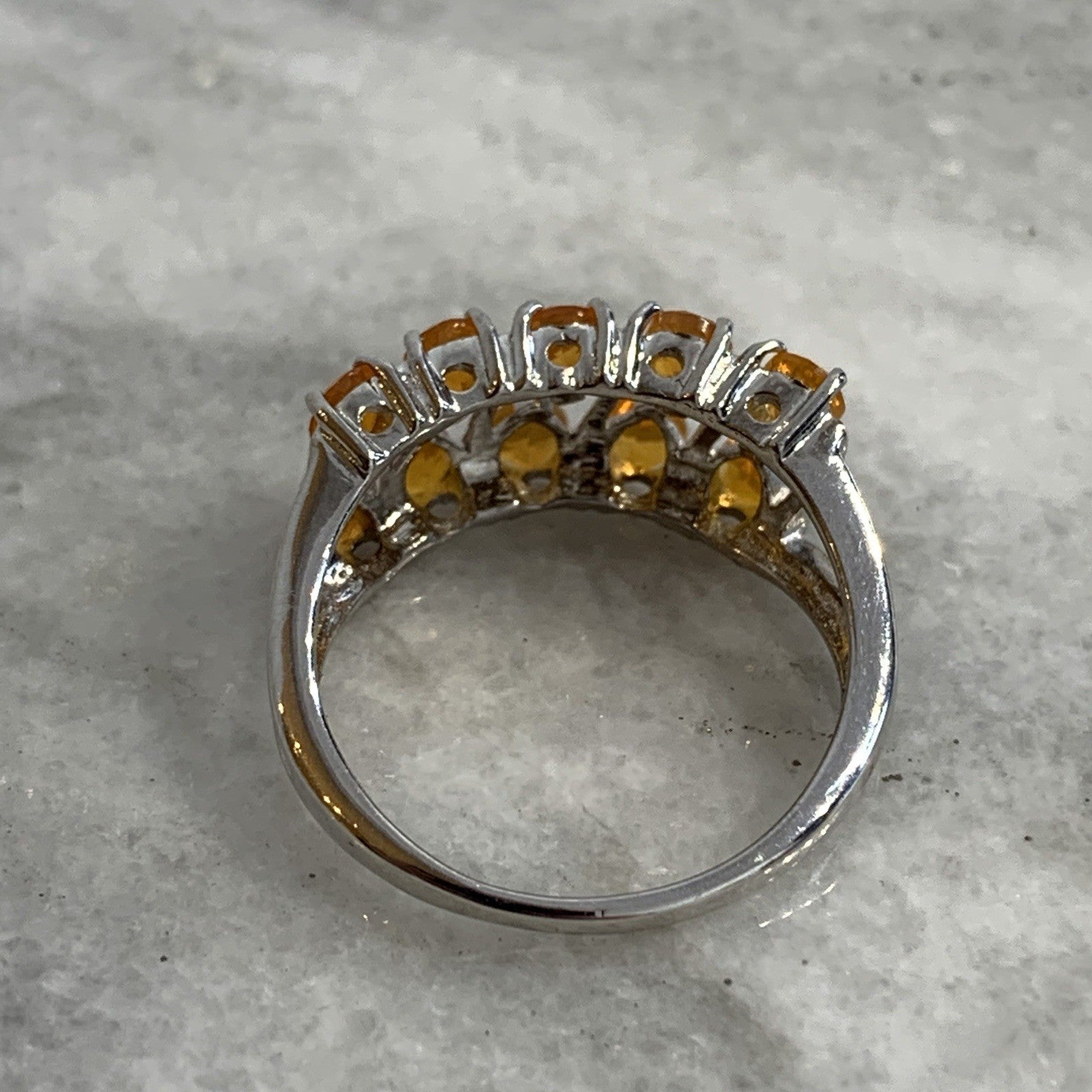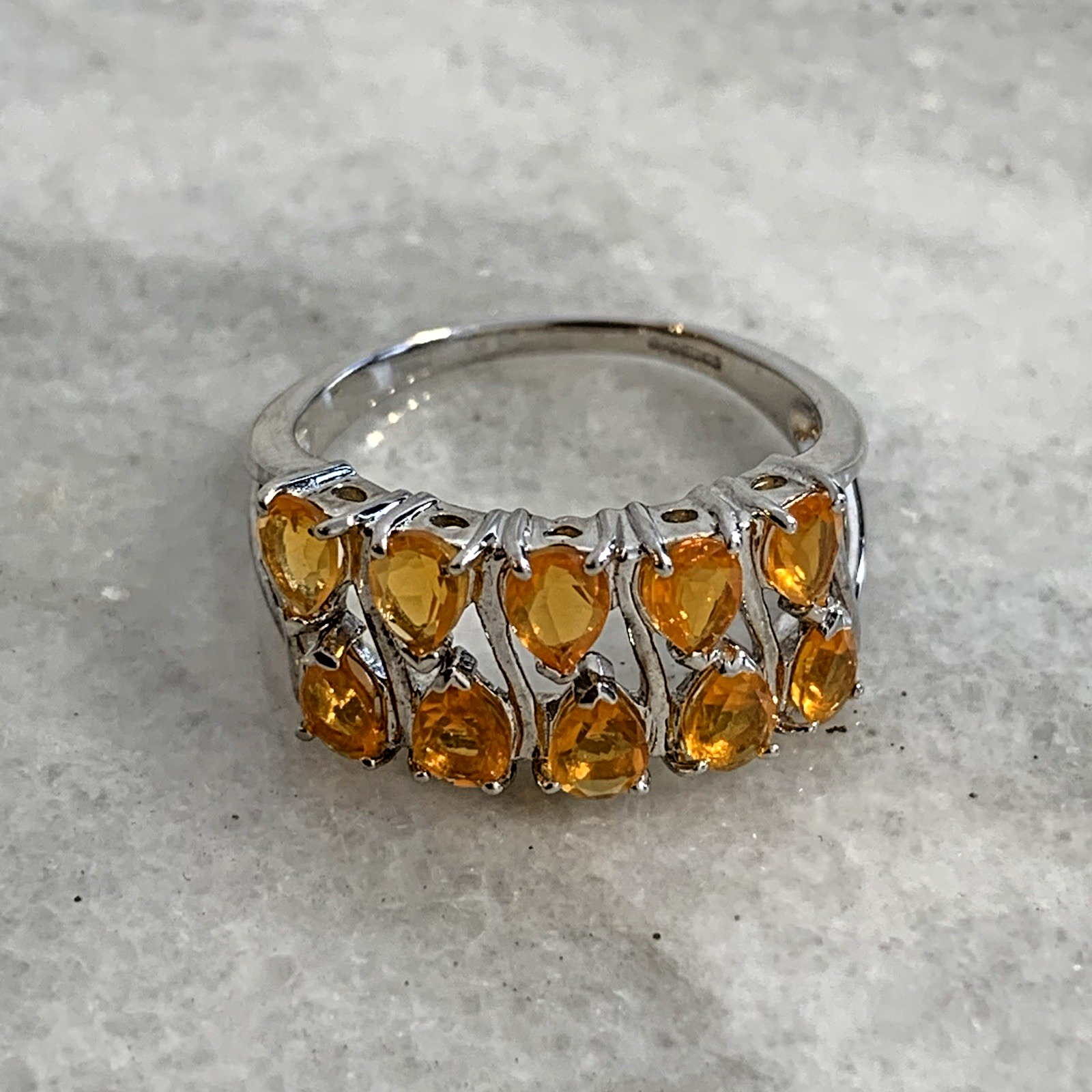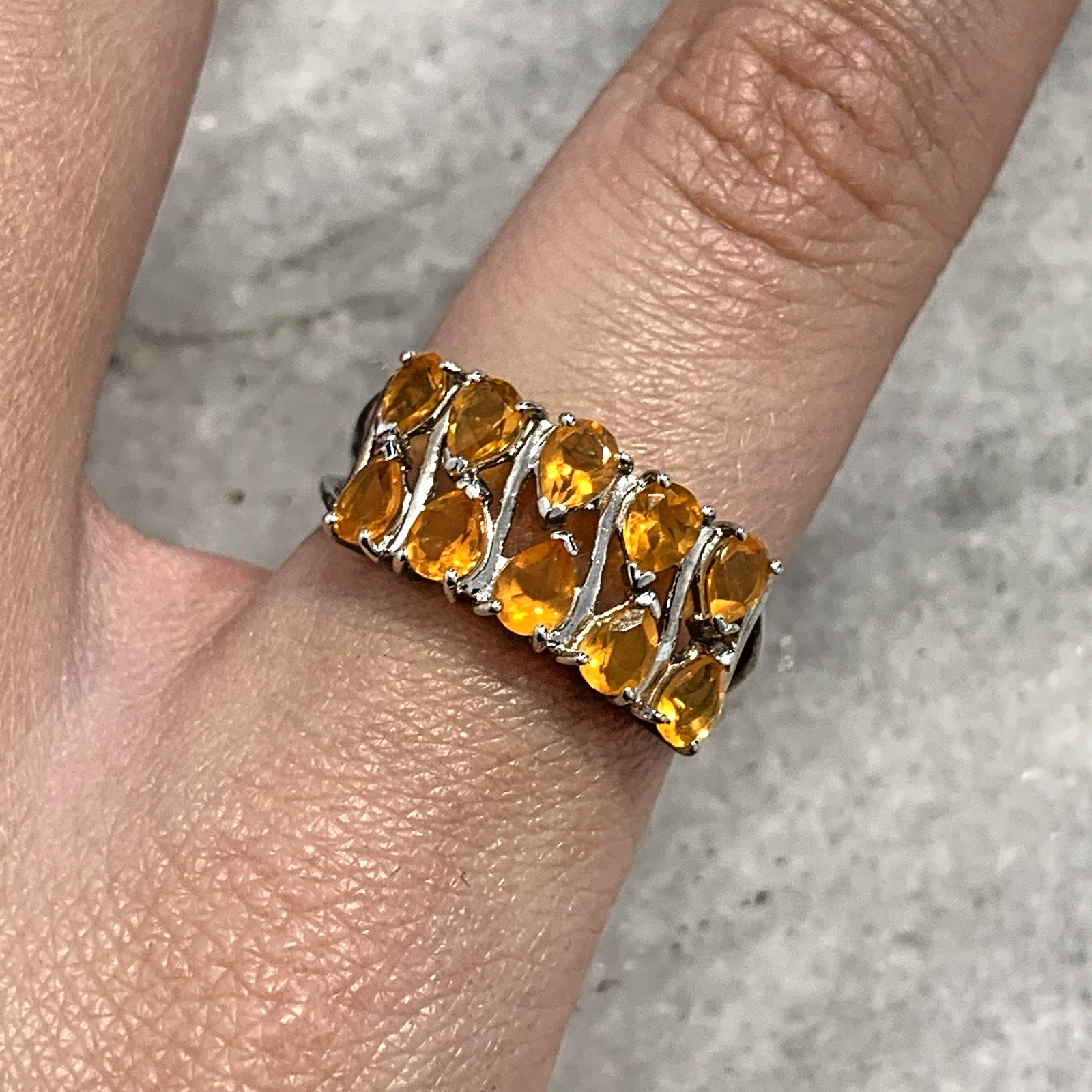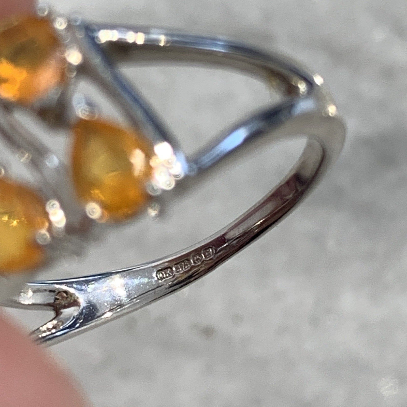 - A stunning white gold ring showcasing an ornate cluster of pear cut fire opal gemstones at .87ct.