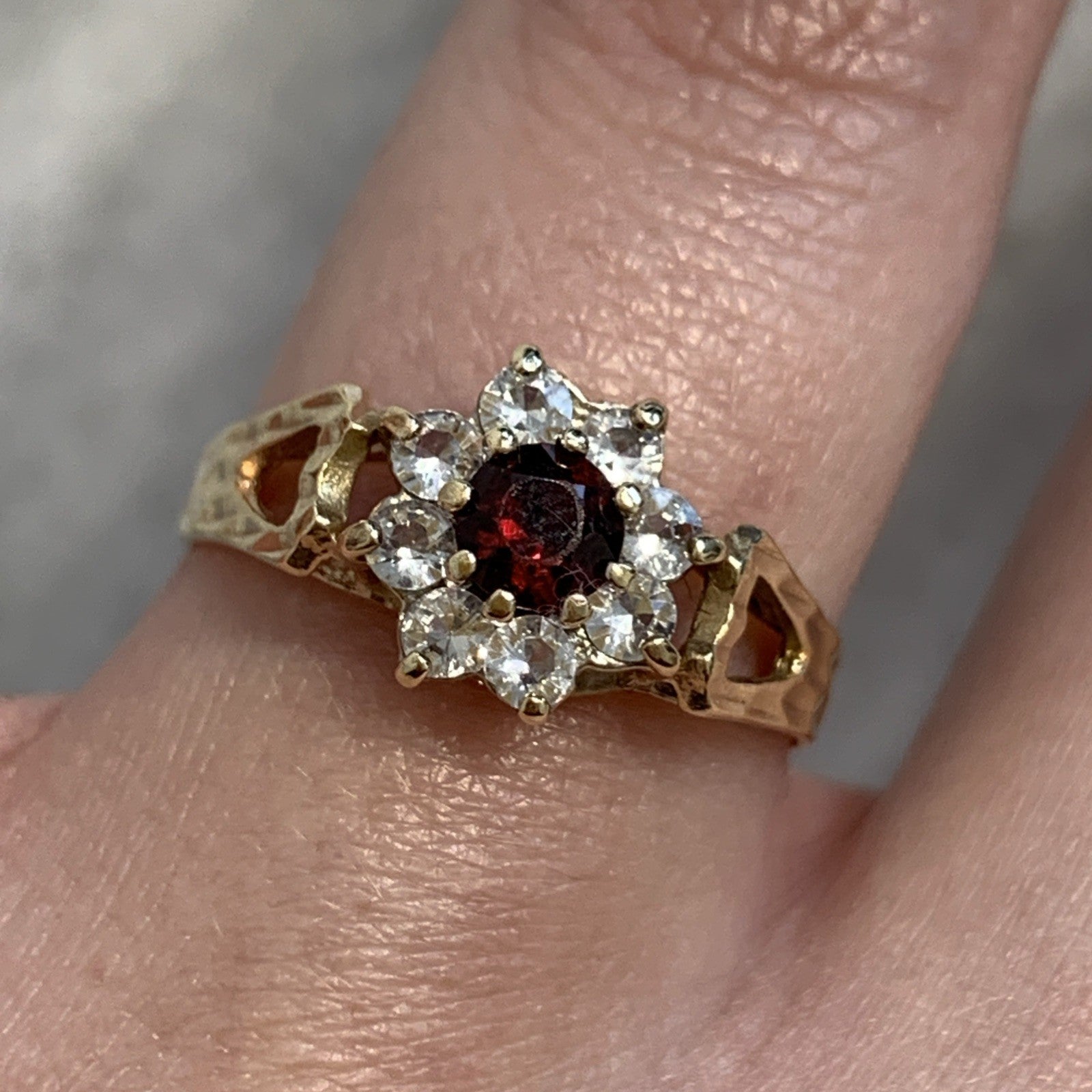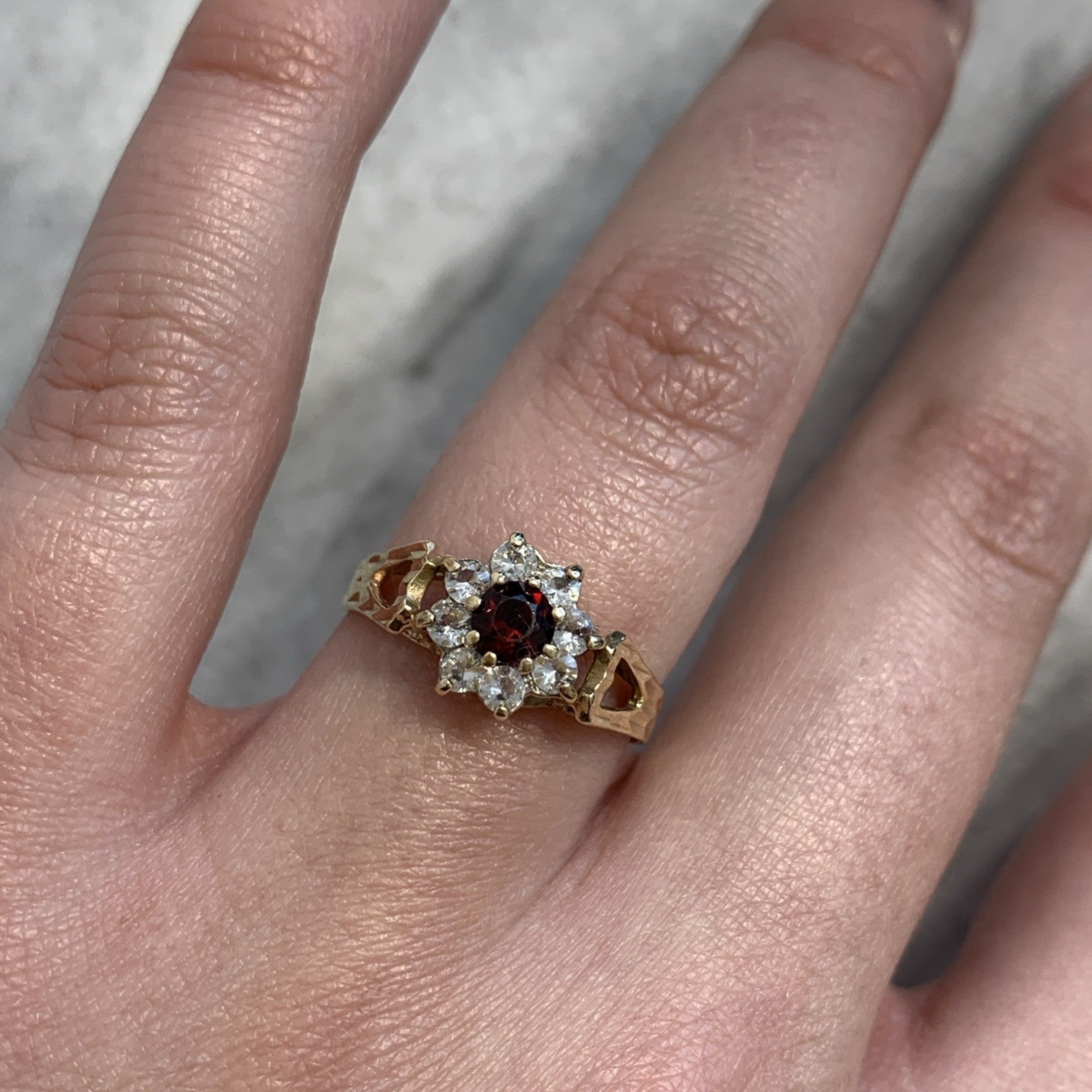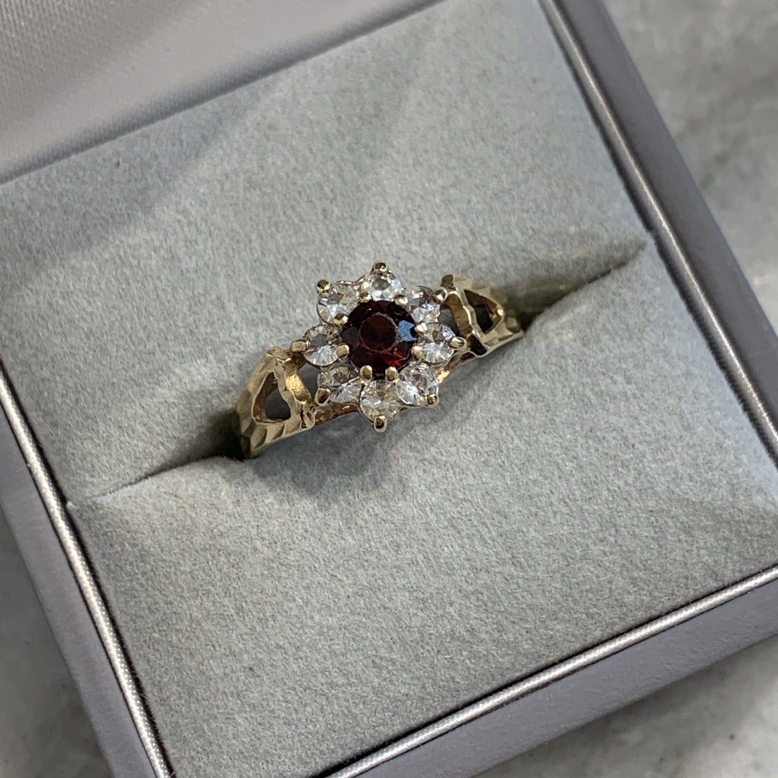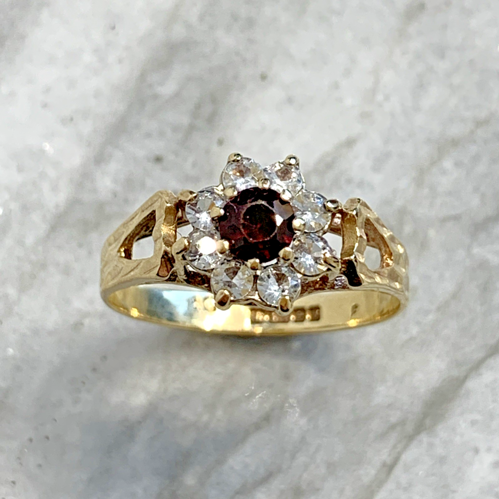 - A charming gold ring featuring a daisy flower style cluster of garnet and cubic zirconia.