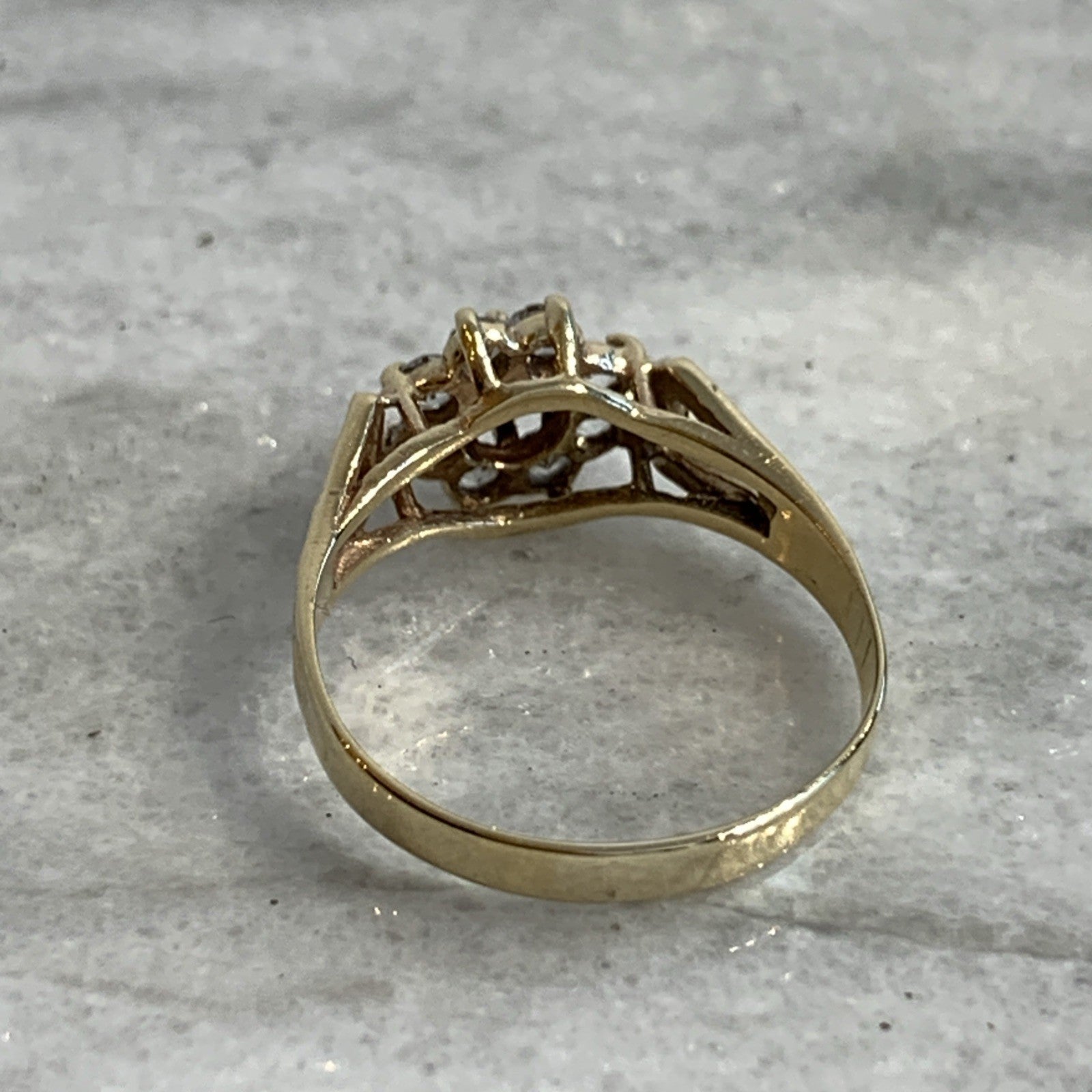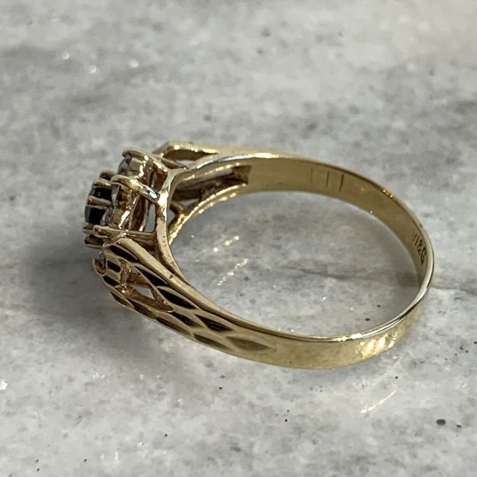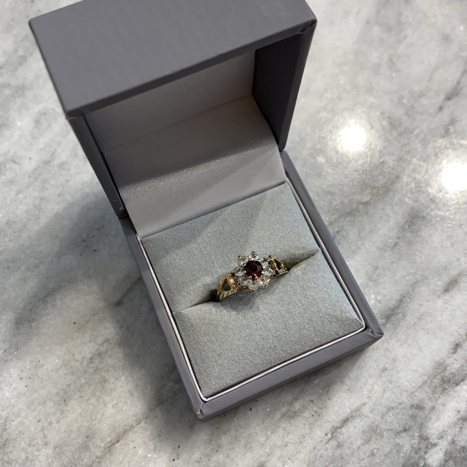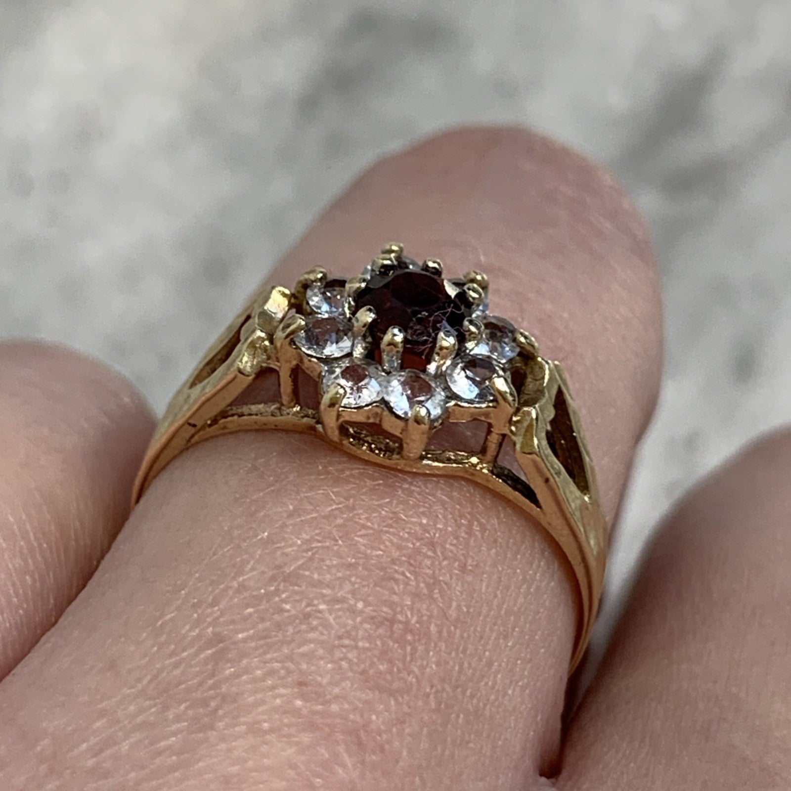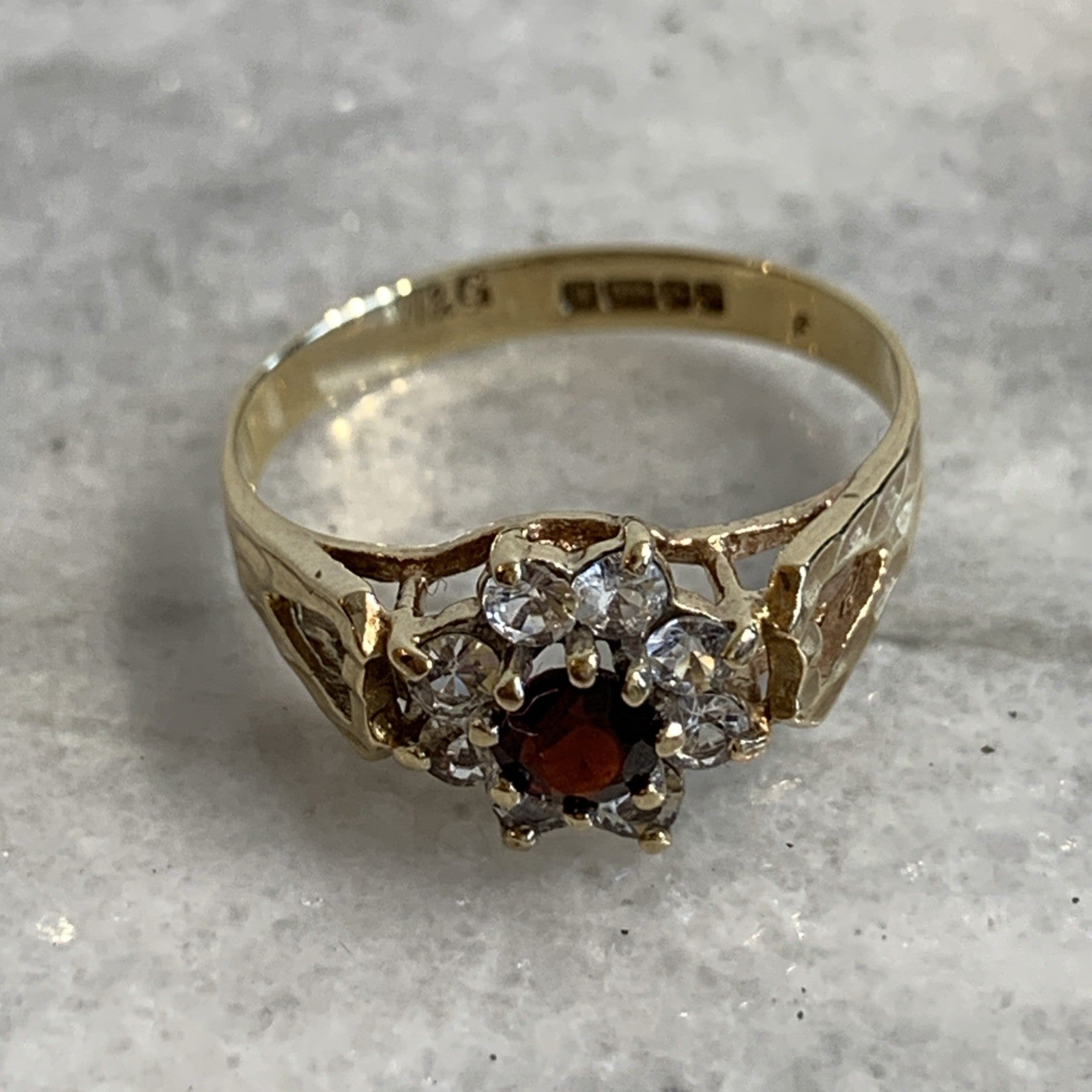 - A charming gold ring featuring a daisy flower style cluster of garnet and cubic zirconia.