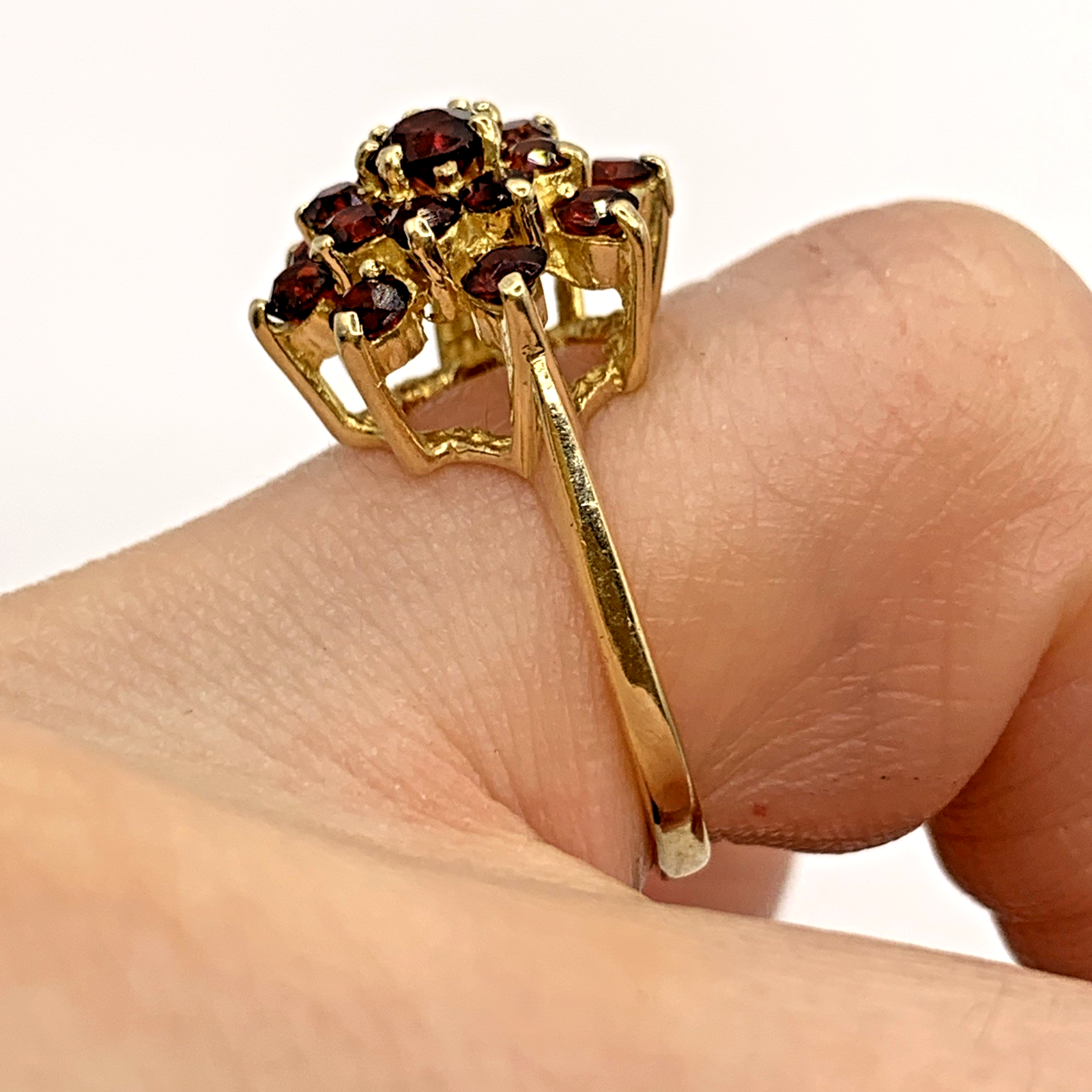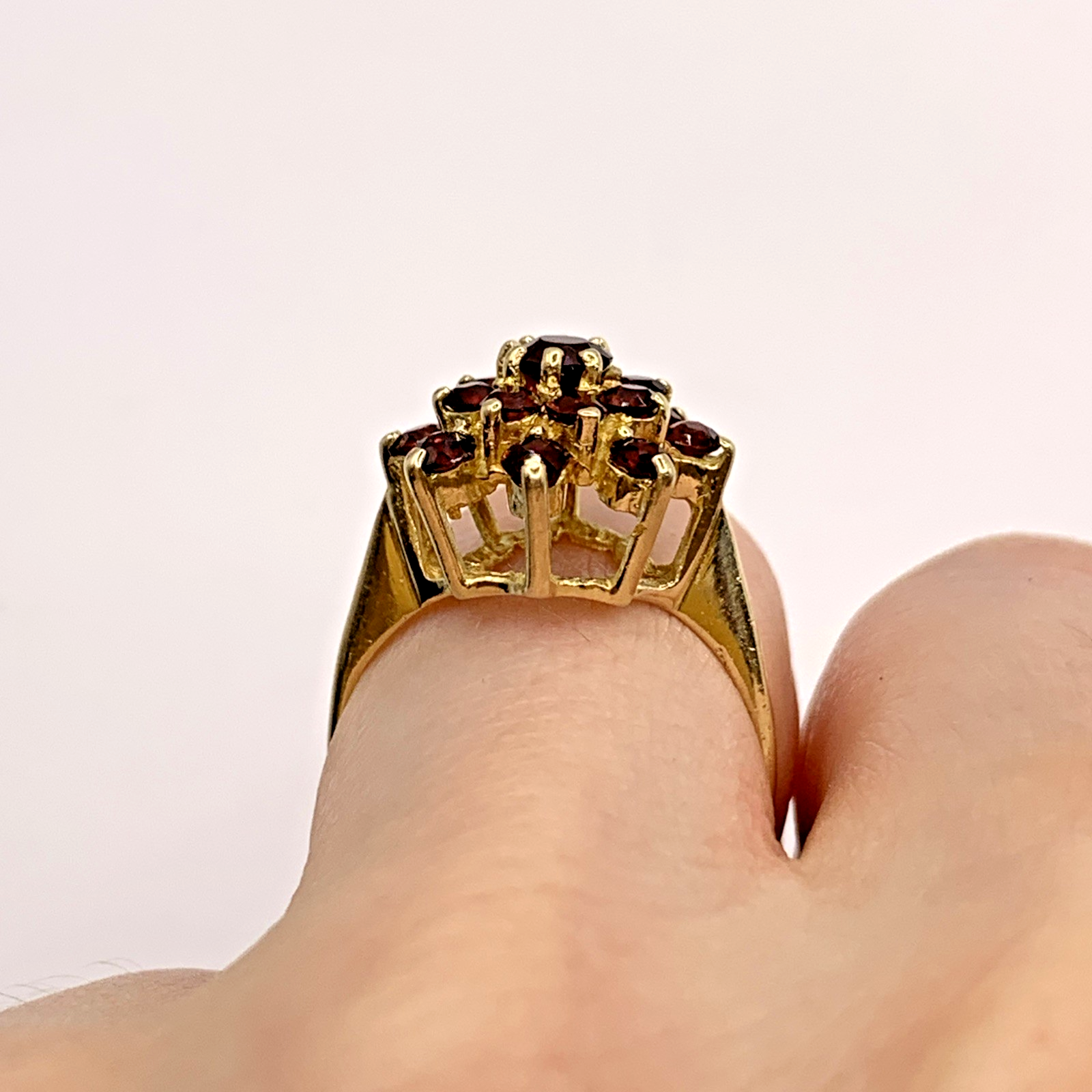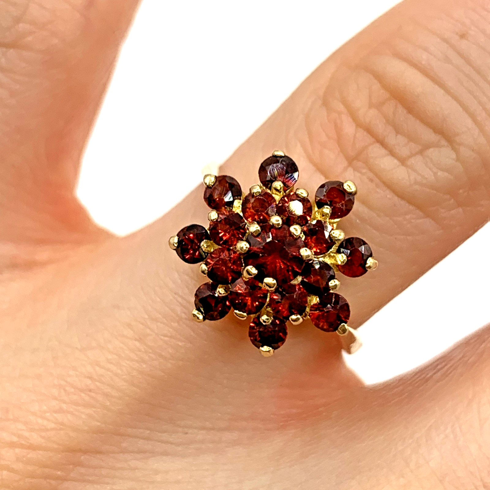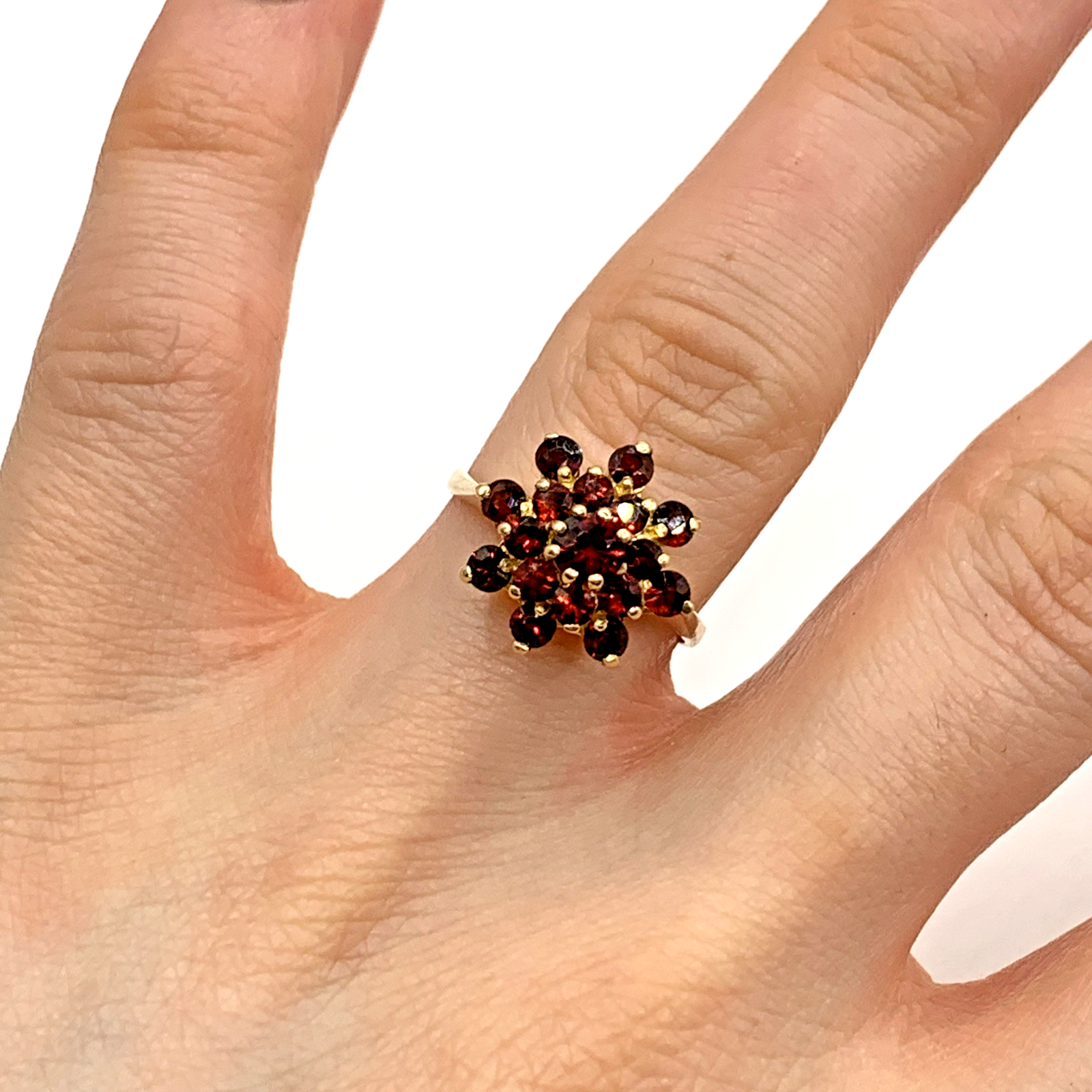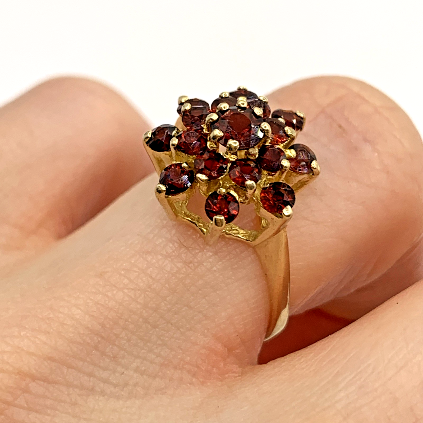 A gorgeous gold ring showcasing a floral cluster of round cut garnets.