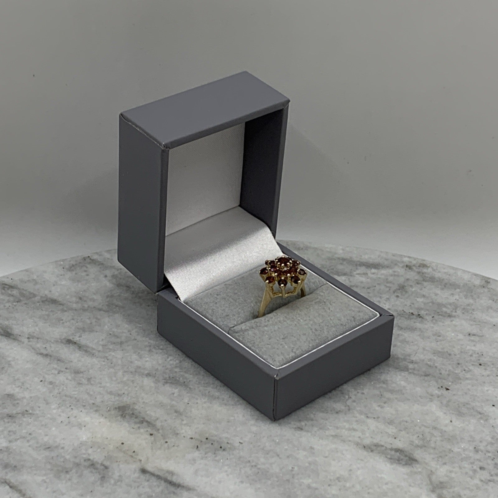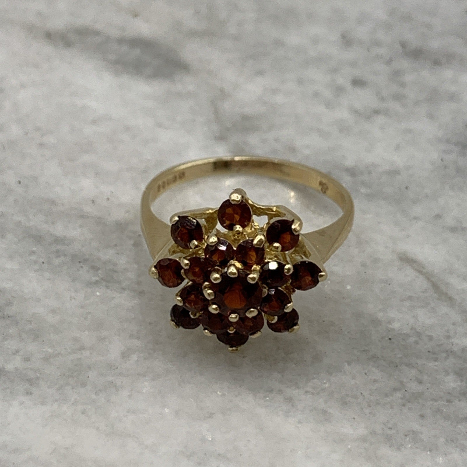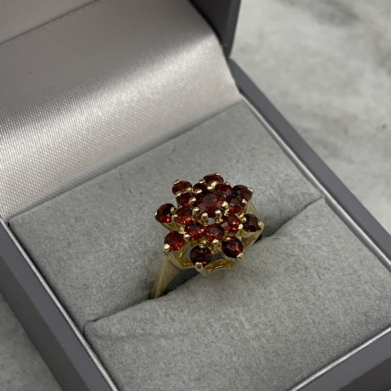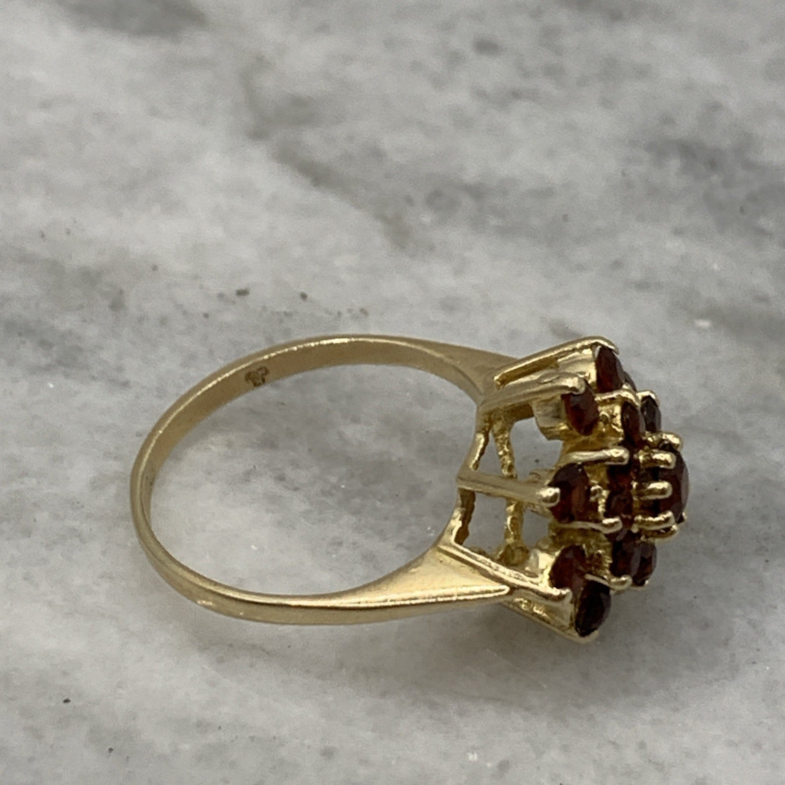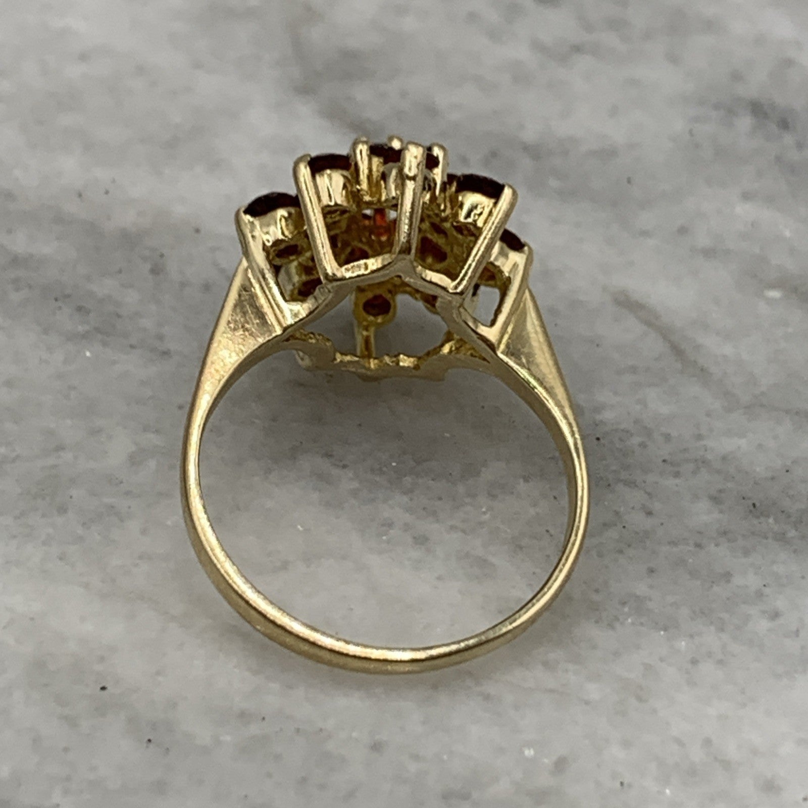 A gorgeous gold ring showcasing a floral cluster of round cut garnets.
