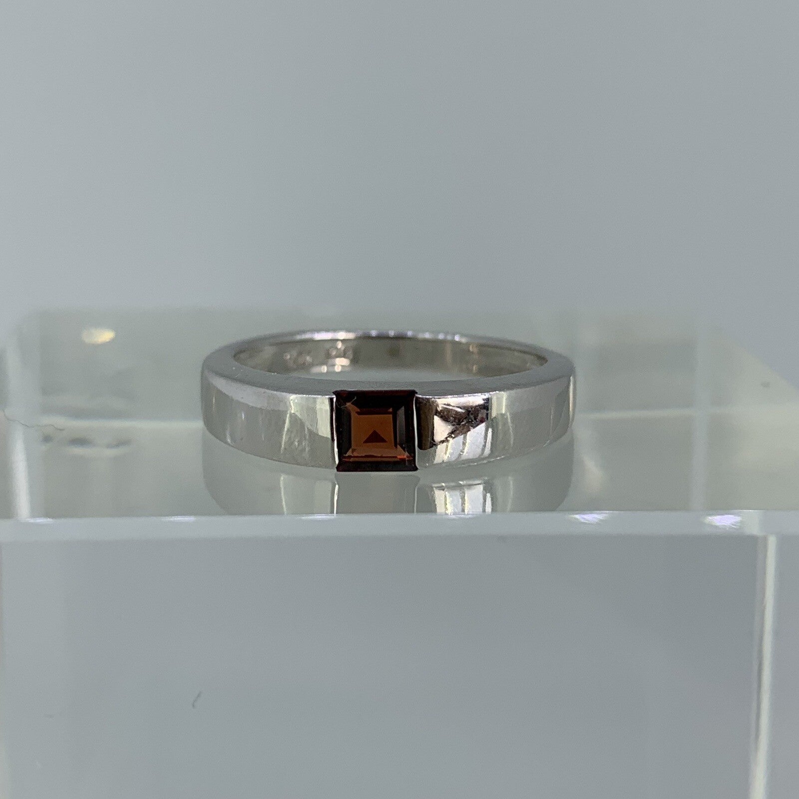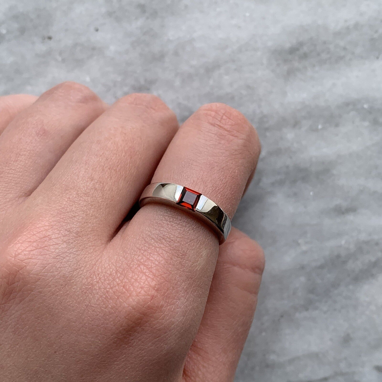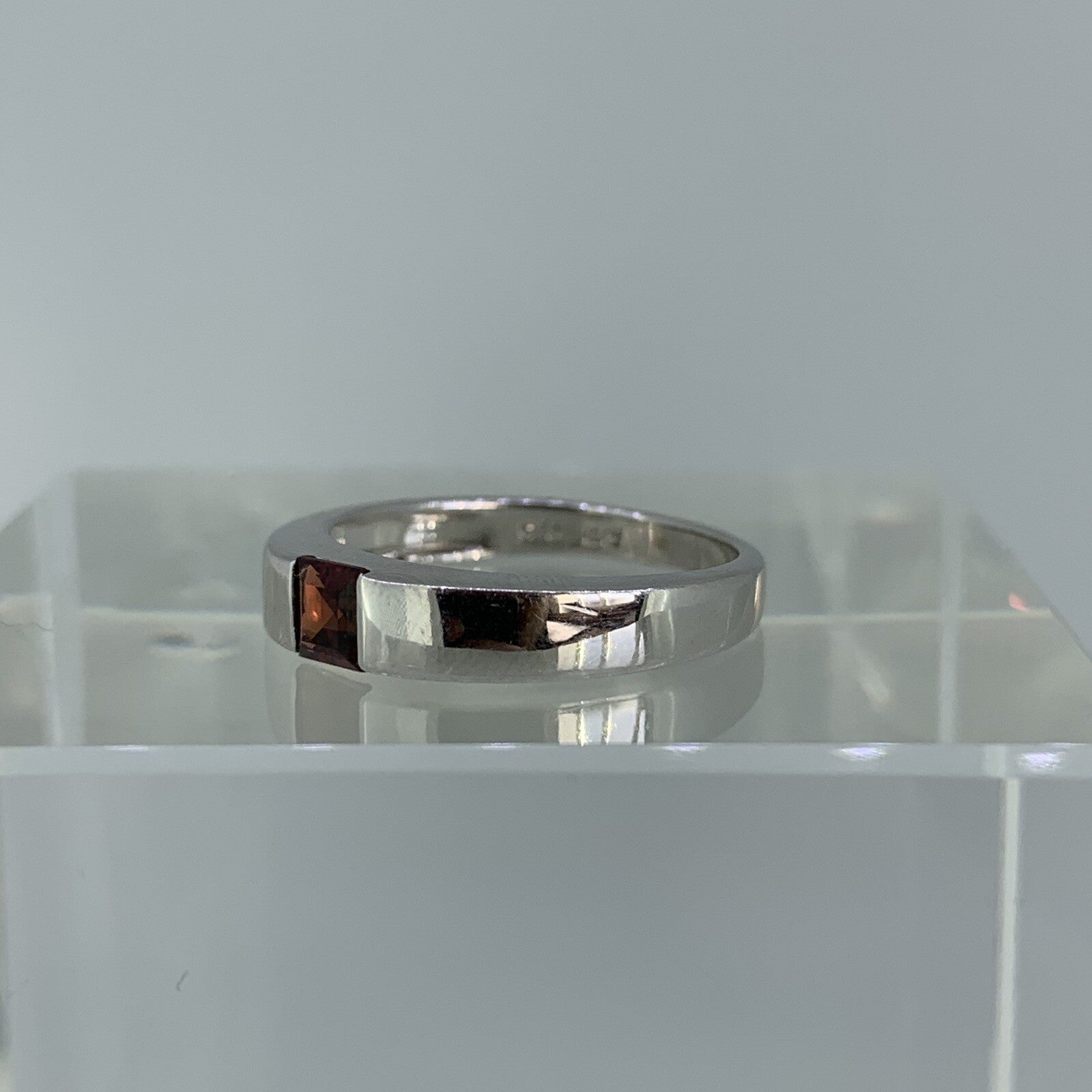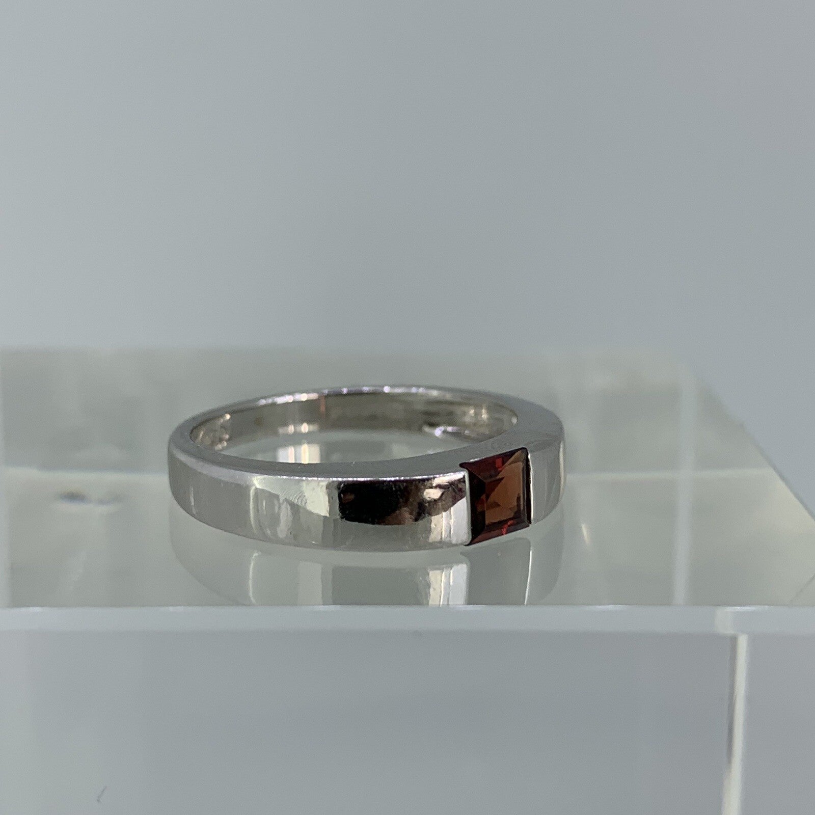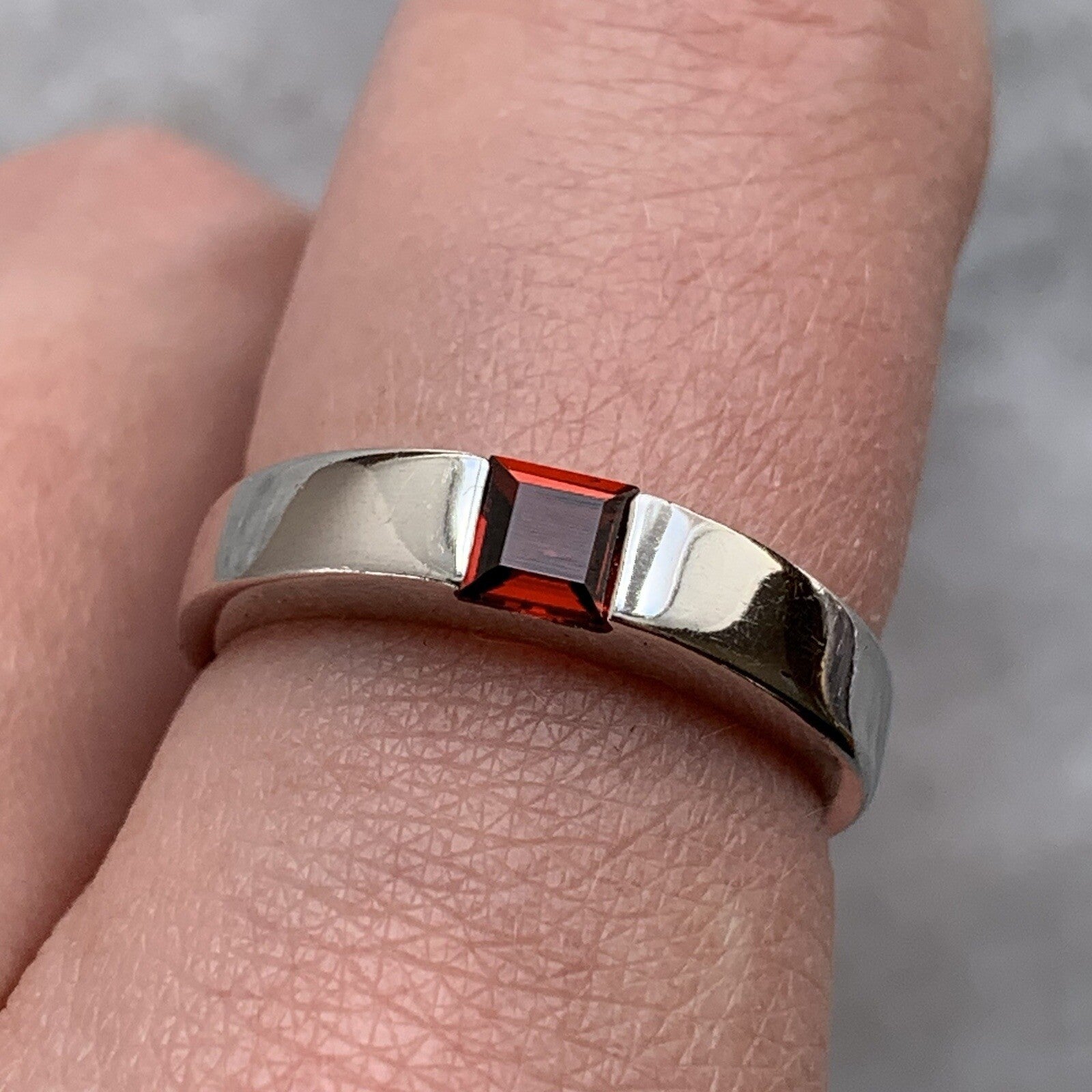 A beautiful solitaire ring featuring a square cut garnet gemstone in a channel tension setting.