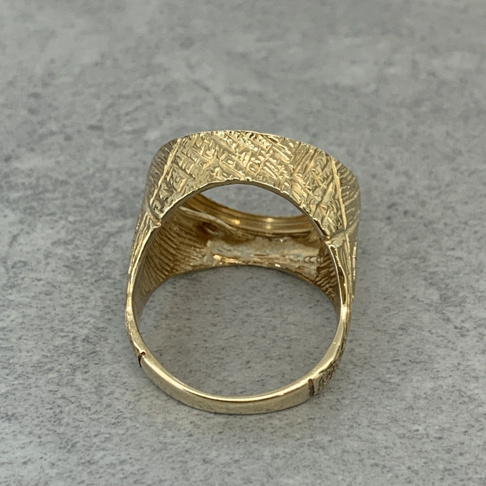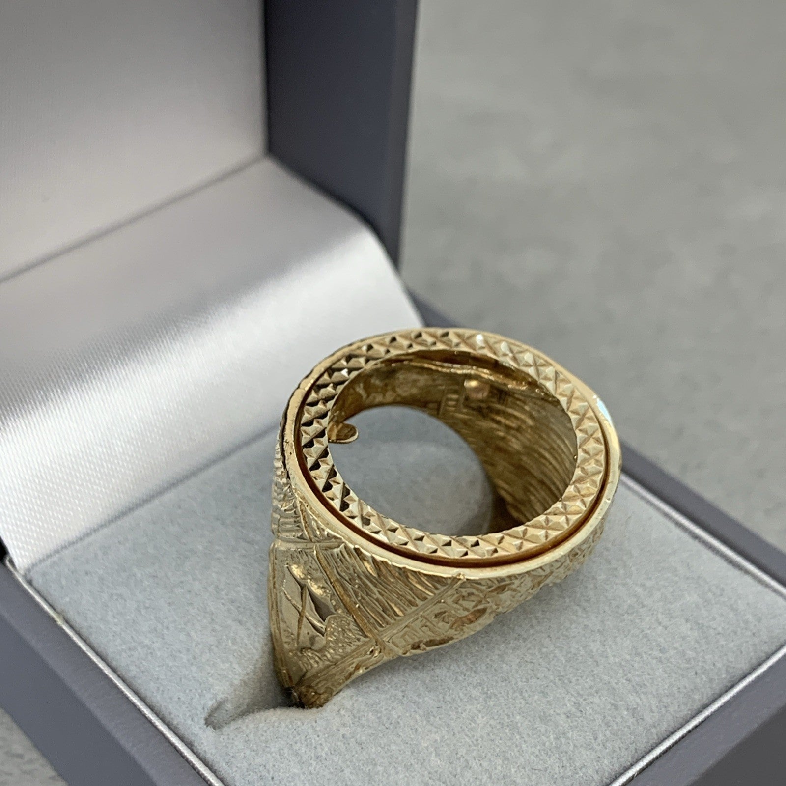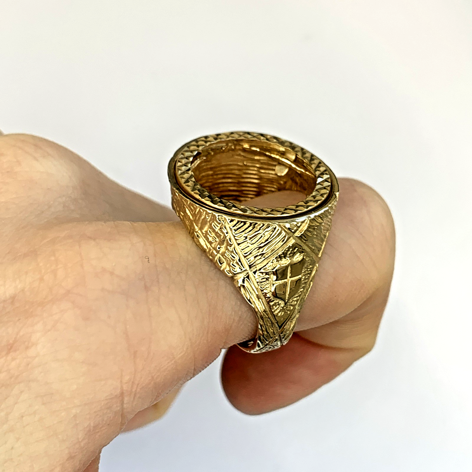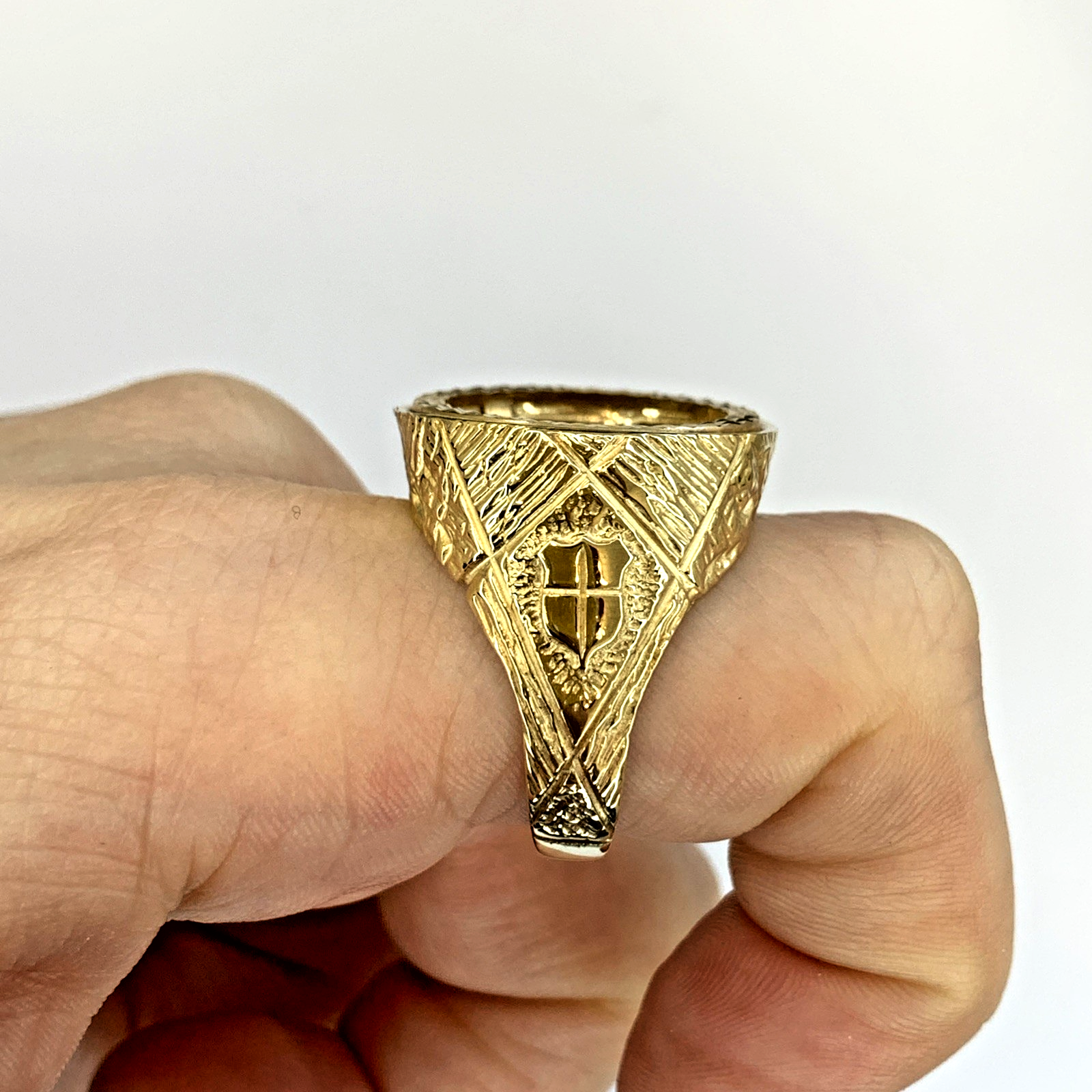 A timeless gold half sovereign mount ring with bark finishing on the shoulders and a shield motif.