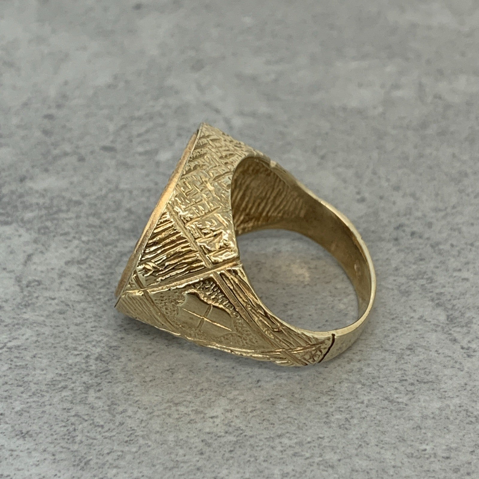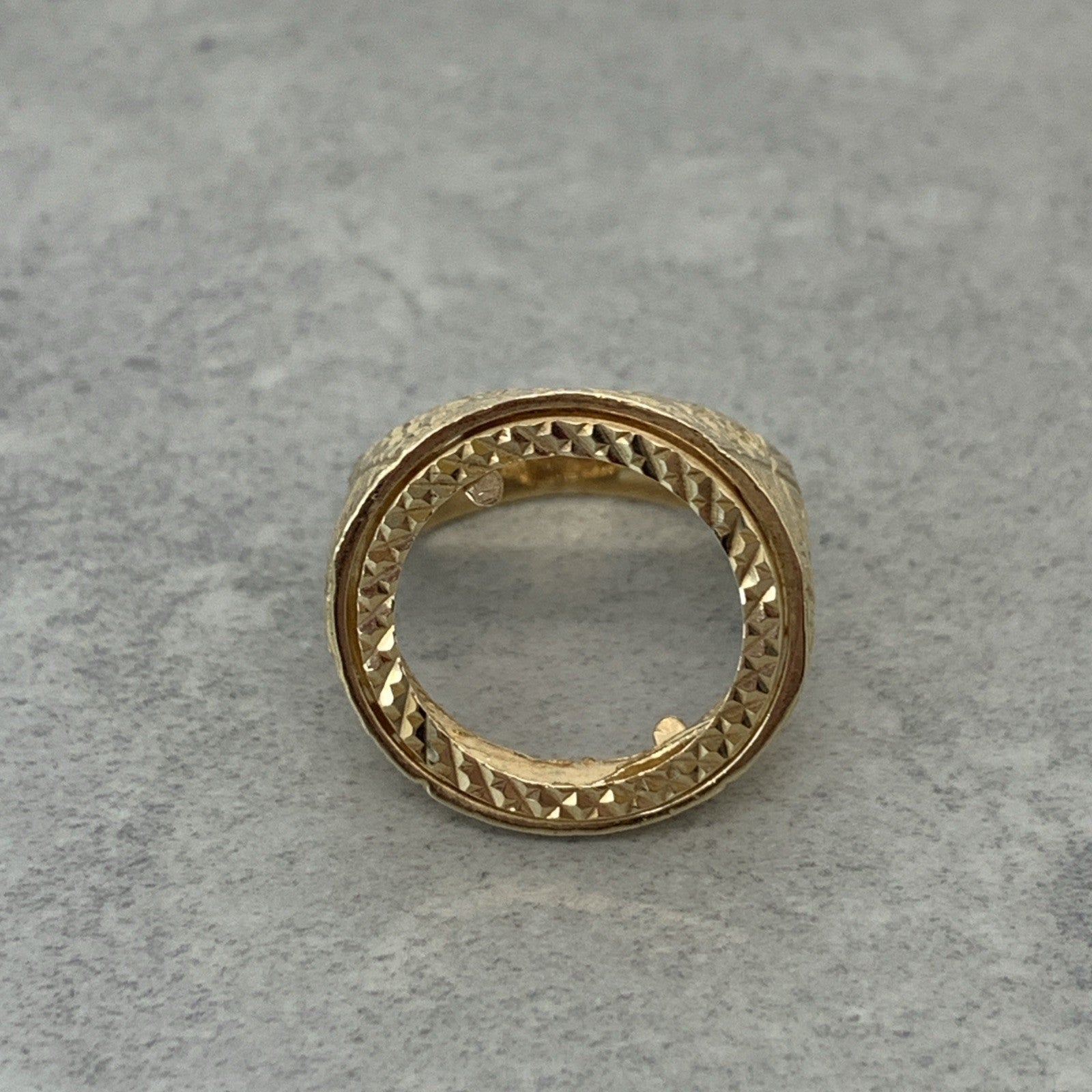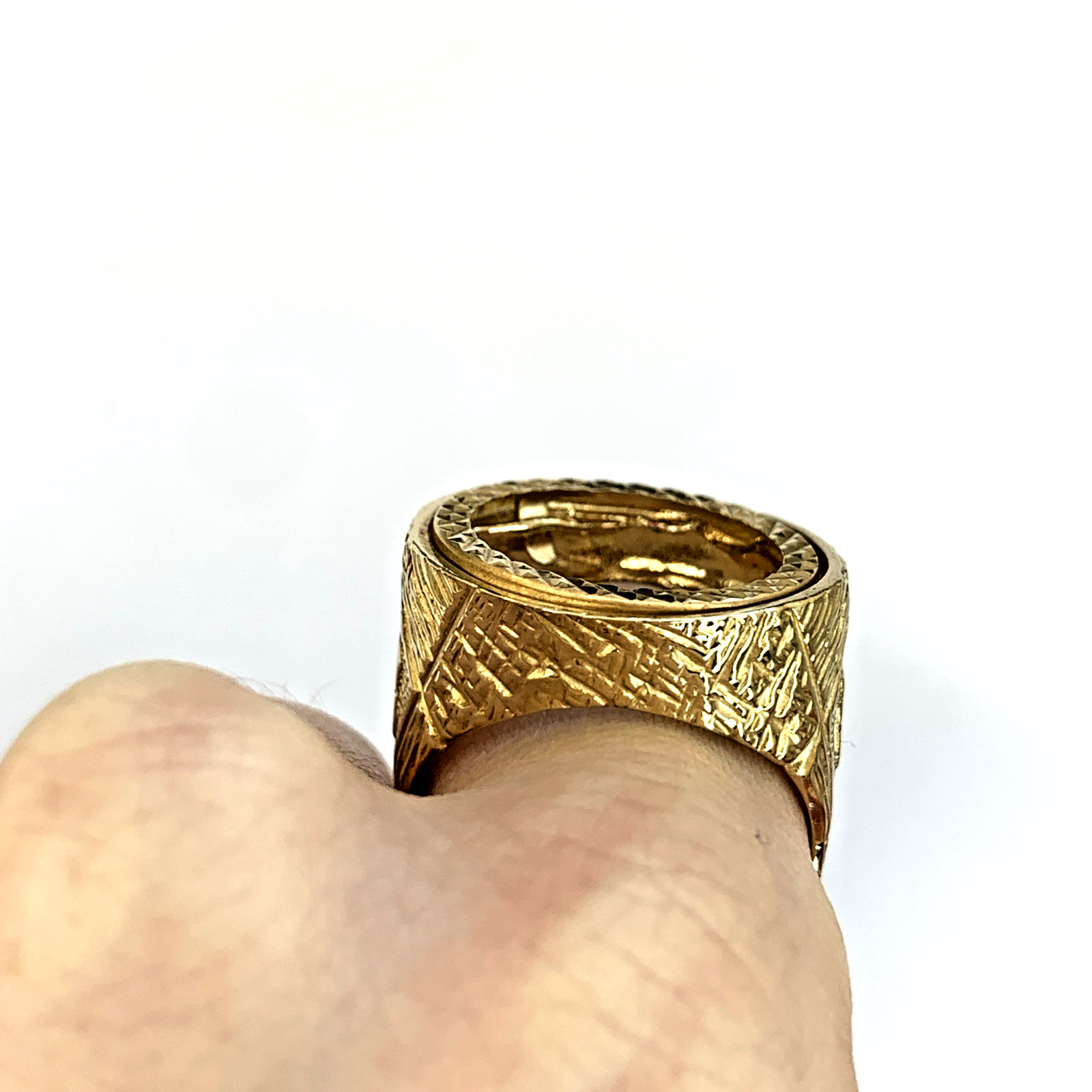 A timeless gold half sovereign mount ring with bark finishing on the shoulders and a shield motif.