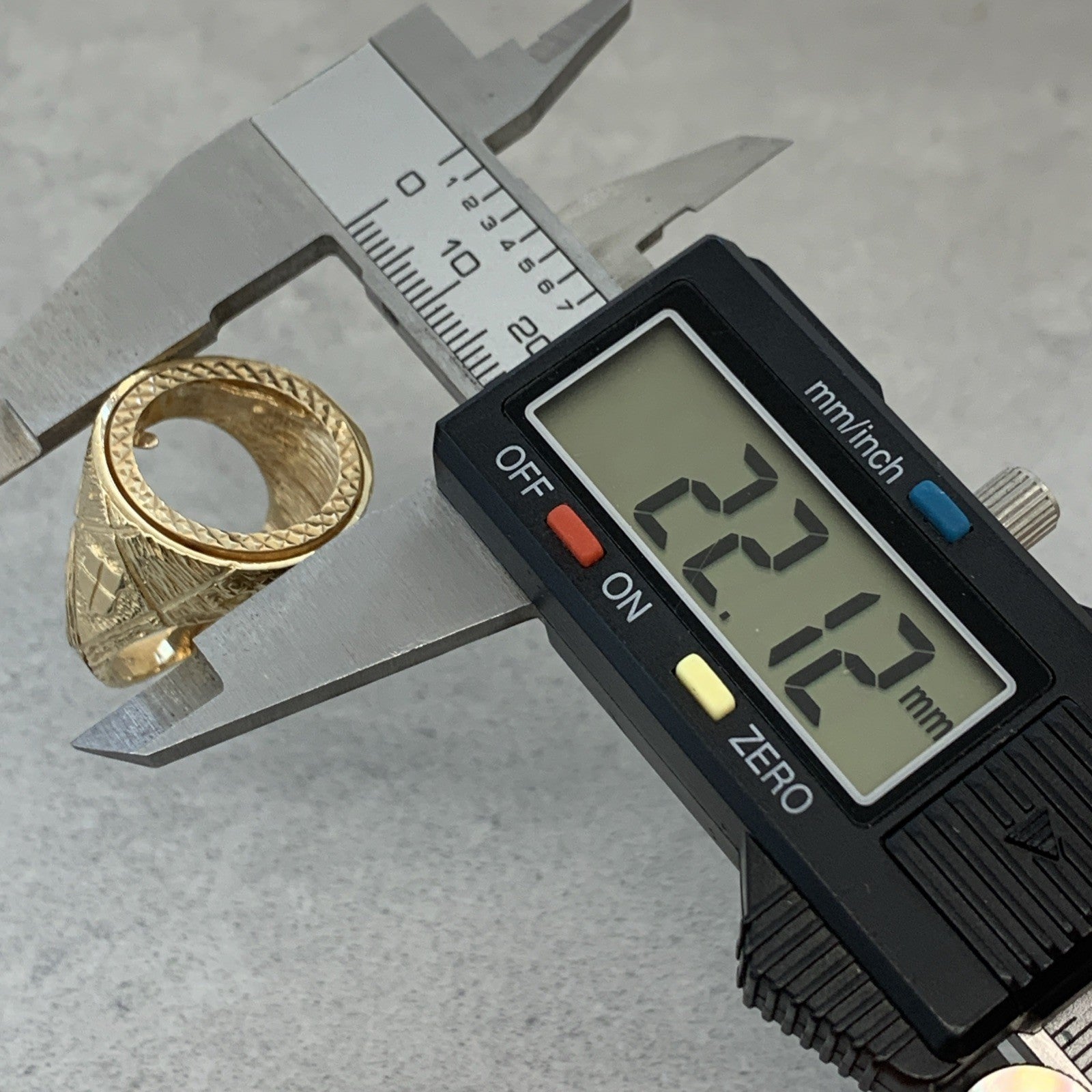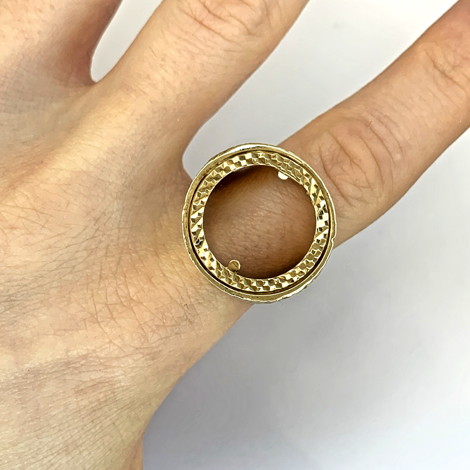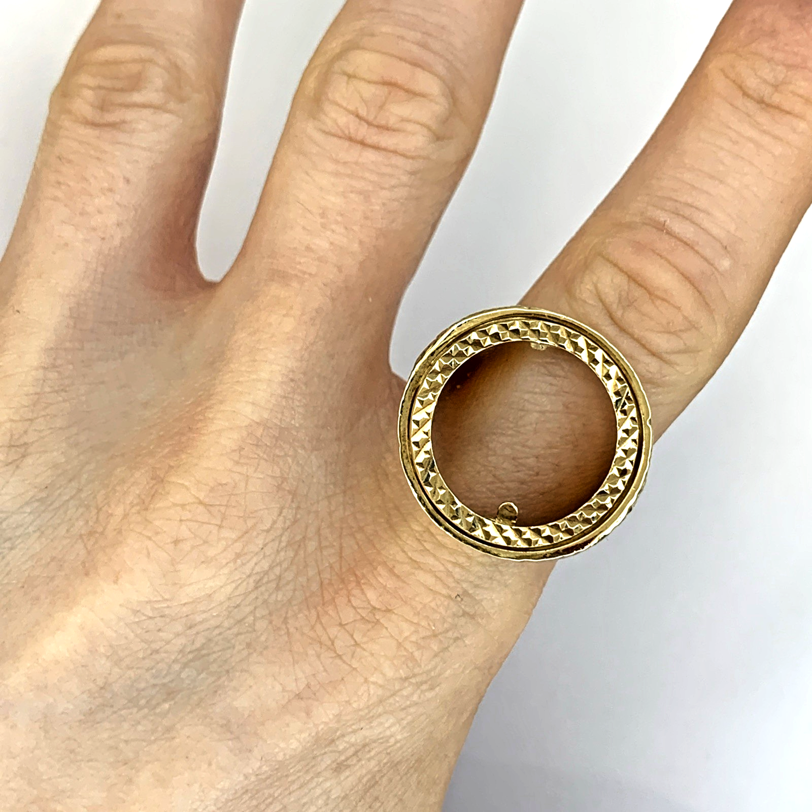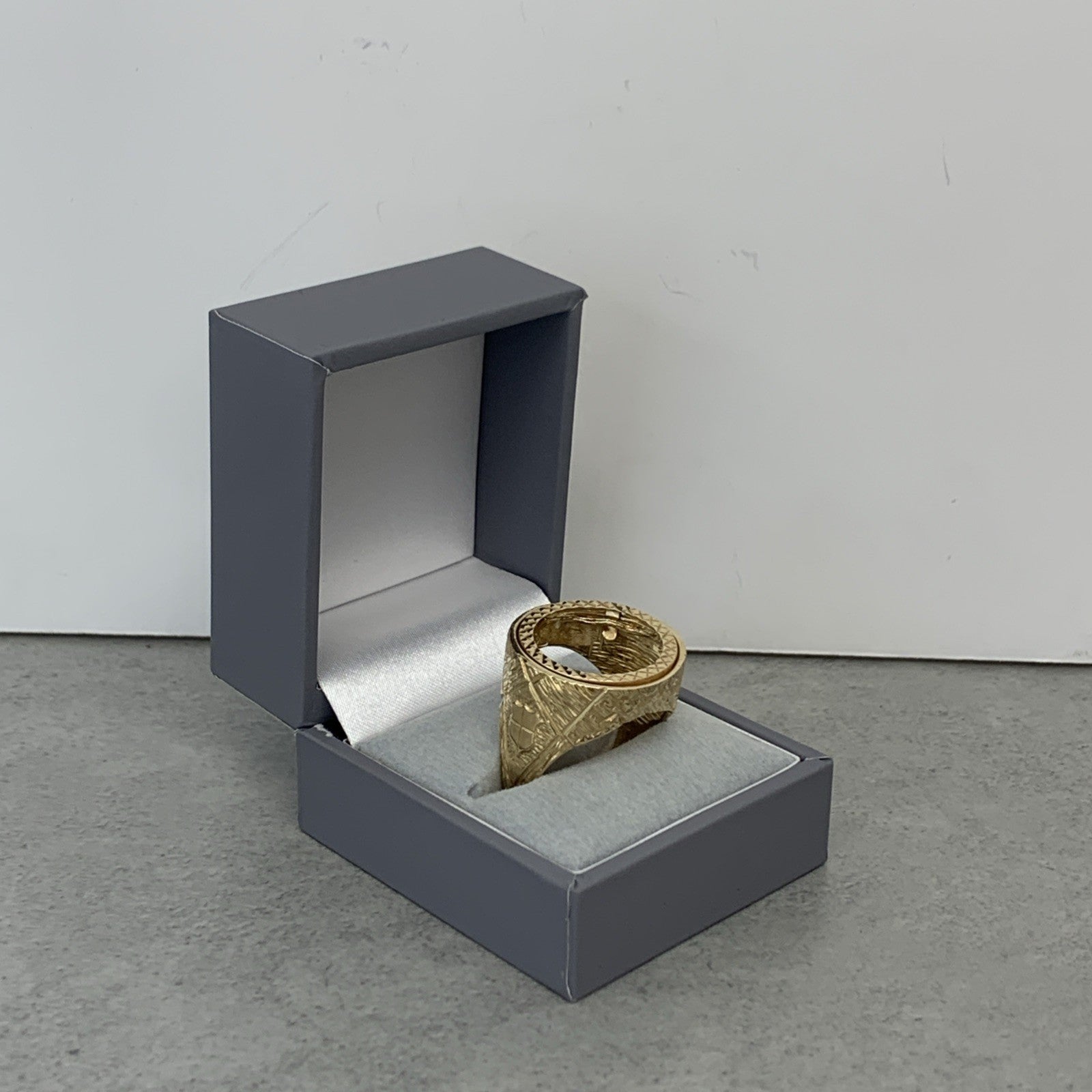 A timeless gold half sovereign mount ring with bark finishing on the shoulders and a shield motif.