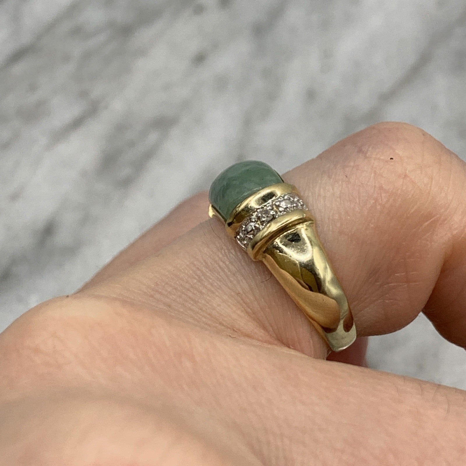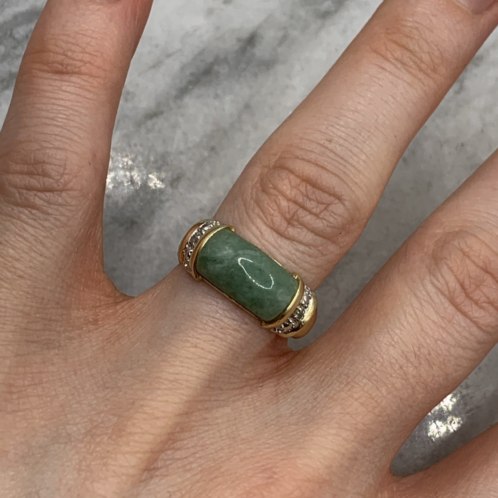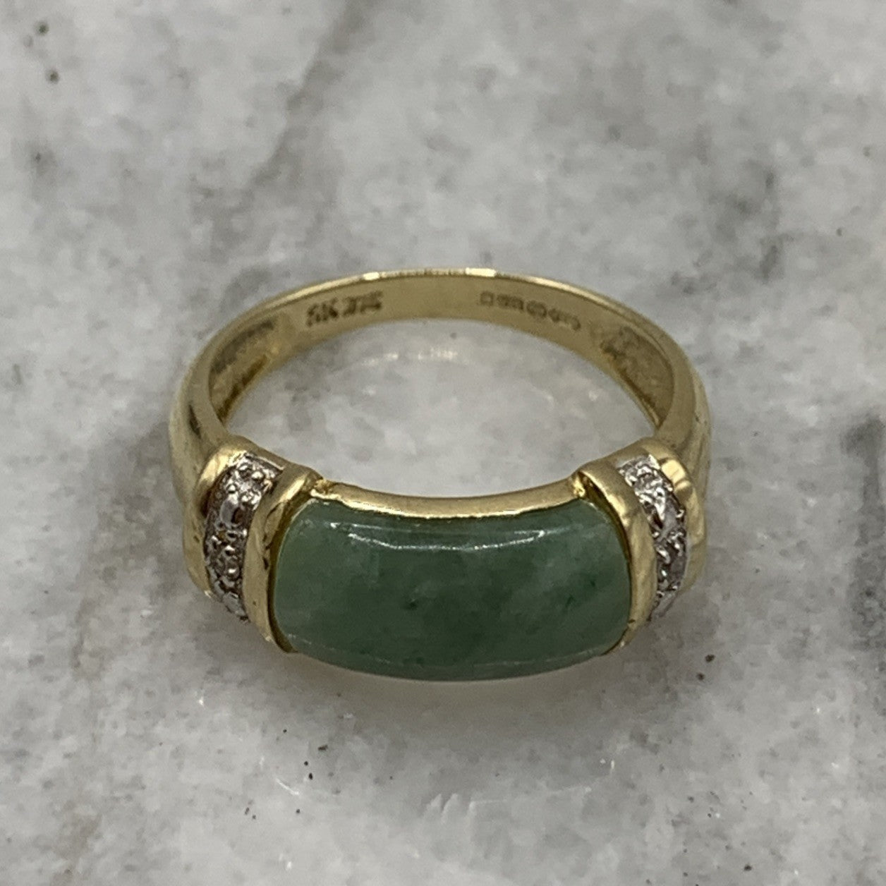 - A unique gold band ring featuring bar set jade accented by petite diamonds. Hallmarked.