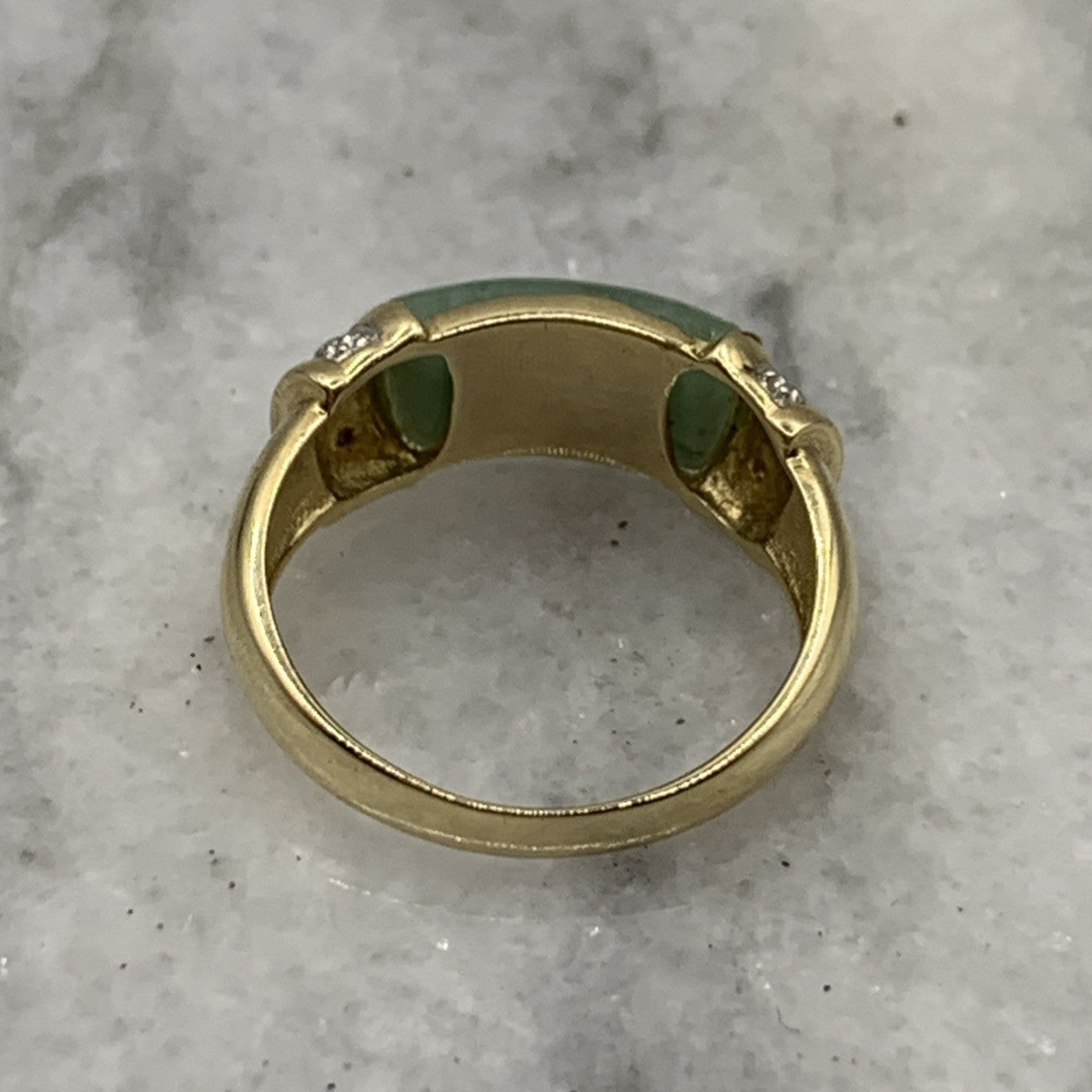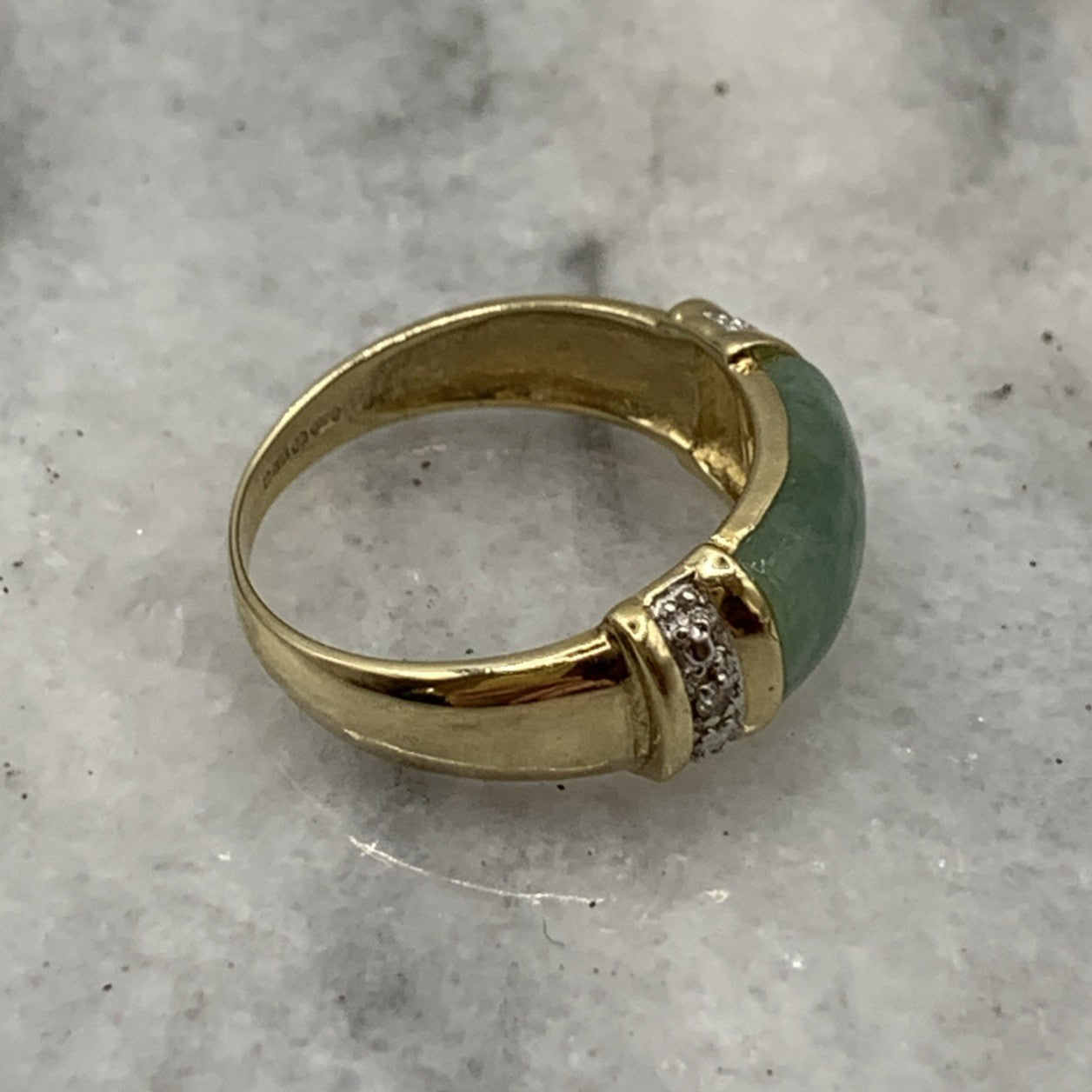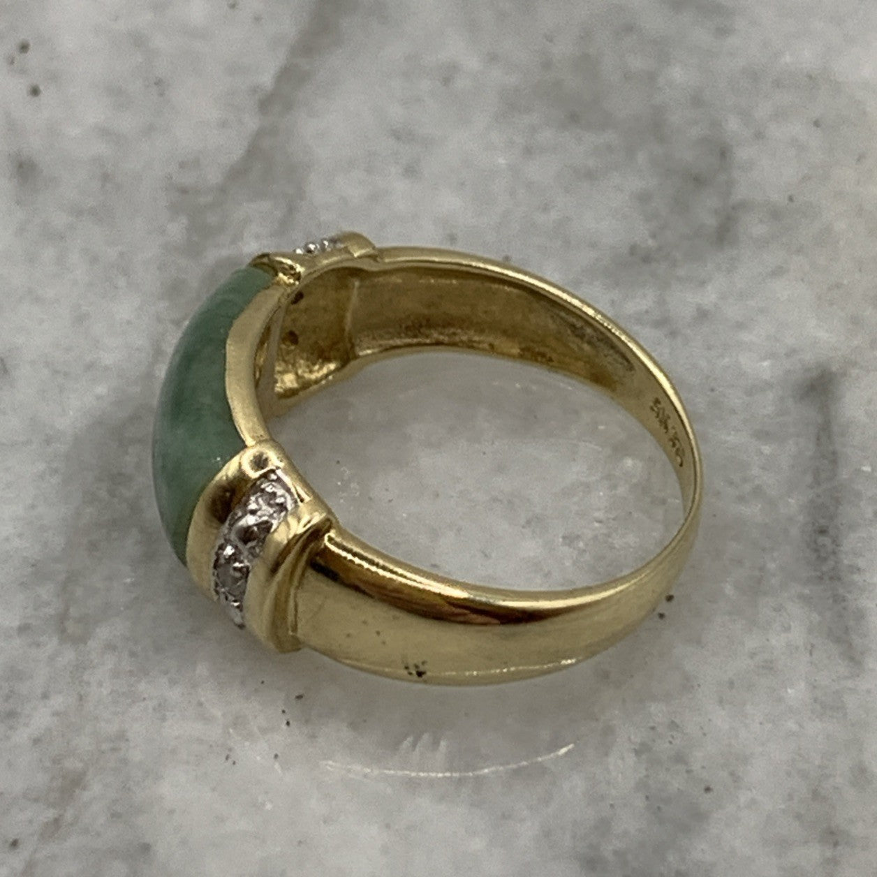 - A unique gold band ring featuring bar set jade accented by petite diamonds. Hallmarked.