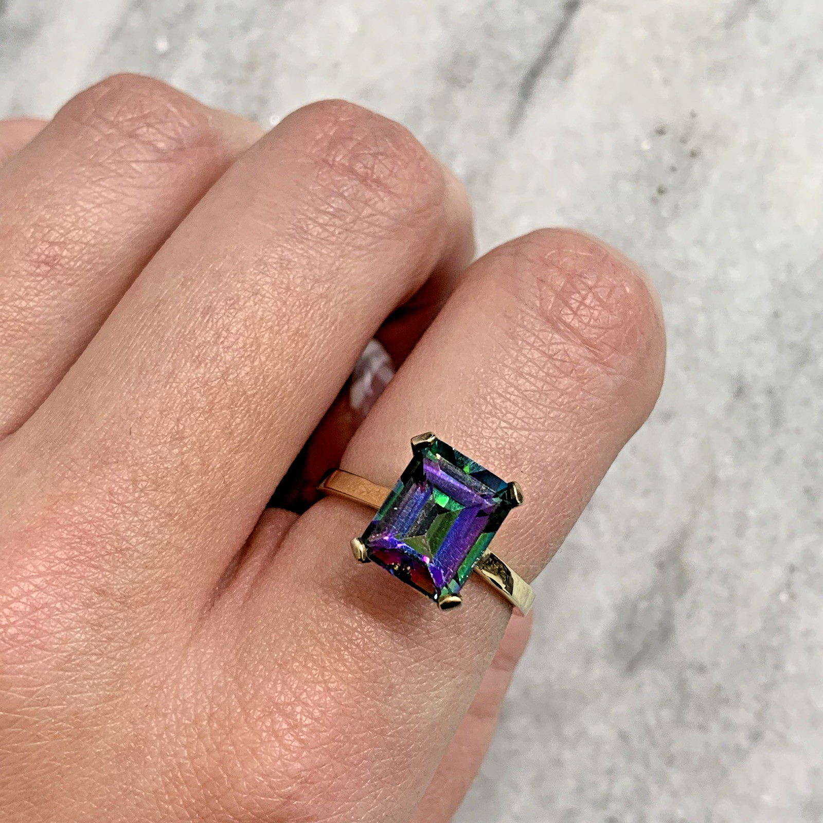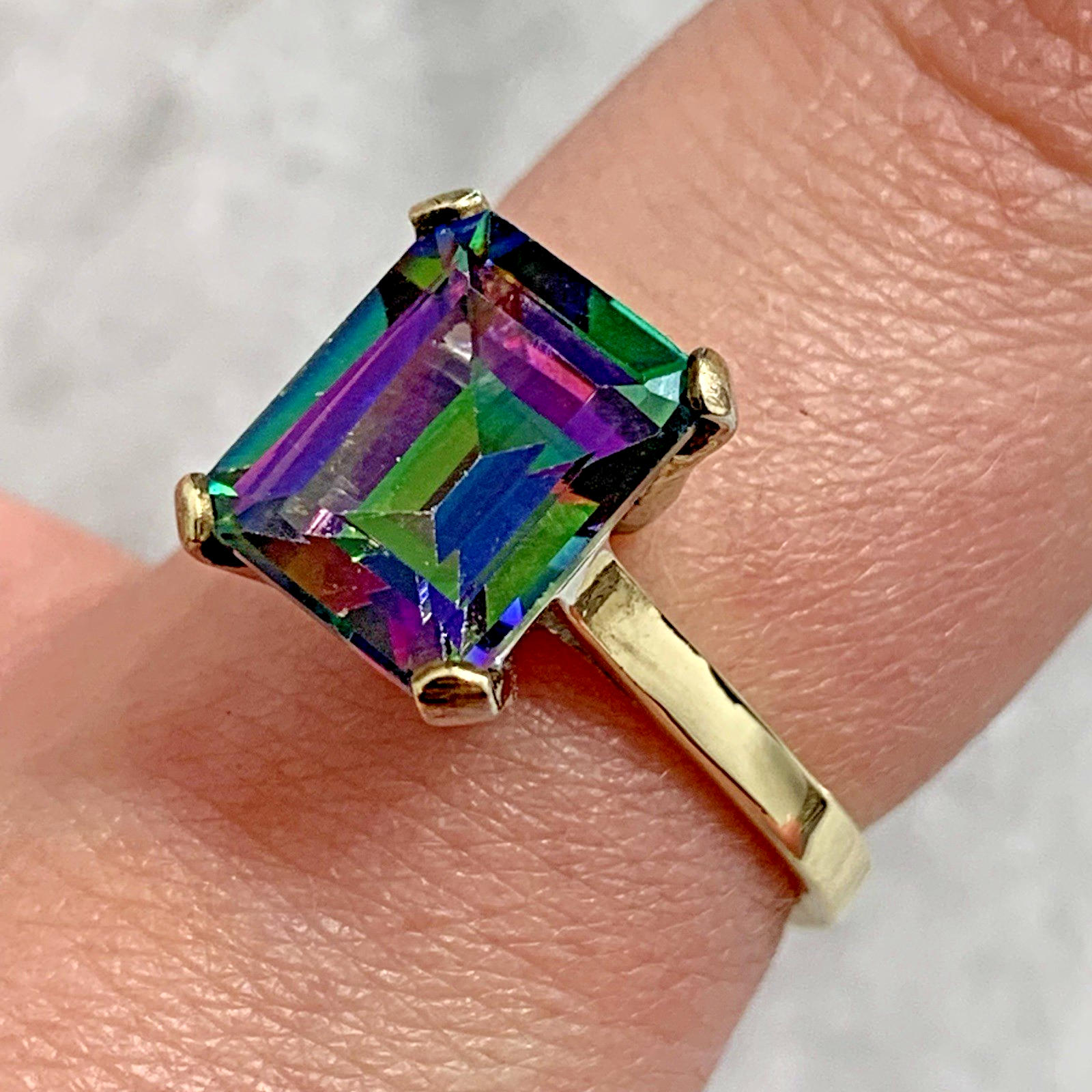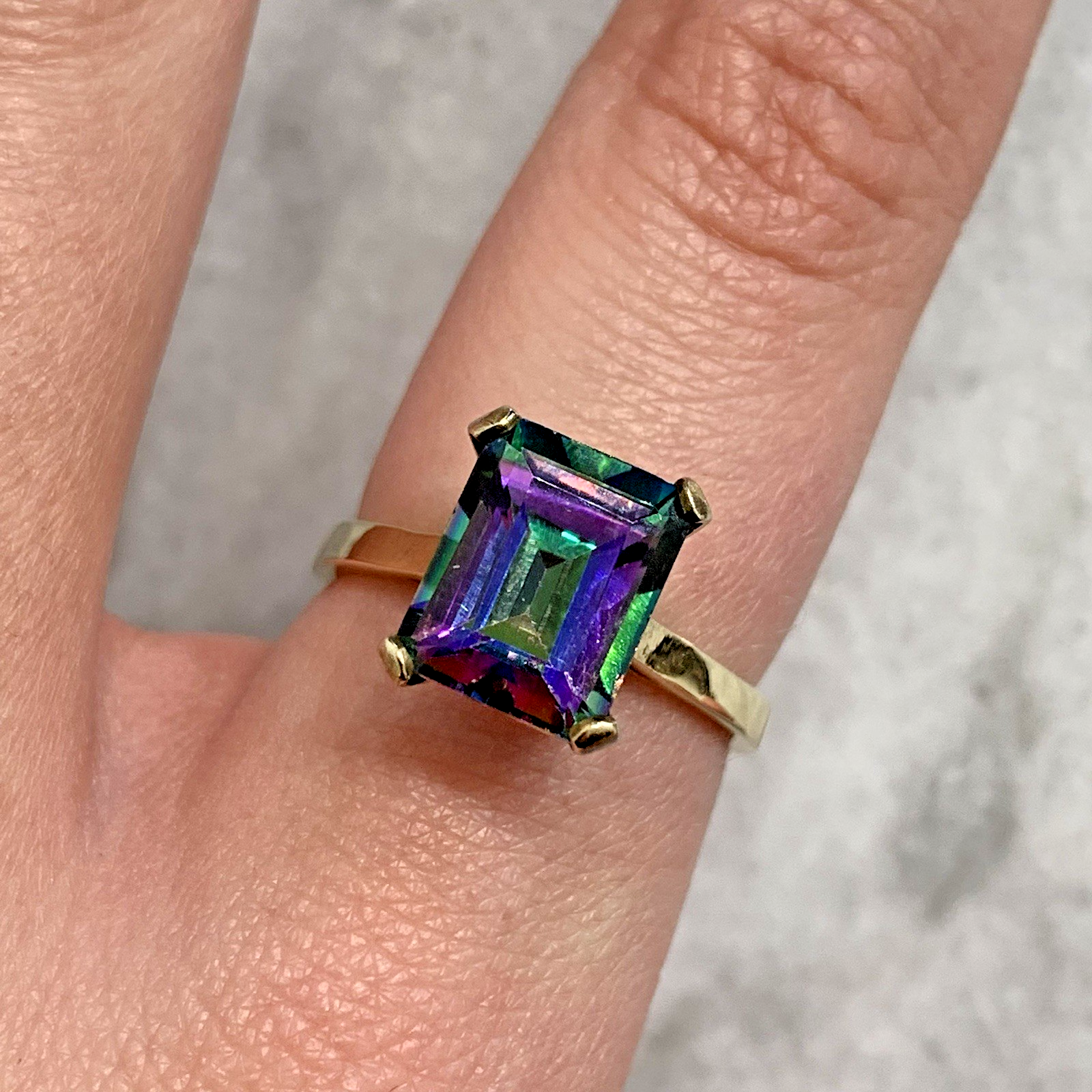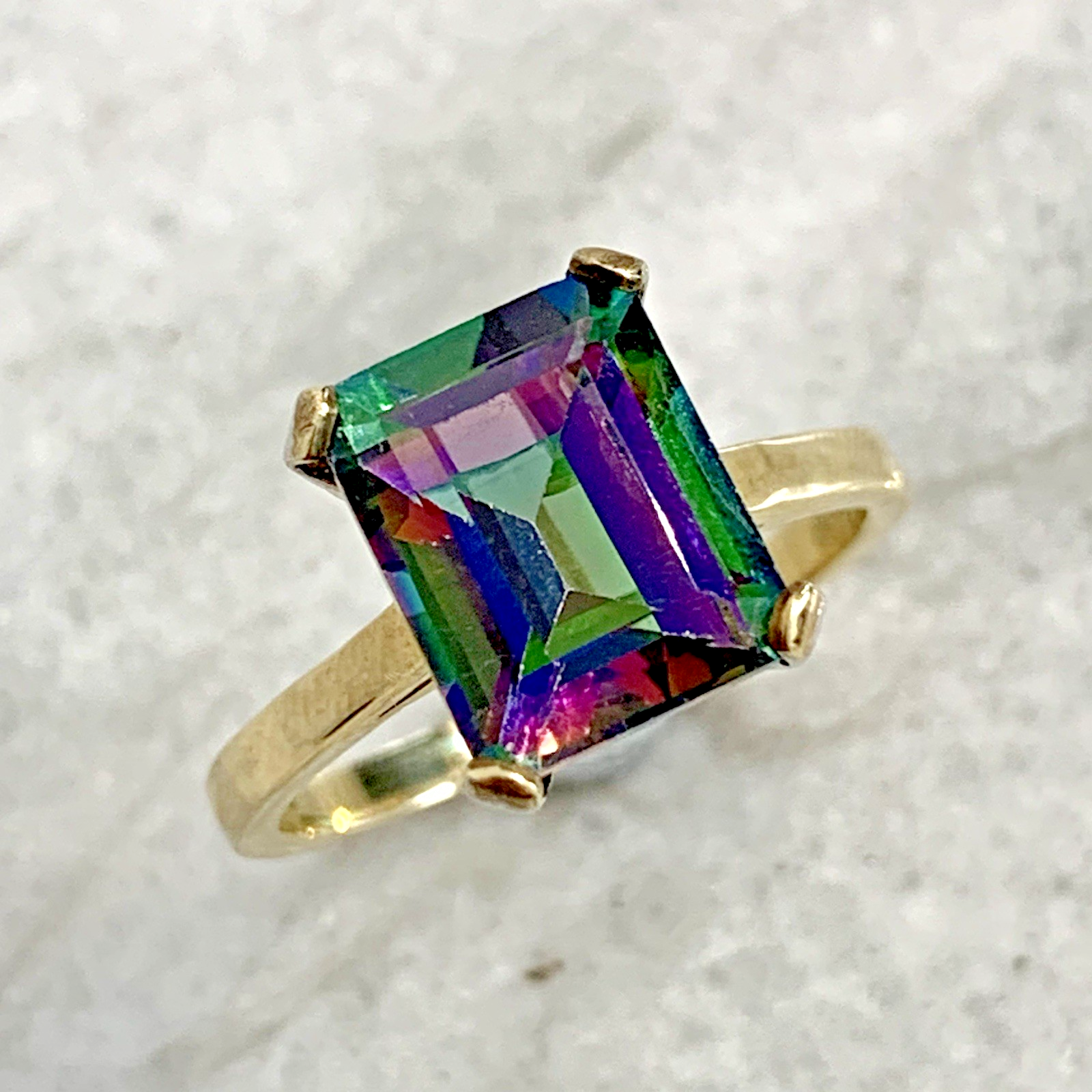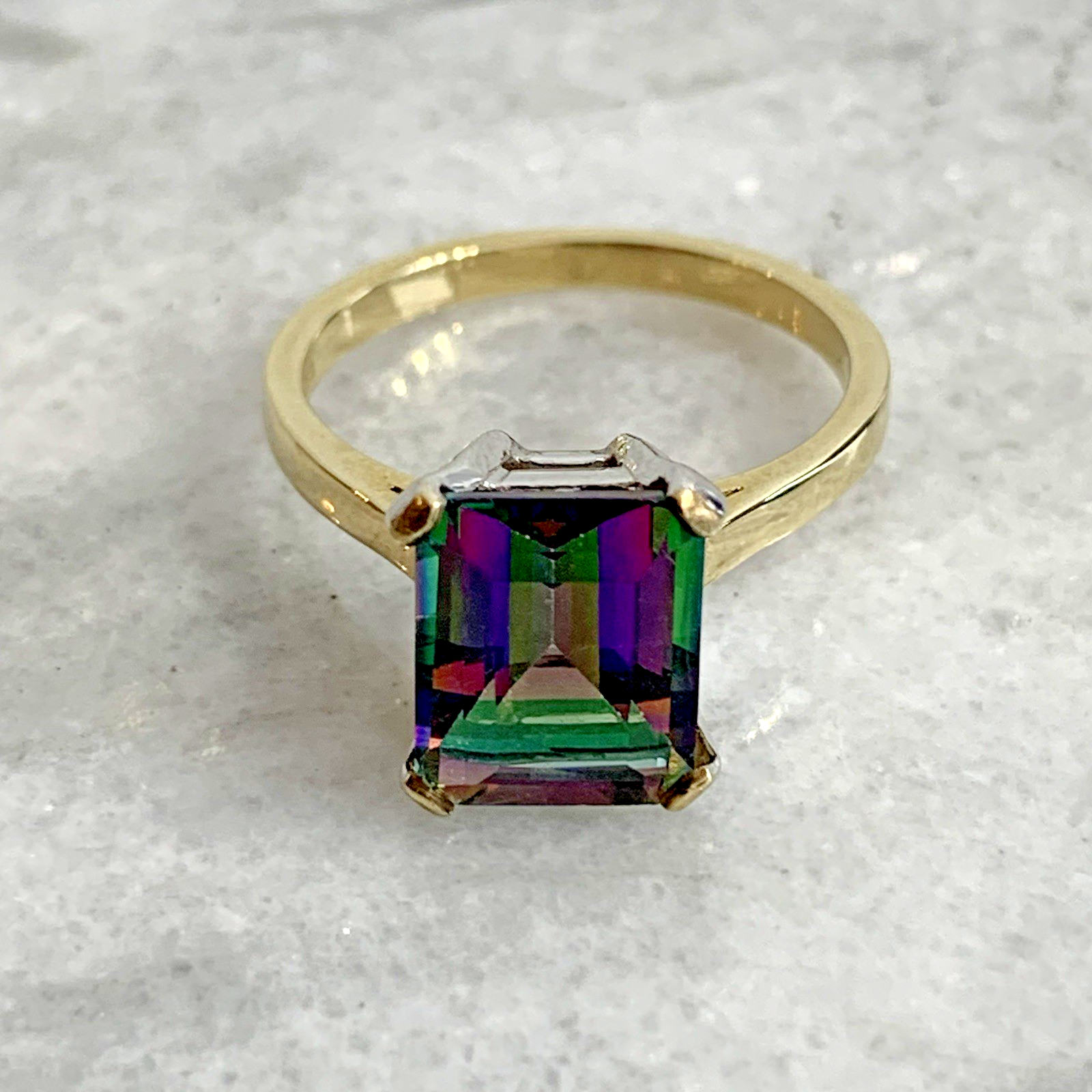 - A stunning gold solitaire ring showcasing a vibrant multi-tonal emerald-cut mystic topaz gemstone held in claws.