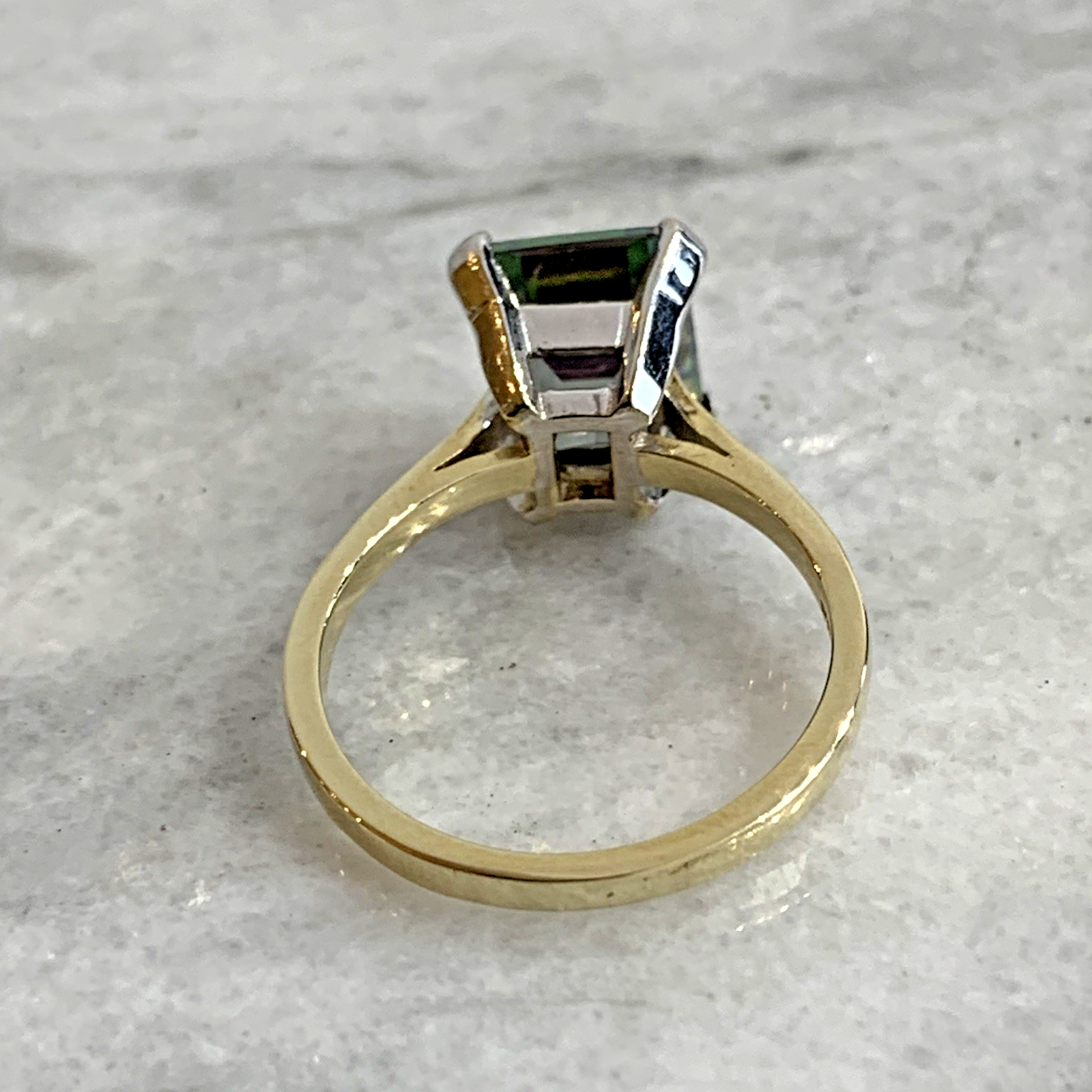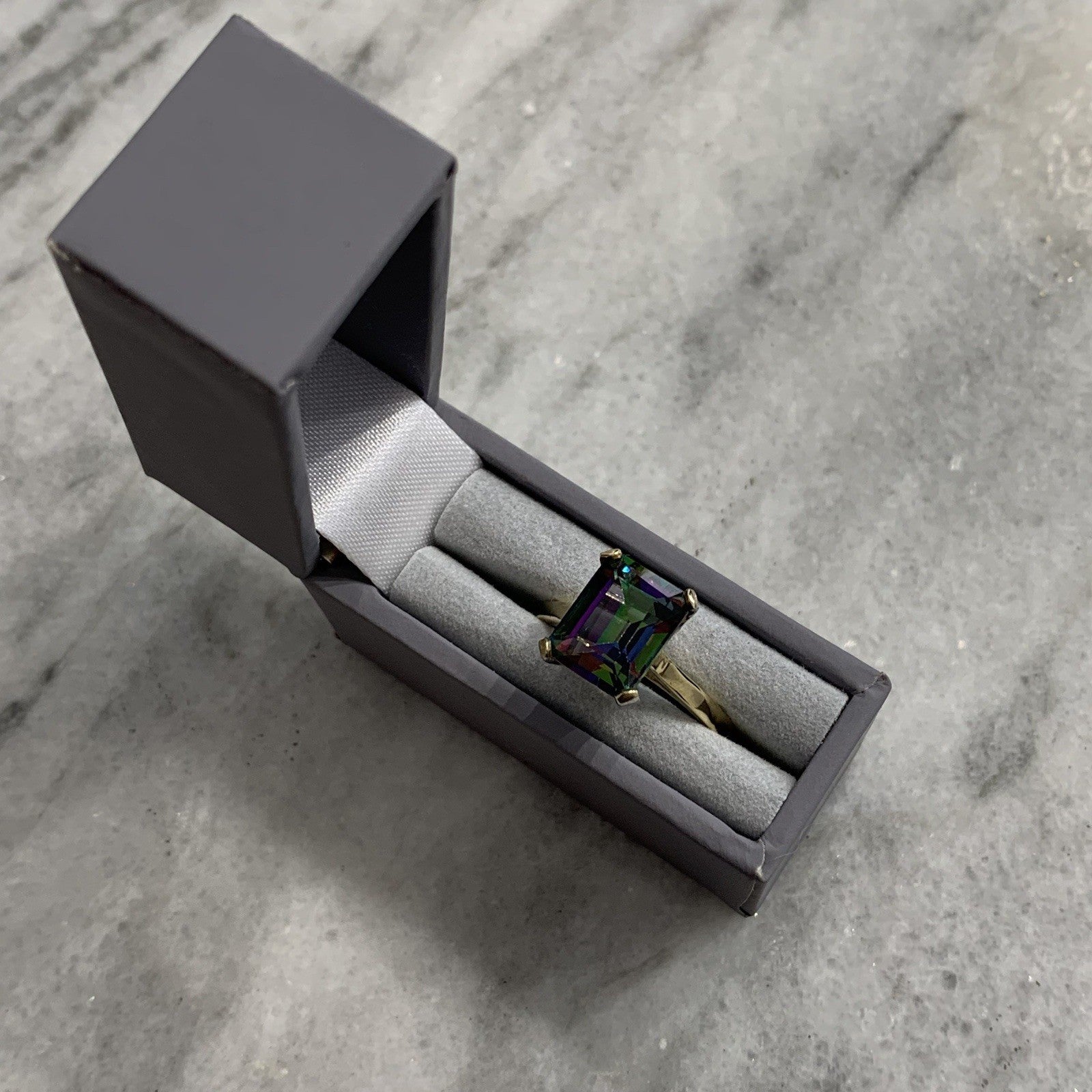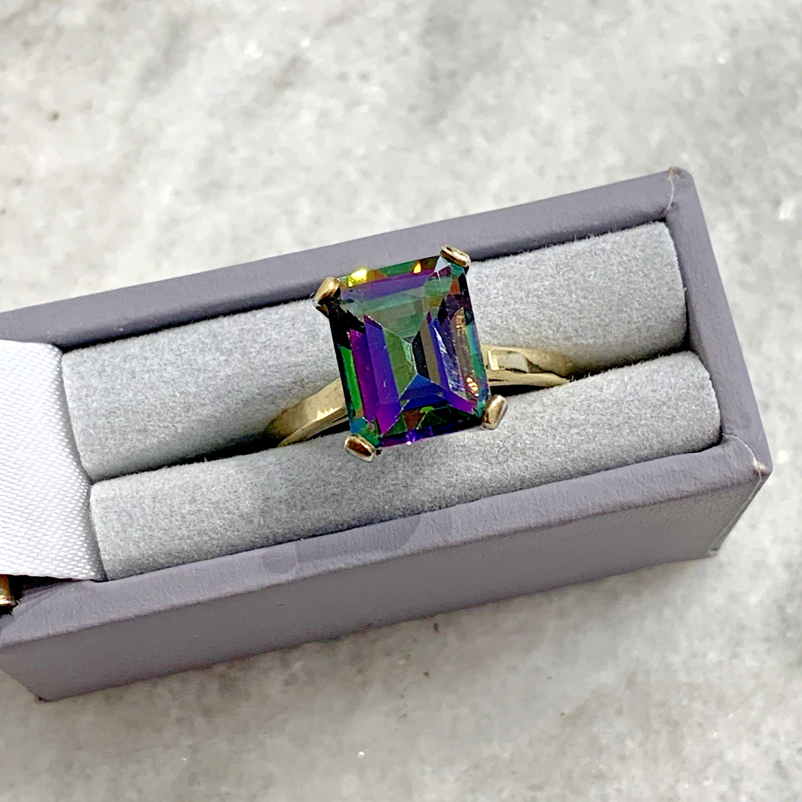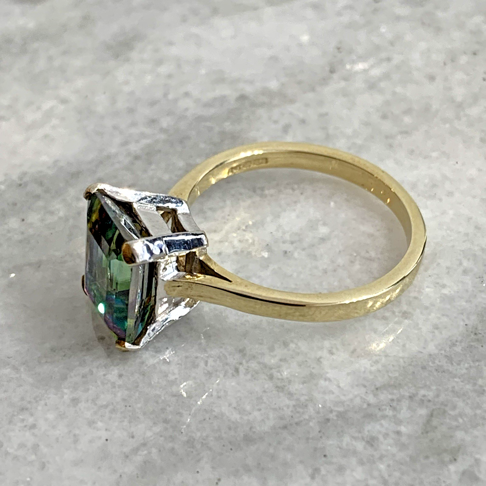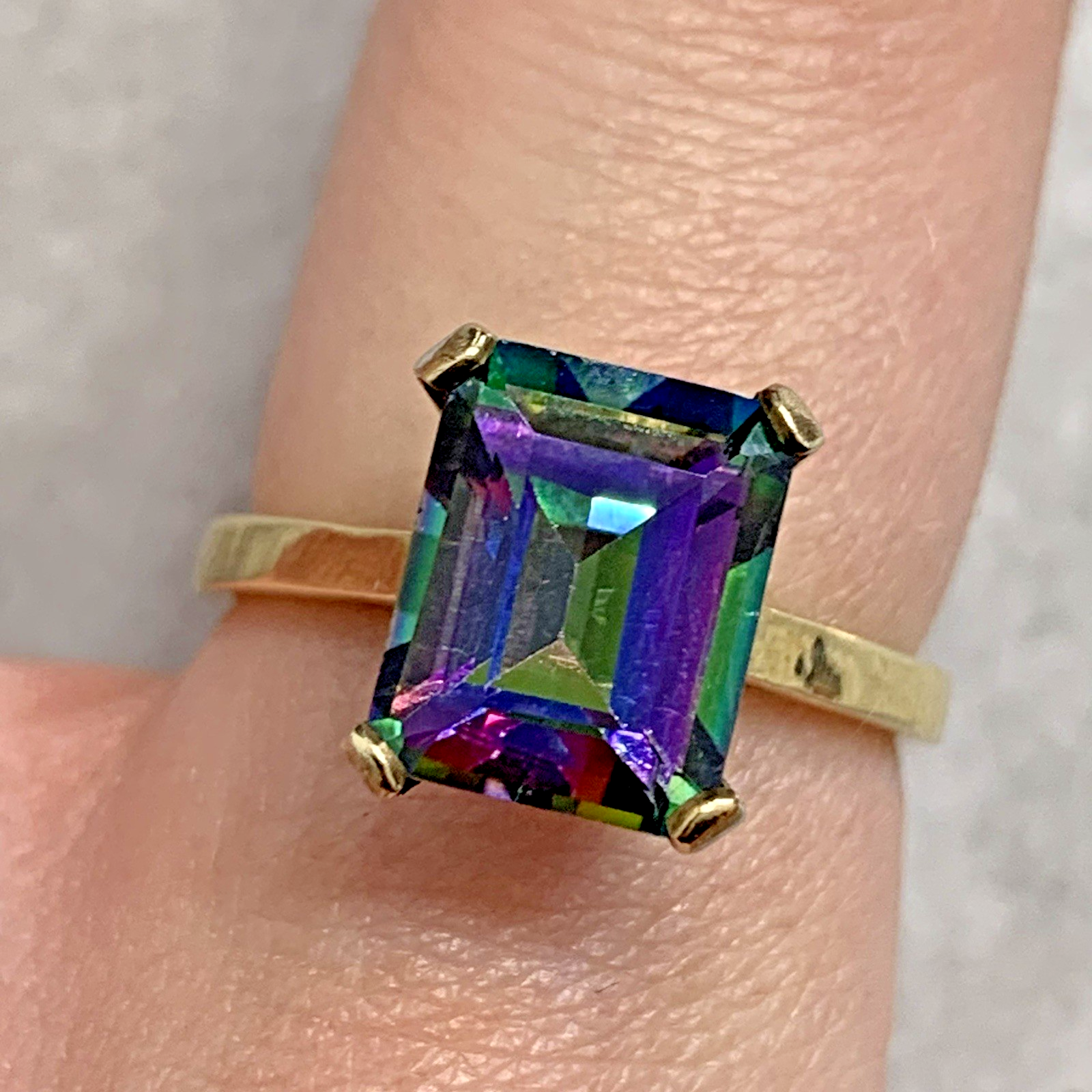 - A stunning gold solitaire ring showcasing a vibrant multi-tonal emerald-cut mystic topaz gemstone held in claws.