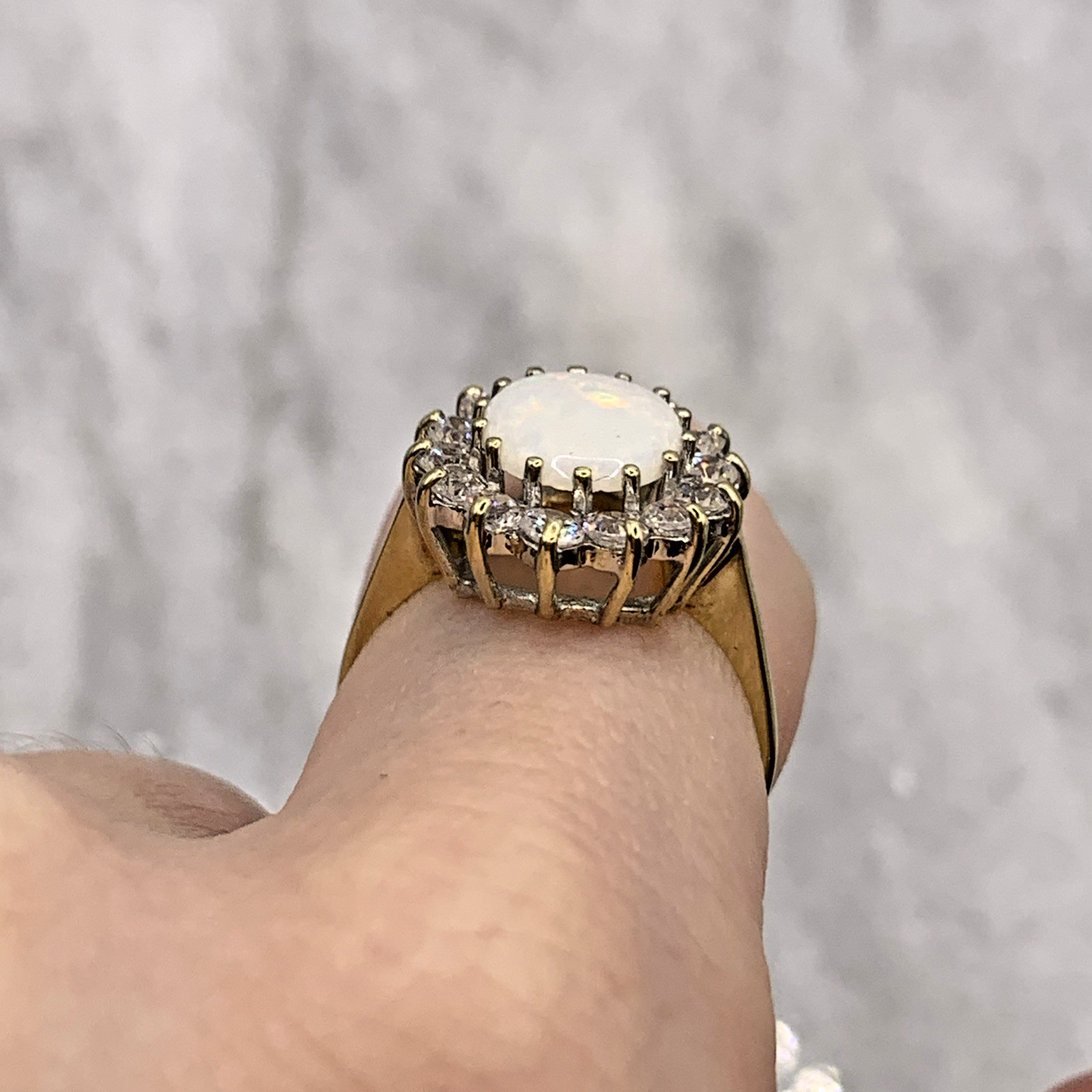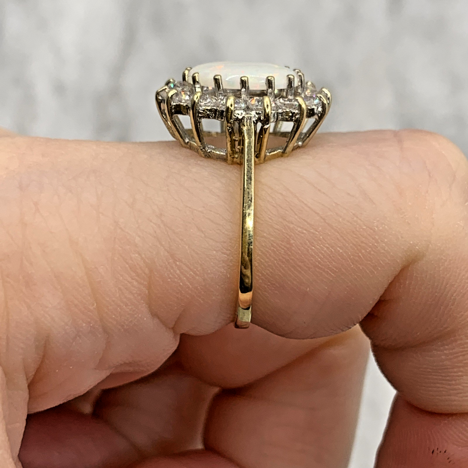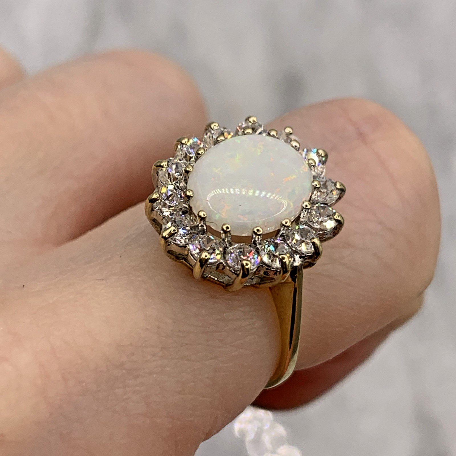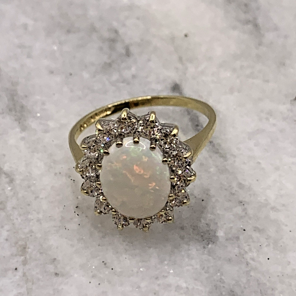 A stunning yellow gold ring featuring an oval cabochon opal accented by a halo of round cut cubic zirconia gemstones. The colours in this opal are translucent and capture the light beautifully.