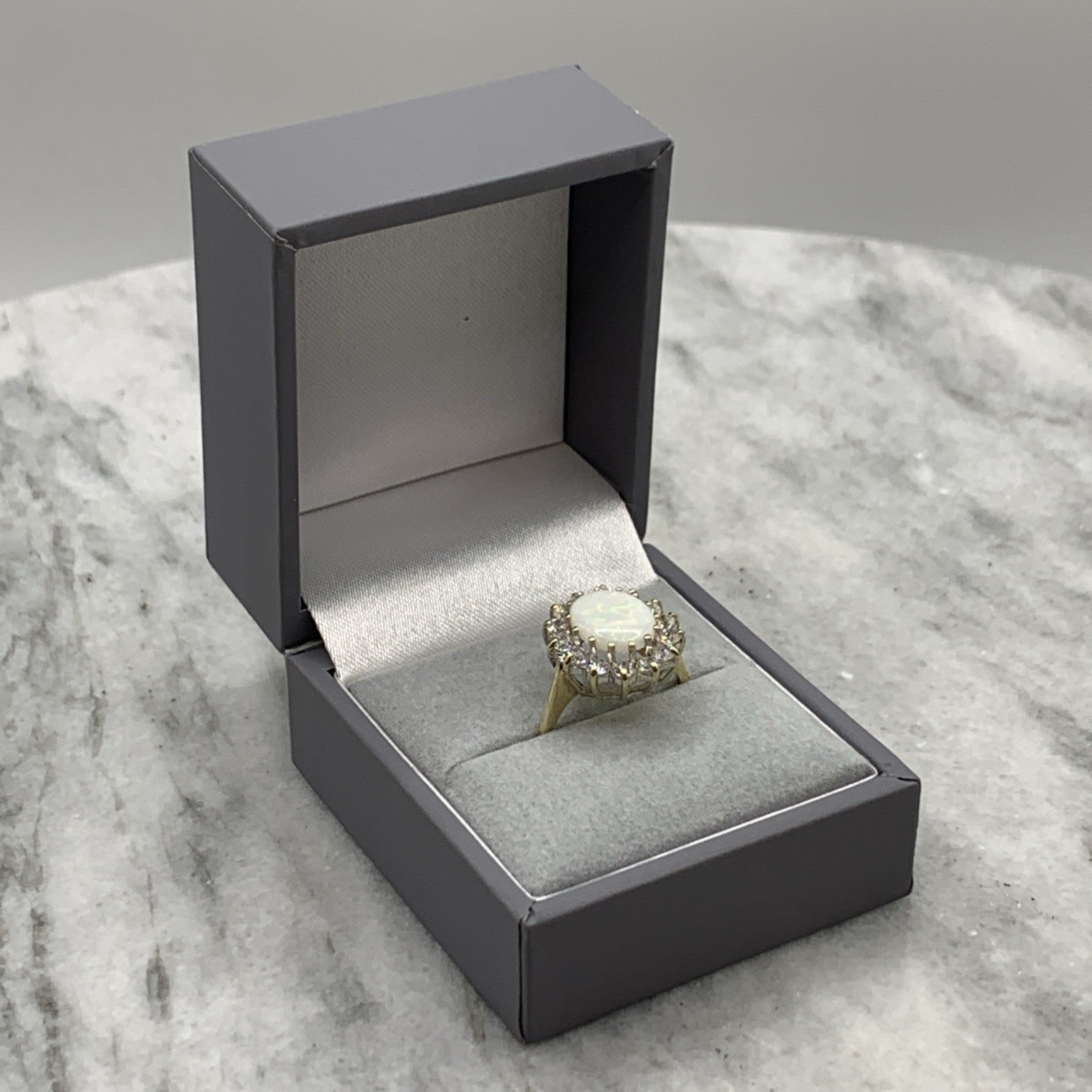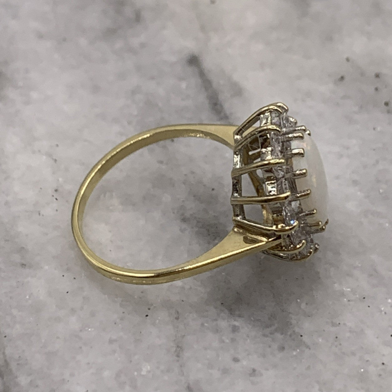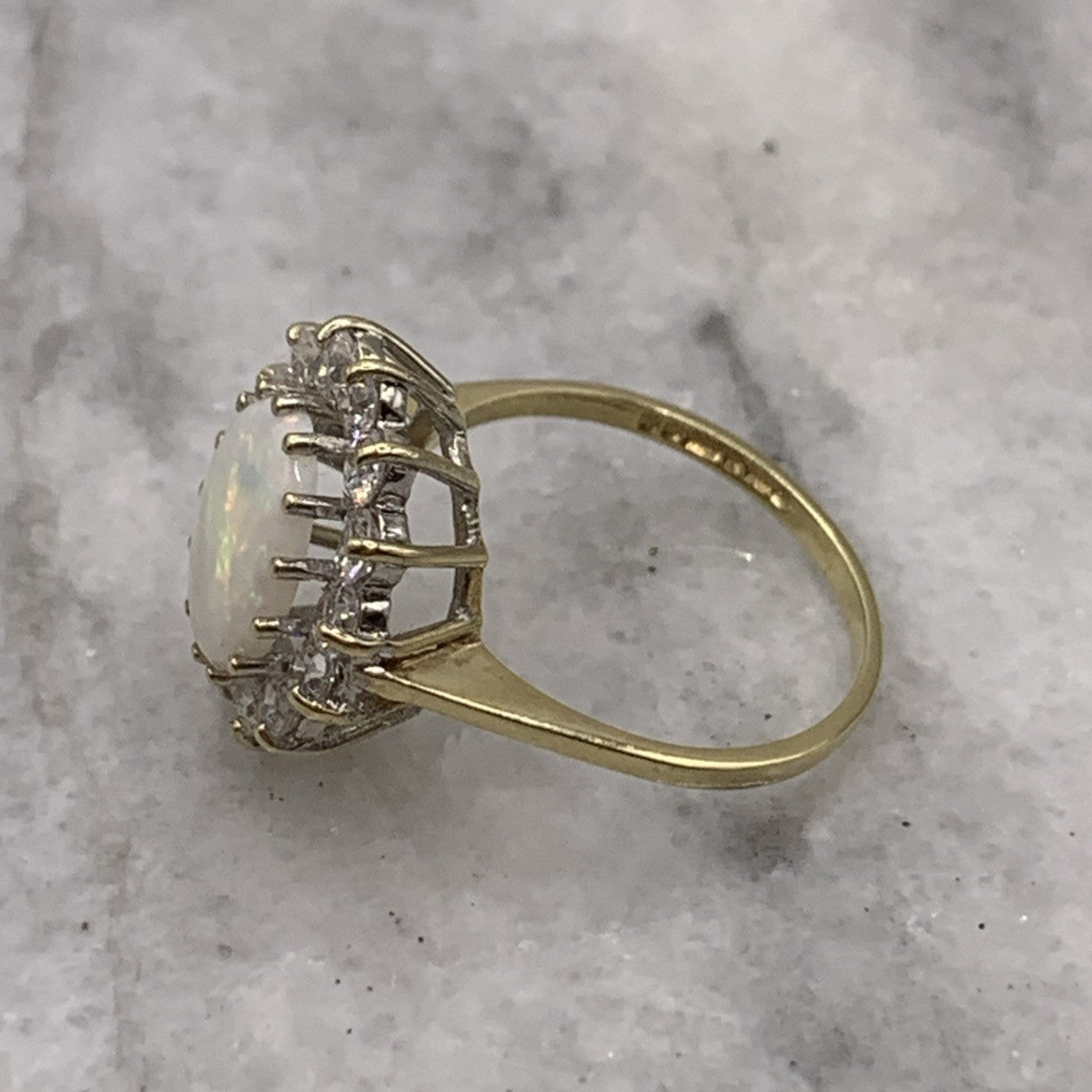 A stunning yellow gold ring featuring an oval cabochon opal accented by a halo of round cut cubic zirconia gemstones. The colours in this opal are translucent and capture the light beautifully.
