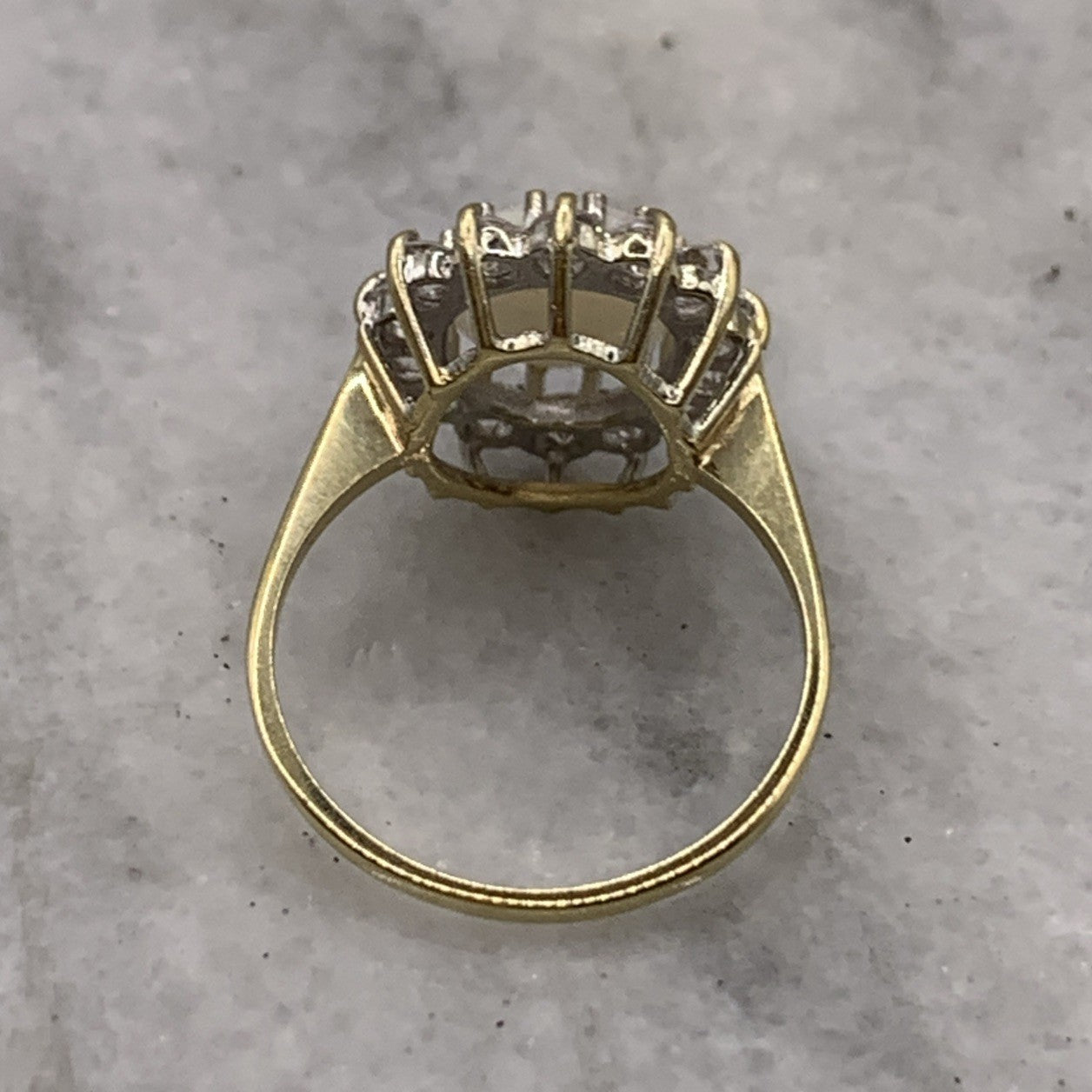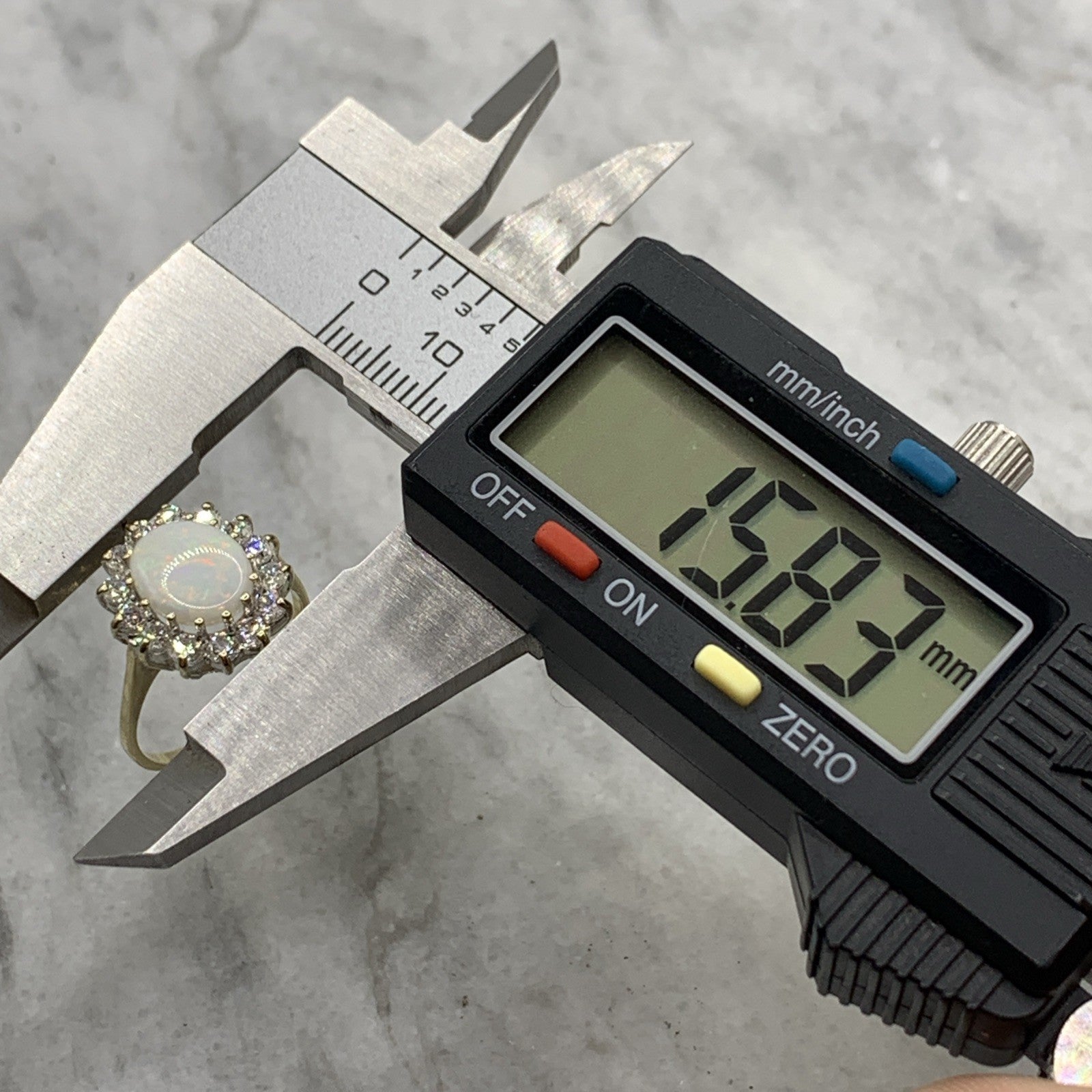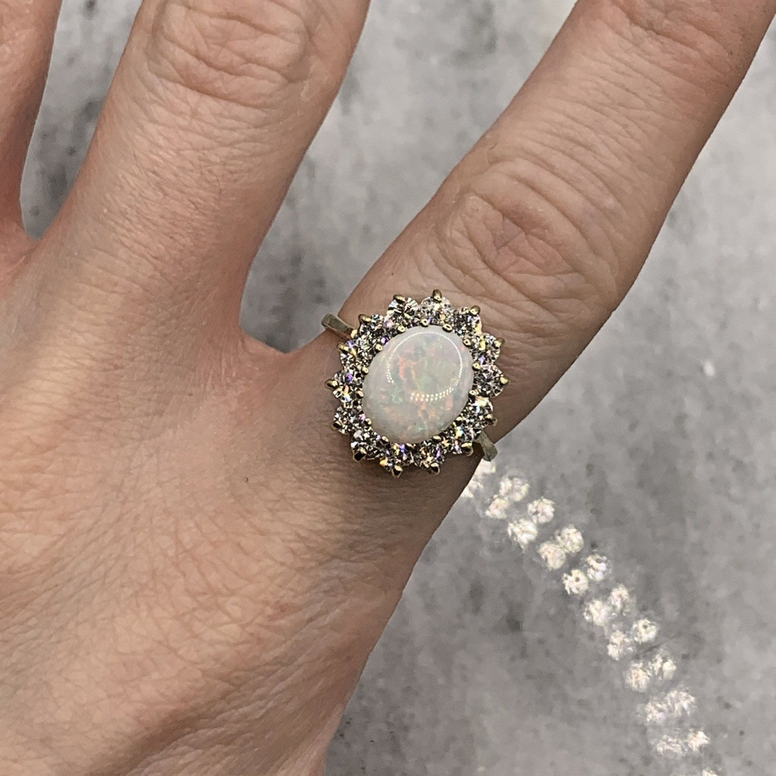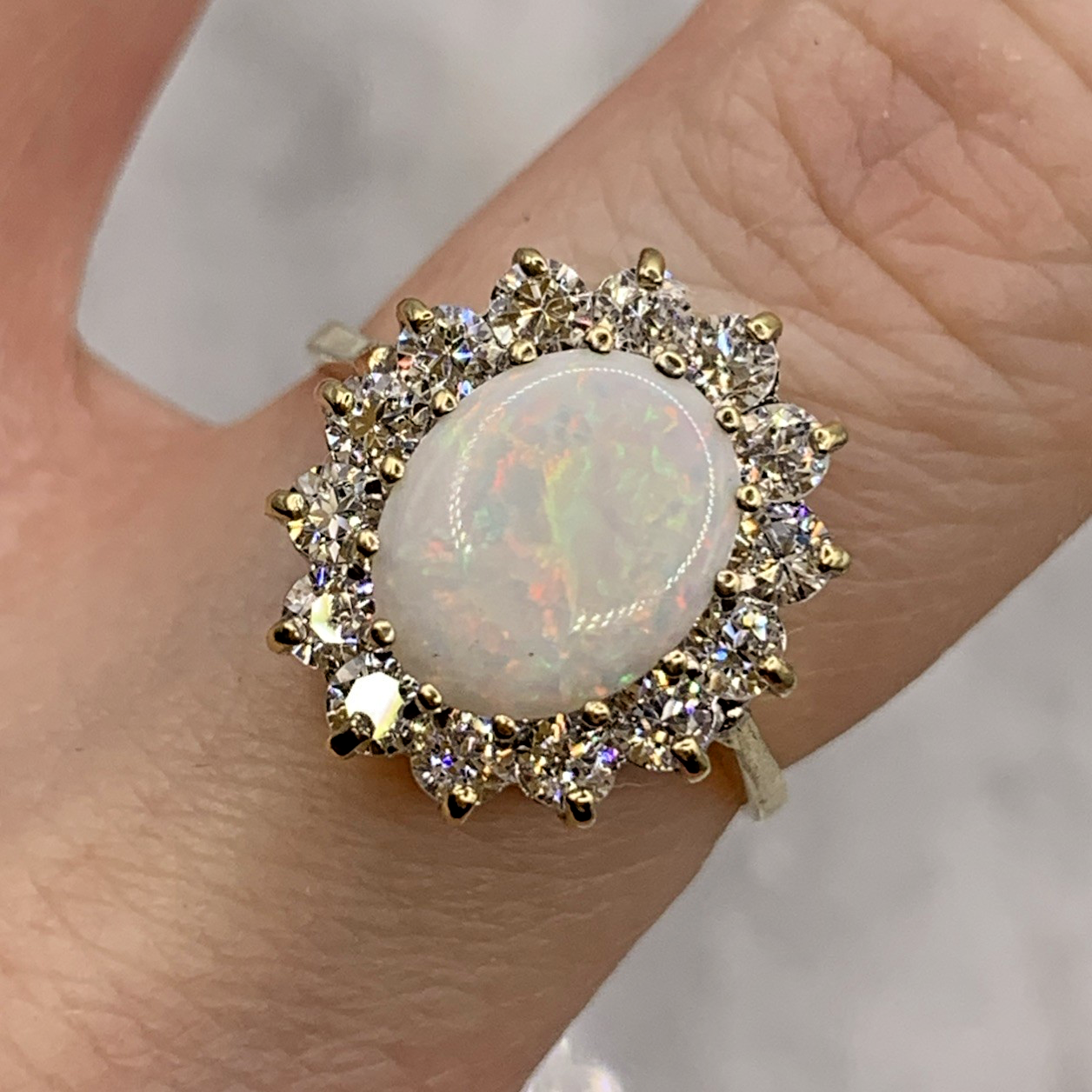 A stunning yellow gold ring featuring an oval cabochon opal accented by a halo of round cut cubic zirconia gemstones. The colours in this opal are translucent and capture the light beautifully.