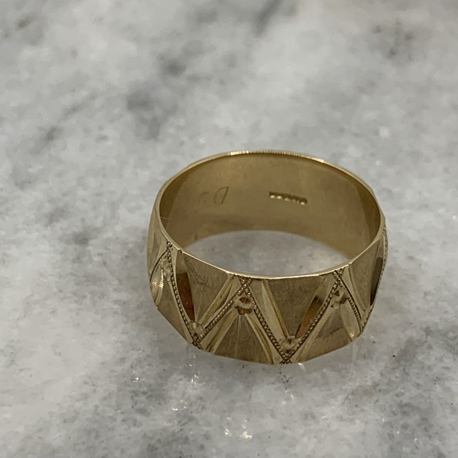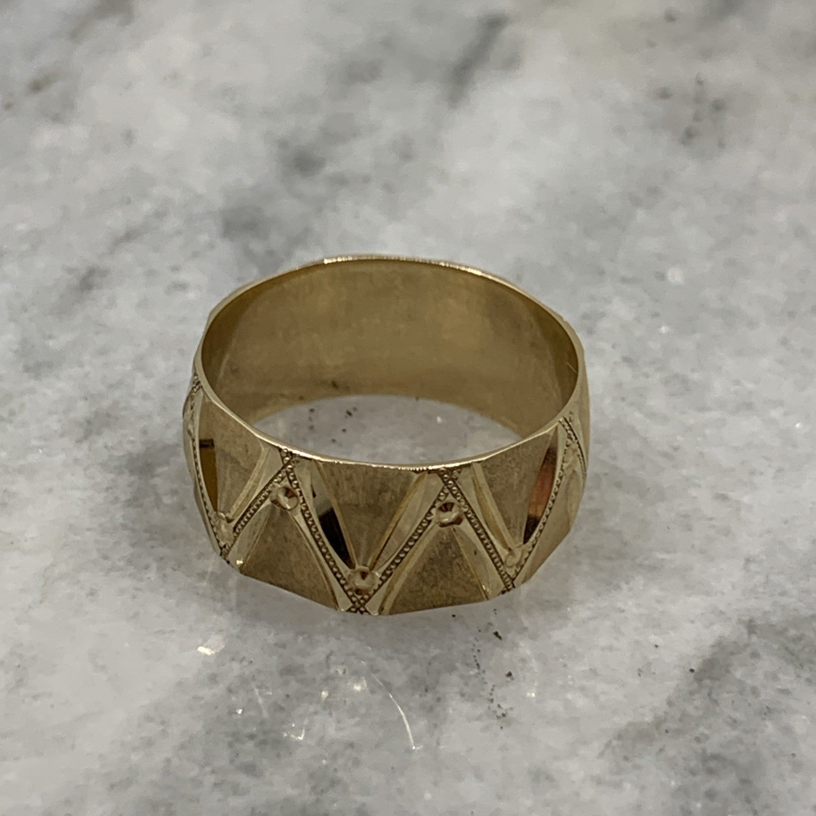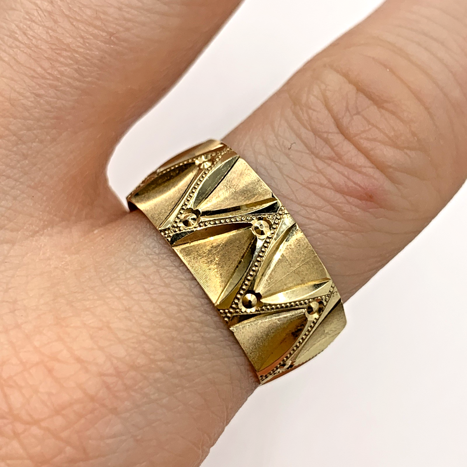 A stunning gold band ring featuring textured zig cag patterns with milgrain detailing.