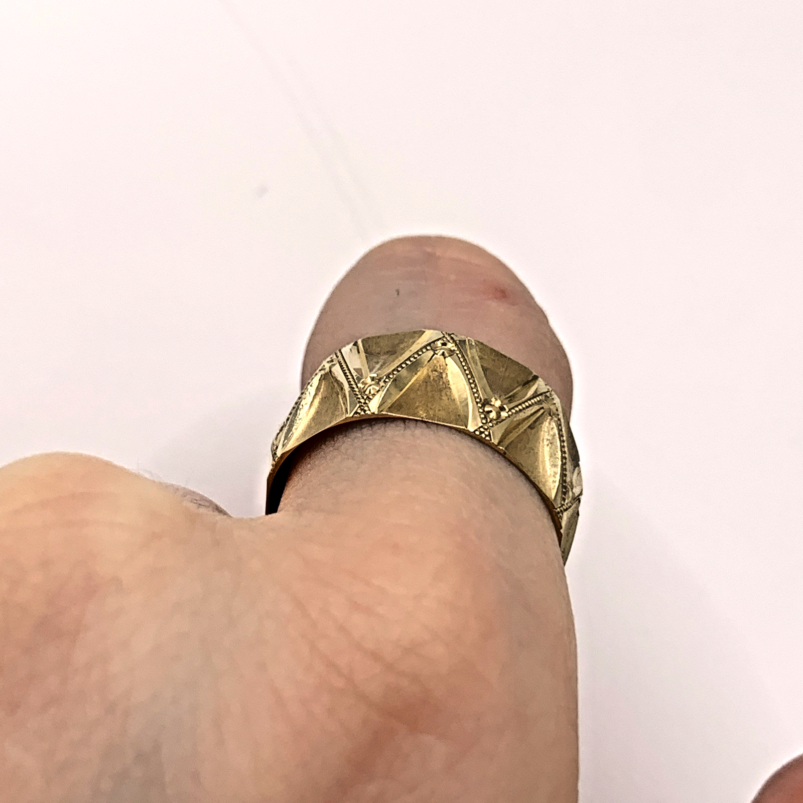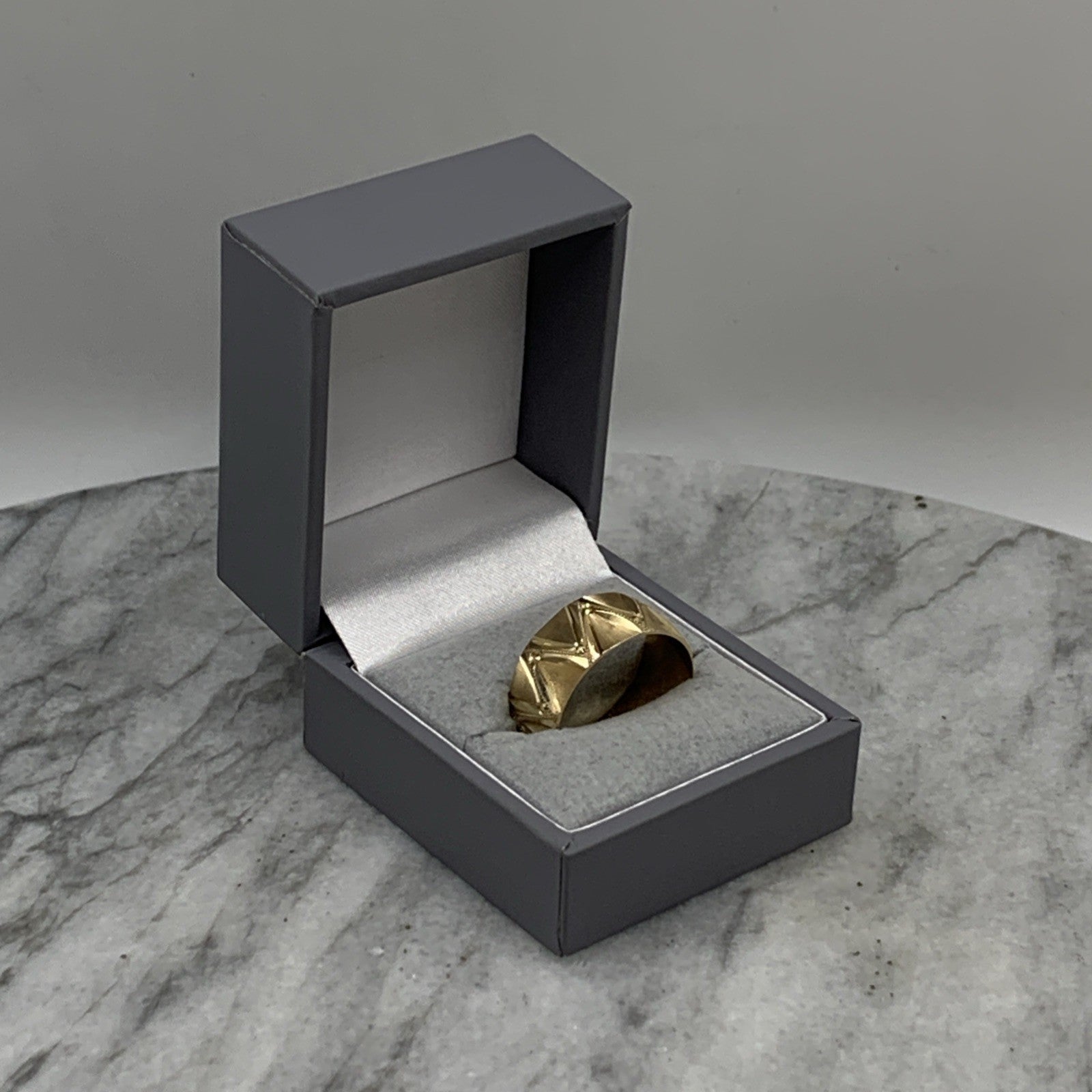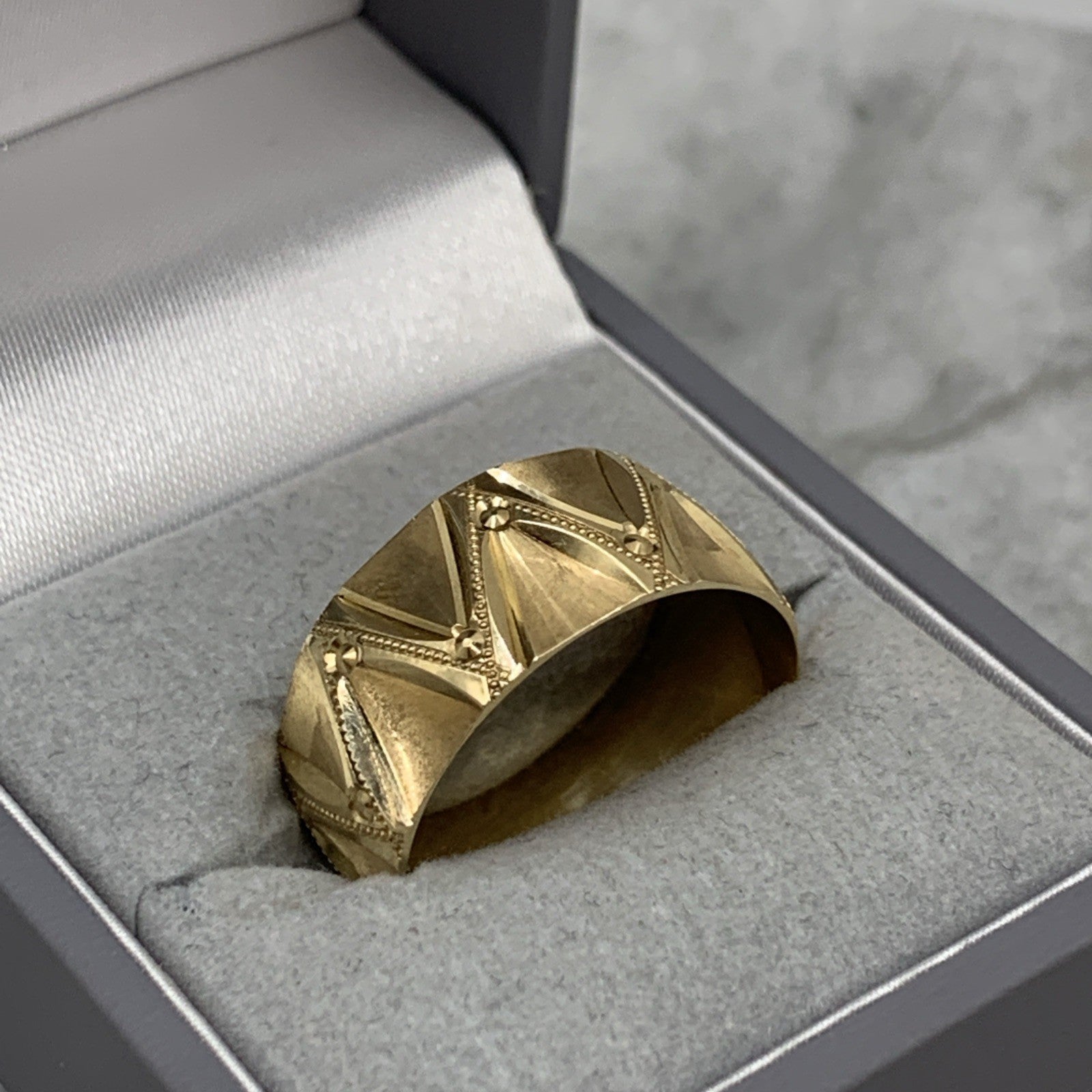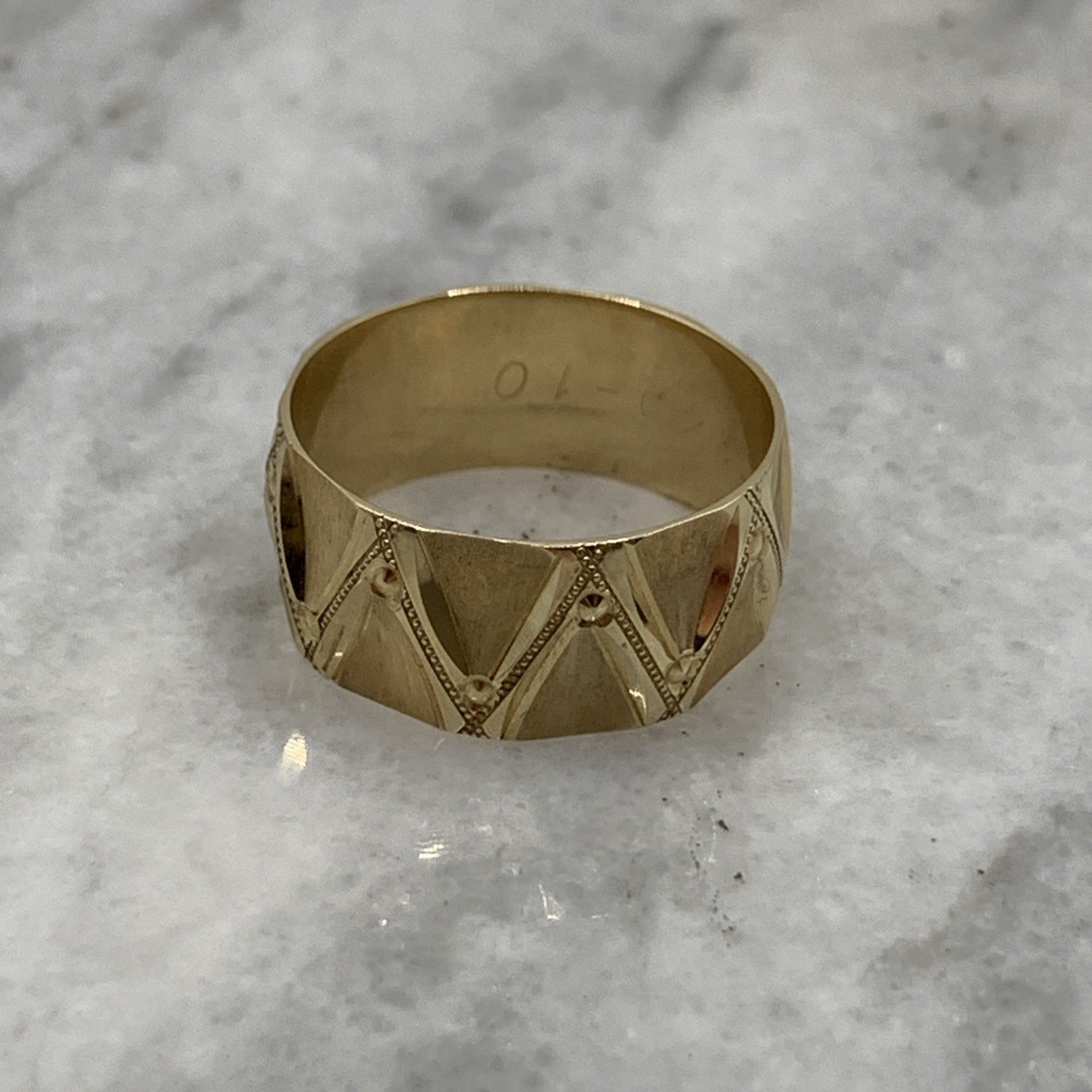 A stunning gold band ring featuring textured zig cag patterns with milgrain detailing.