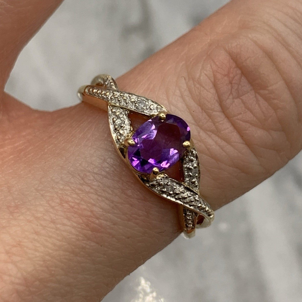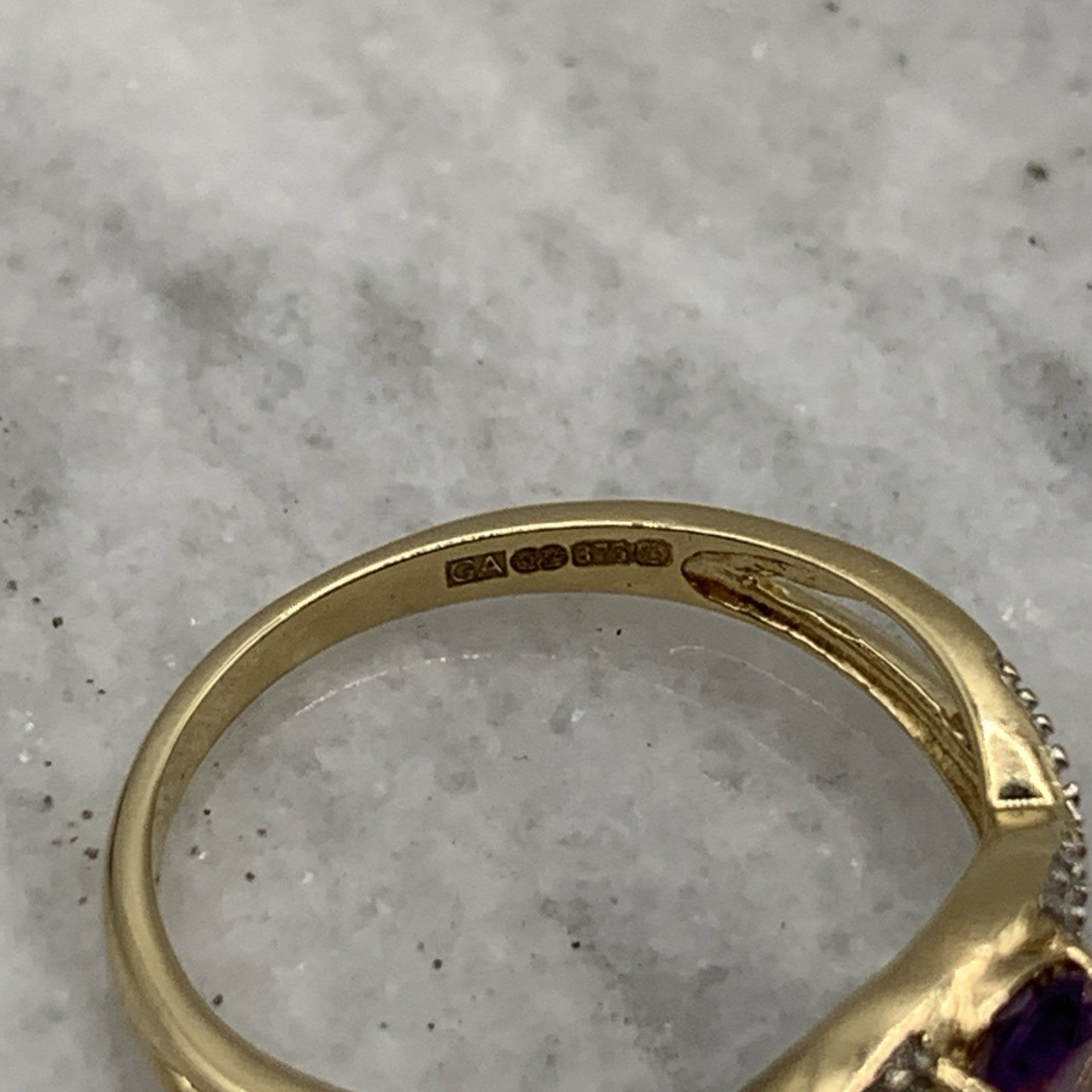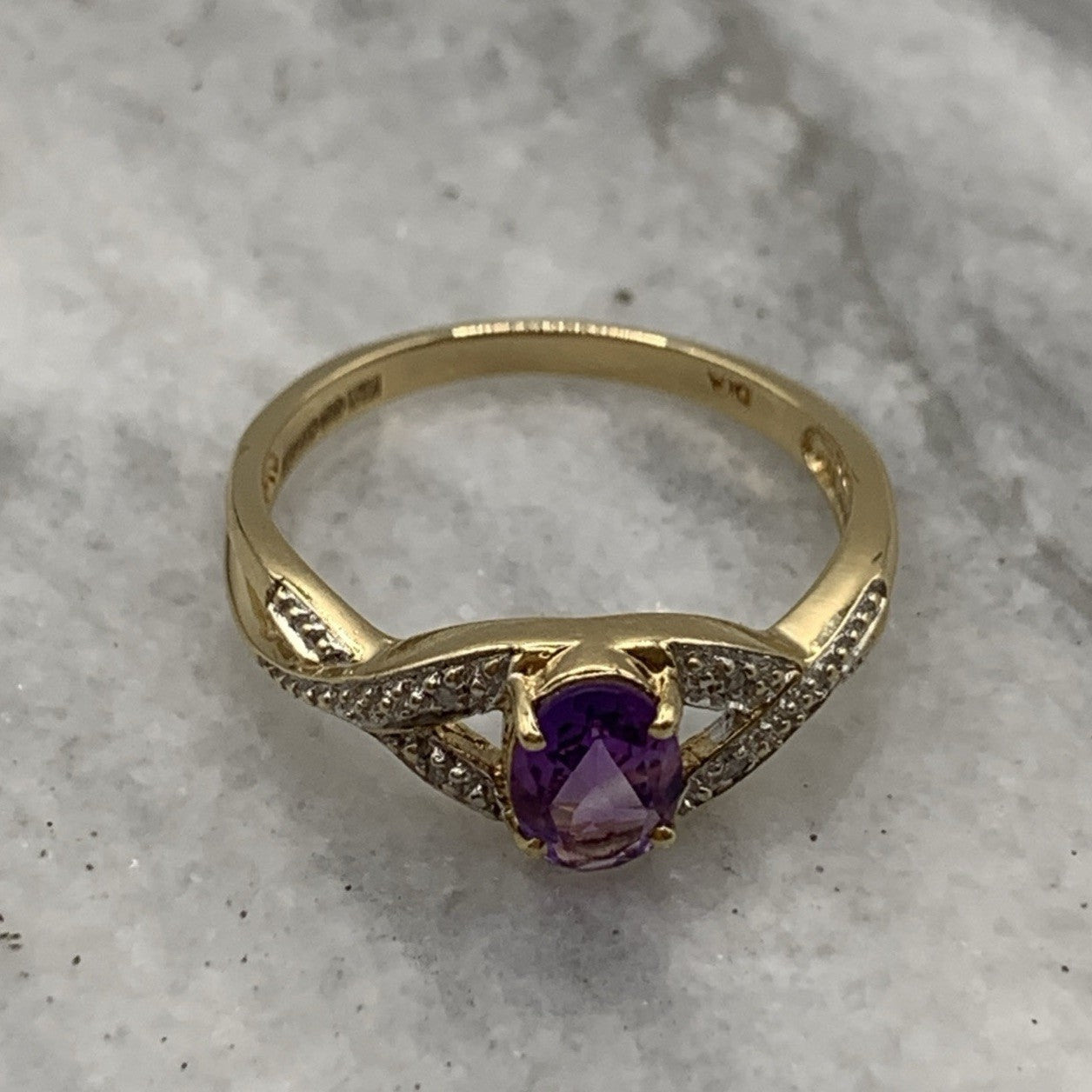 - A gorgeous gold ring showcasing an oval cut amethyst upon diamond adorned crossover style shoulders. Hallmarked.