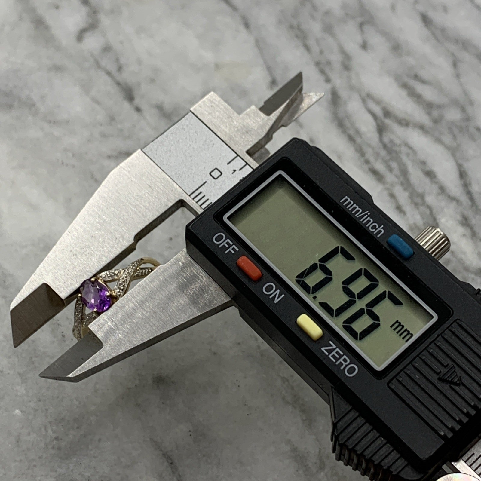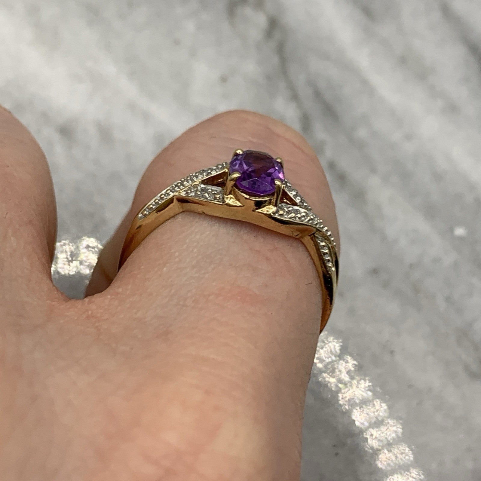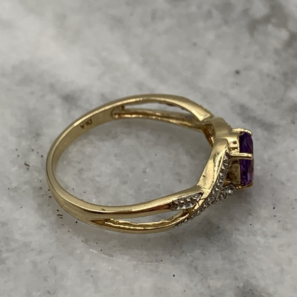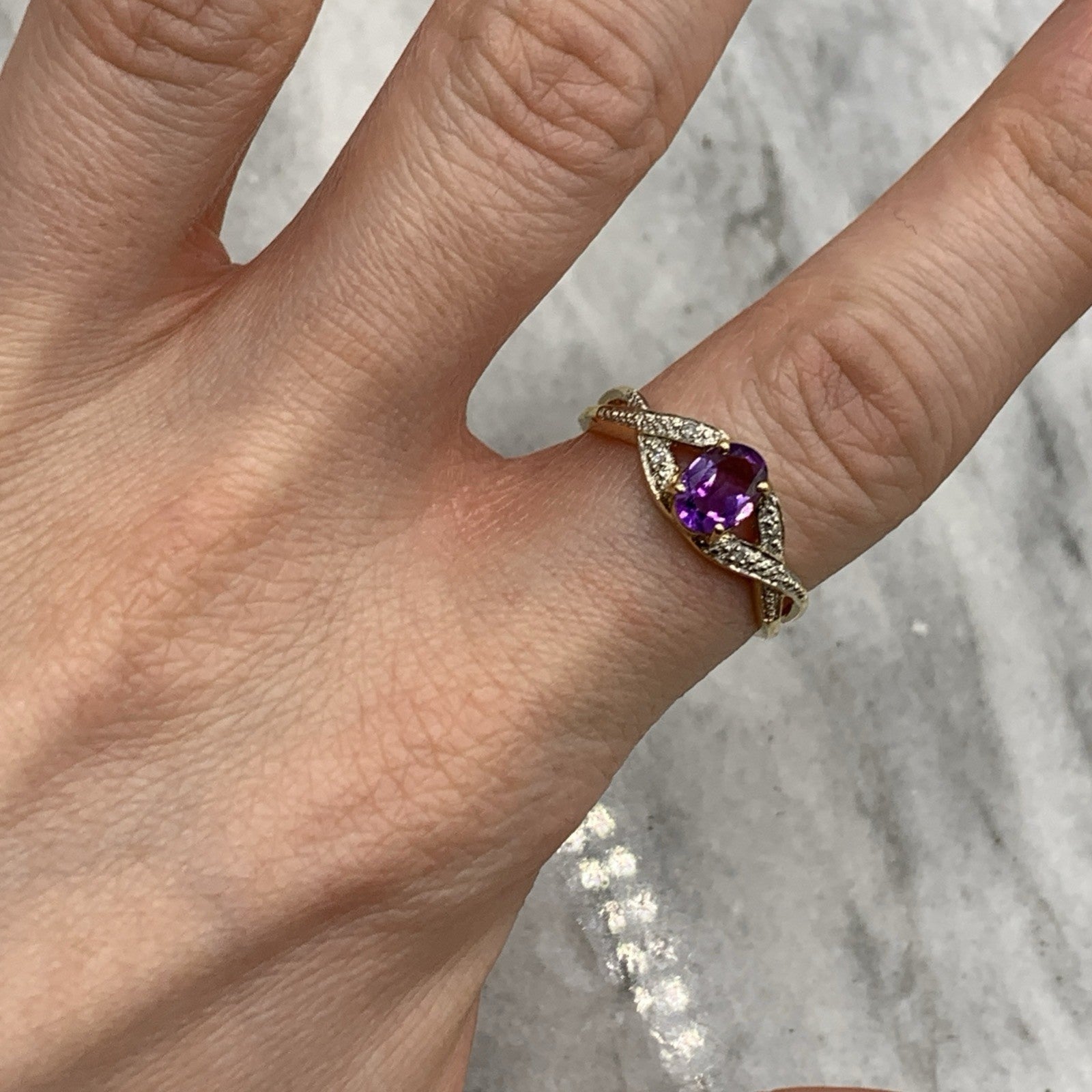 - A gorgeous gold ring showcasing an oval cut amethyst upon diamond adorned crossover style shoulders. Hallmarked.