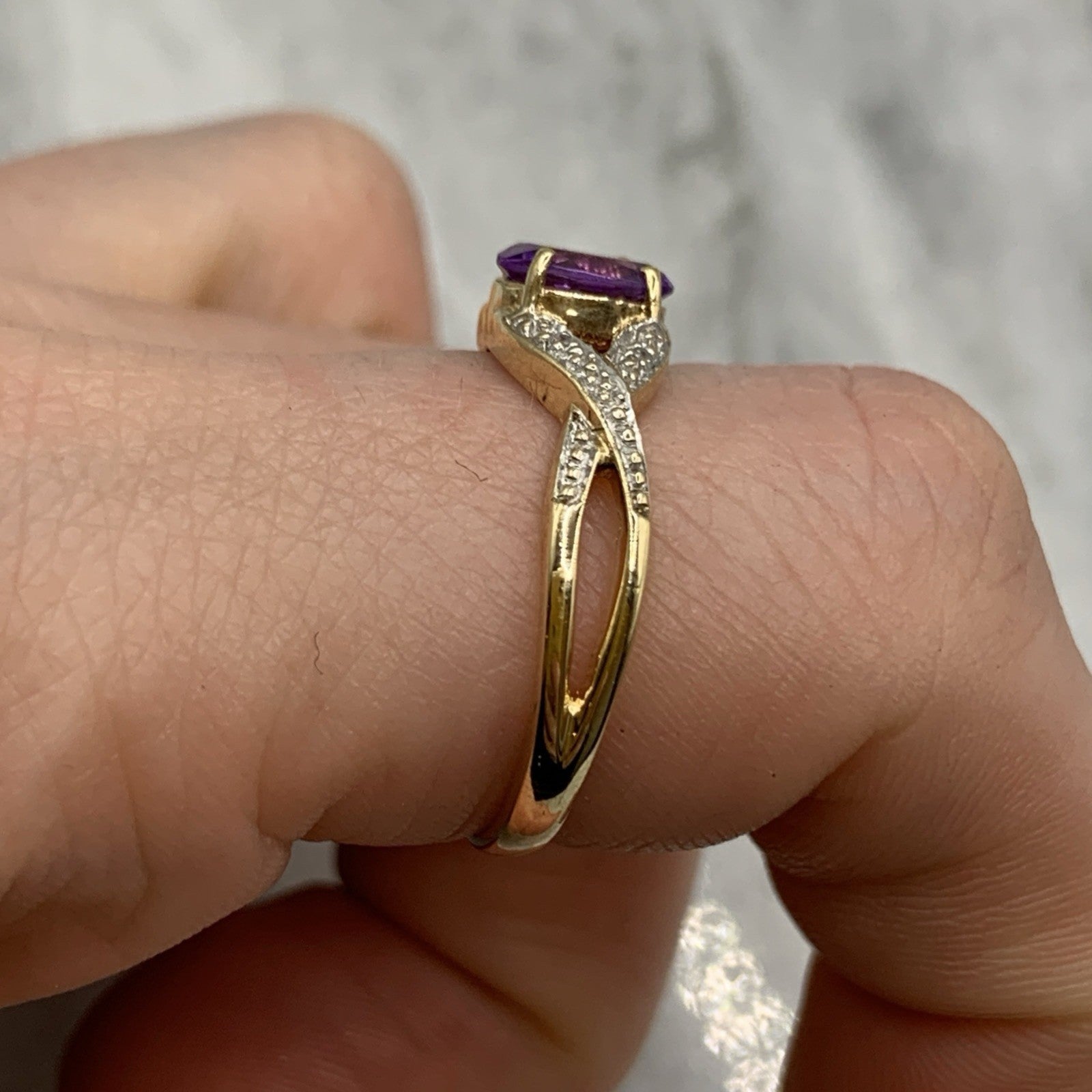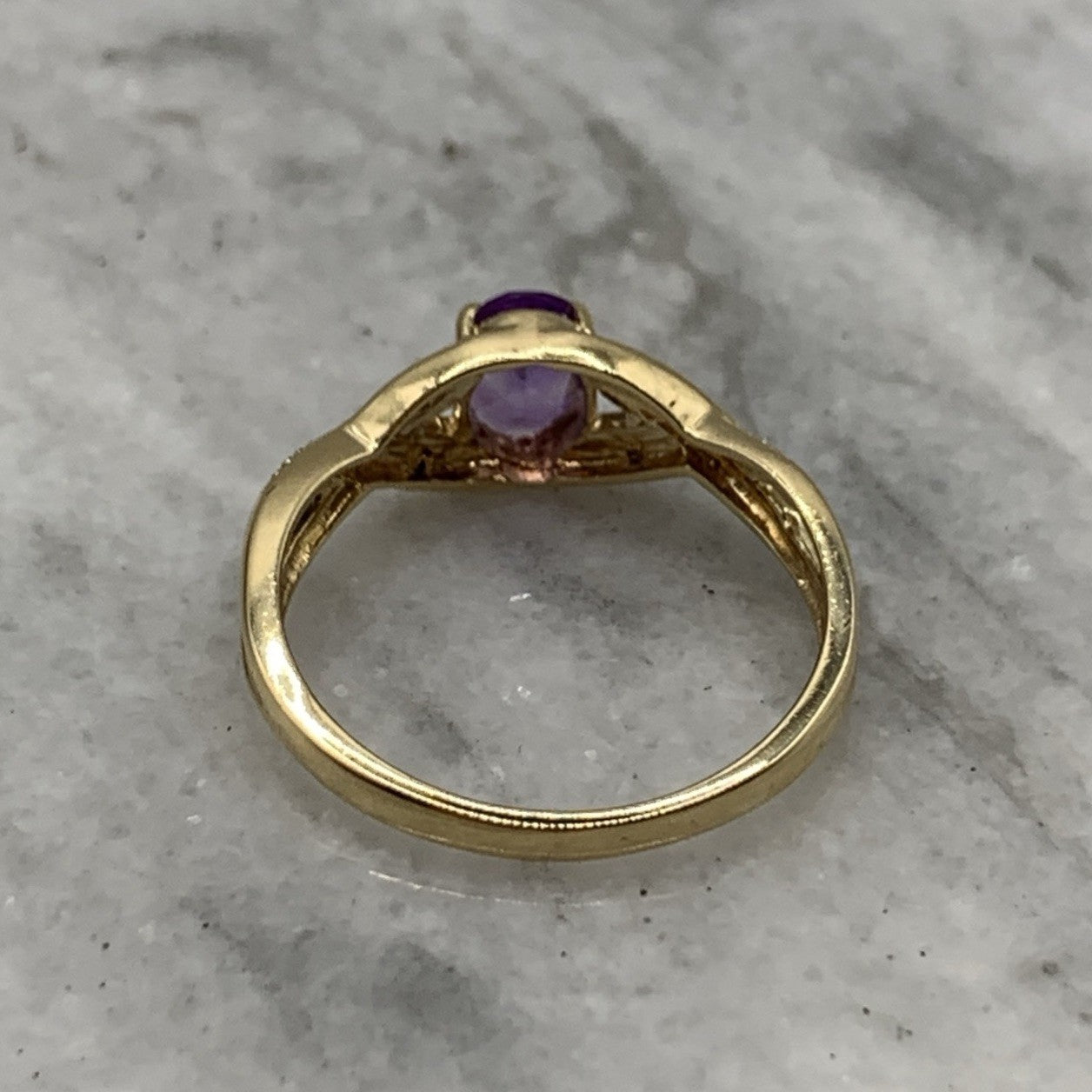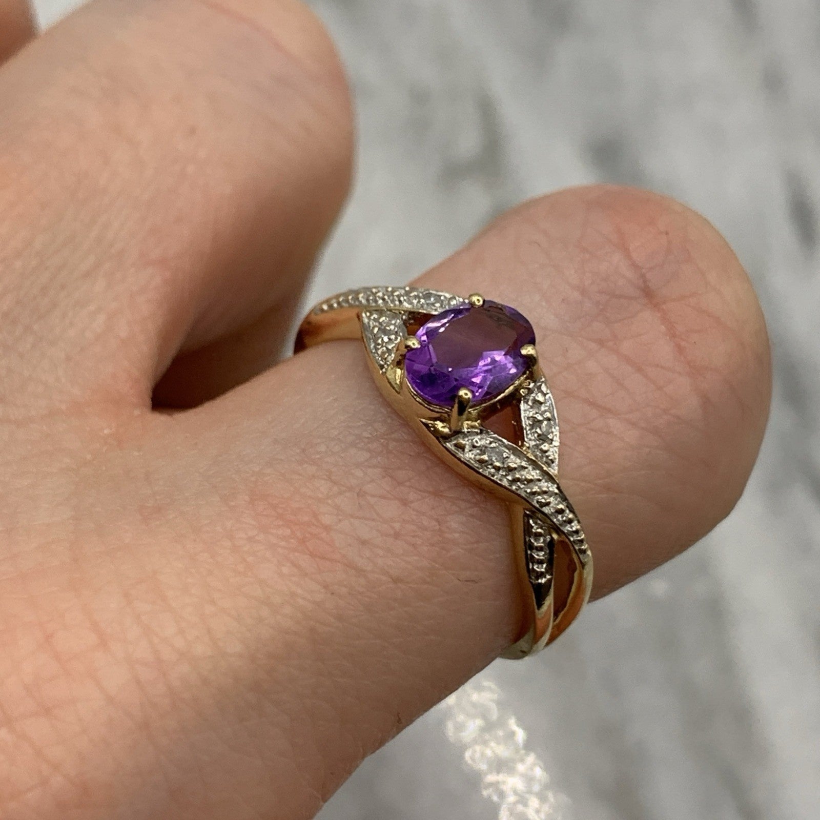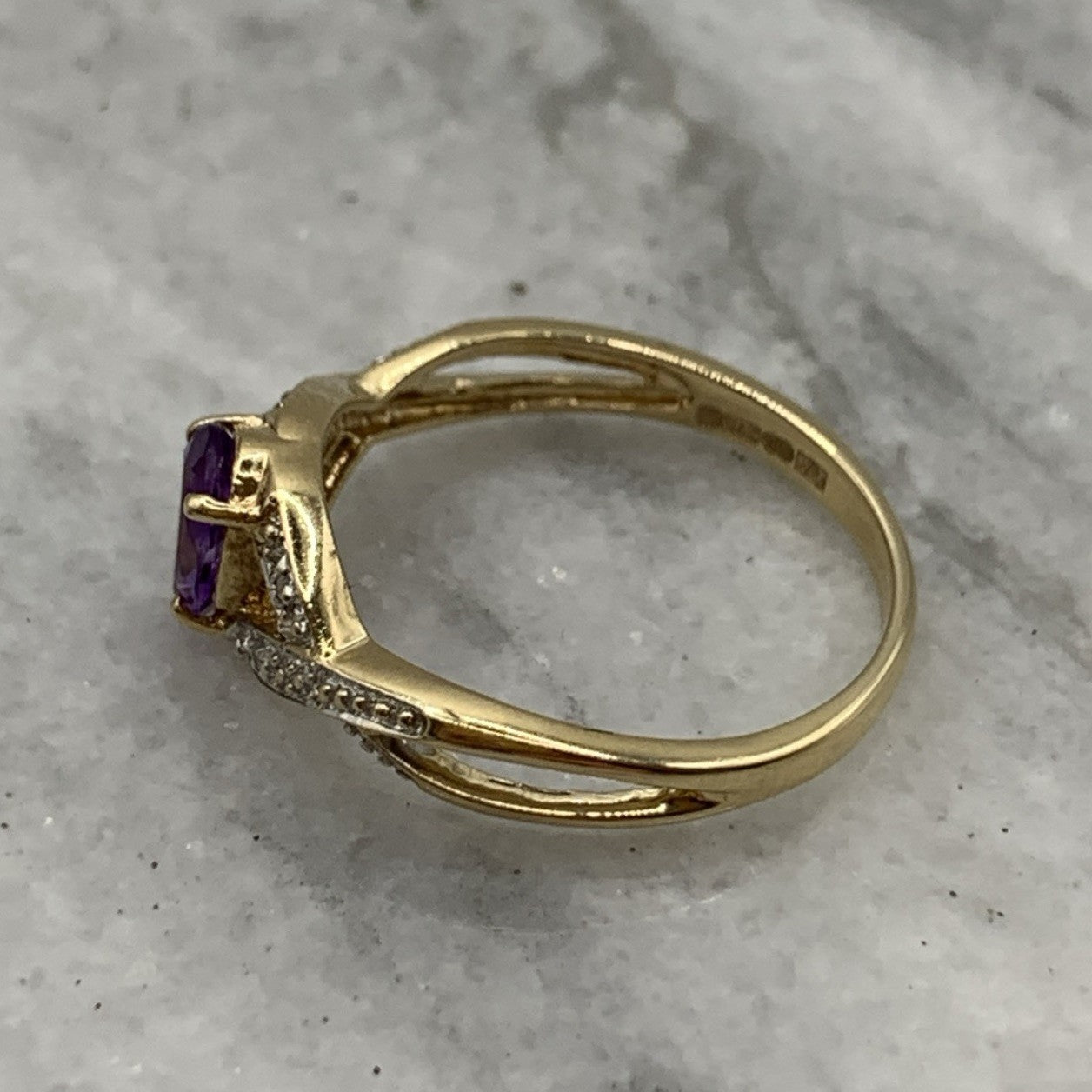 9 ct Gold Ring Amethyst & Diamond Crossover in 375 Yellow Gold - Size Q