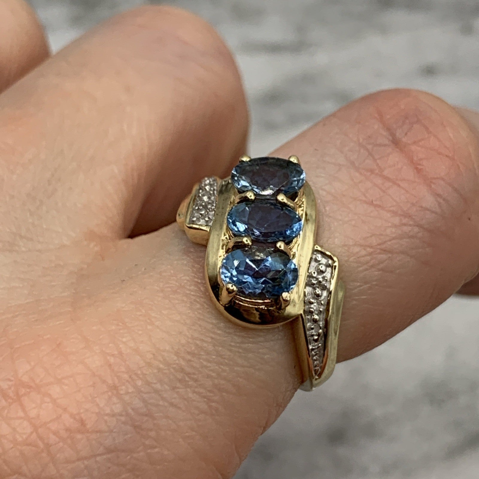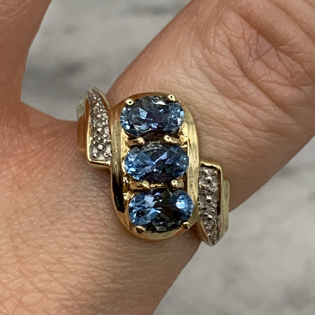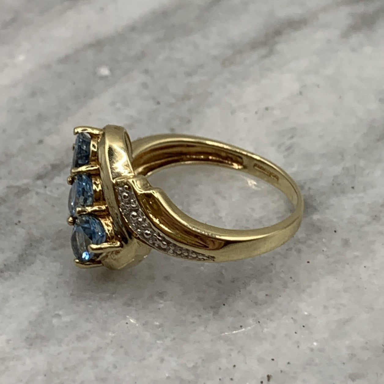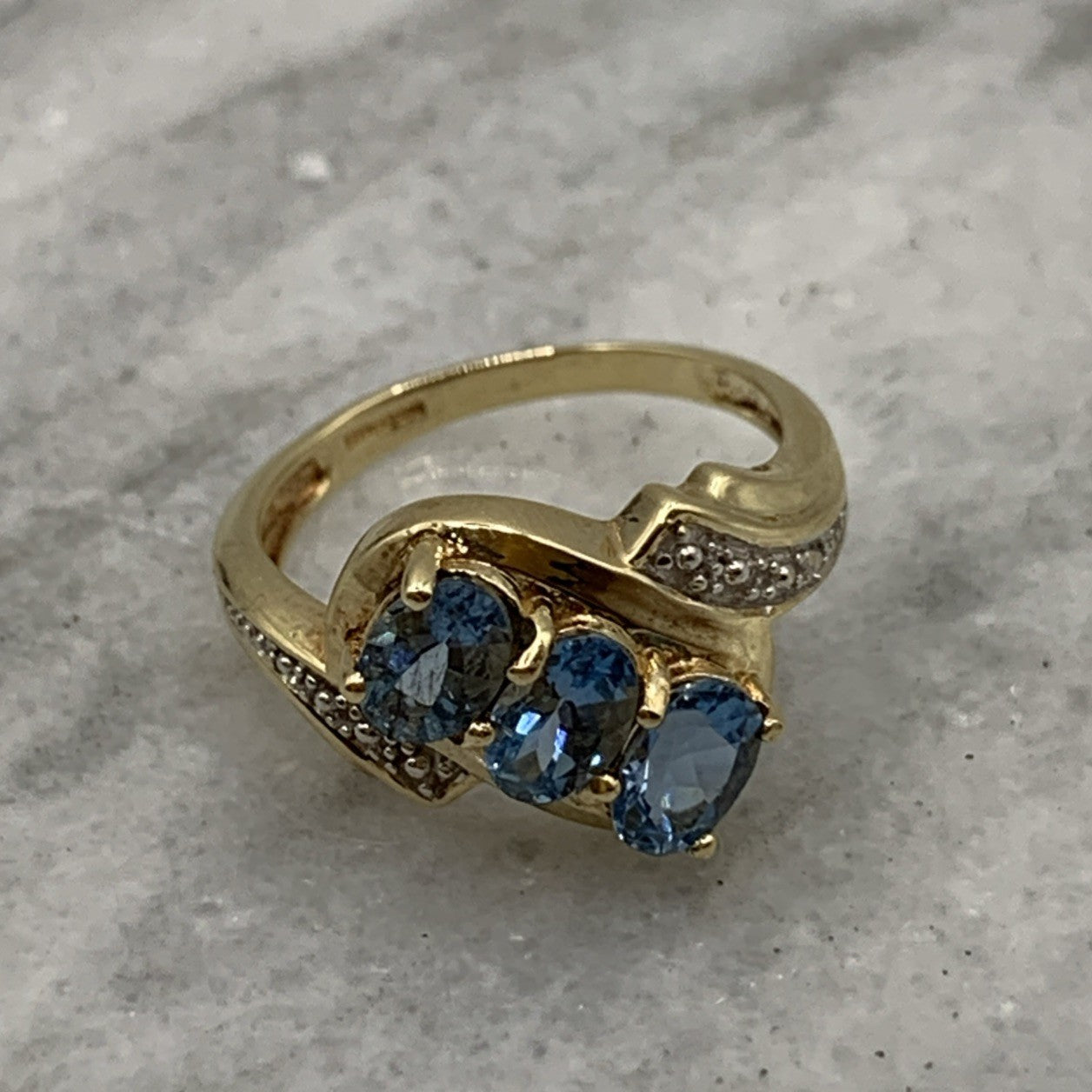 - A stunning bypass twist style ring featuring a trilogy of aquamarines accented by petite pave set diamonds. Hallmarked.