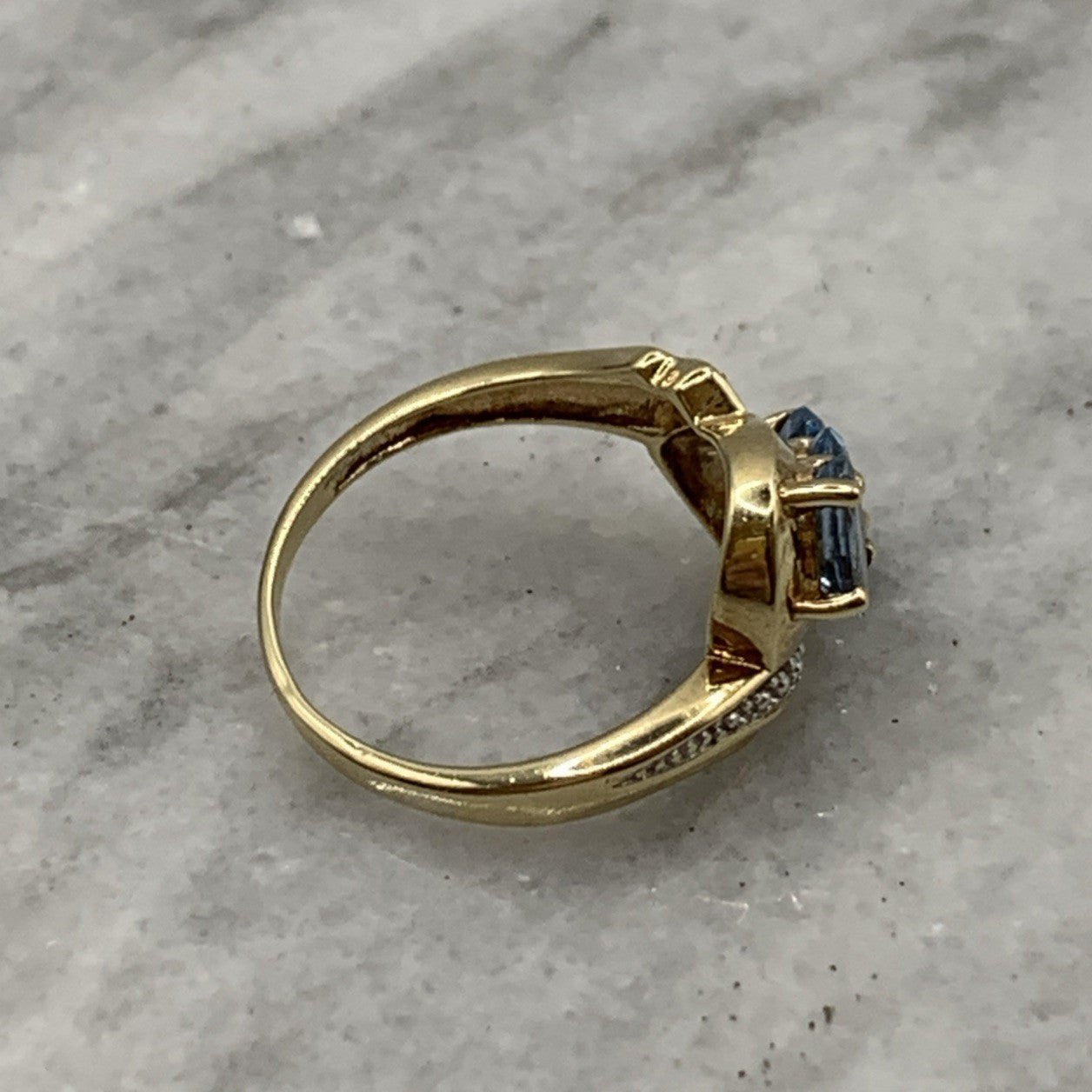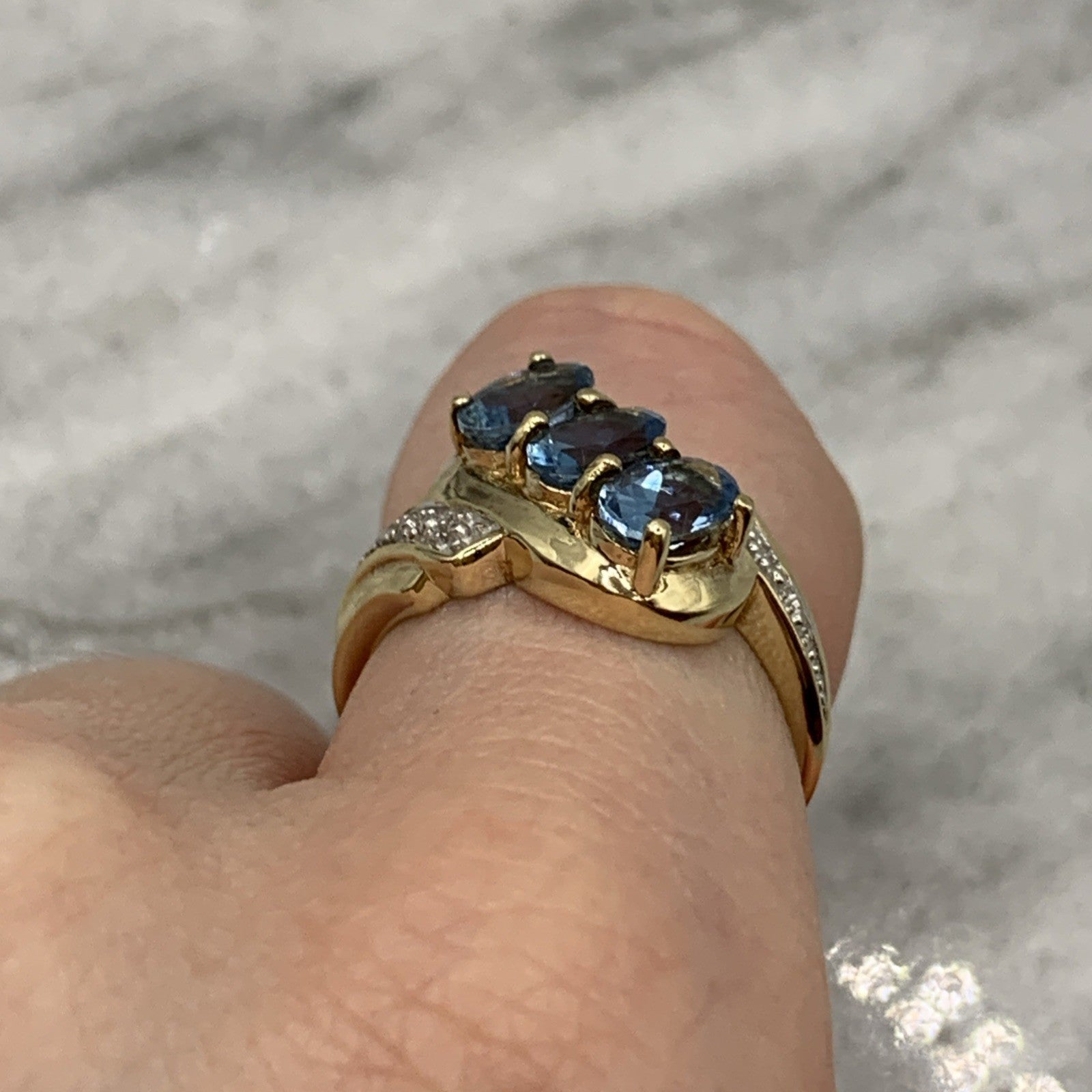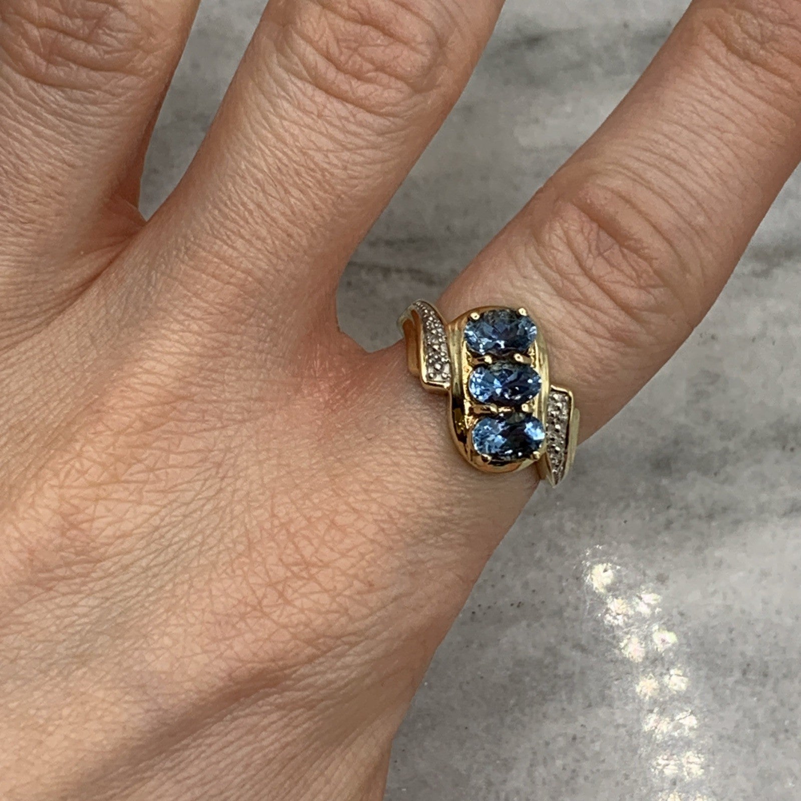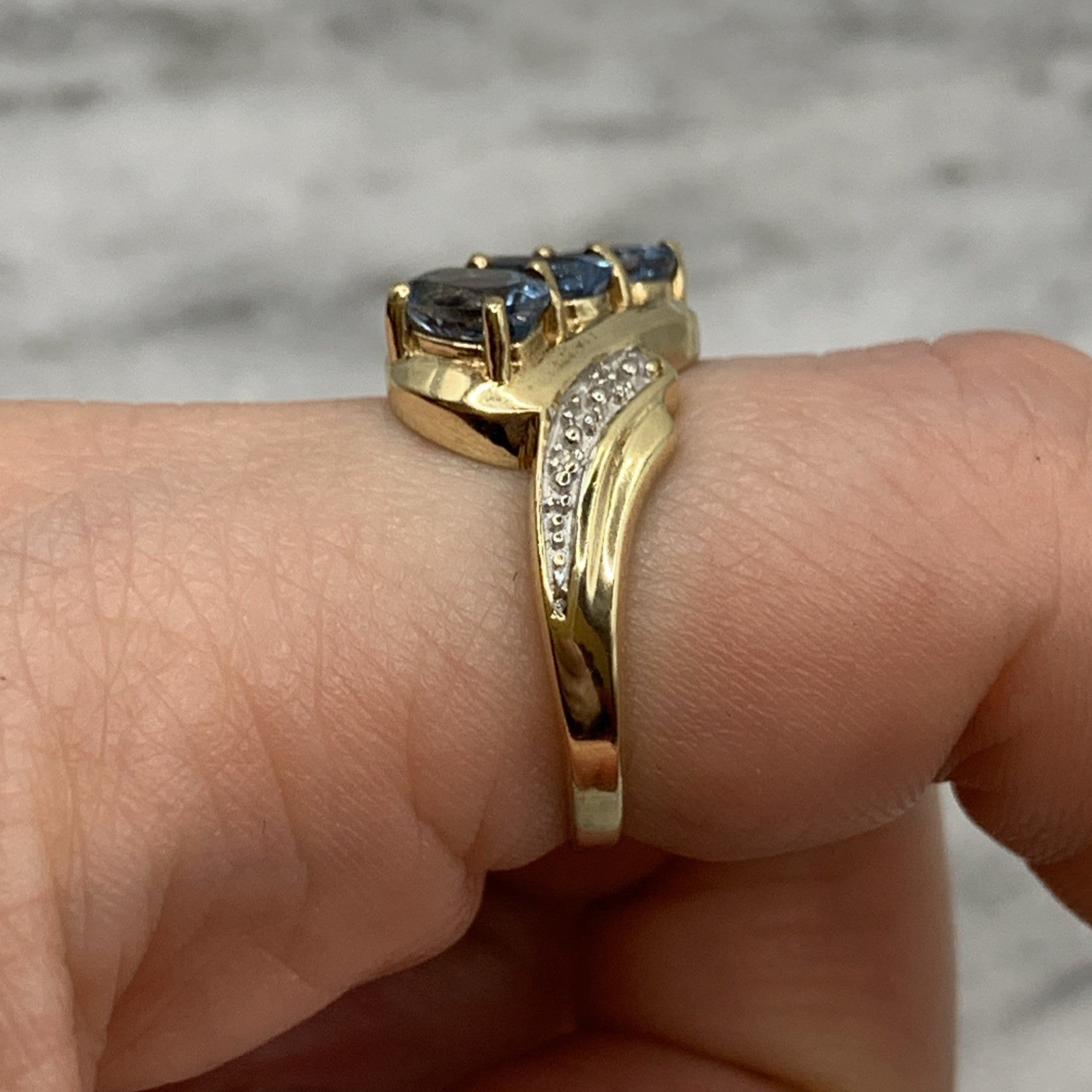 - A stunning bypass twist style ring featuring a trilogy of aquamarines accented by petite pave set diamonds. Hallmarked.