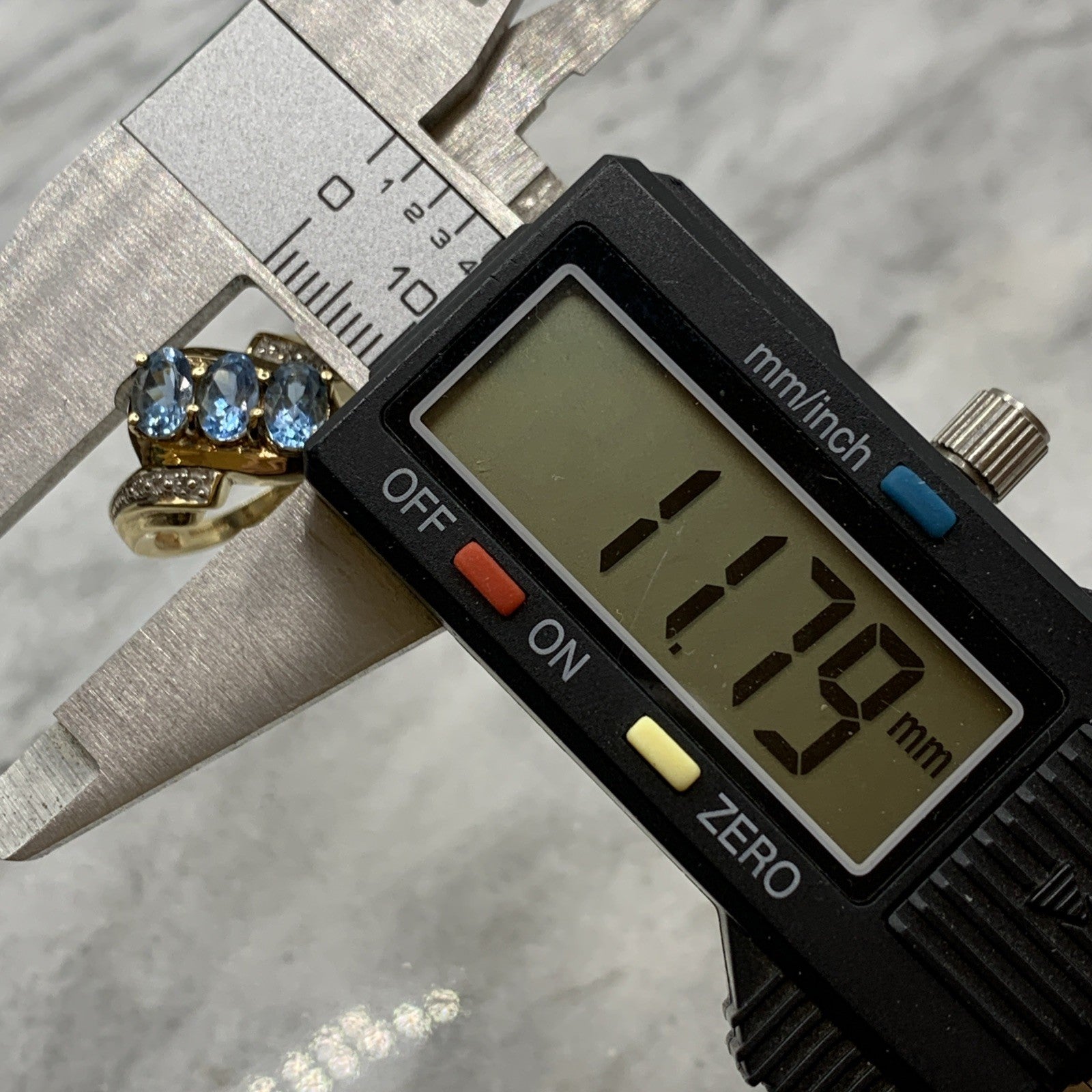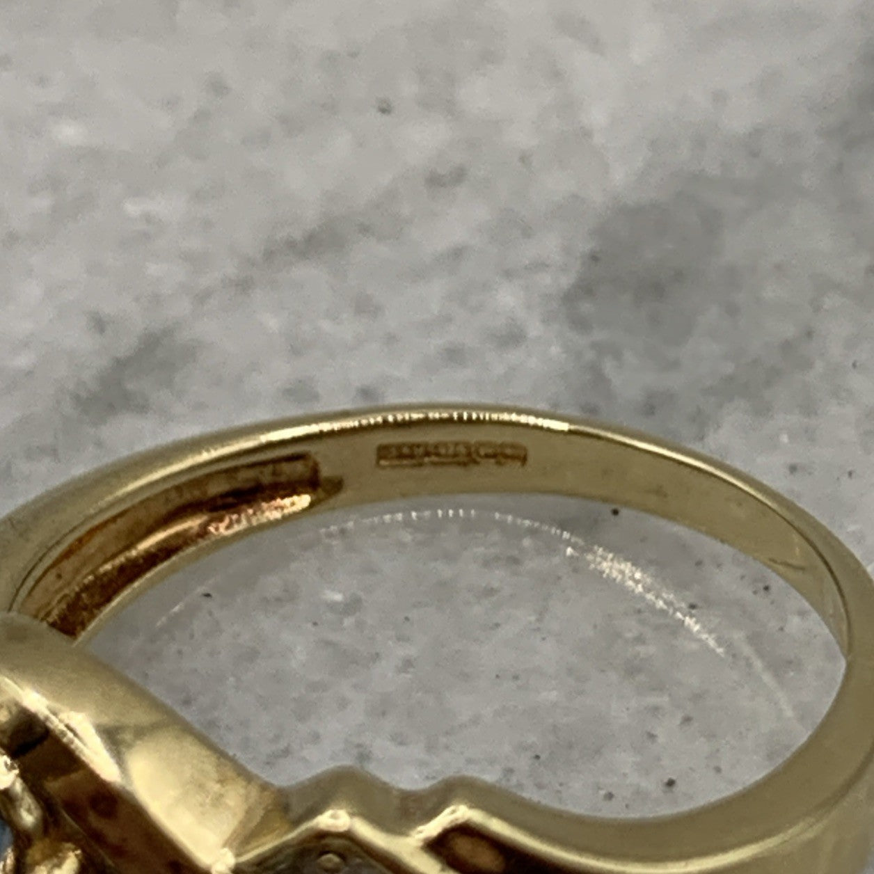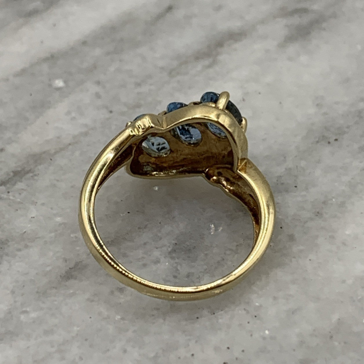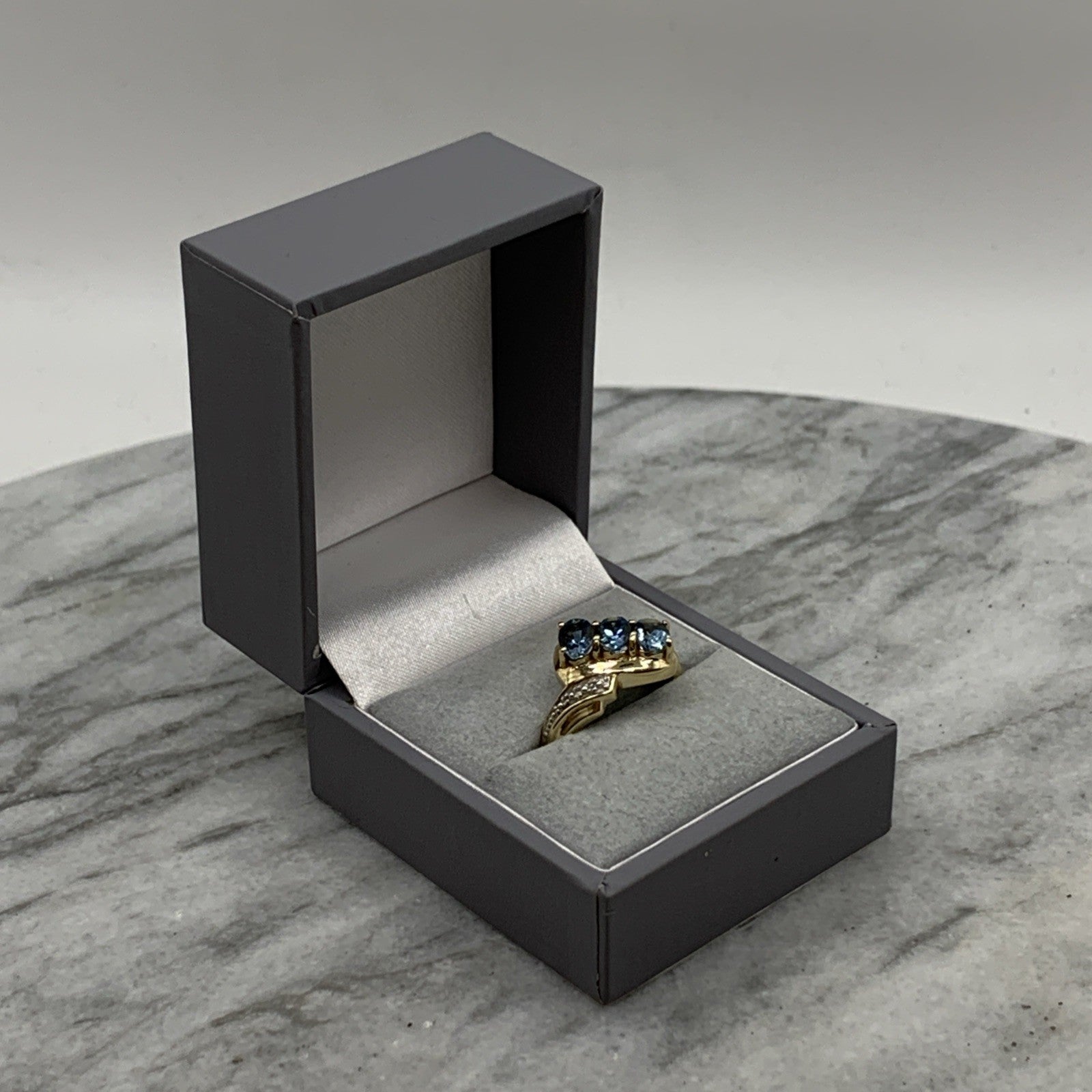 - A stunning bypass twist style ring featuring a trilogy of aquamarines accented by petite pave set diamonds. Hallmarked.