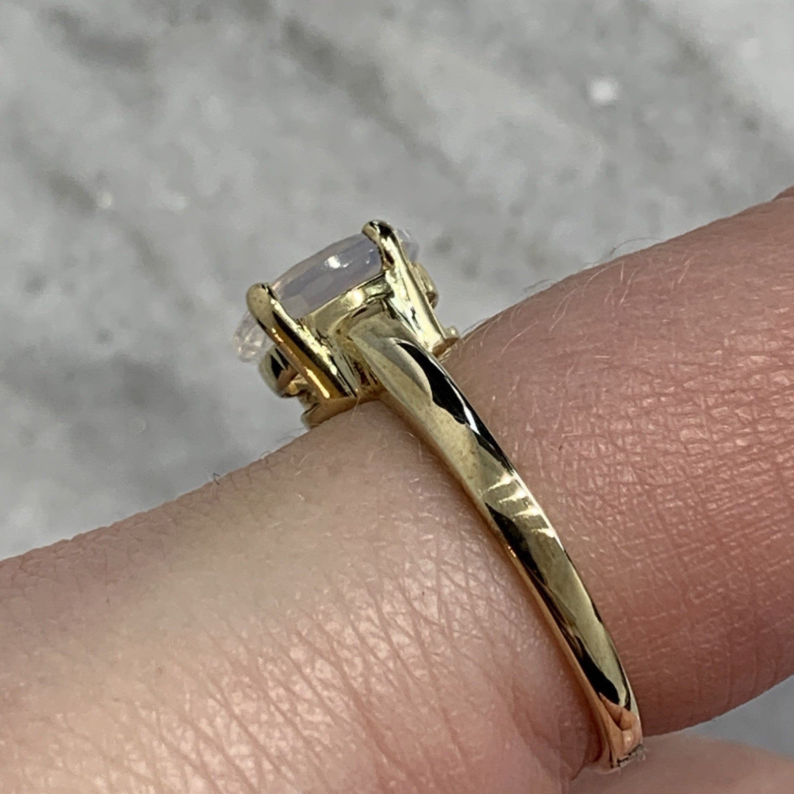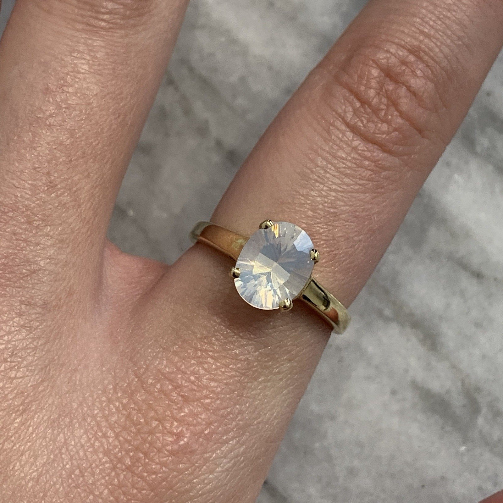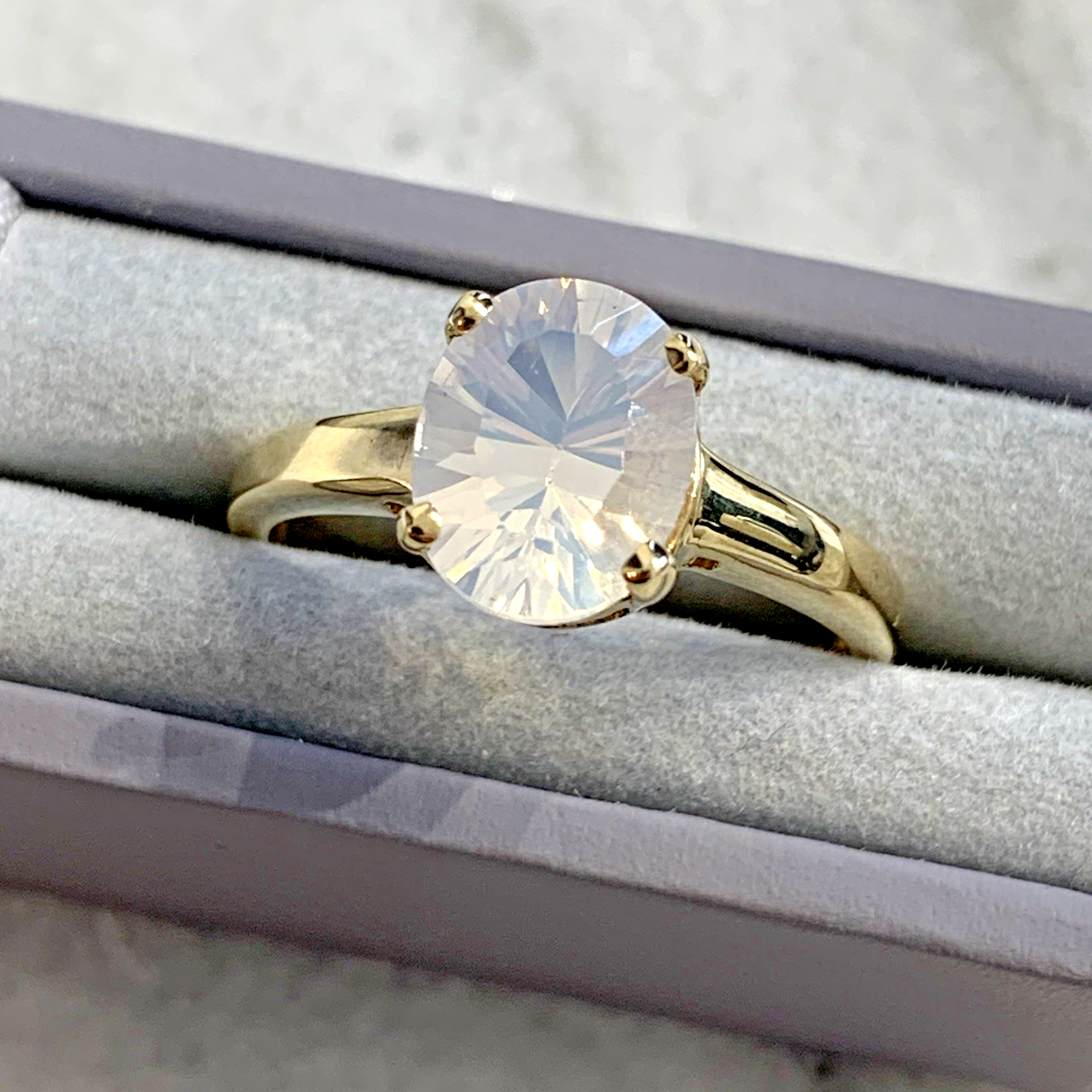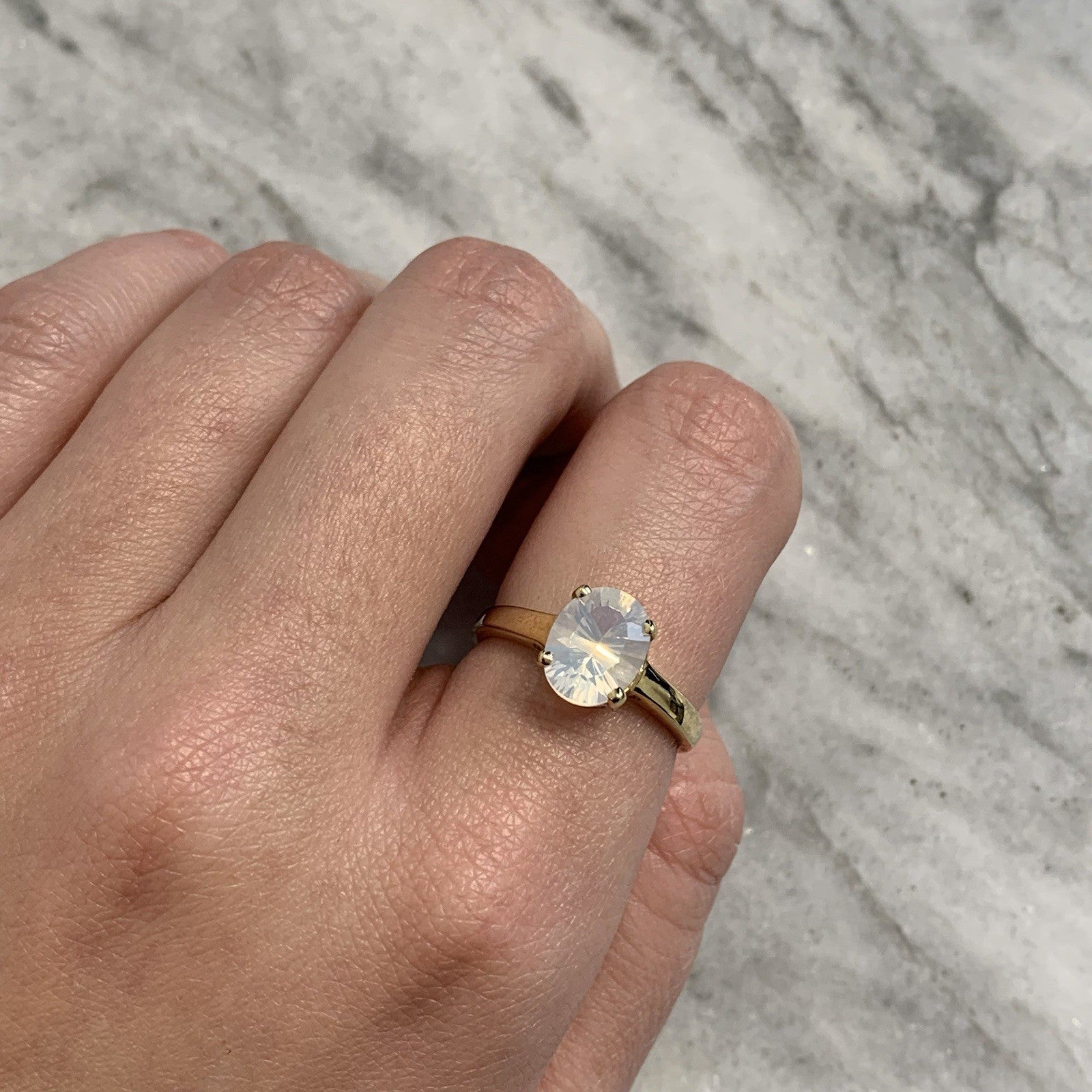 - A beautiful gold solitaire ring showcasing a mesmerizing oval cut blue moon quartz at 1.5ct.