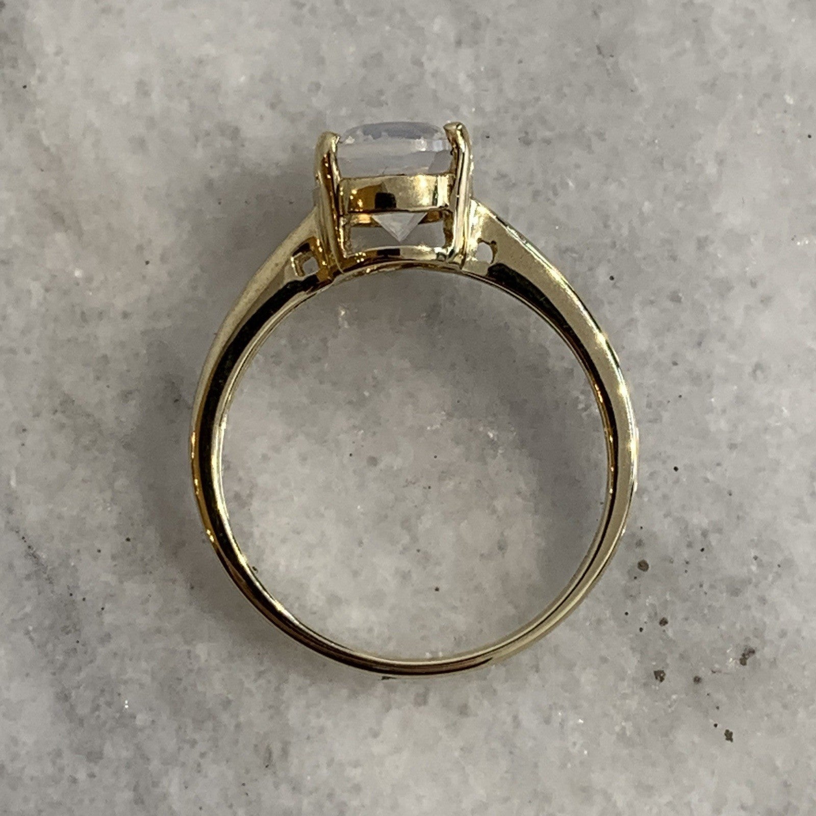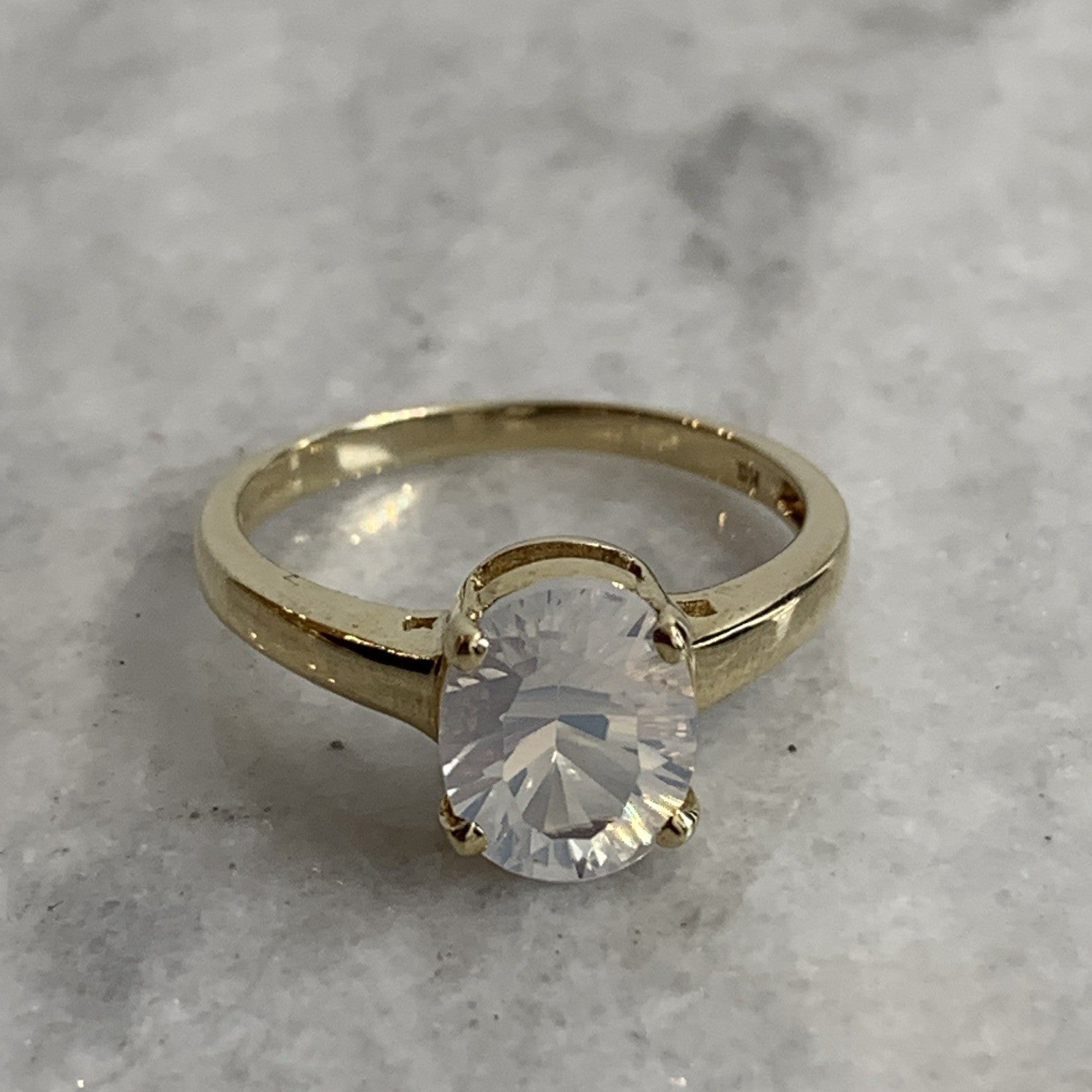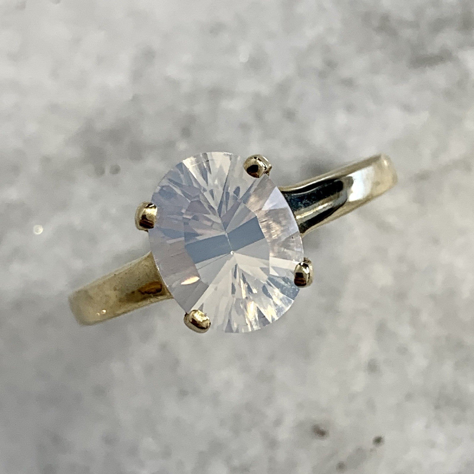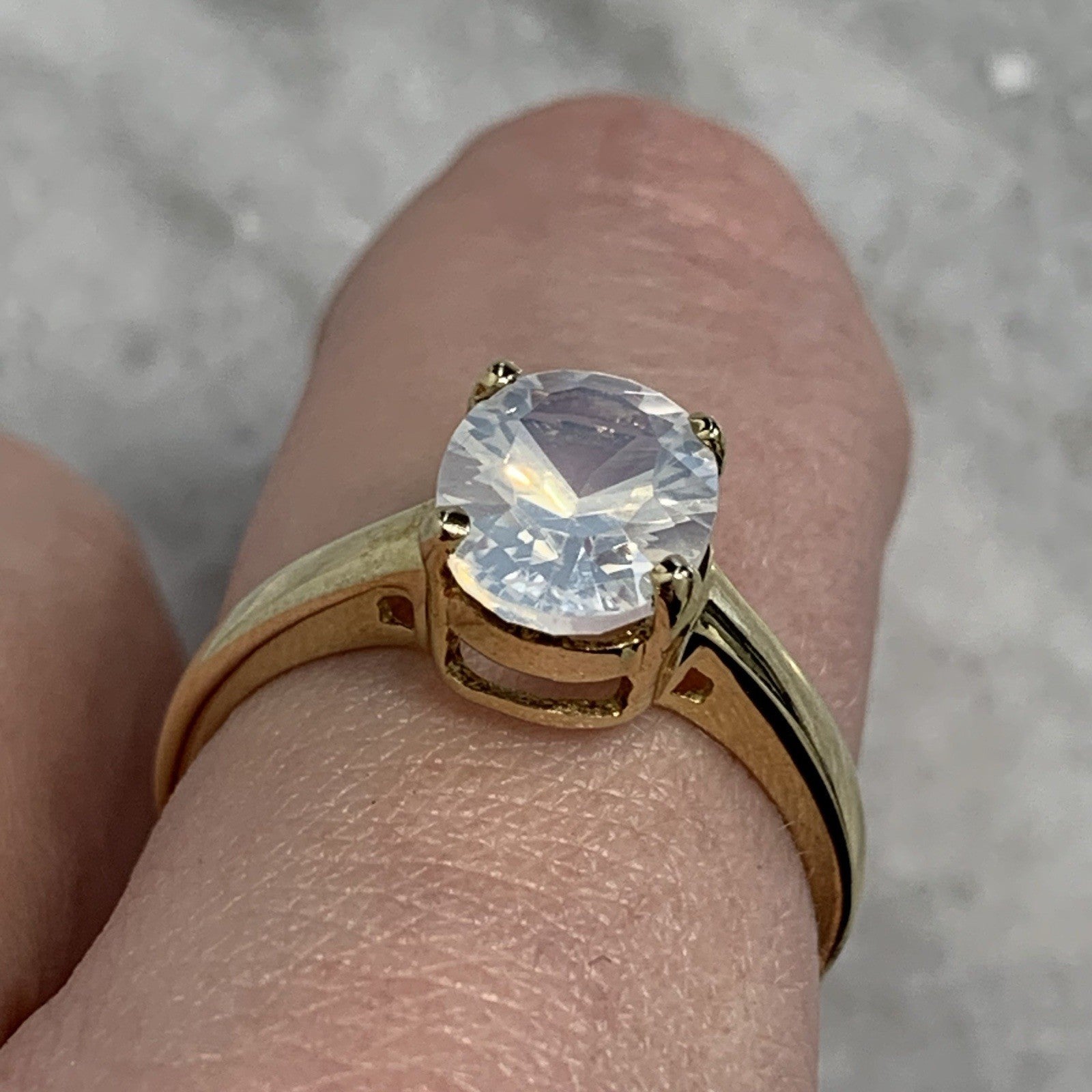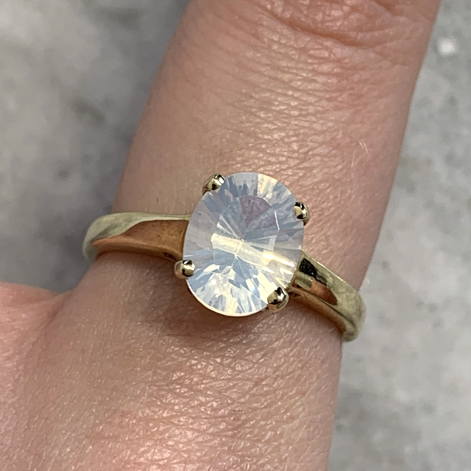 - A beautiful gold solitaire ring showcasing a mesmerizing oval cut blue moon quartz at 1.5ct.