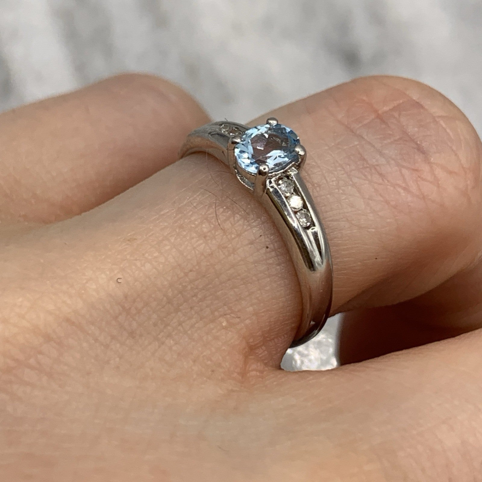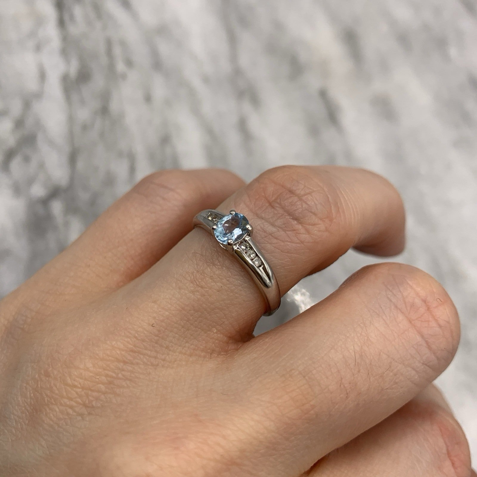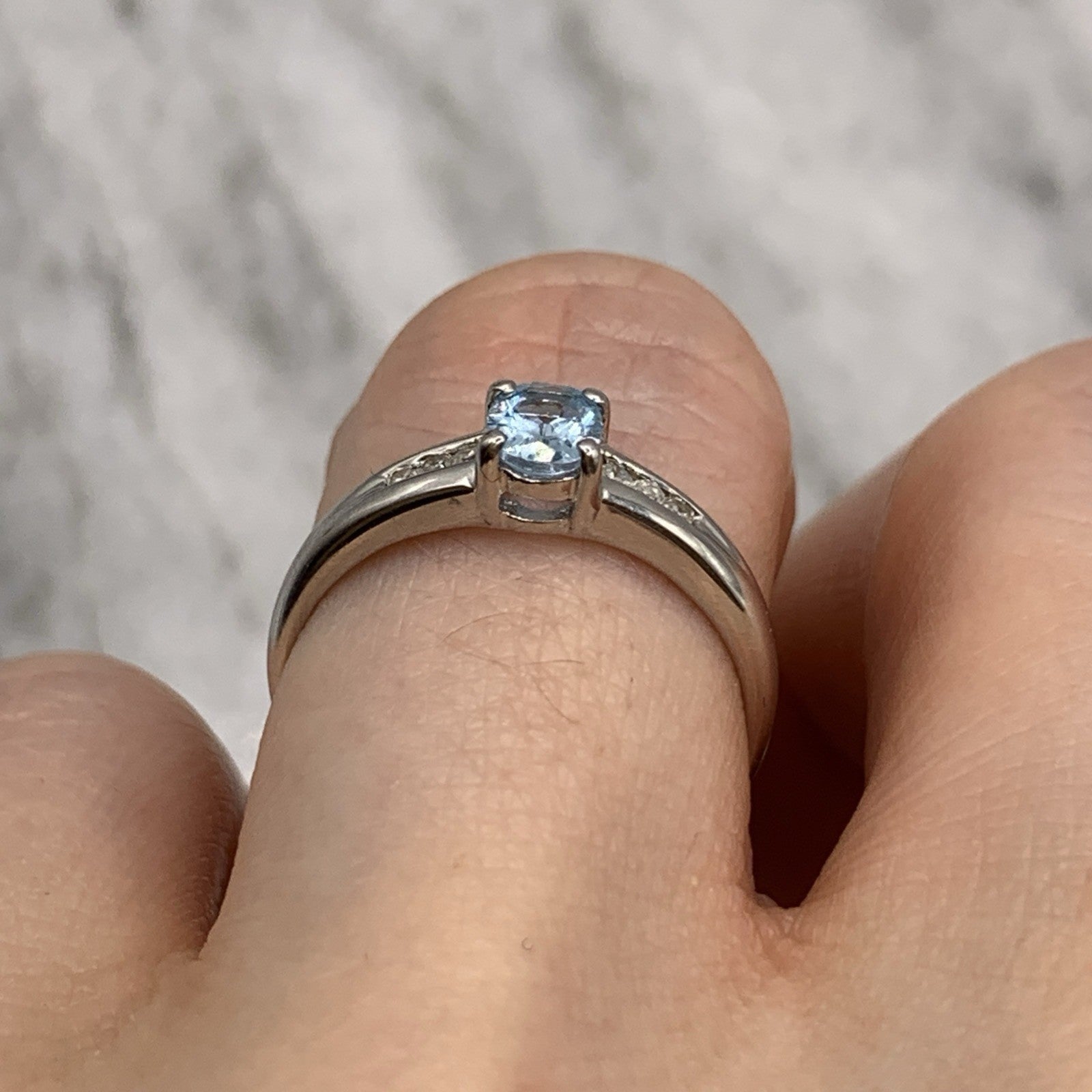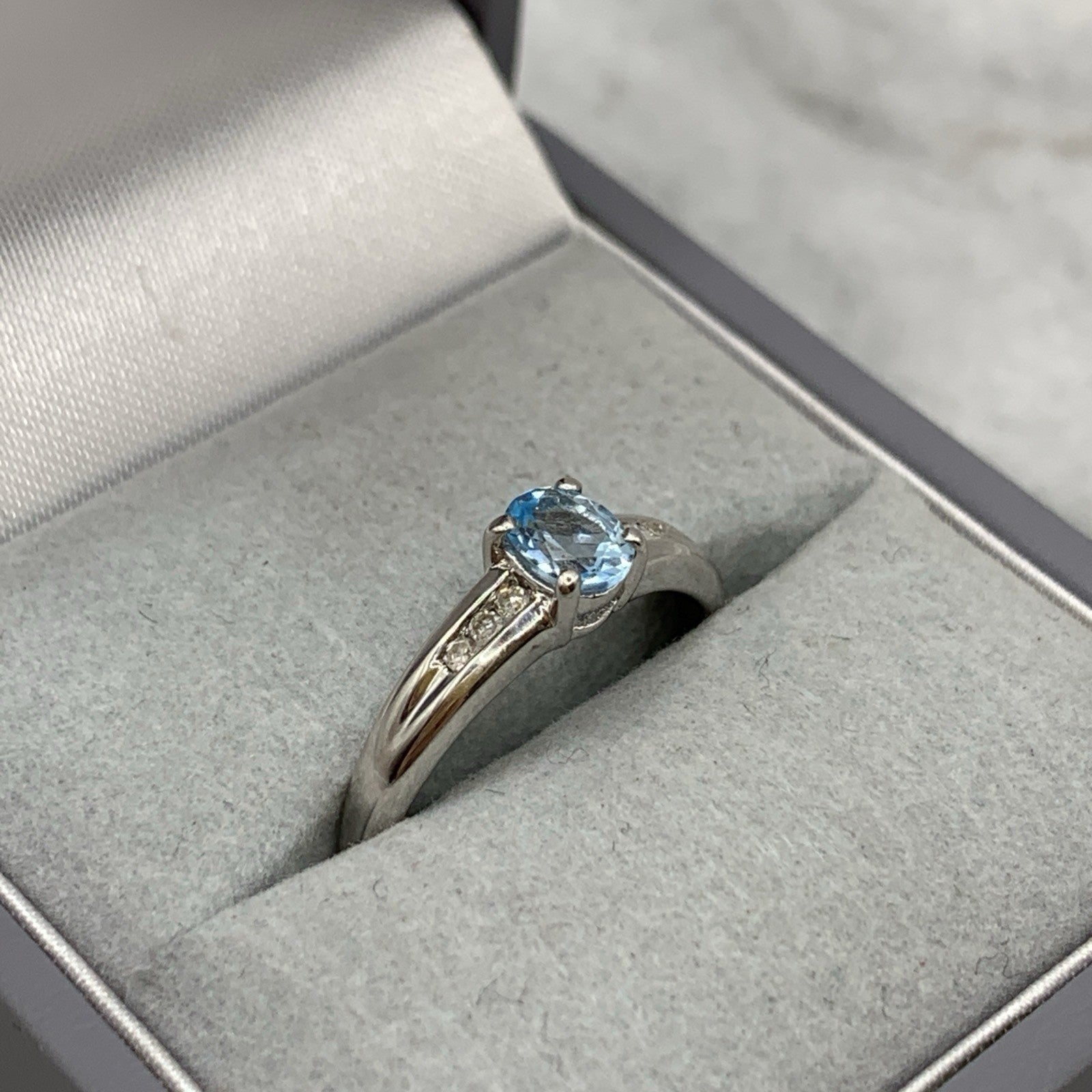 - A gorgeous white gold ring showcasing an oval cut blue topaz accented by channel set diamond shoulders.