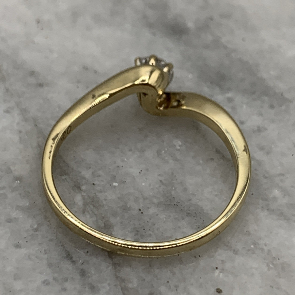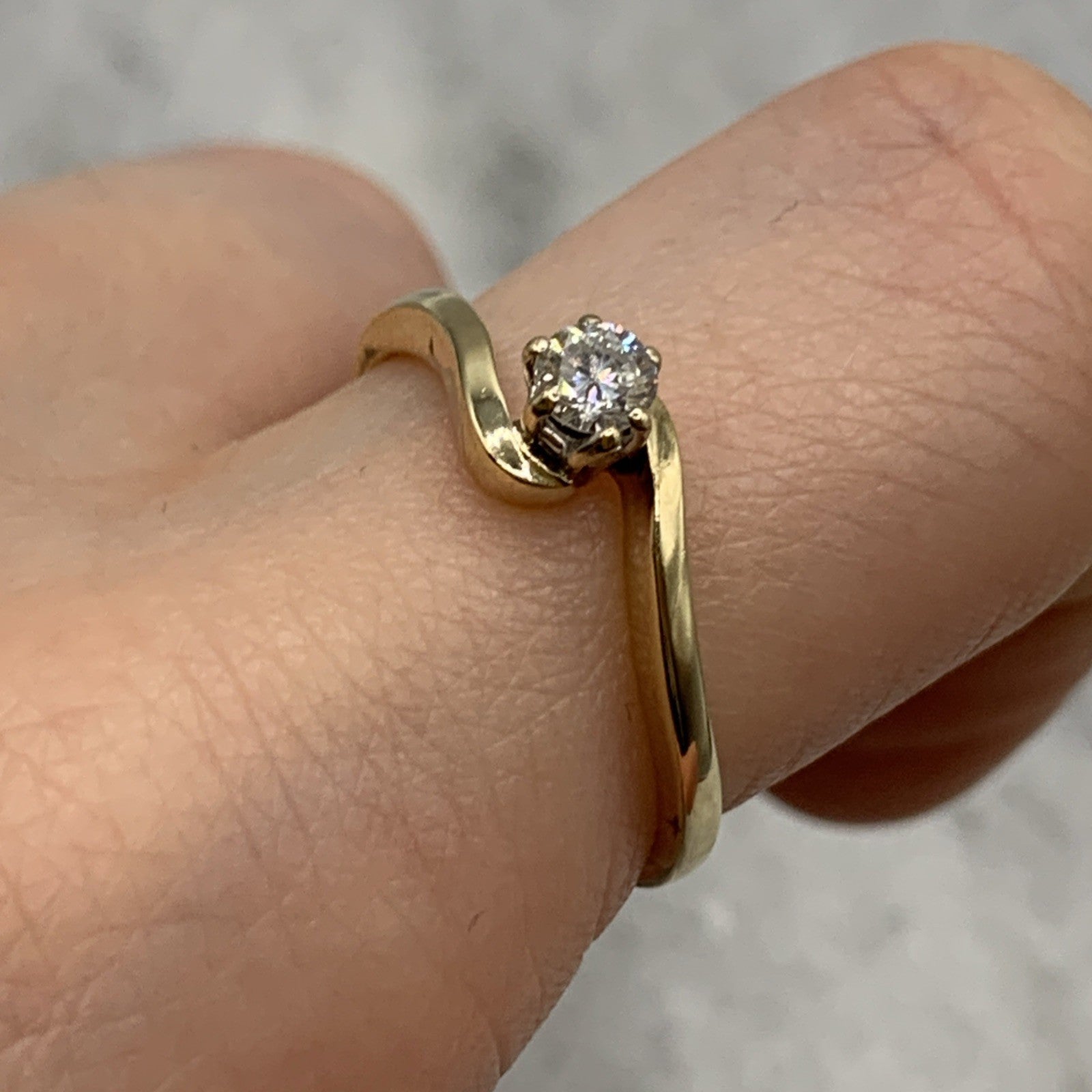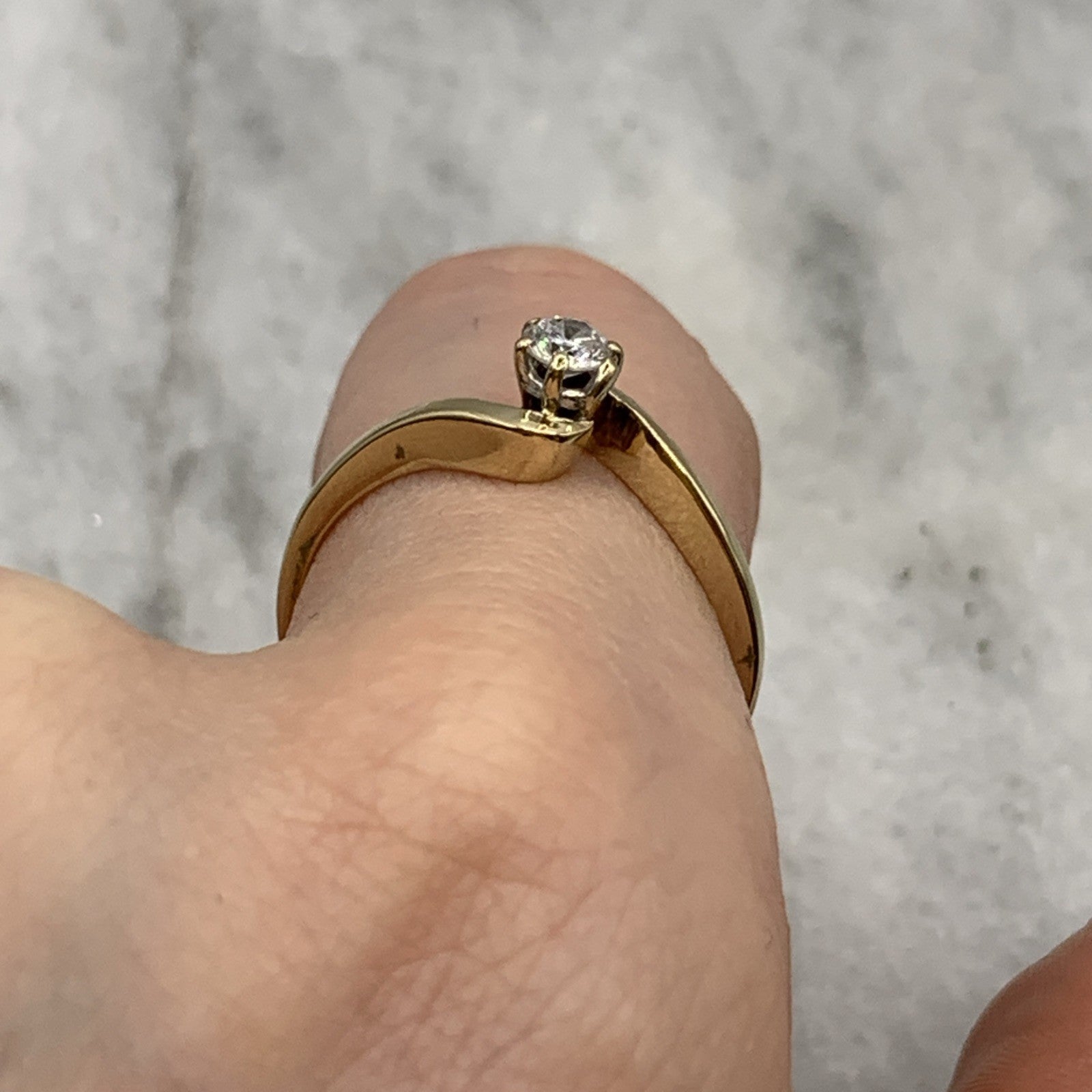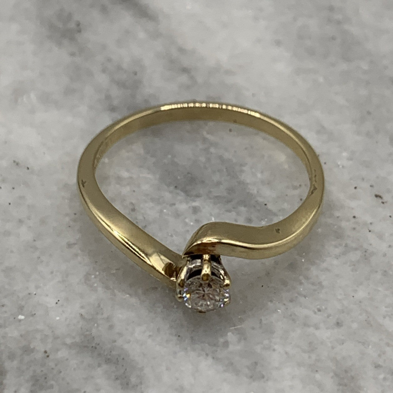 - A lovely gold bypass style ring showcasing a solitaire diamond at .20ct. Hallmarked.
