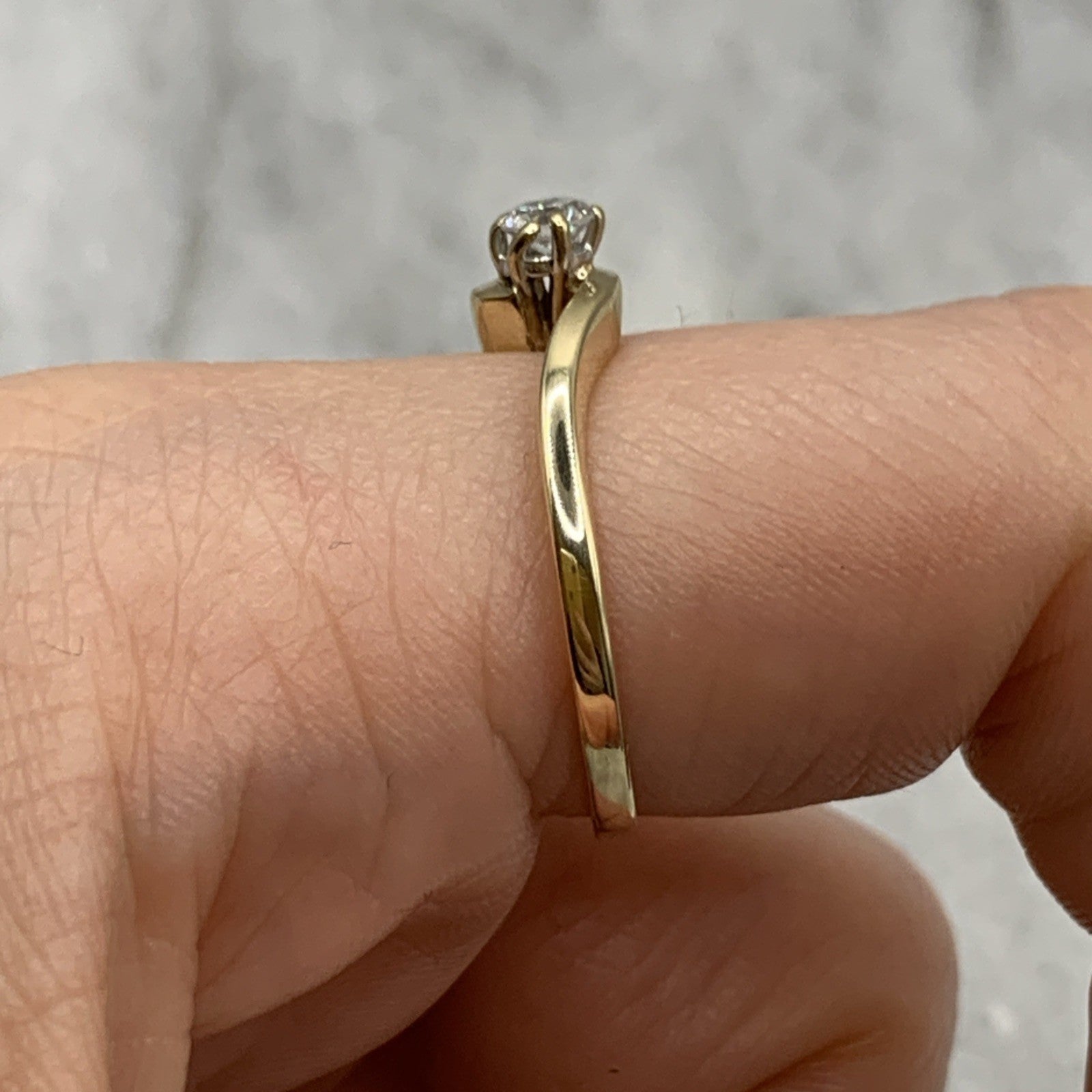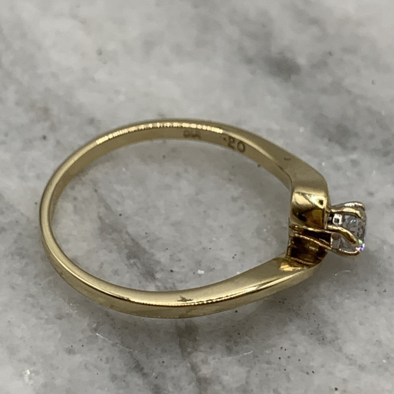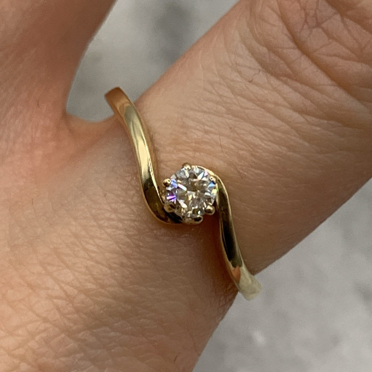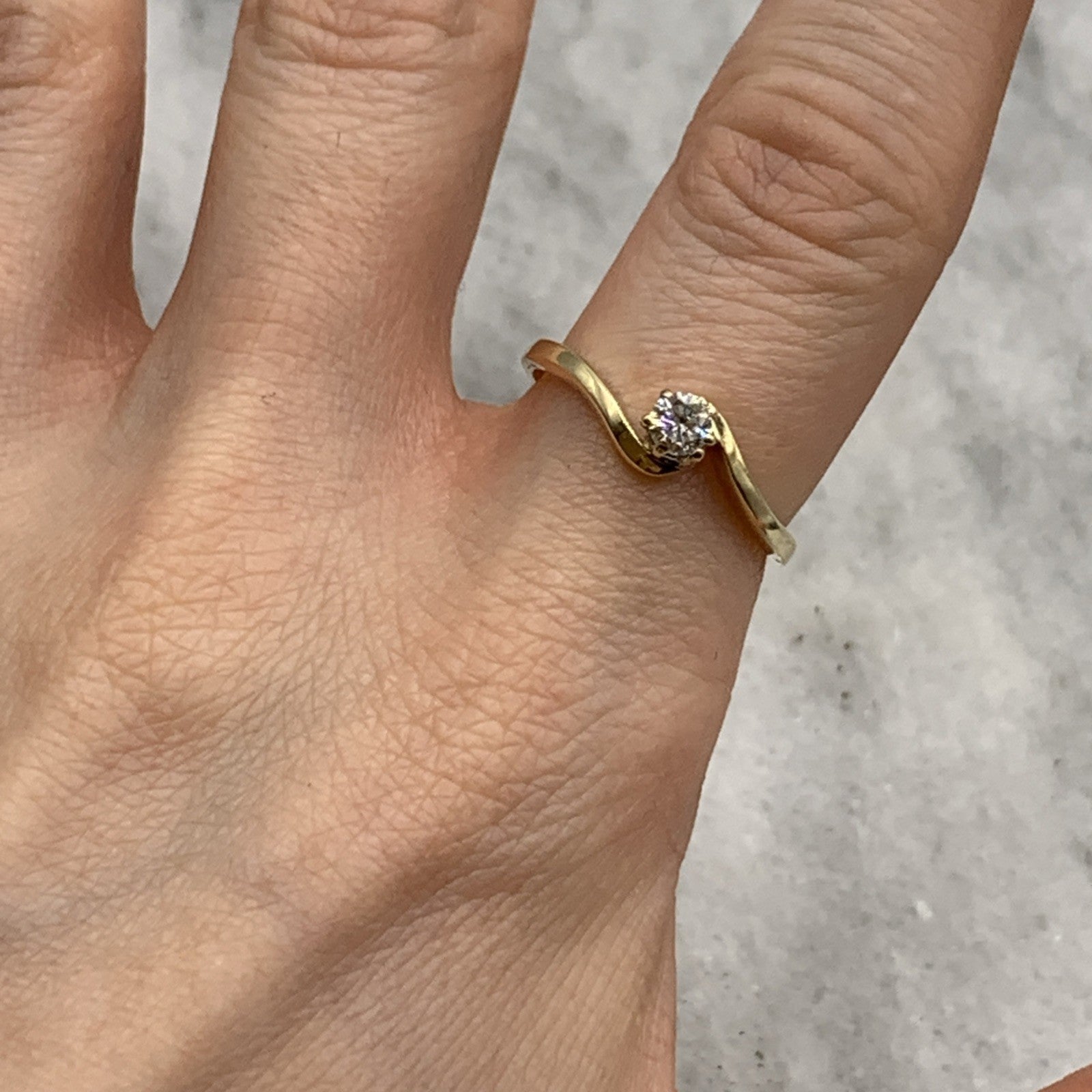 - A lovely gold bypass style ring showcasing a solitaire diamond at .20ct. Hallmarked.