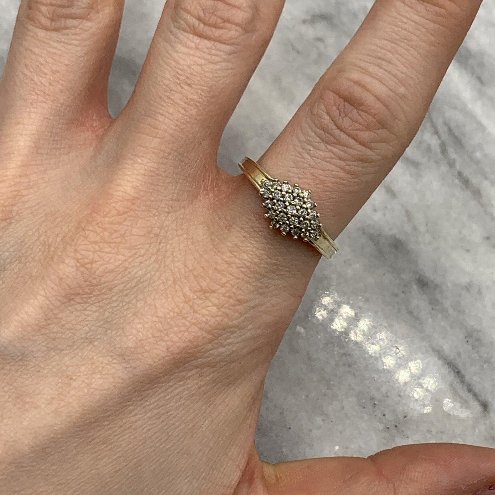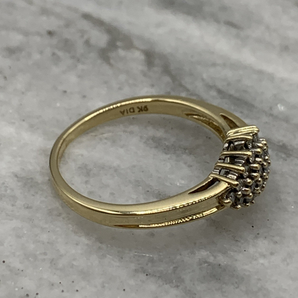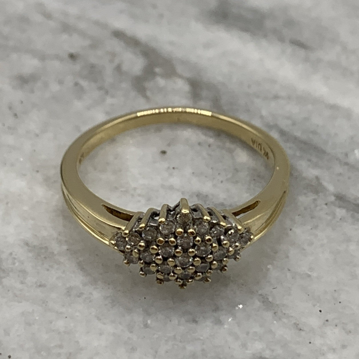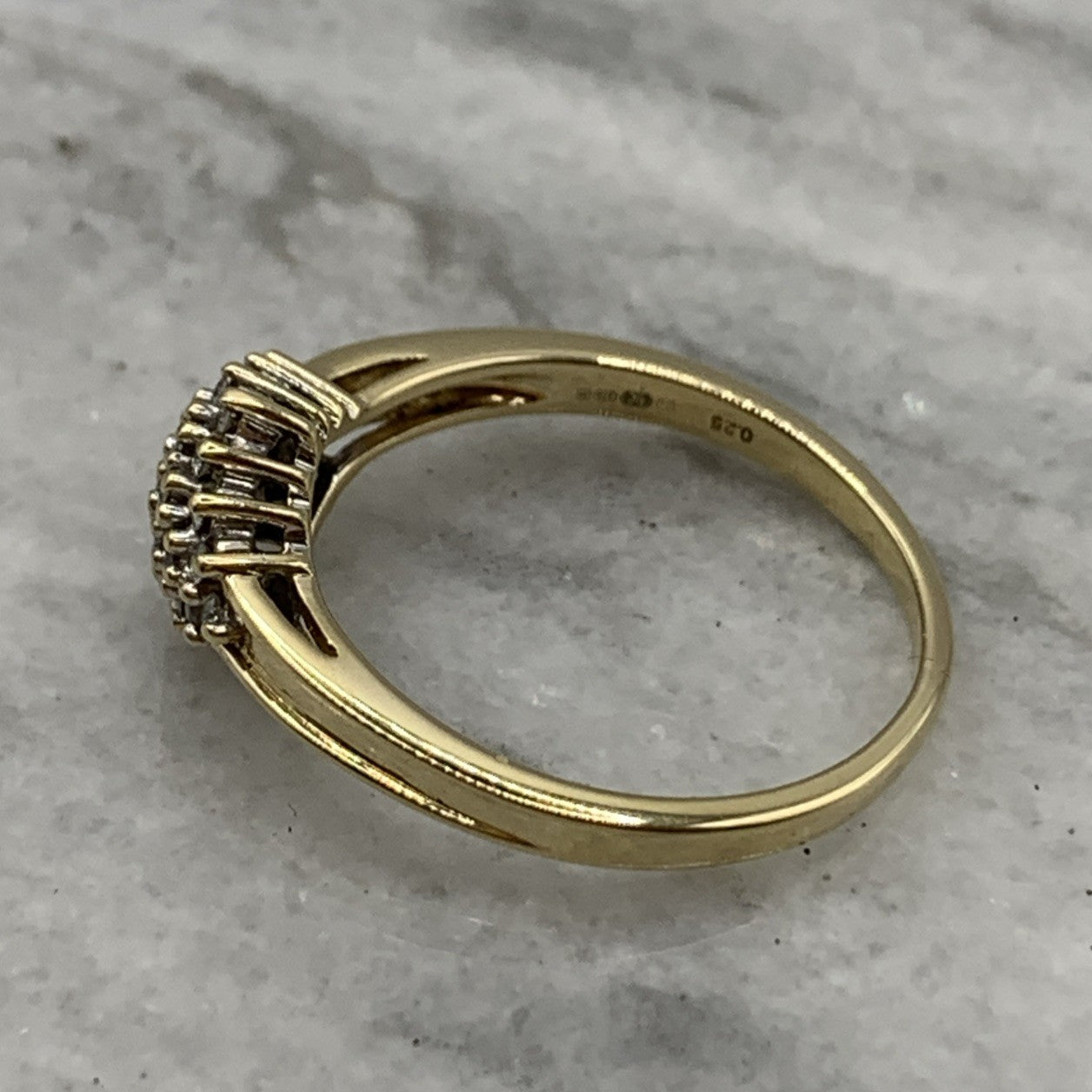 - A beautiful gold ring showcasing a .25ct cluster of petite diamonds. Hallmarked.