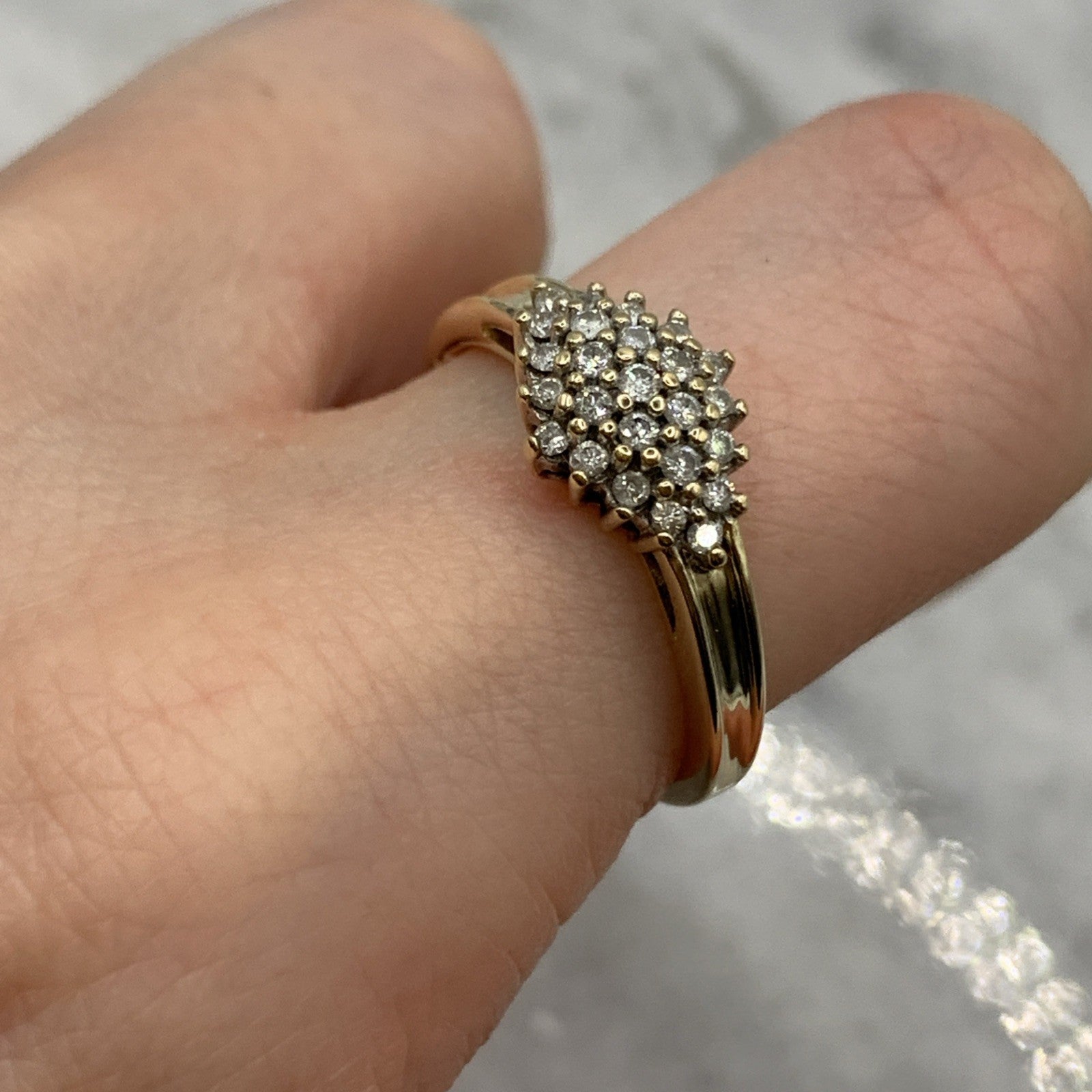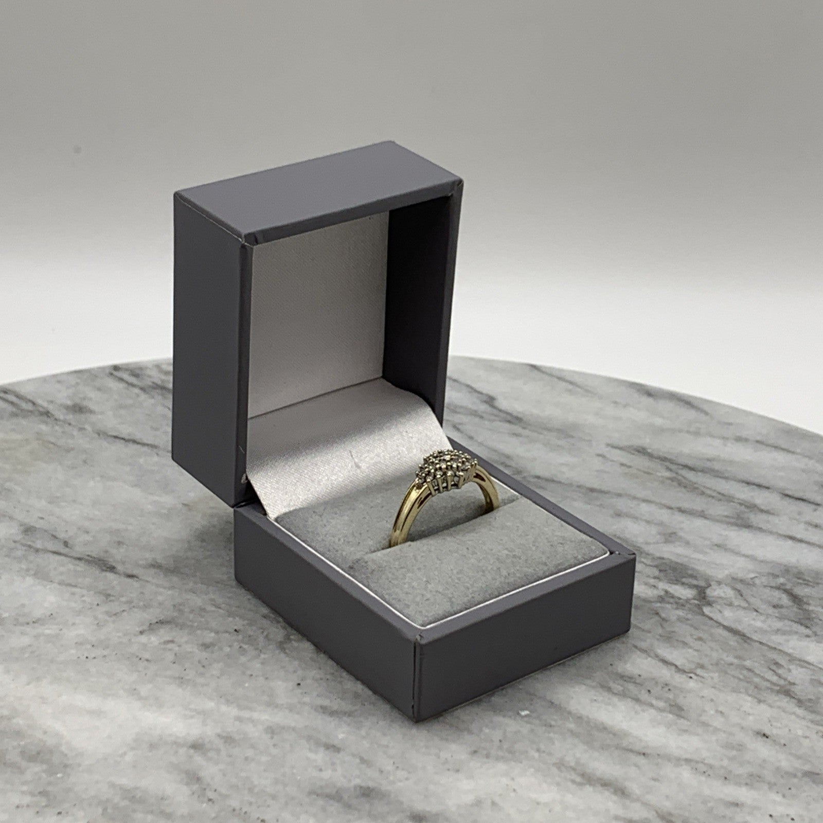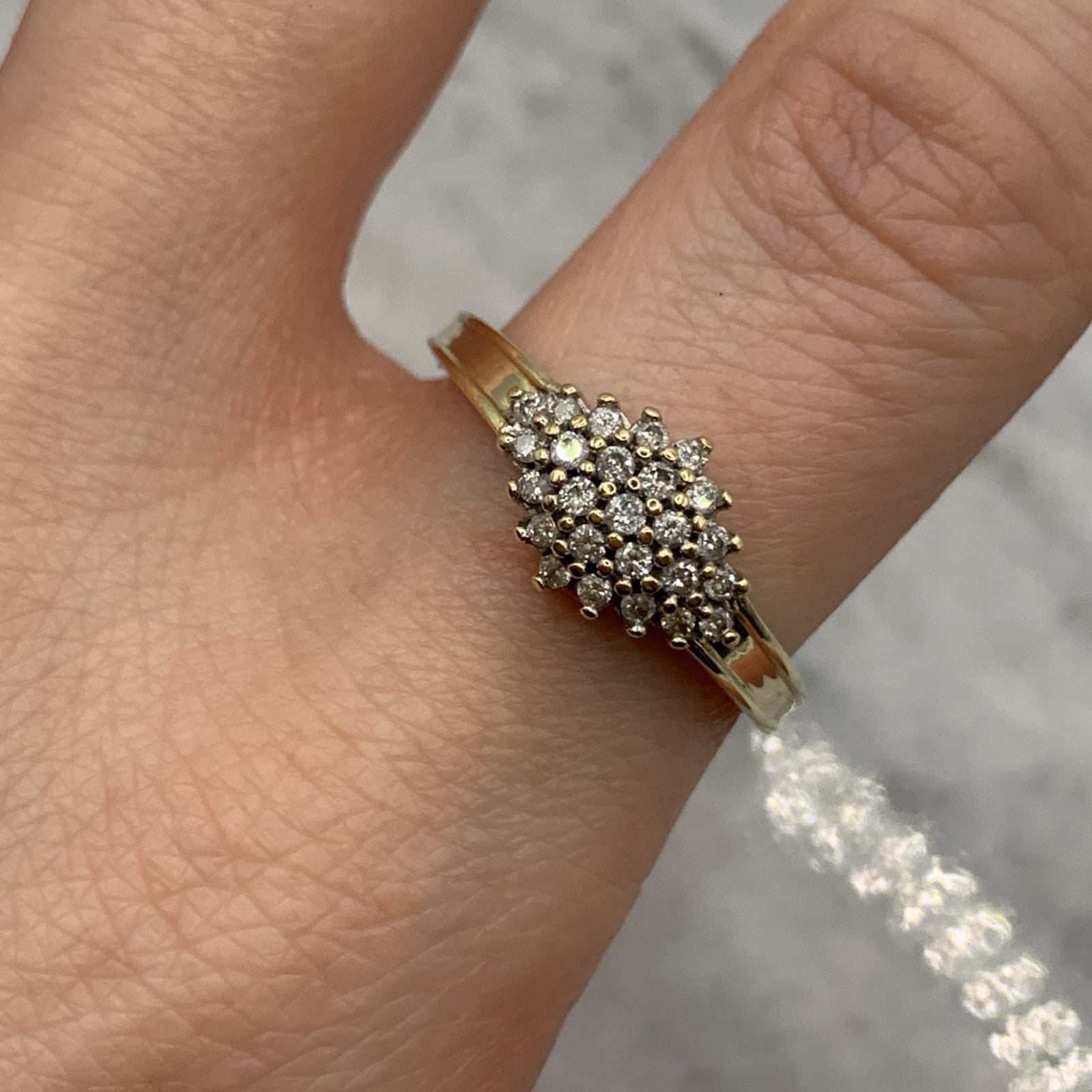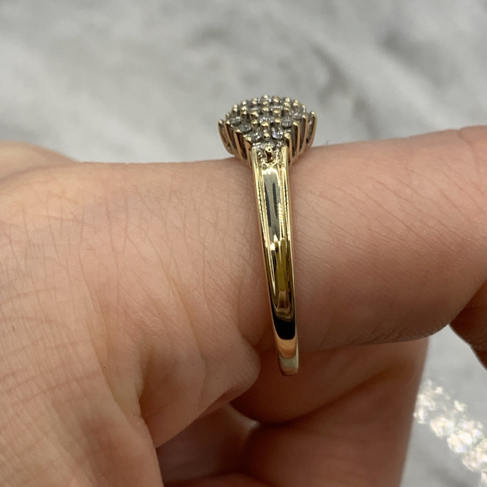 - A beautiful gold ring showcasing a .25ct cluster of petite diamonds. Hallmarked.