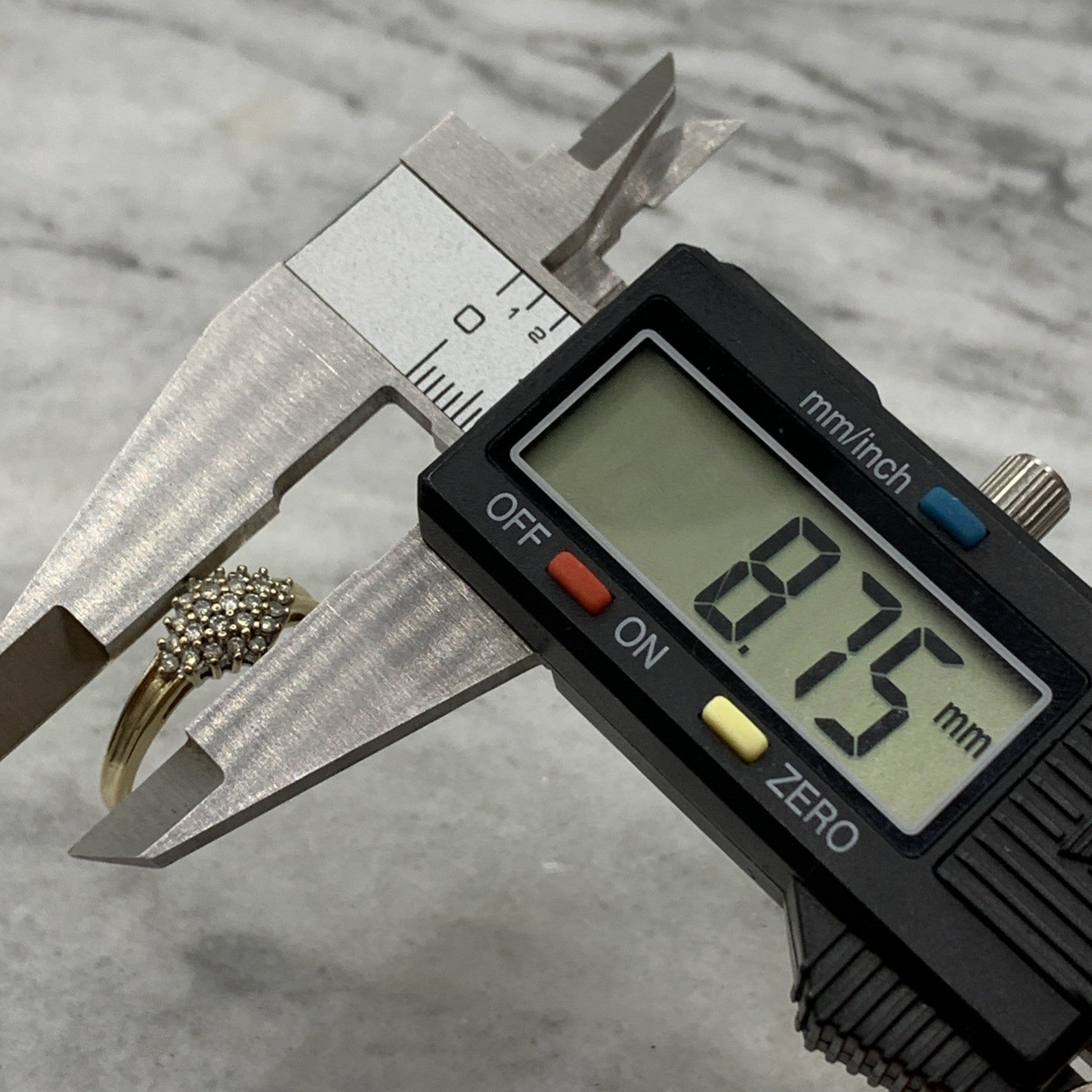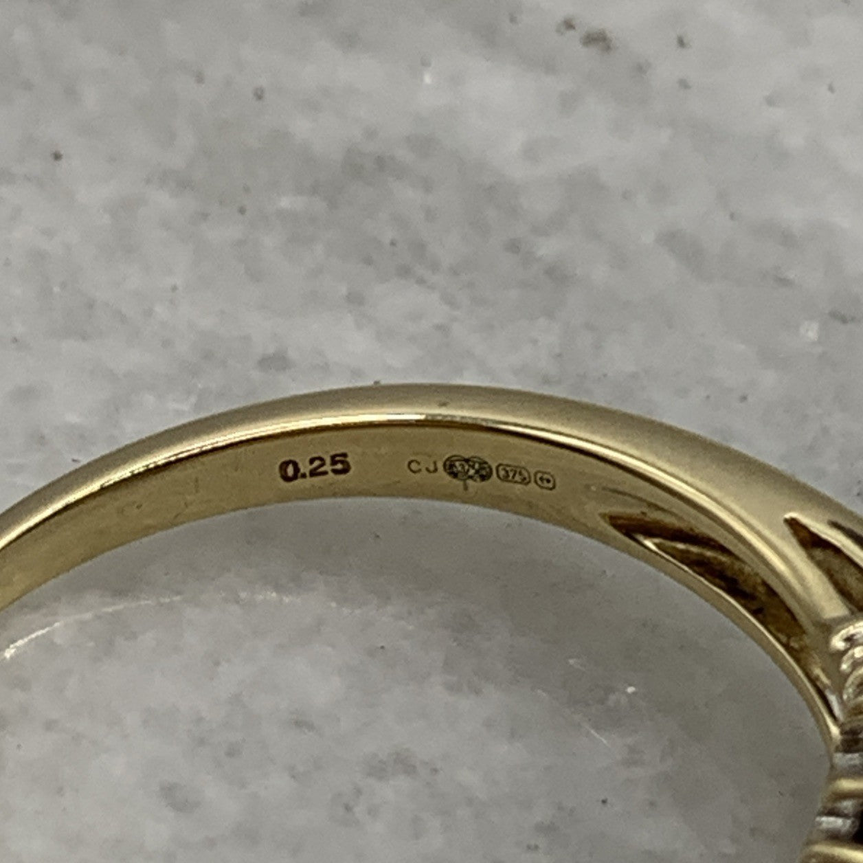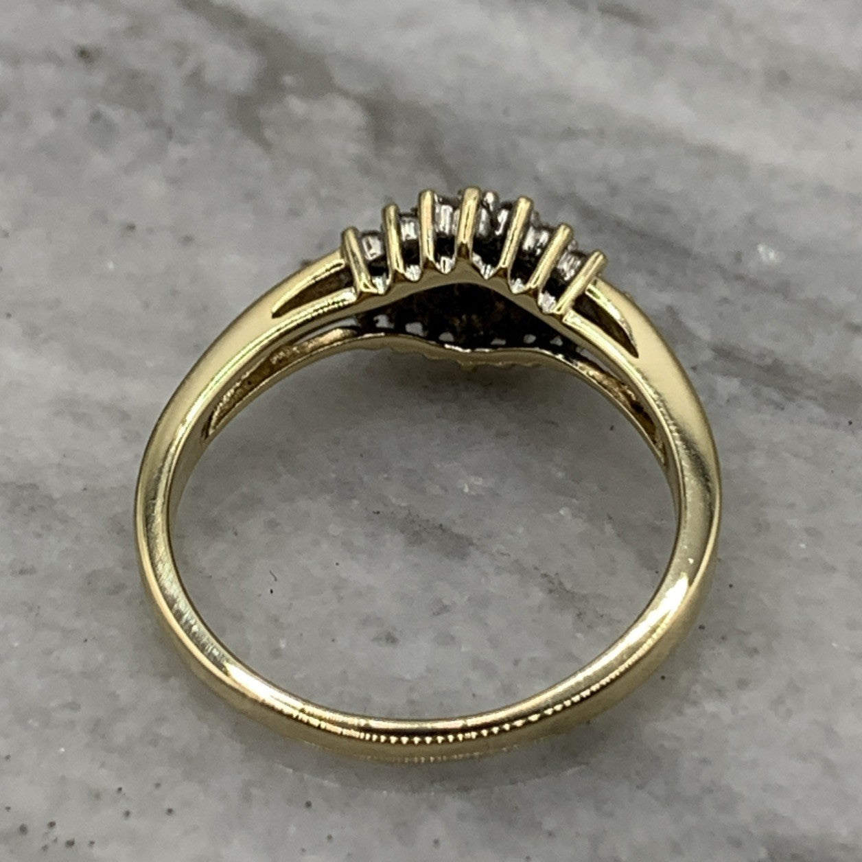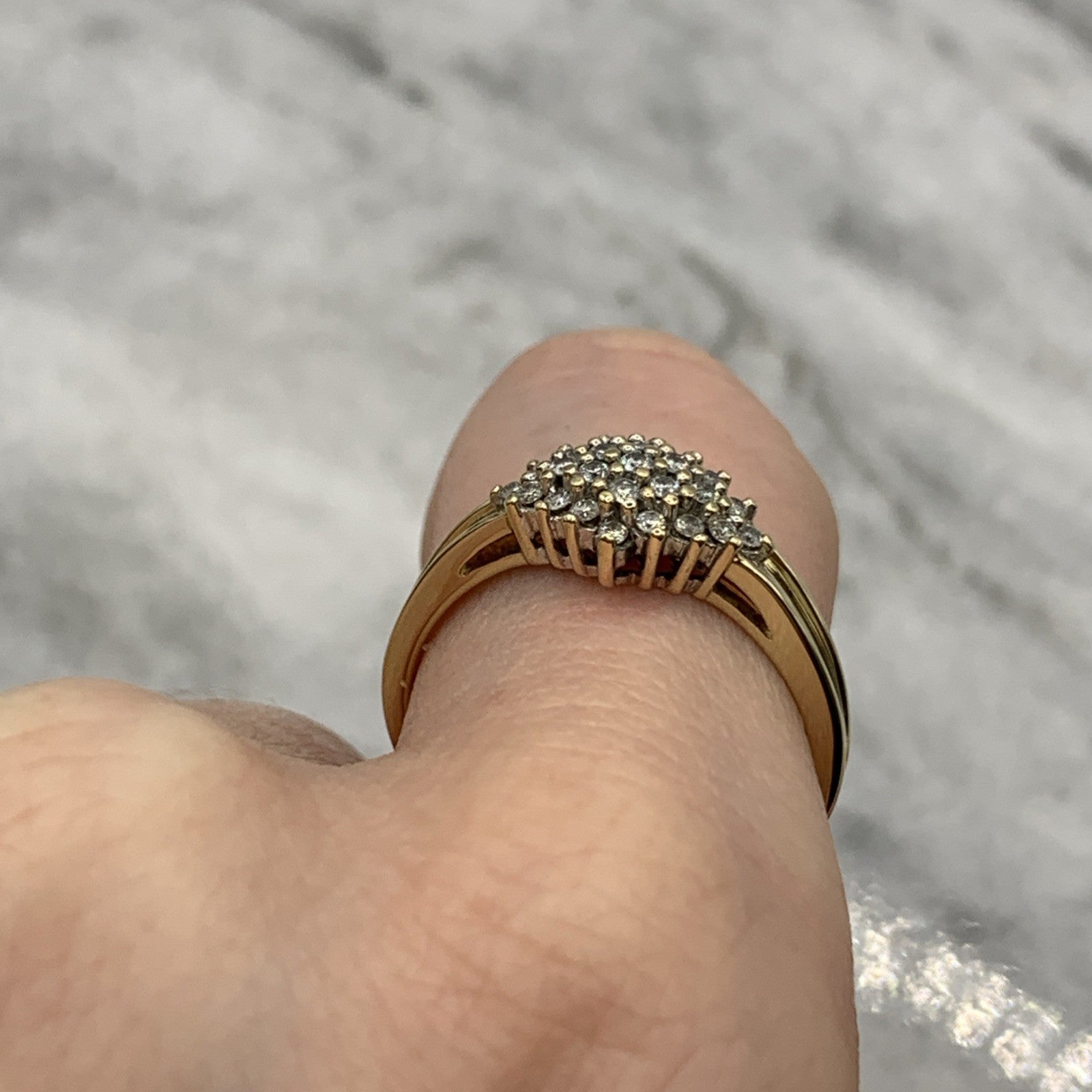 - A beautiful gold ring showcasing a .25ct cluster of petite diamonds. Hallmarked.