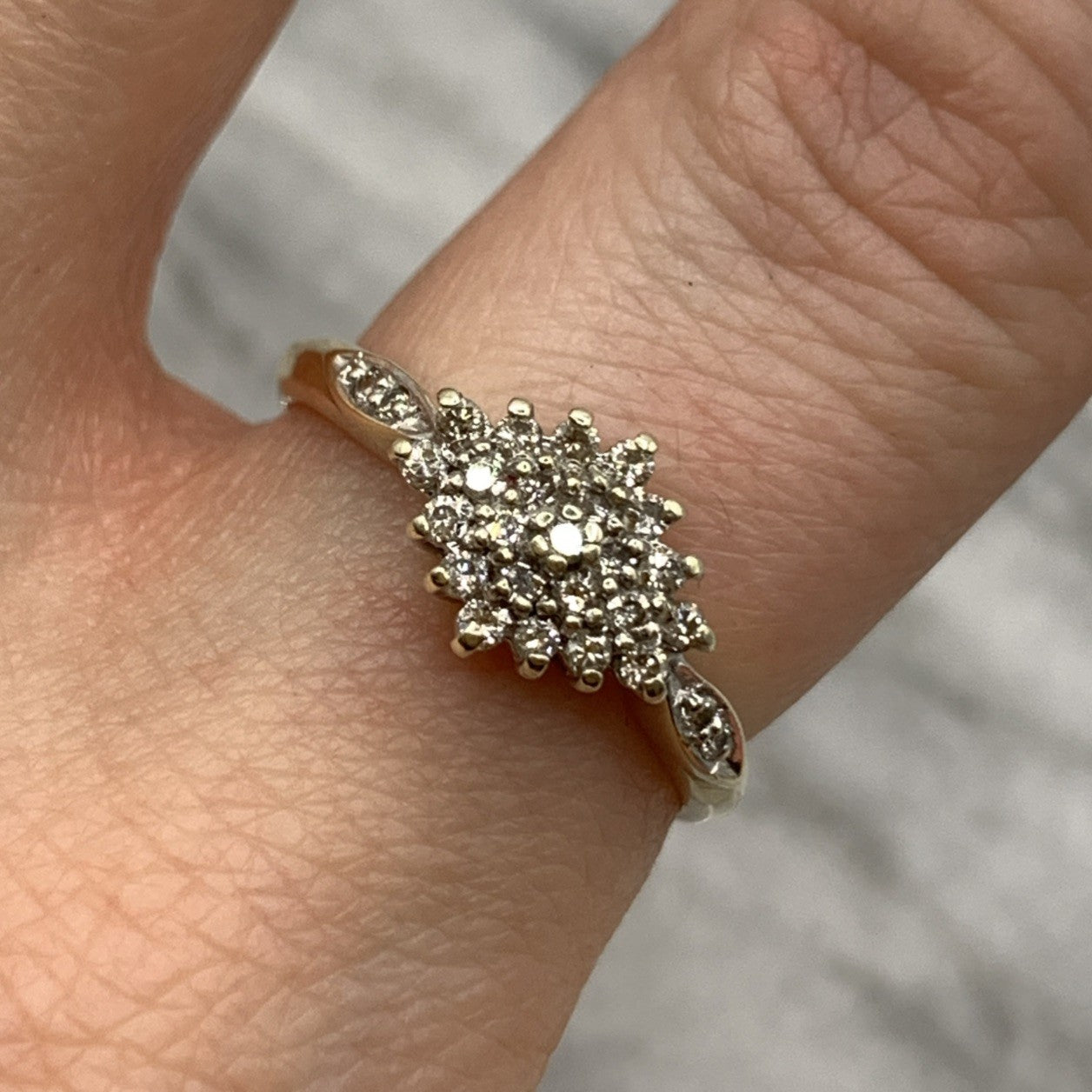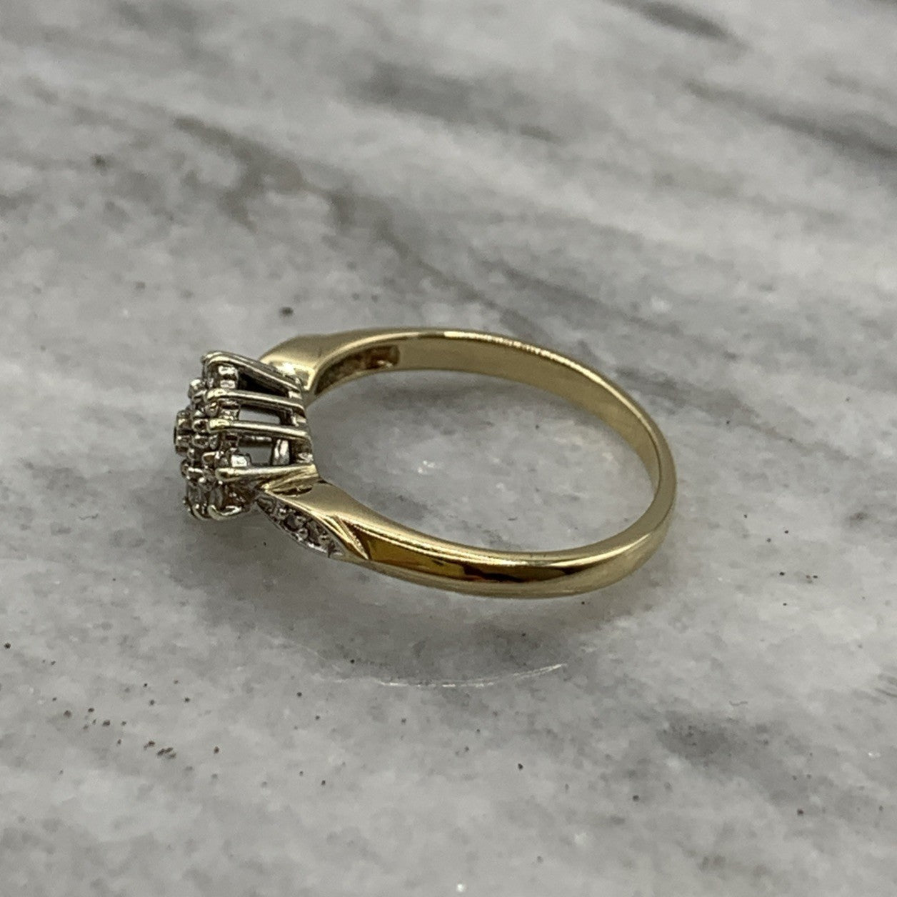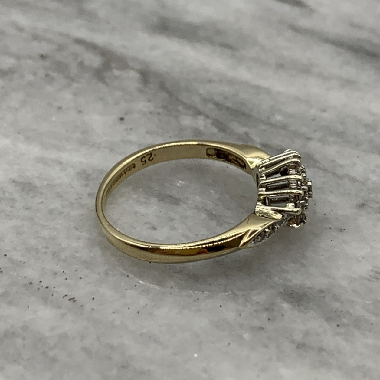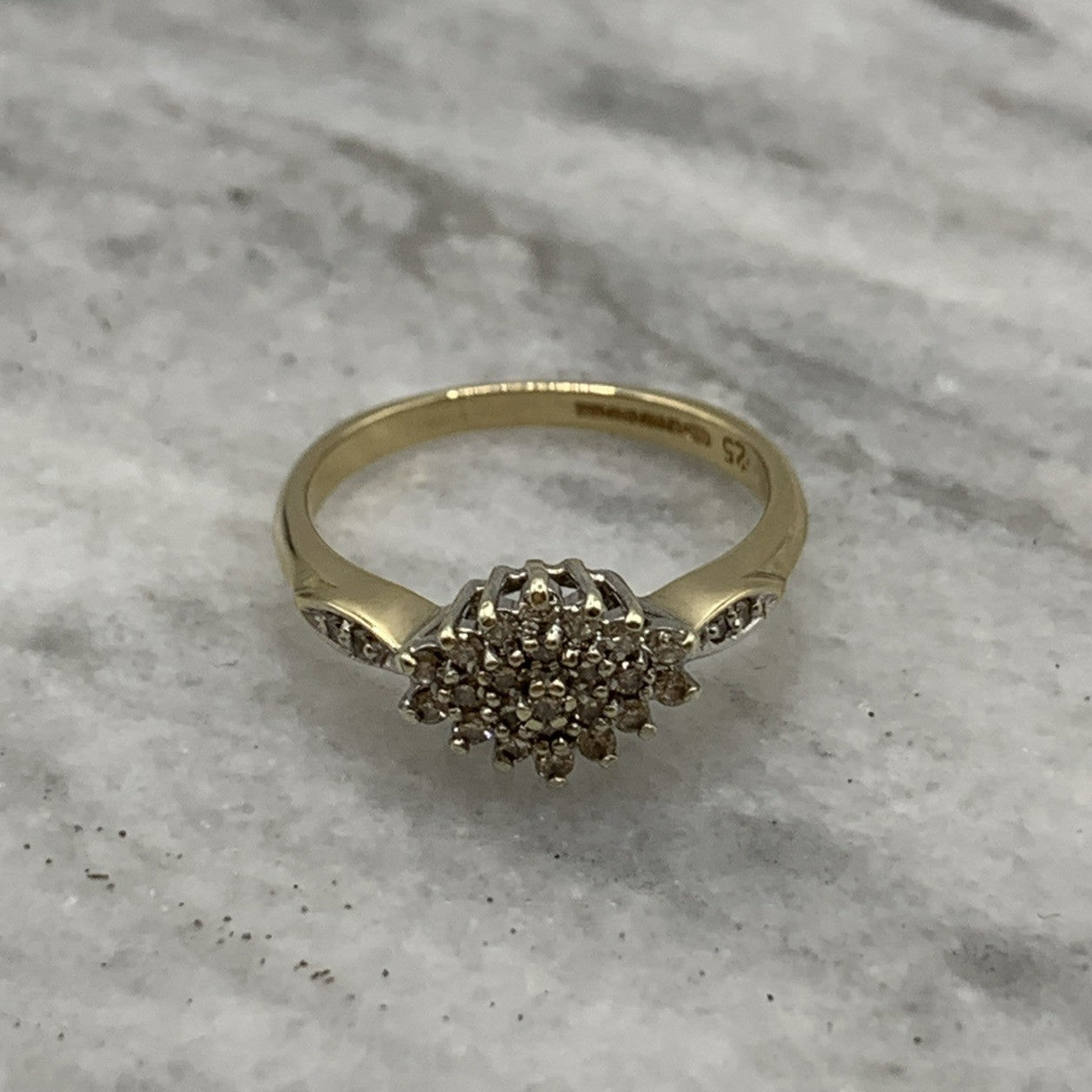 - A beautiful gold ring showcasing a .25ct cluster of petite diamonds, with additional diamonds on the shoulders. Hallmarked.