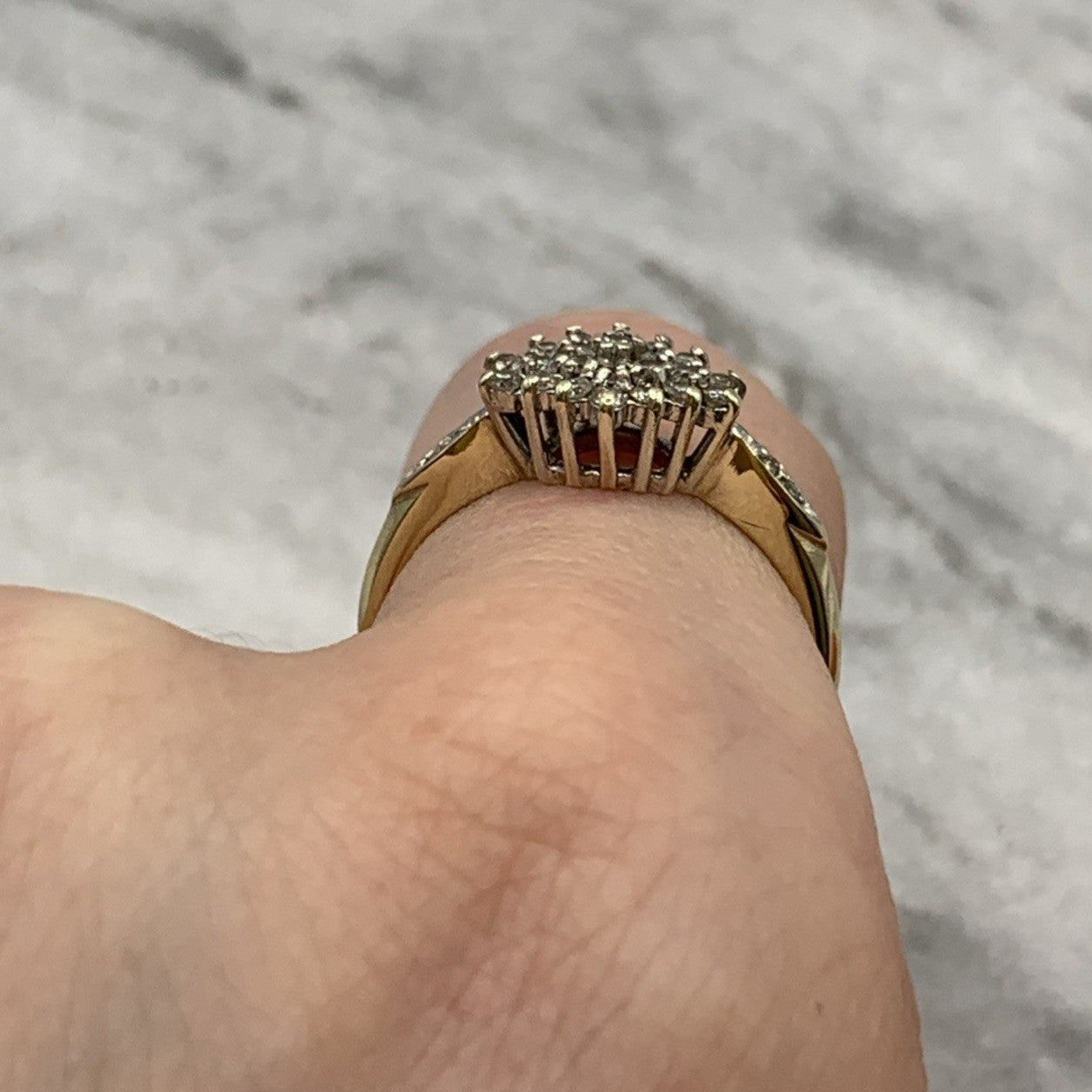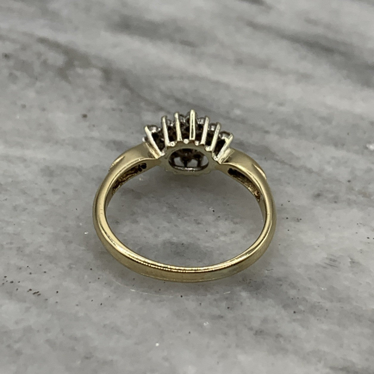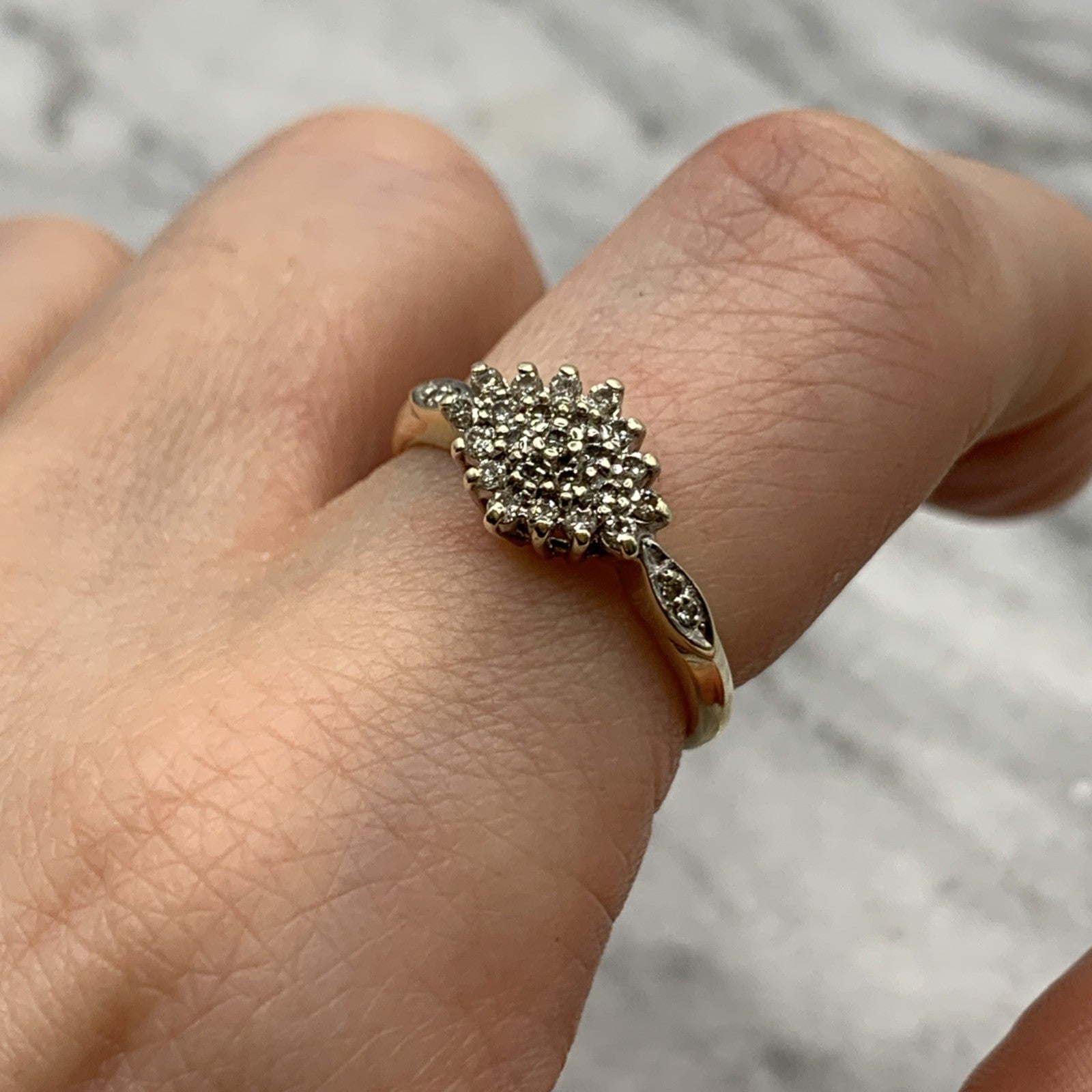 - A beautiful gold ring showcasing a .25ct cluster of petite diamonds, with additional diamonds on the shoulders. Hallmarked.