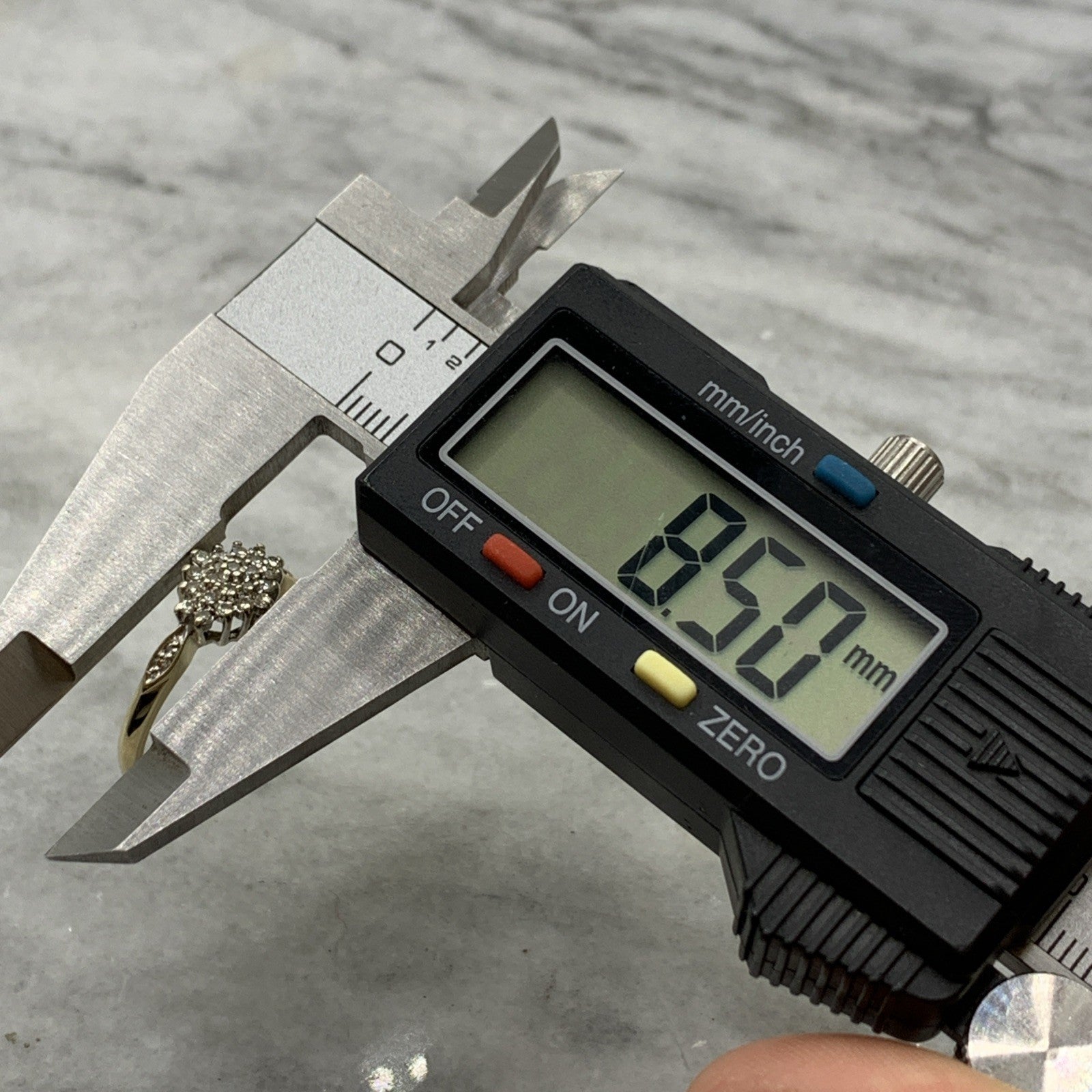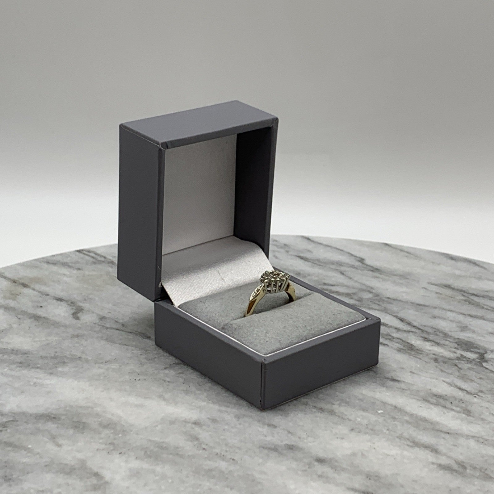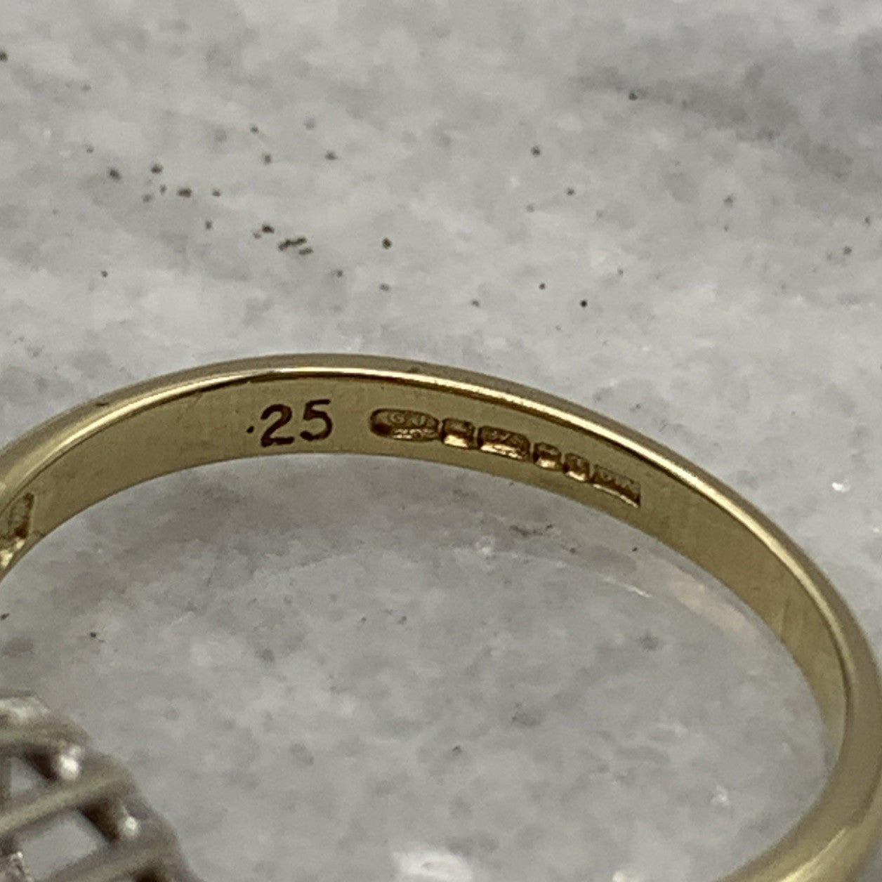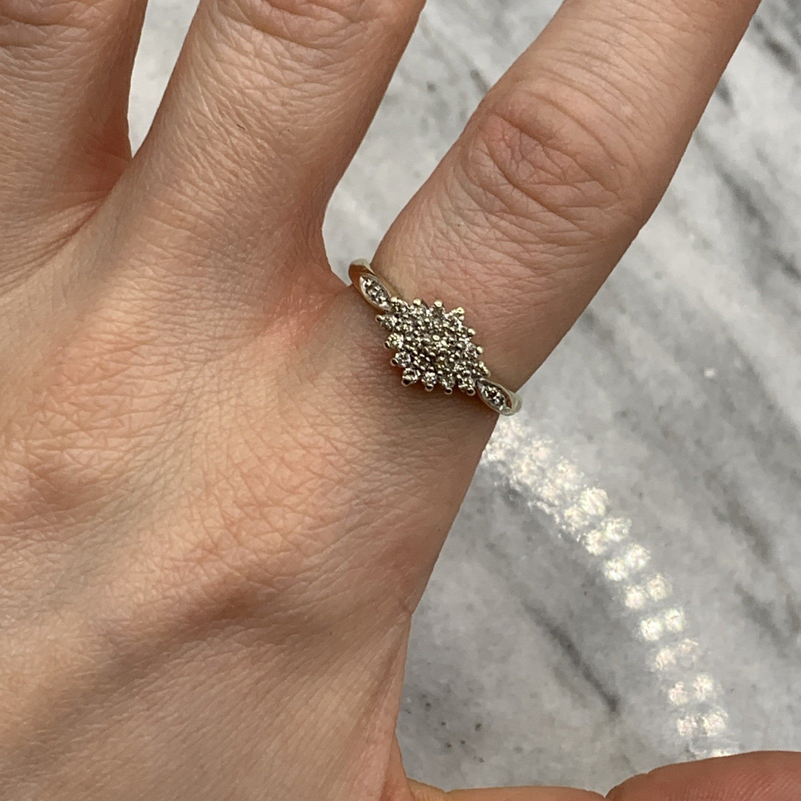 - A beautiful gold ring showcasing a .25ct cluster of petite diamonds, with additional diamonds on the shoulders. Hallmarked.