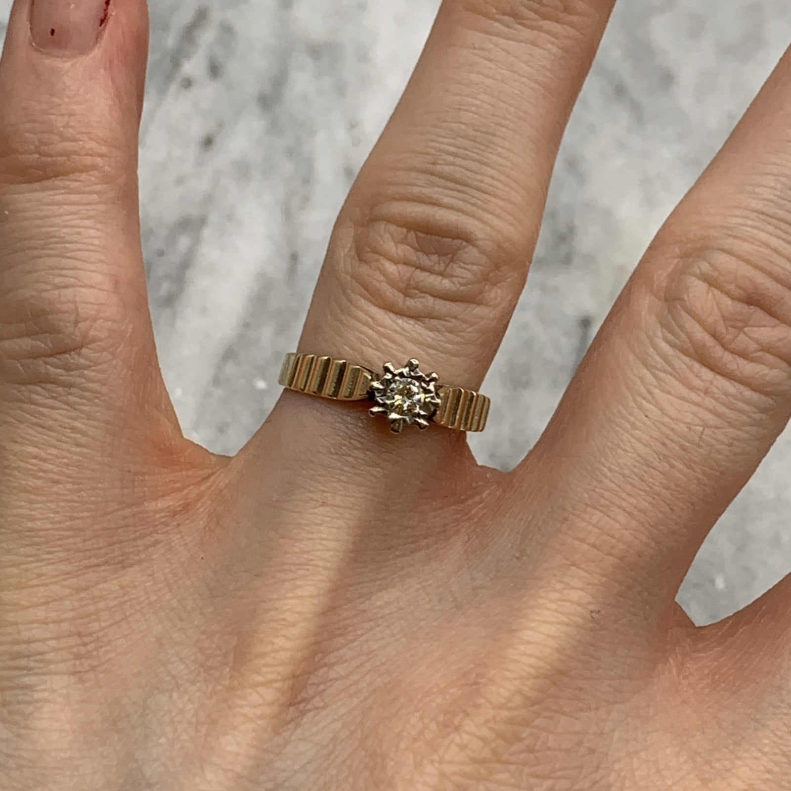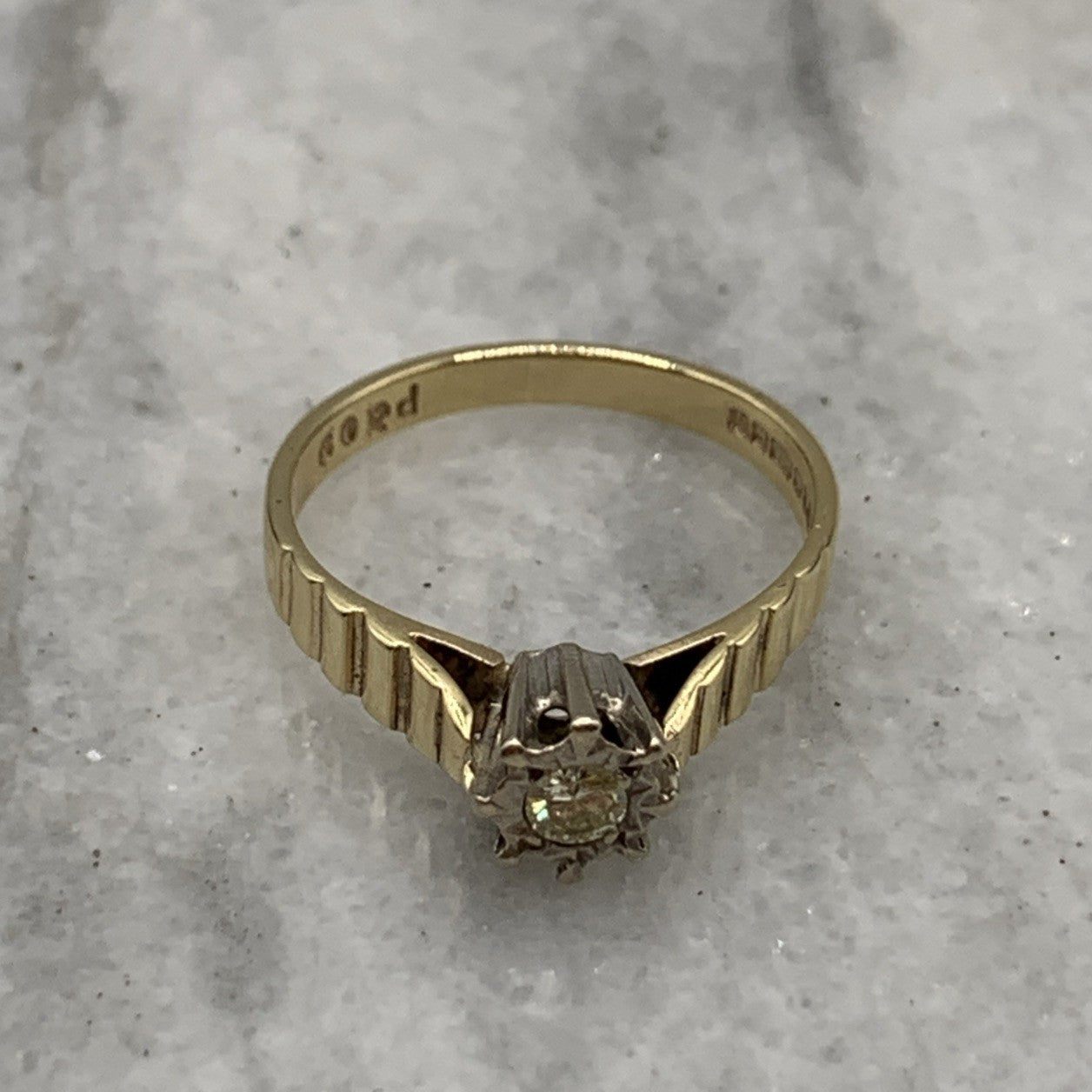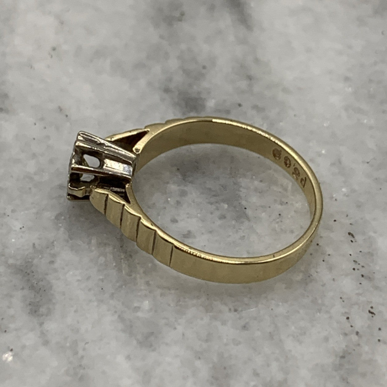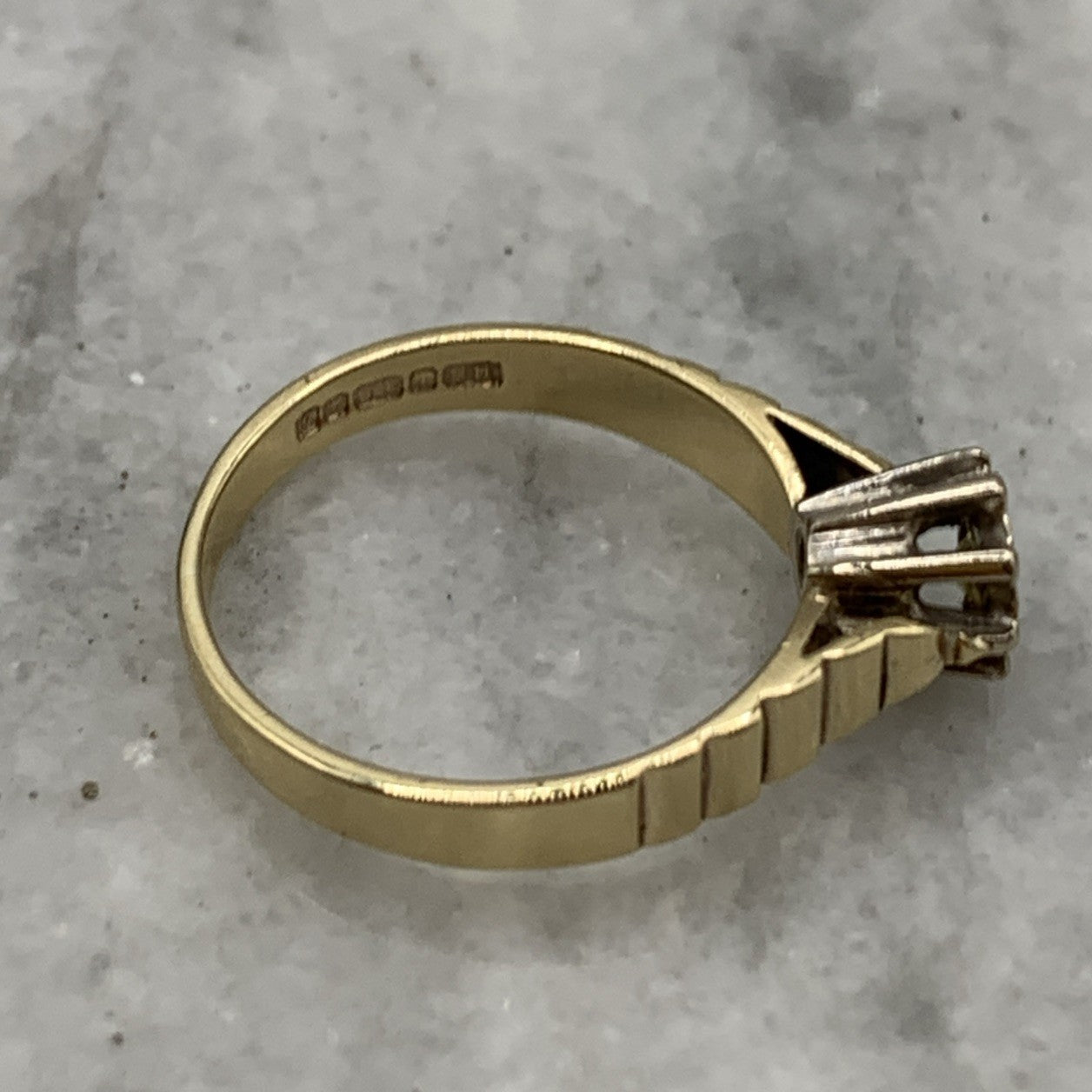 - A gorgeous gold ring featuring a solitaire diamond upon textured shoulders. Hallmarked.