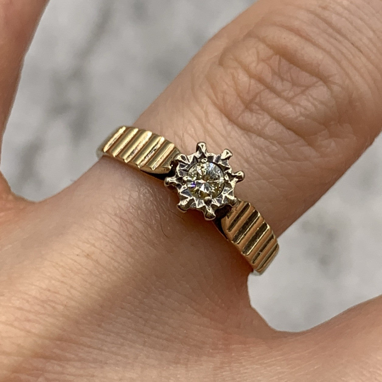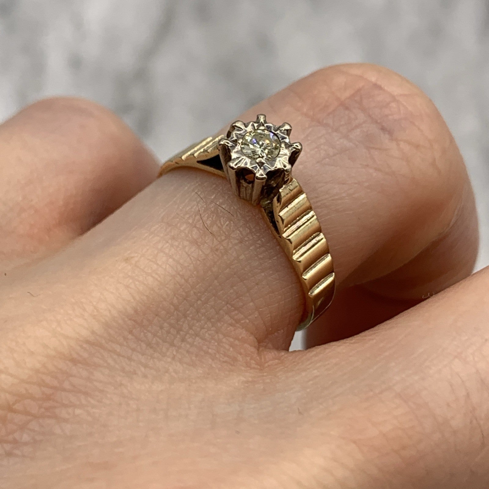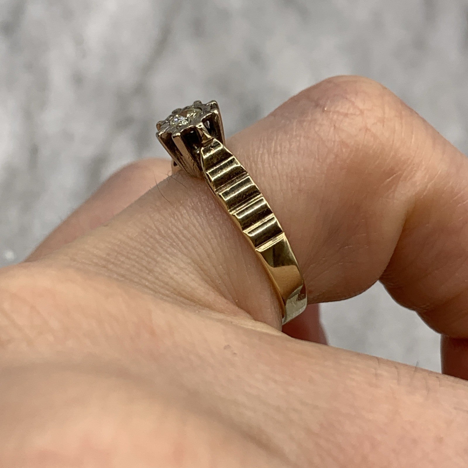 - A gorgeous gold ring featuring a solitaire diamond upon textured shoulders. Hallmarked.