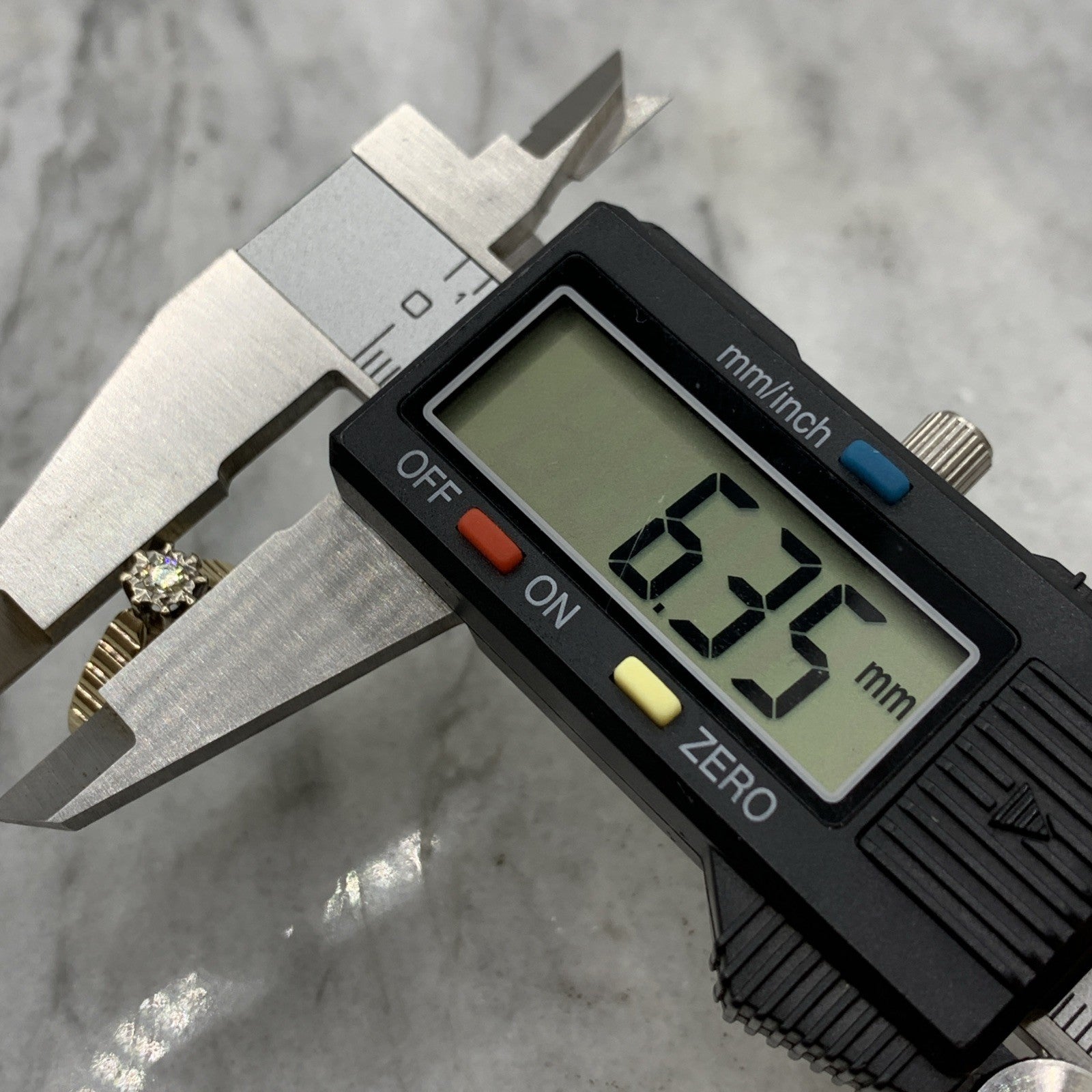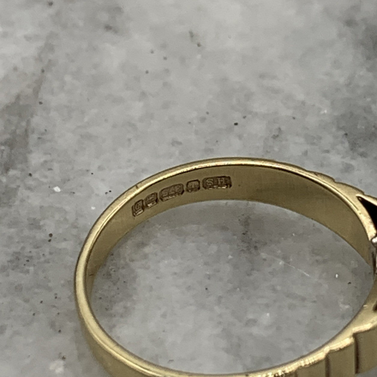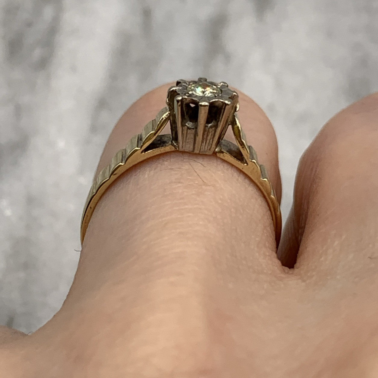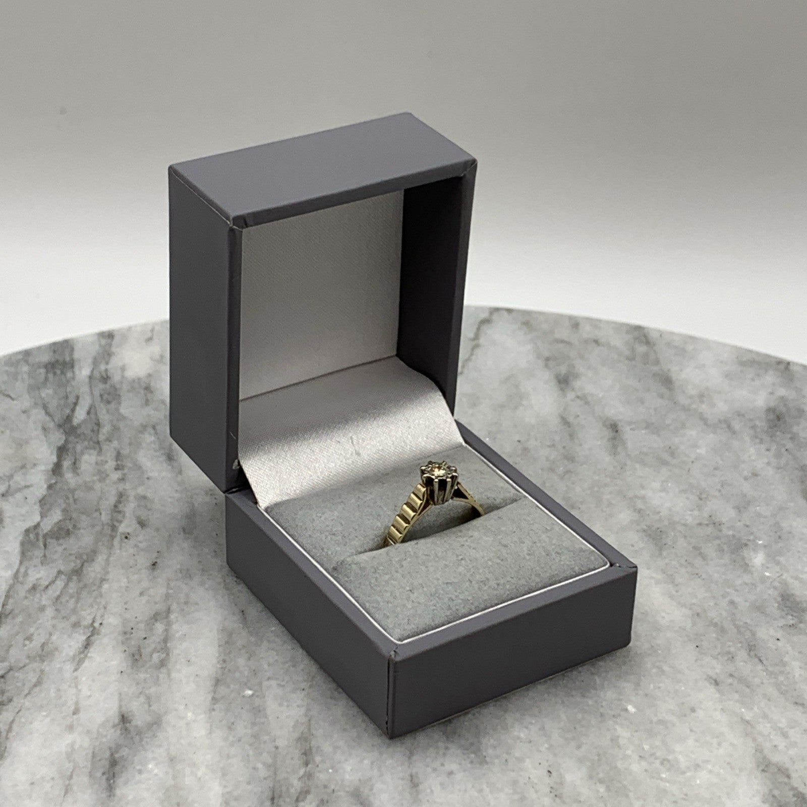 - A gorgeous gold ring featuring a solitaire diamond upon textured shoulders. Hallmarked.