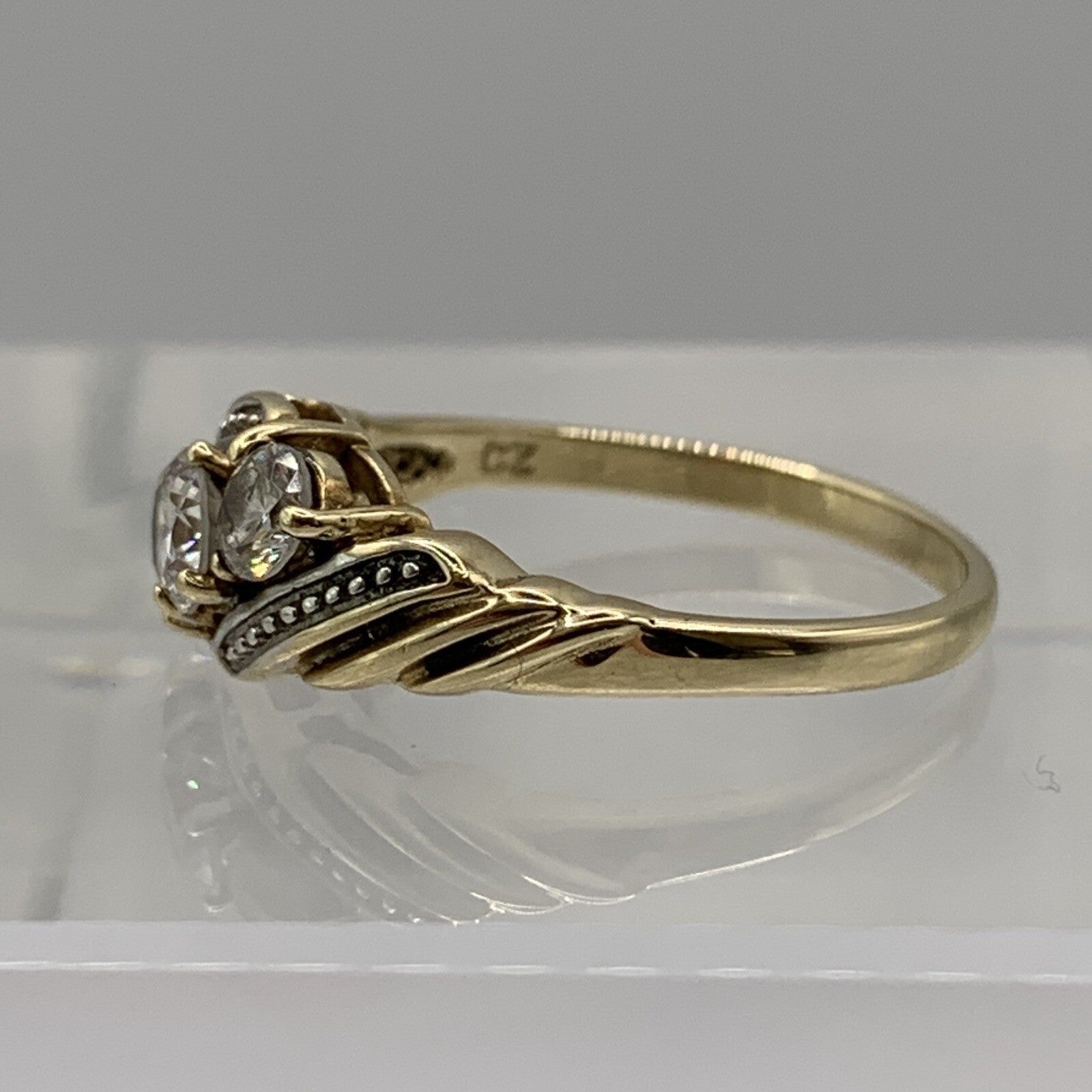 A stunning yellow gold ring showcasing a trilogy of round cut cubic zirconia accented by a milgrain border.