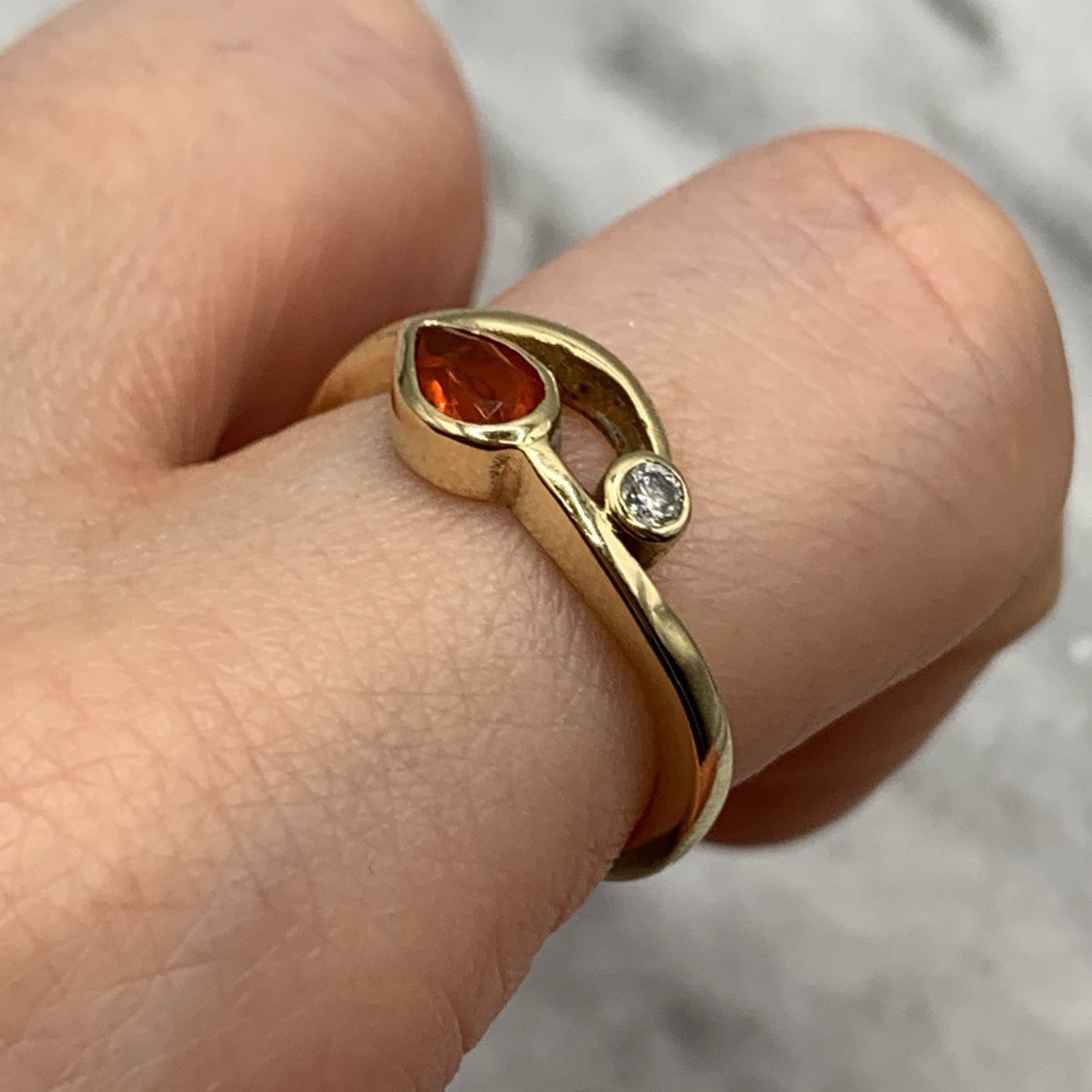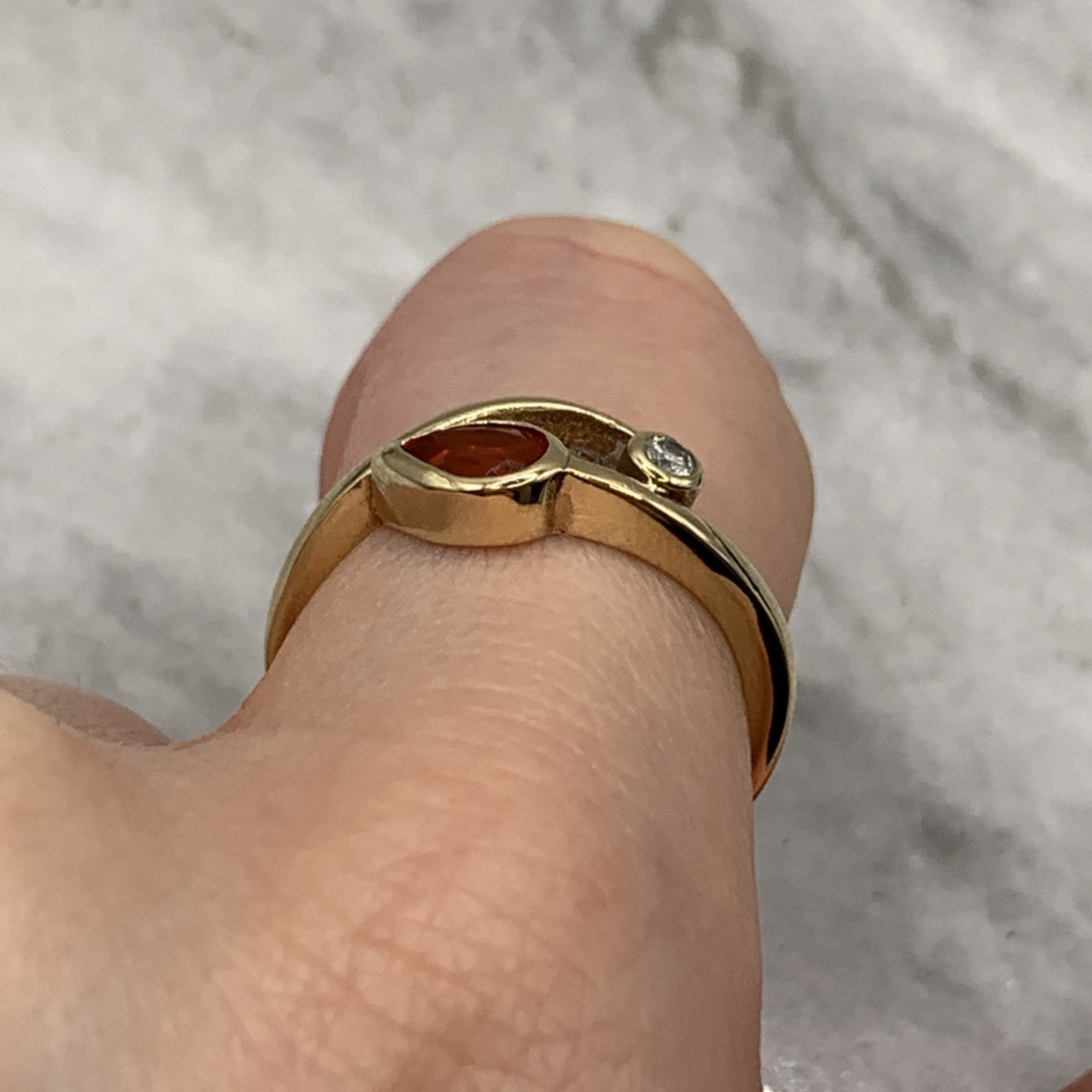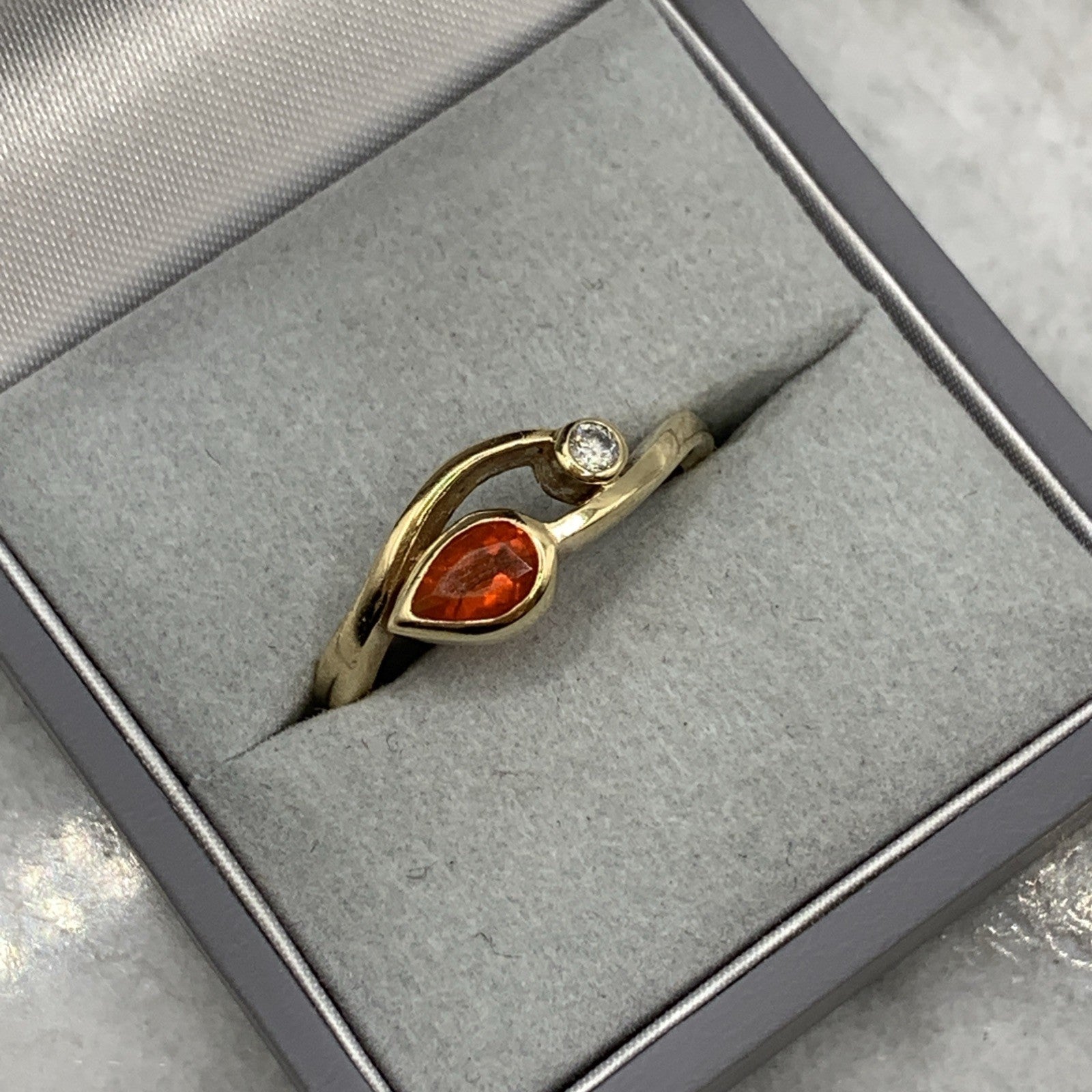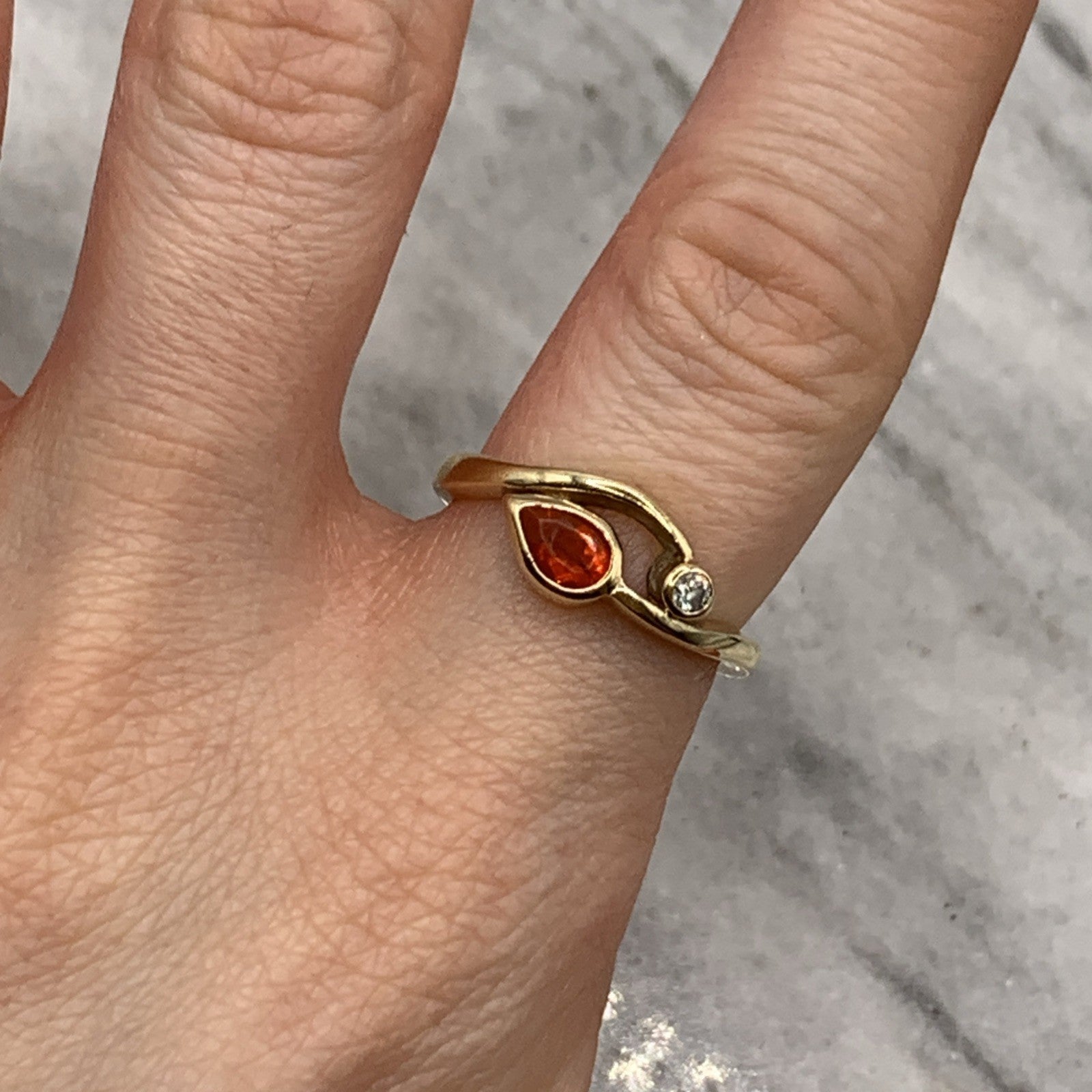 A beautiful gold bypass style ring featuring a pear cut fire opal and a .05ct diamond, both in a bezel setting.