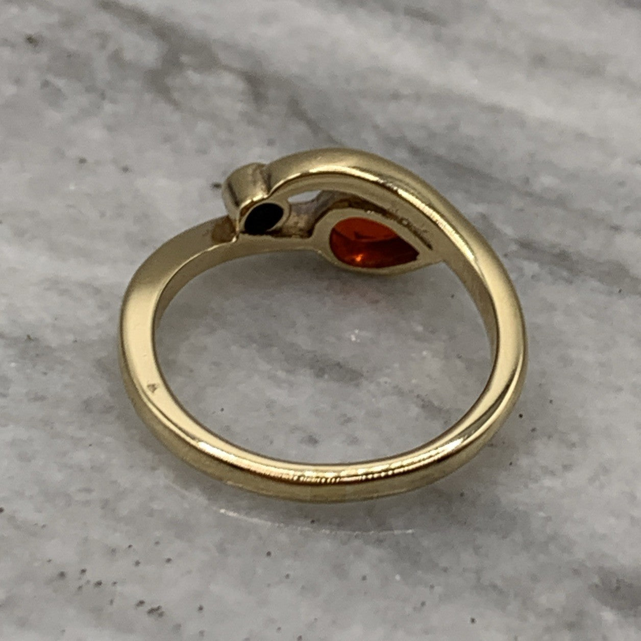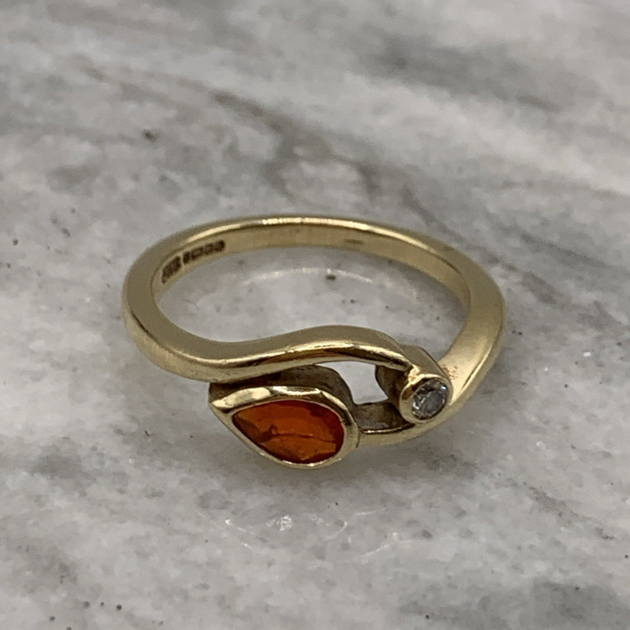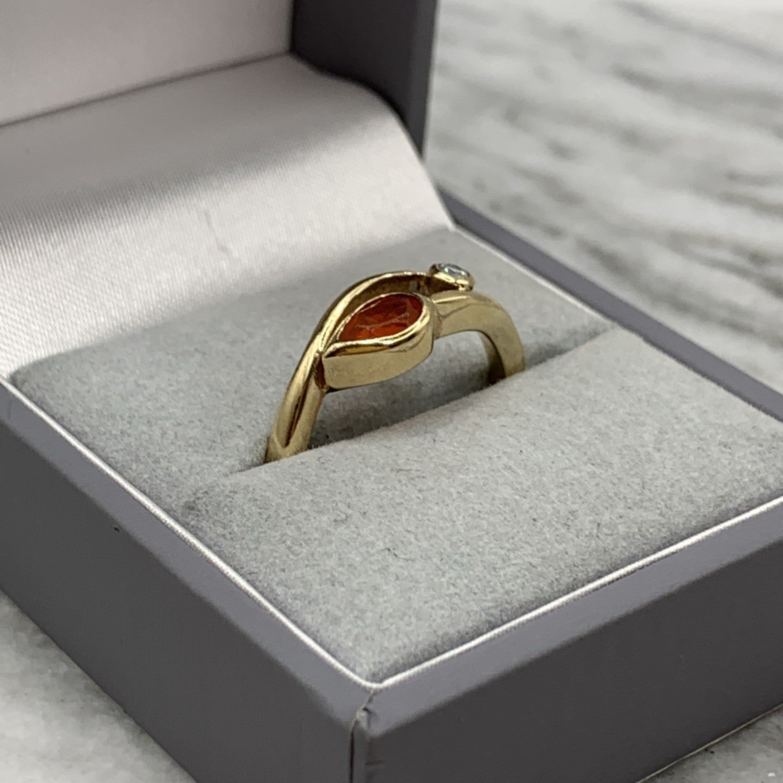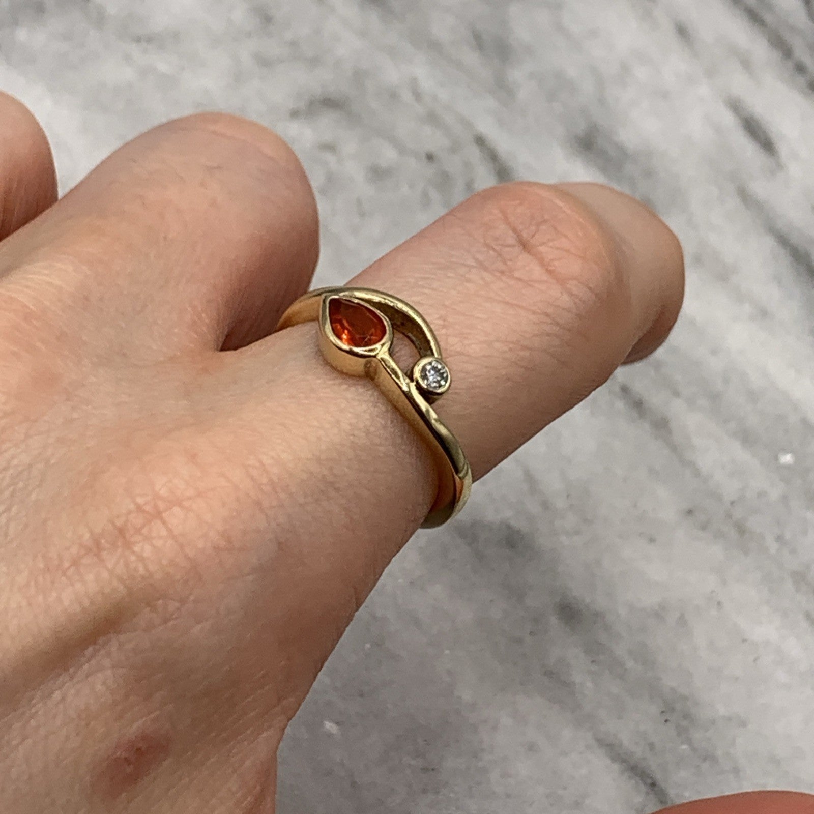 A beautiful gold bypass style ring featuring a pear cut fire opal and a .05ct diamond, both in a bezel setting.
