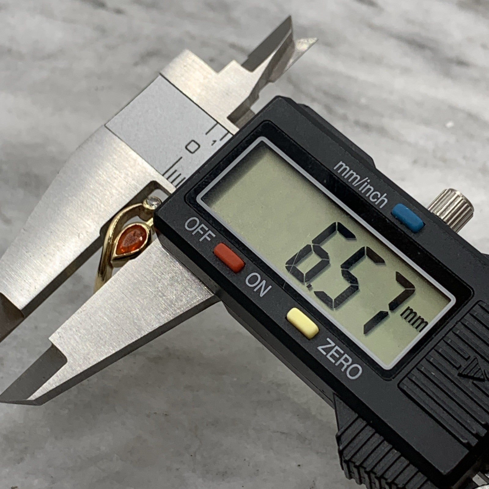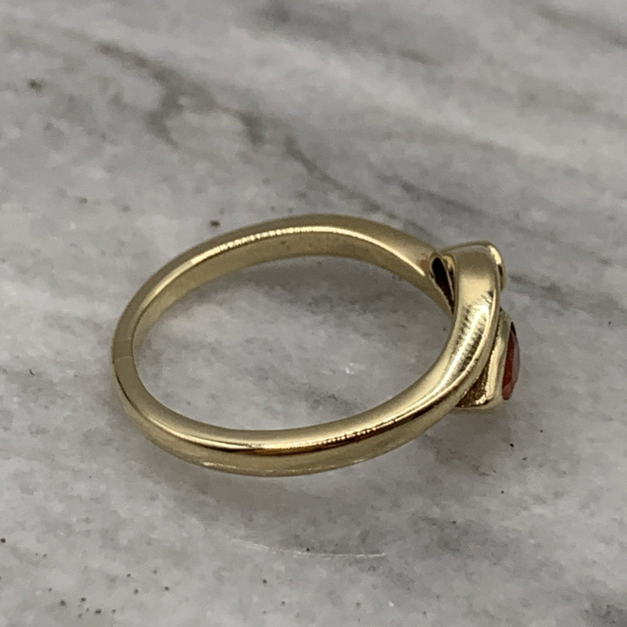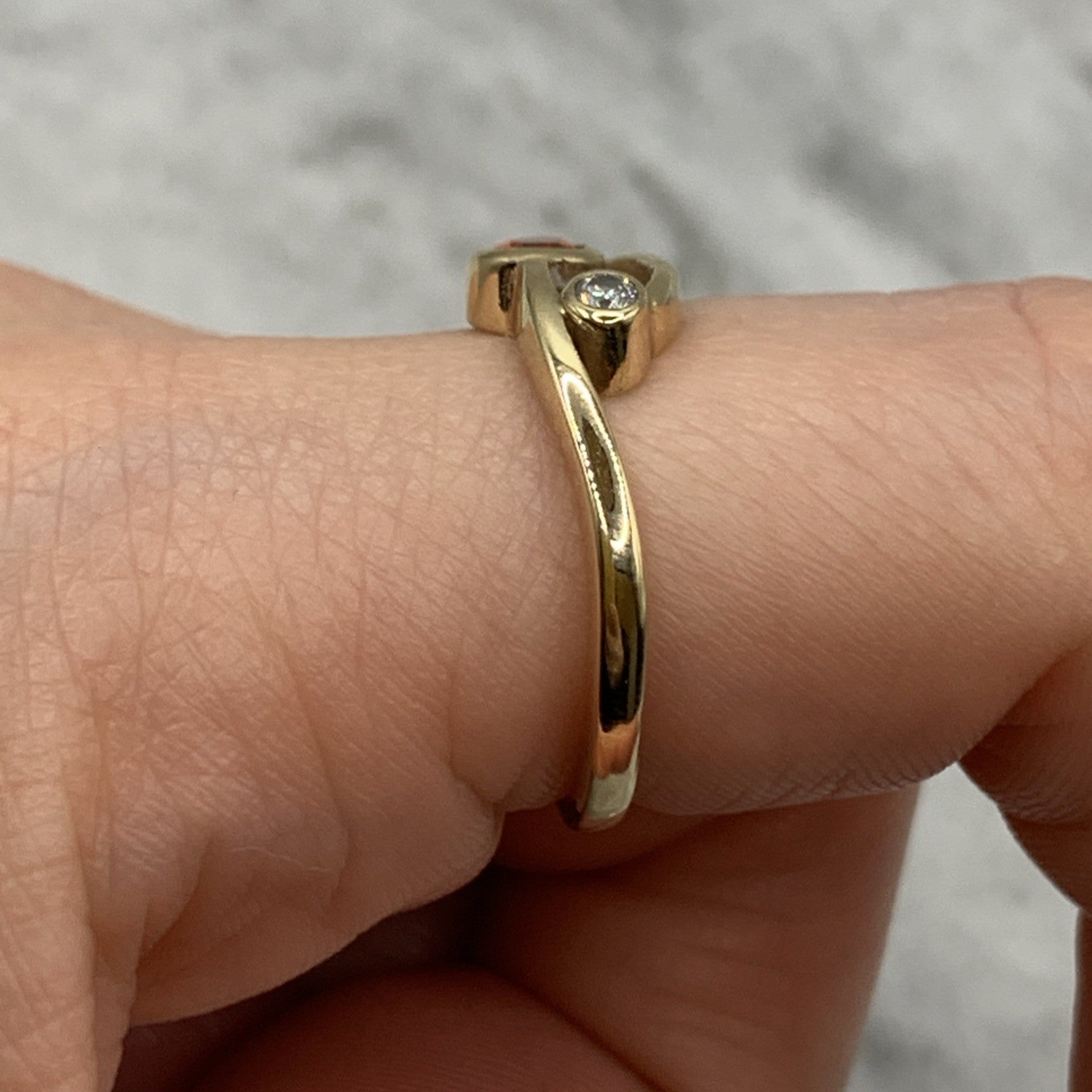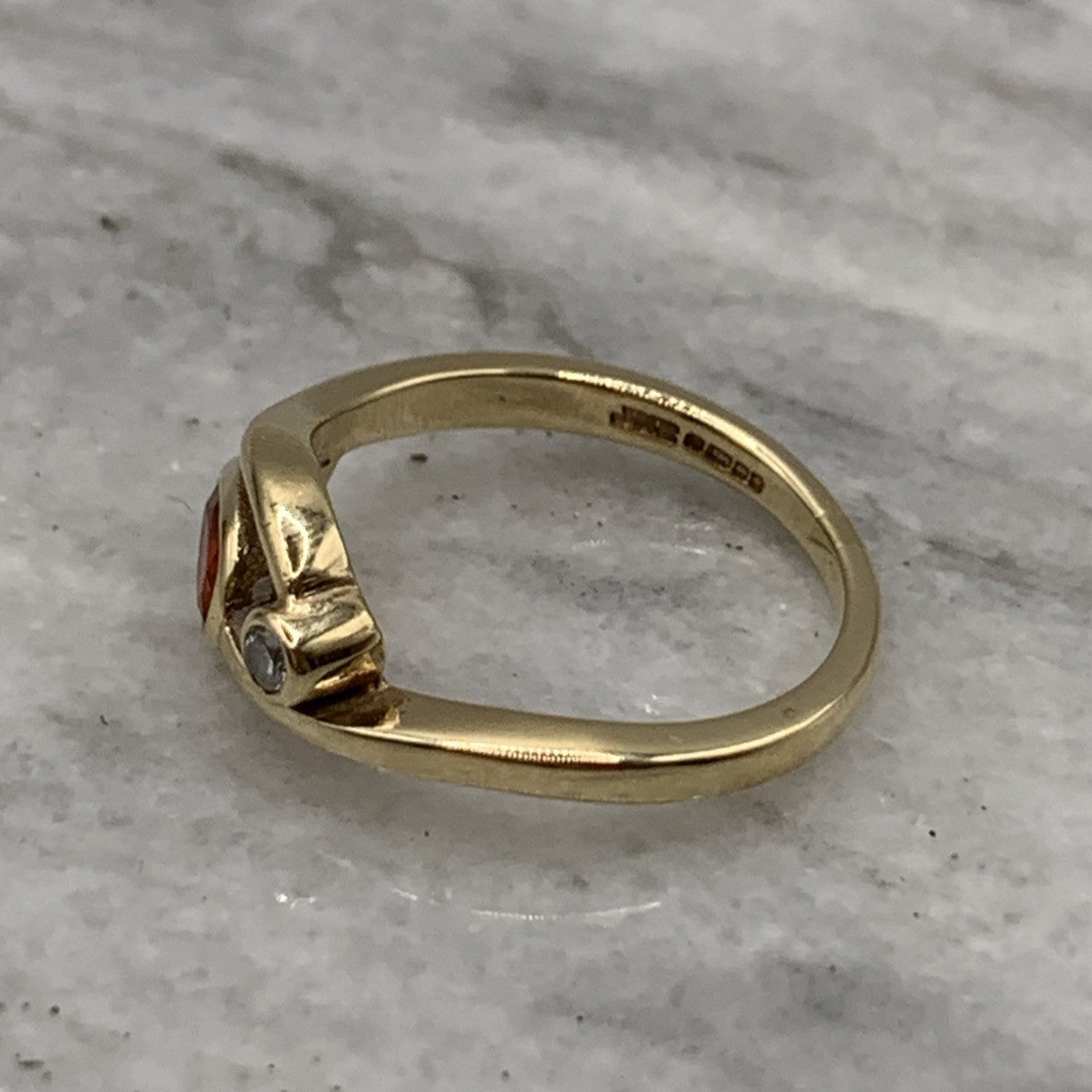 A beautiful gold bypass style ring featuring a pear cut fire opal and a .05ct diamond, both in a bezel setting.