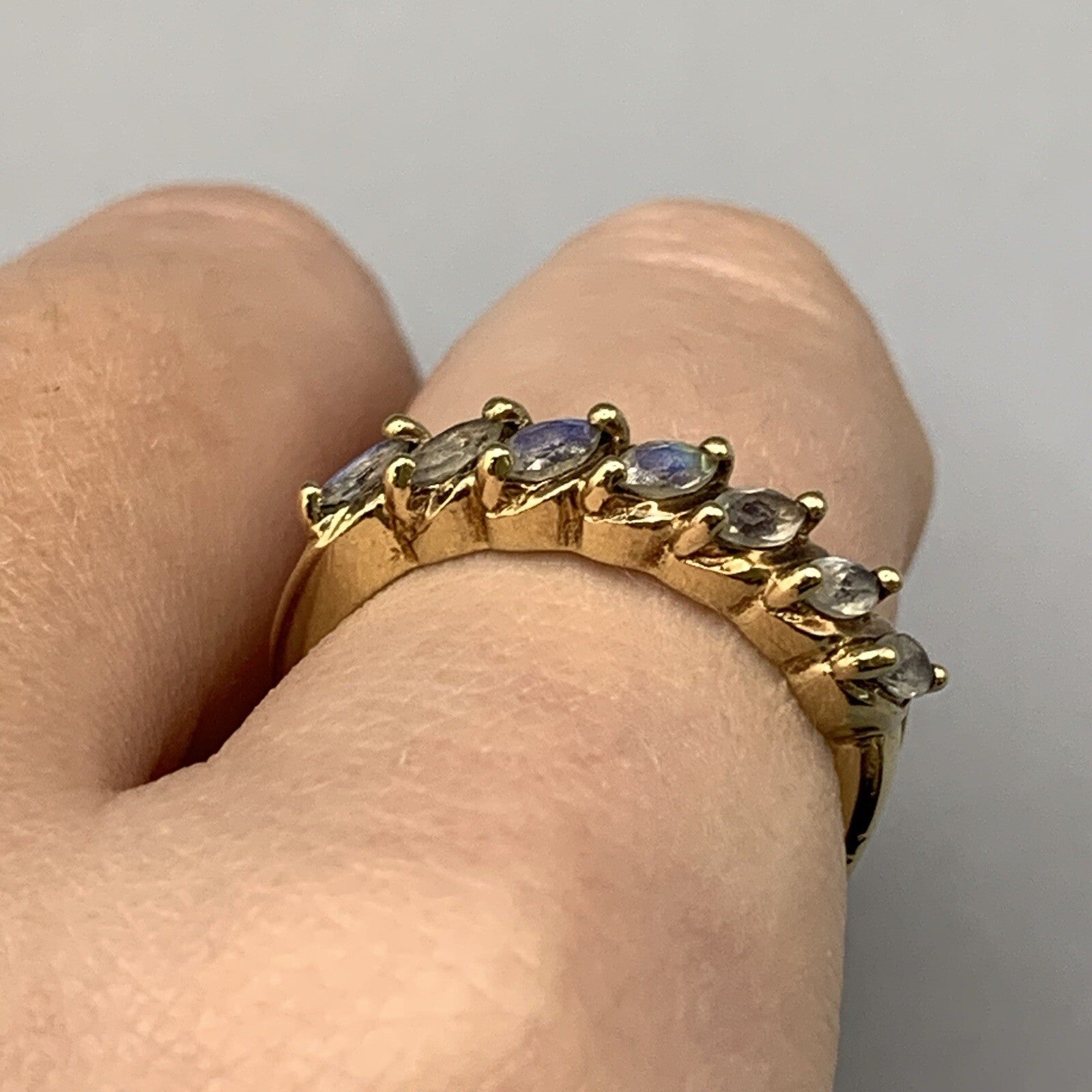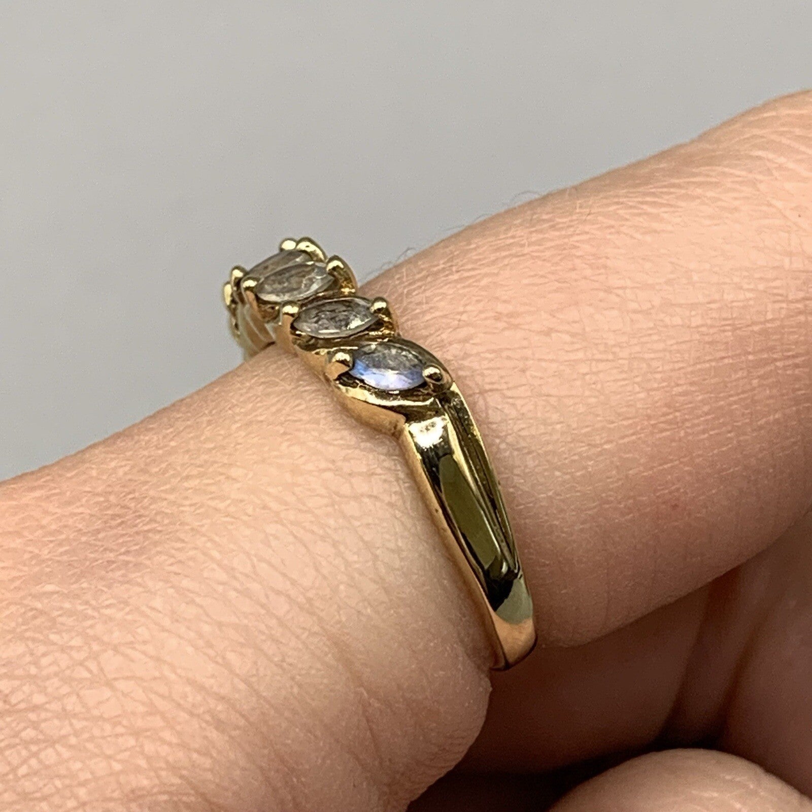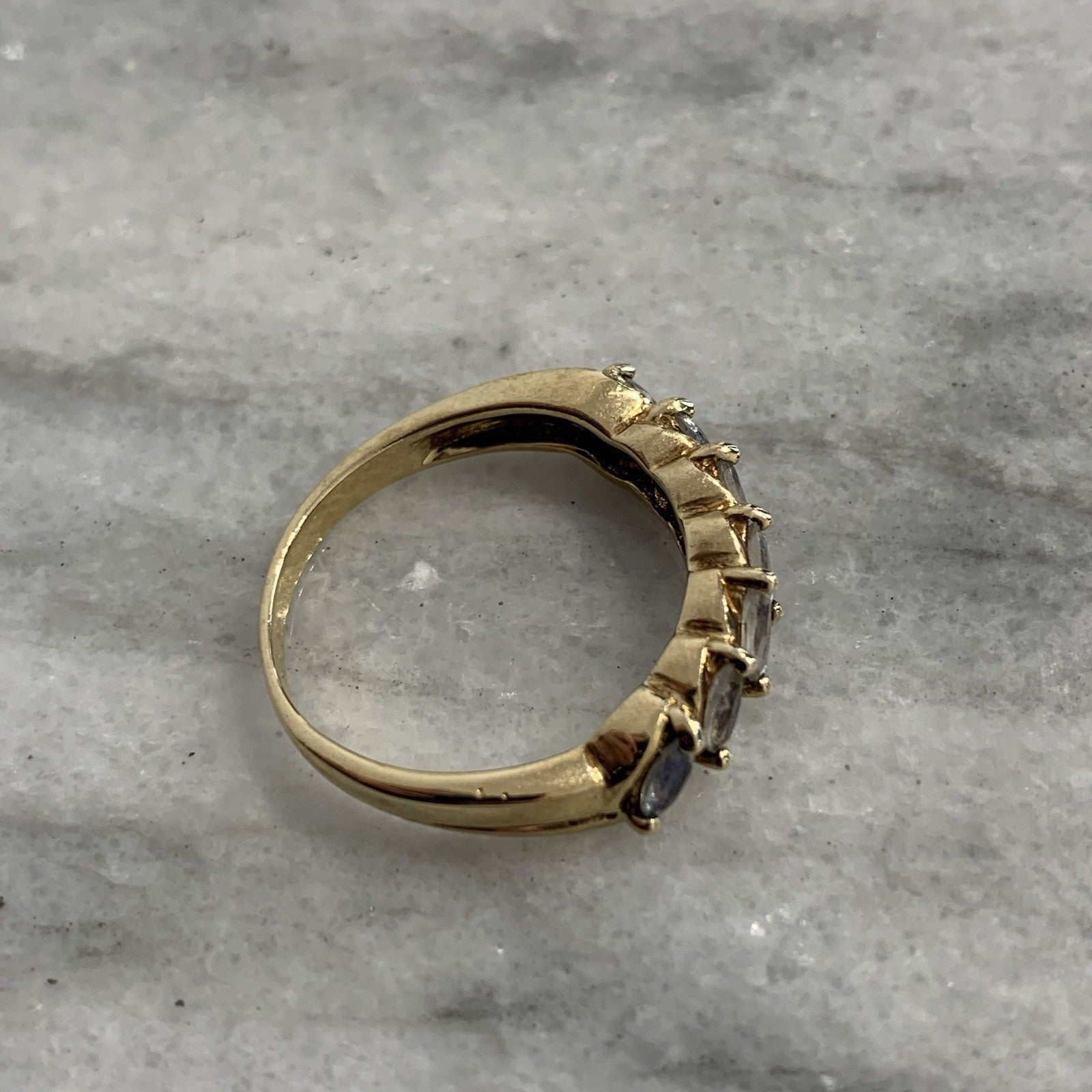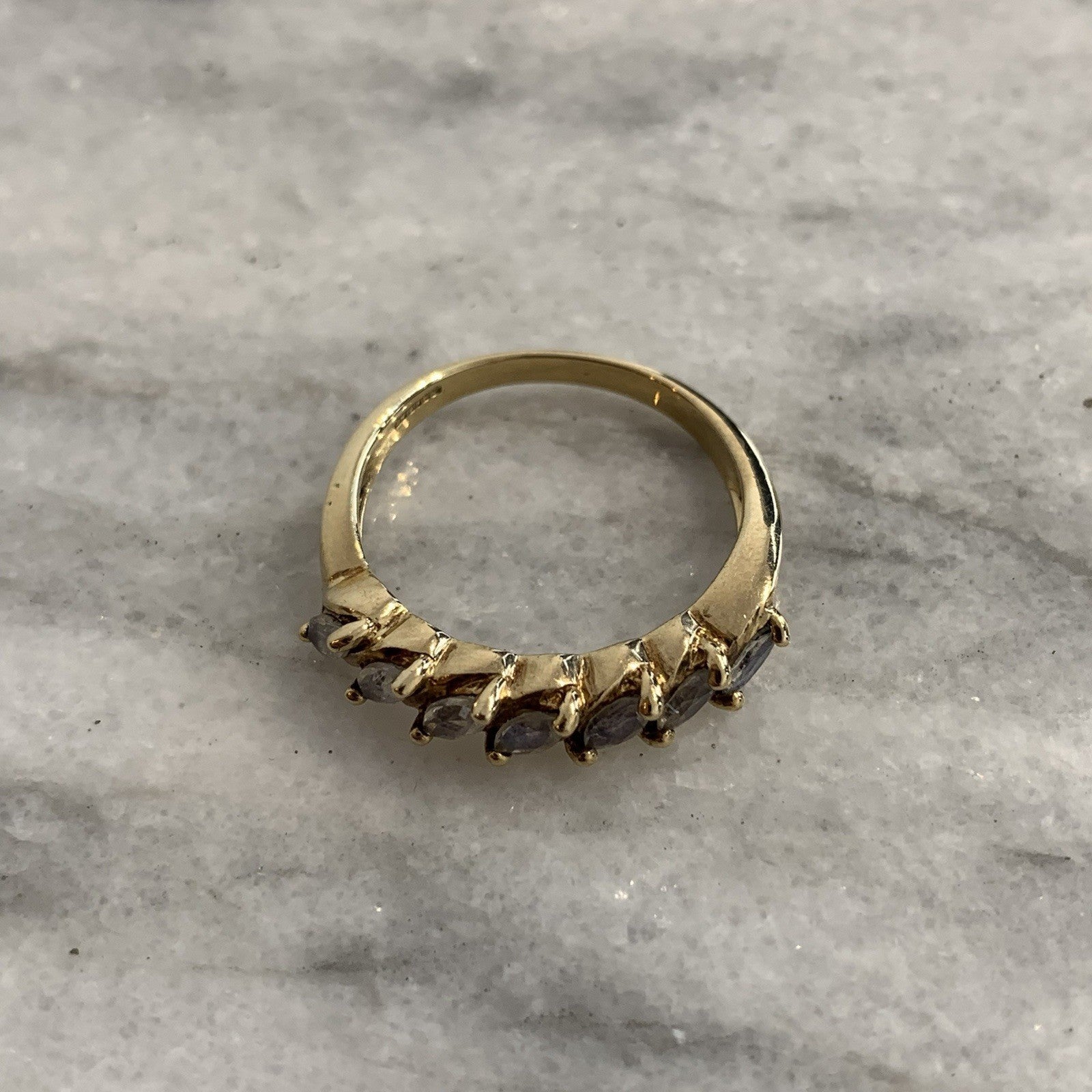 A beautiful gold ring showcasing a row of six marquise cut mystic quartz stones in 375 yellow gold.