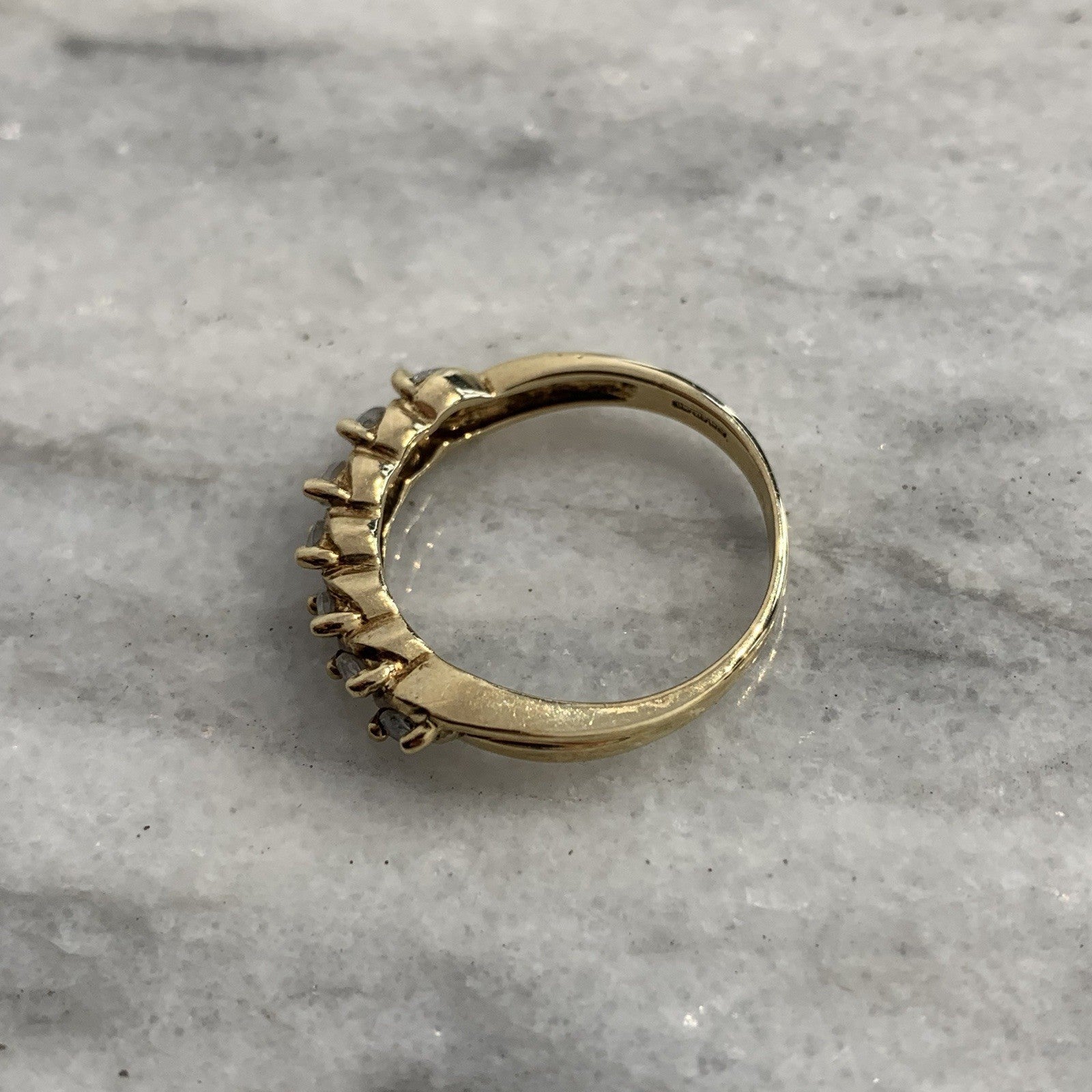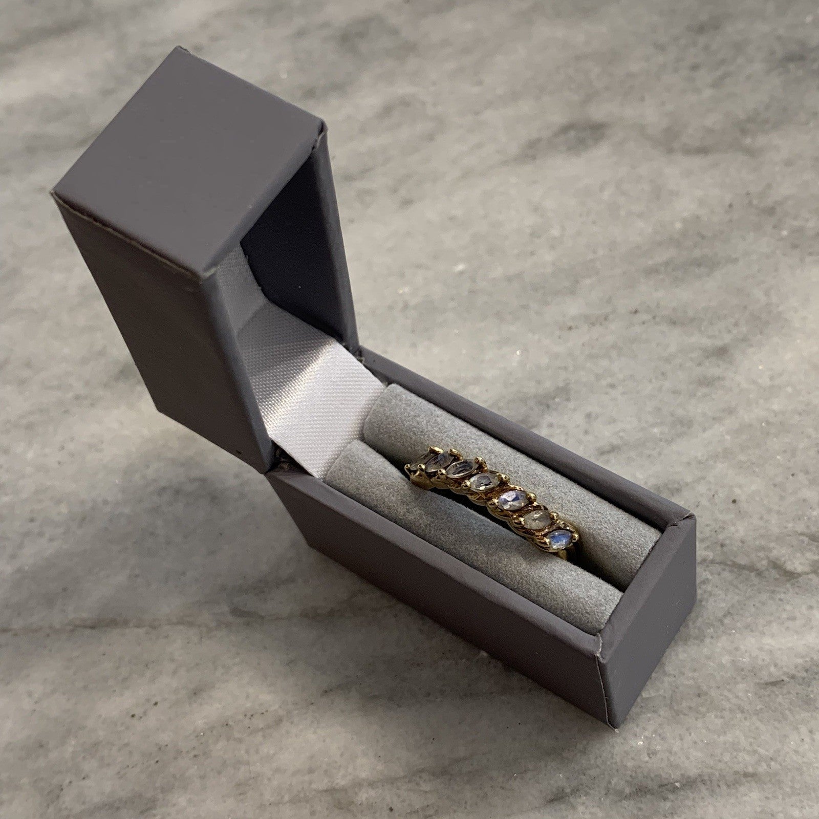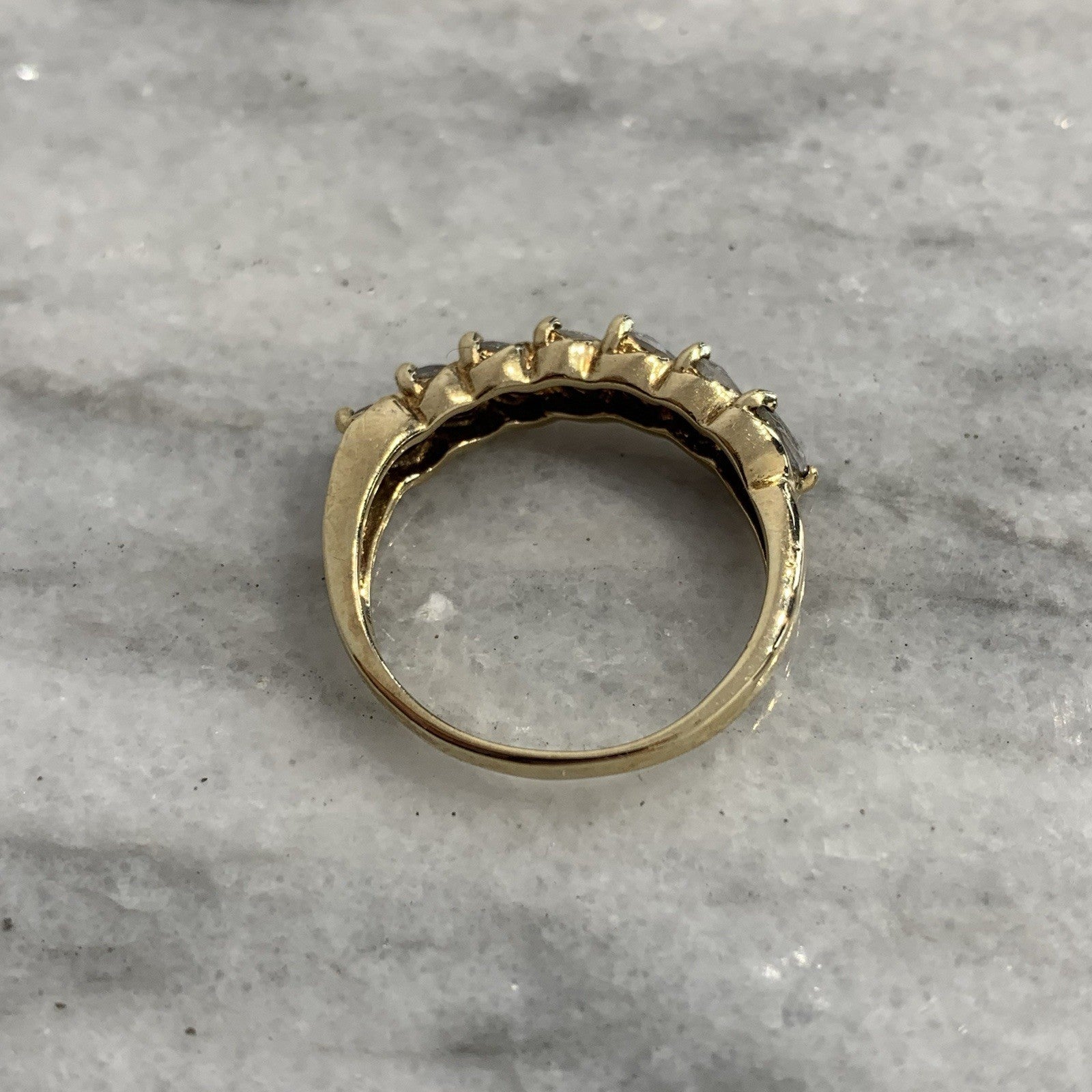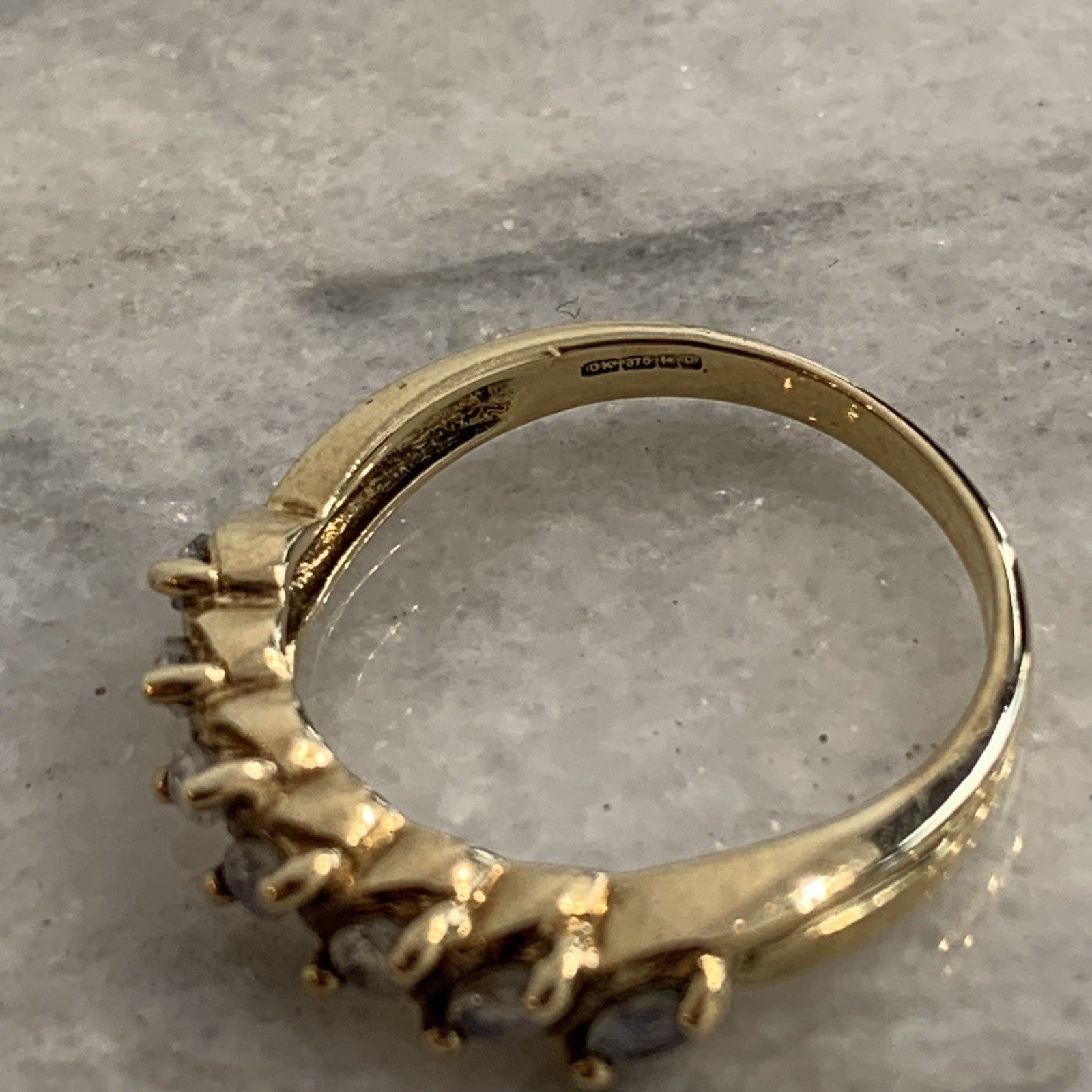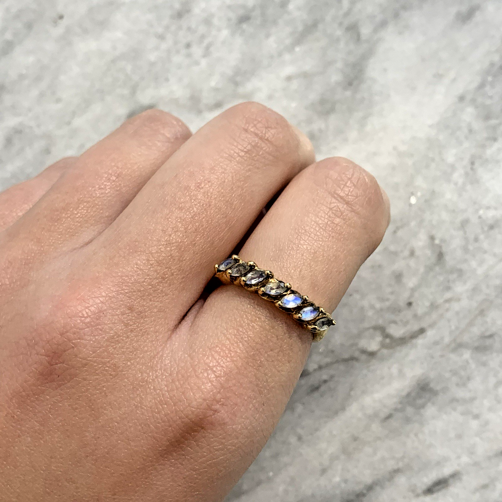 A beautiful gold ring showcasing a row of six marquise cut mystic quartz stones in 375 yellow gold.