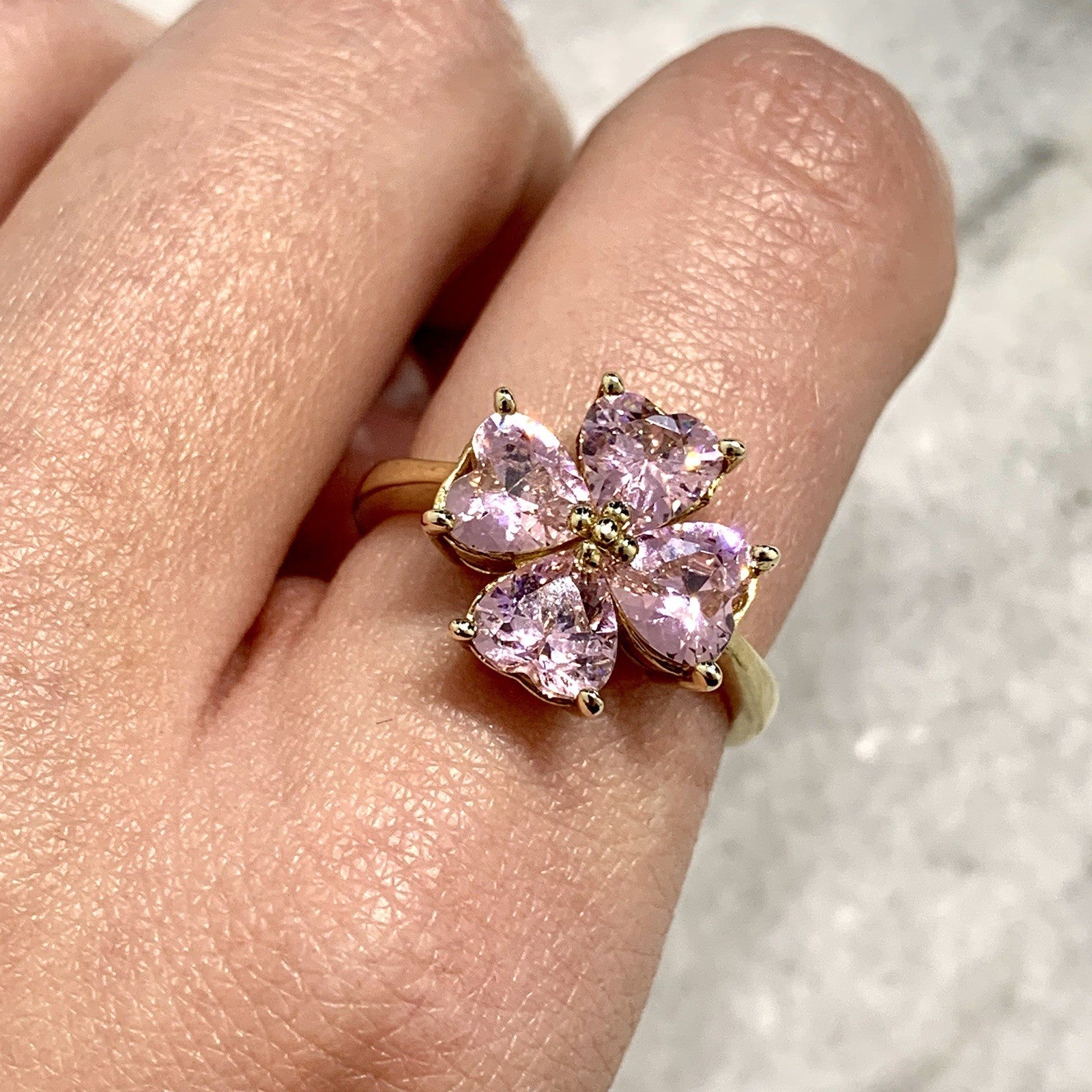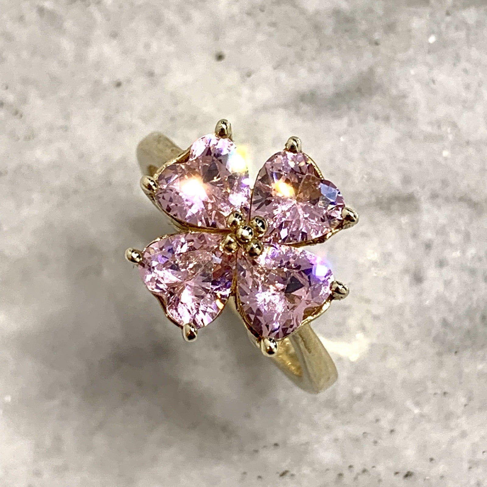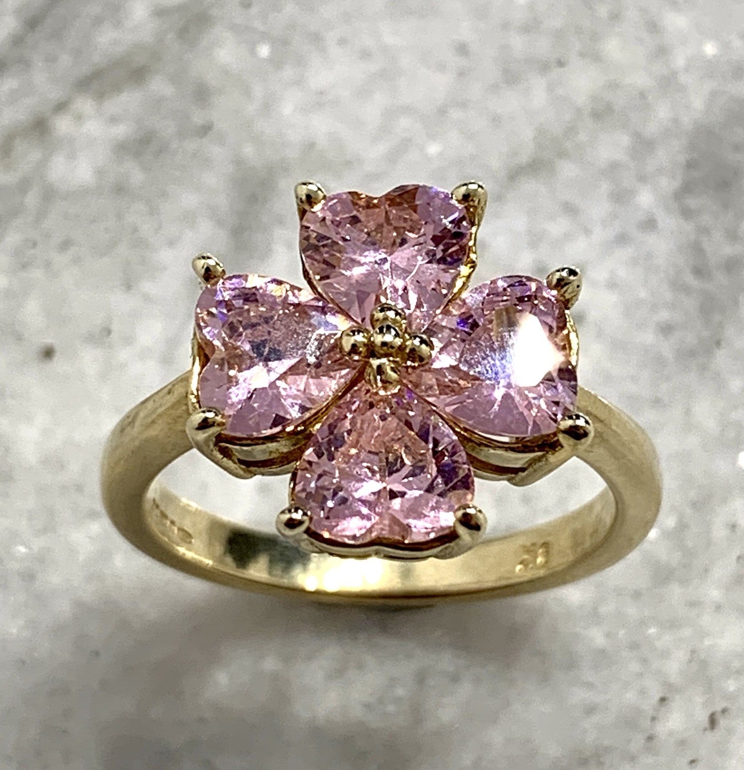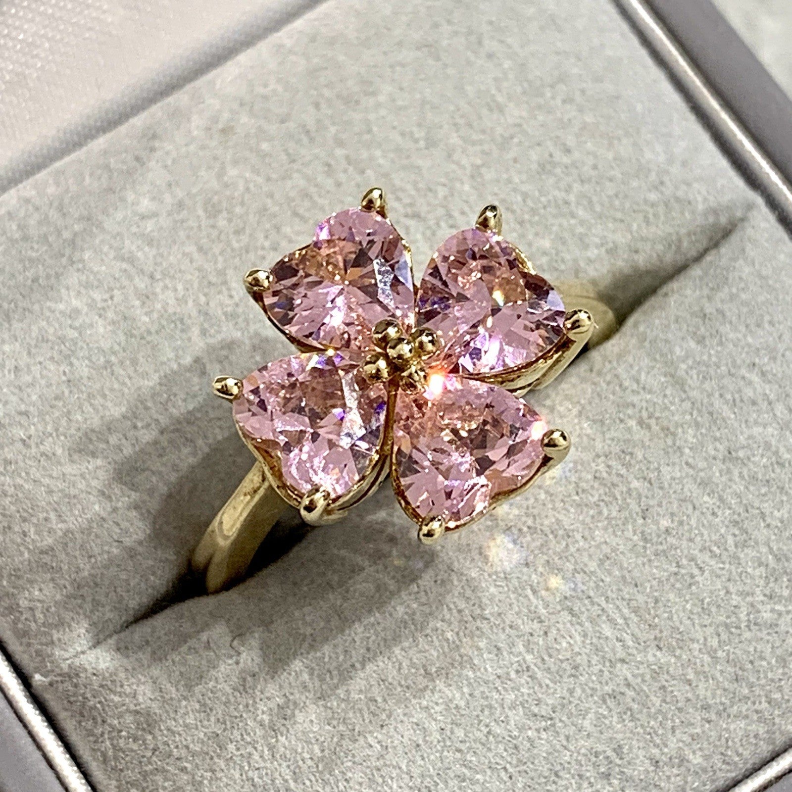 A stunning gold ring showcasing a quartet of pink heart cut cubic zirconia gemstones in a four leaf clover, floral style cluster.