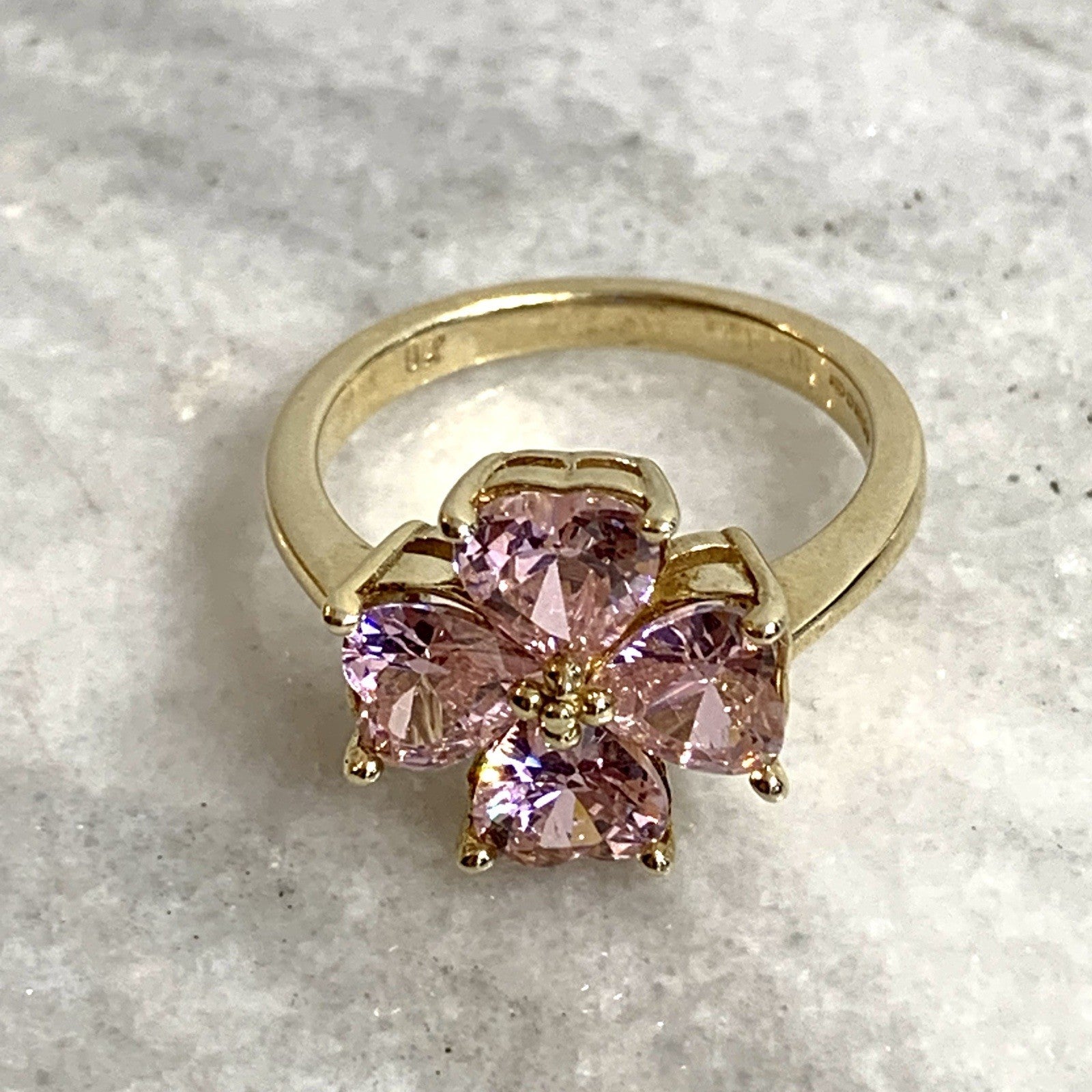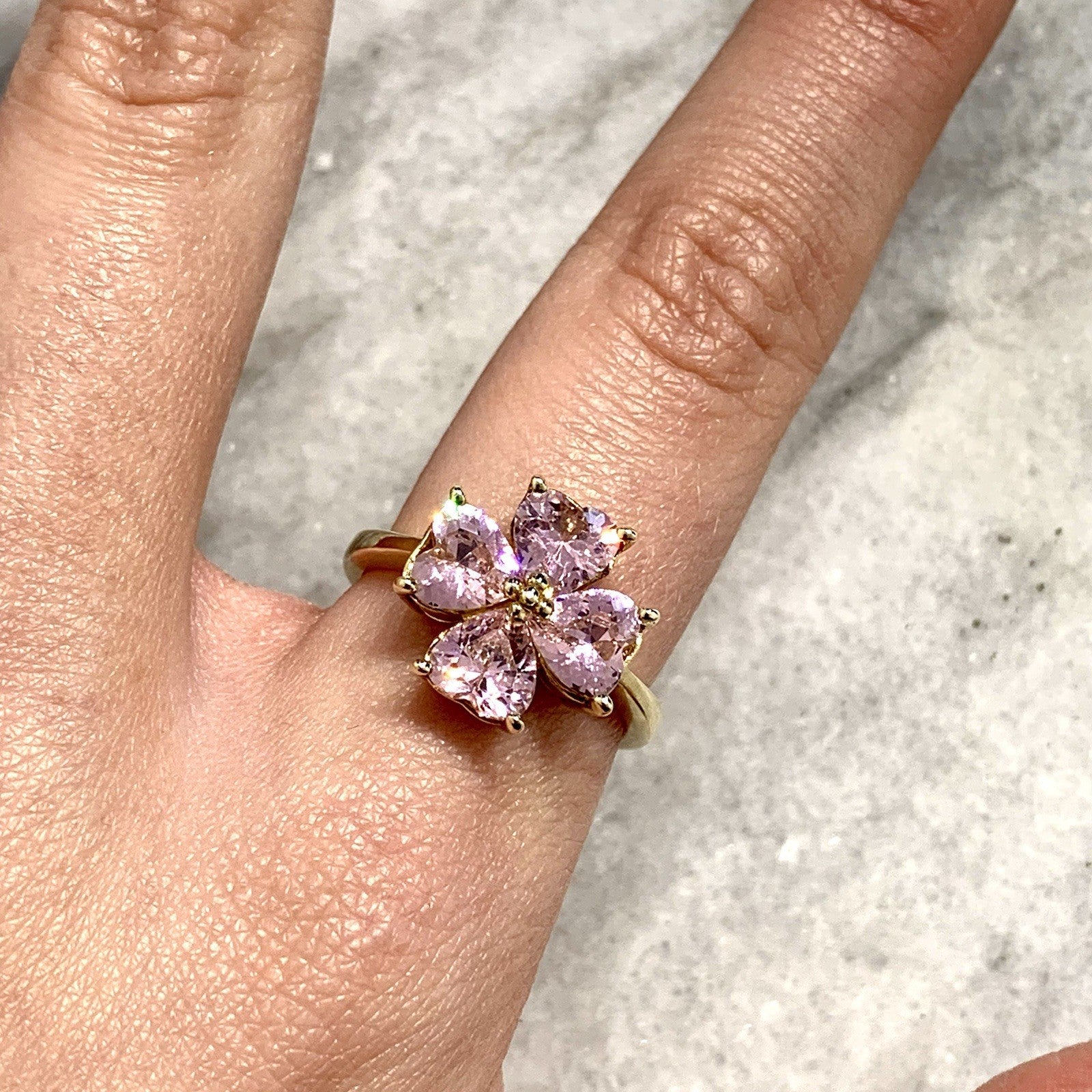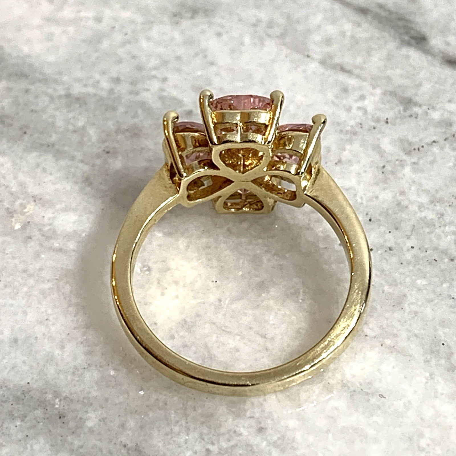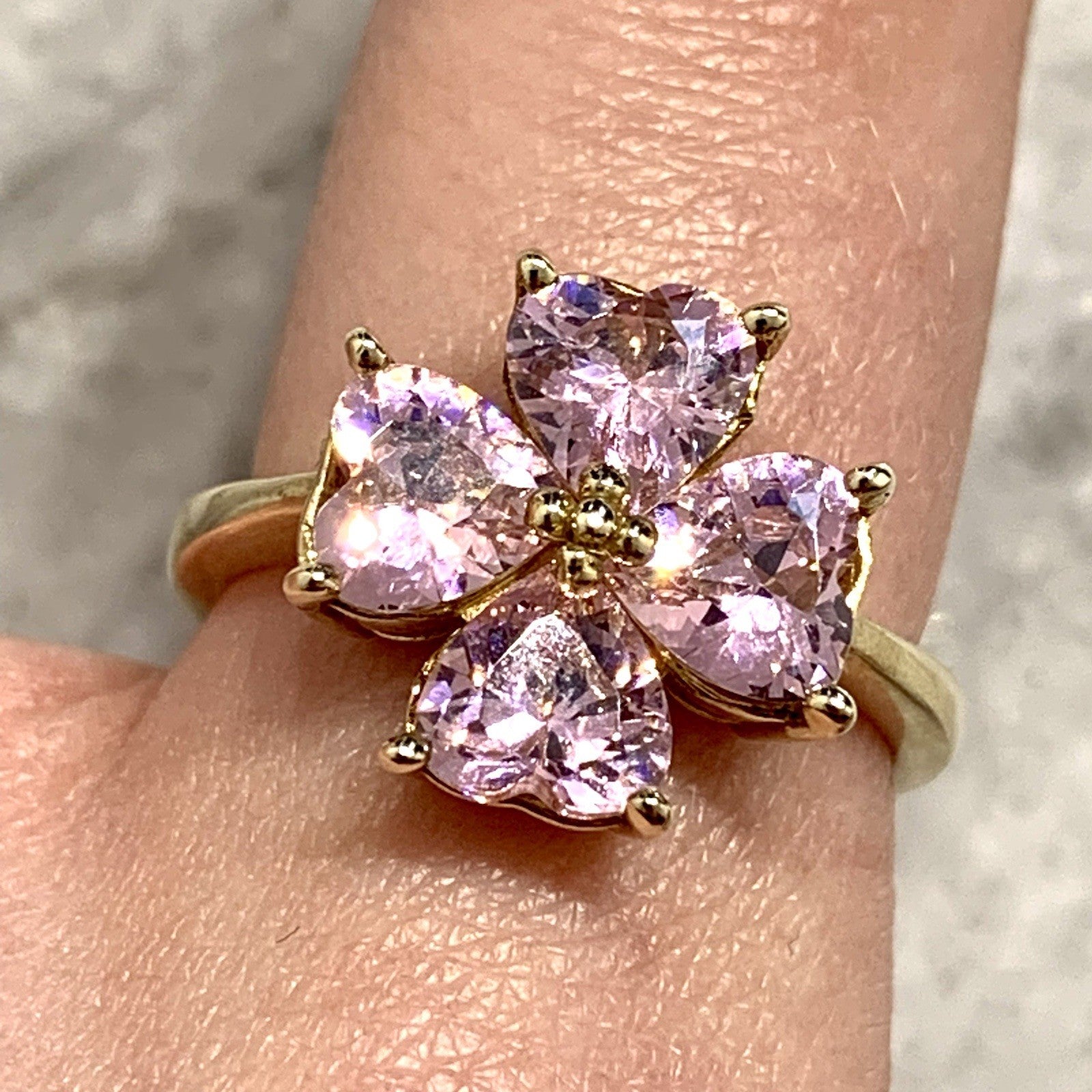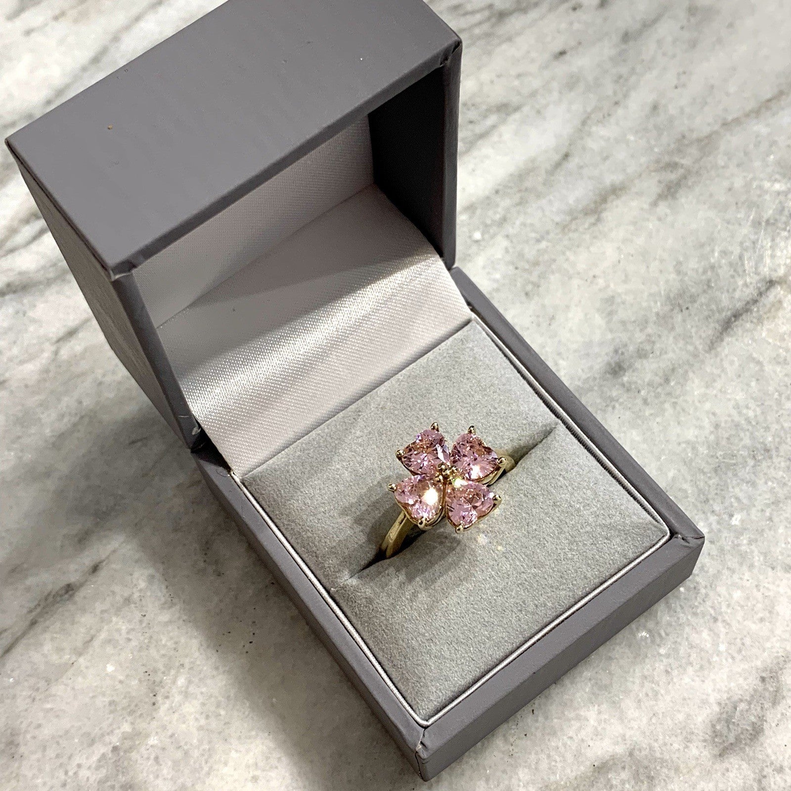 A stunning gold ring showcasing a quartet of pink heart cut cubic zirconia gemstones in a four leaf clover, floral style cluster.