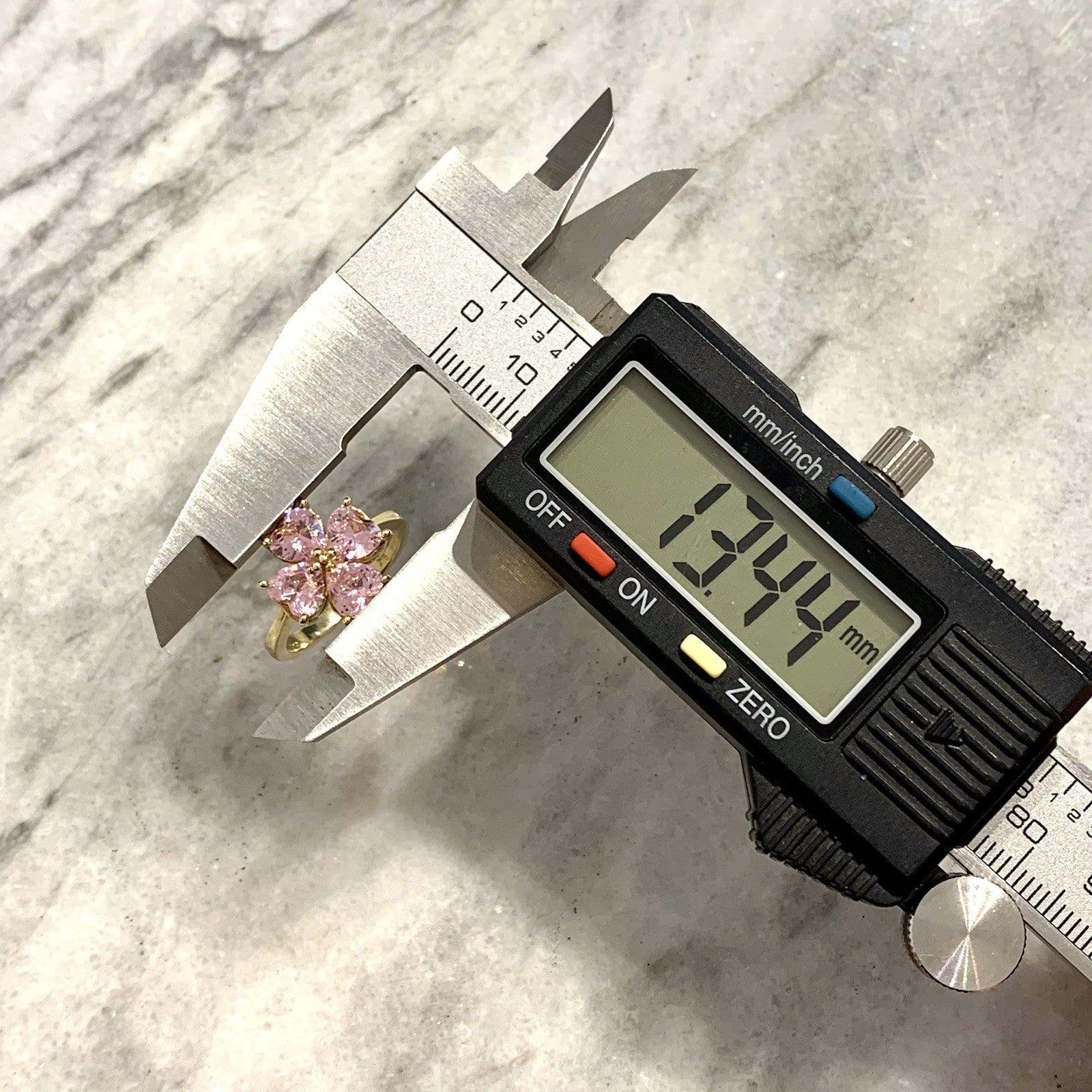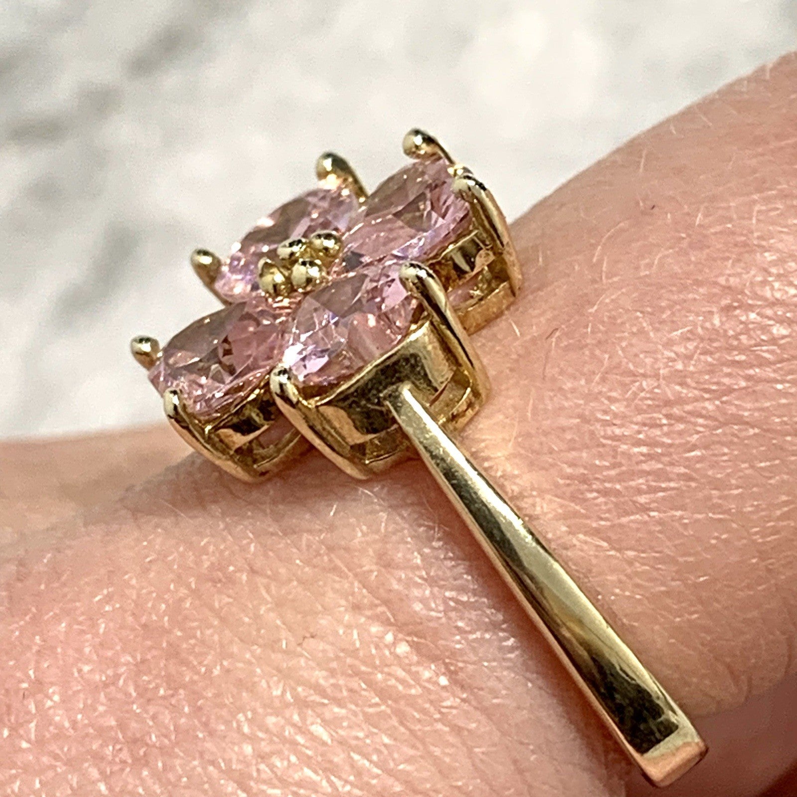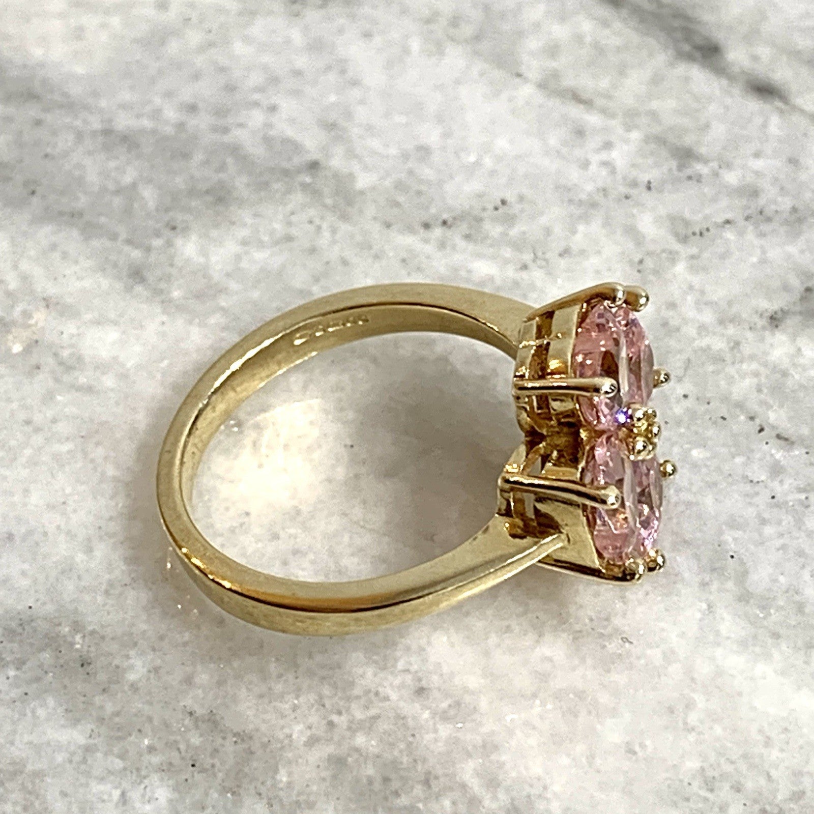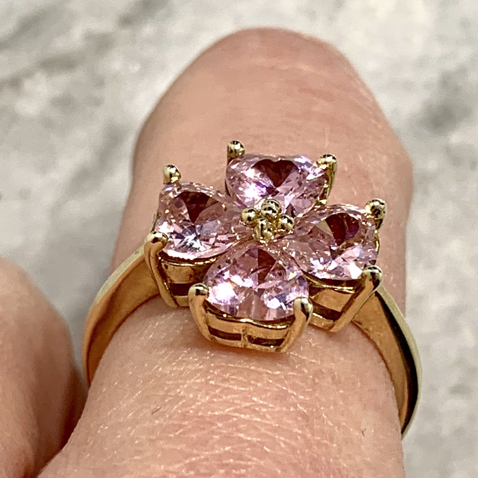 A stunning gold ring showcasing a quartet of pink heart cut cubic zirconia gemstones in a four leaf clover, floral style cluster.