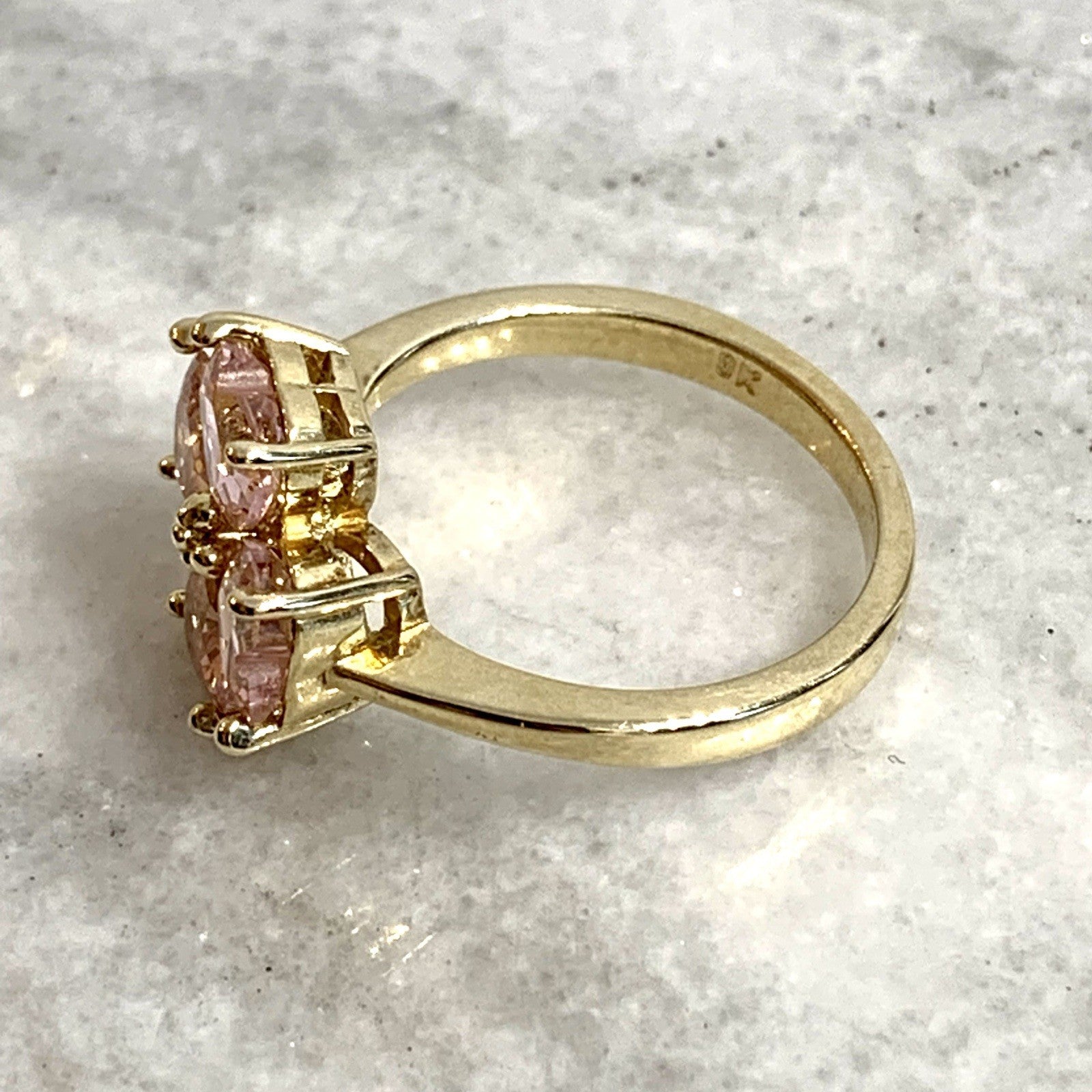 9 ct Gold Ring Pink CZ Heart Cut Floral Clover Cluster 375 Yellow Gold - Size O