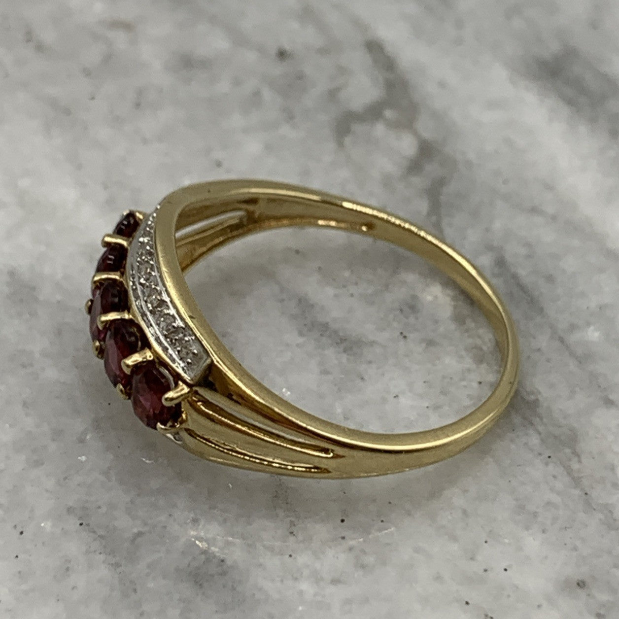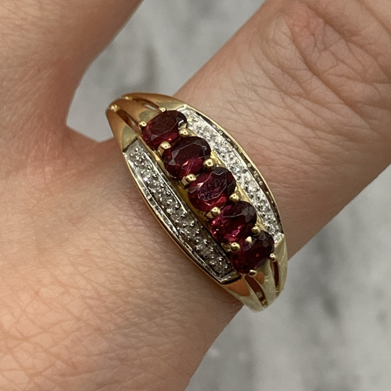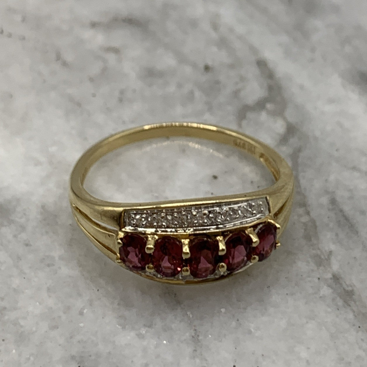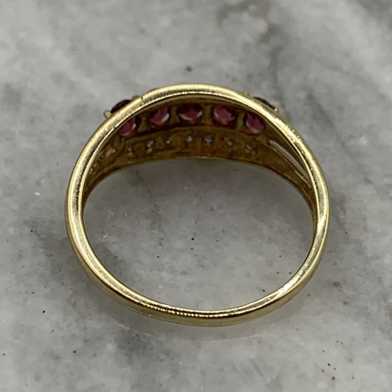 - A beautiful gold band ring featuring five pink tourmaline gemstones accented by parallel rows of petite diamonds. Hallmarked.