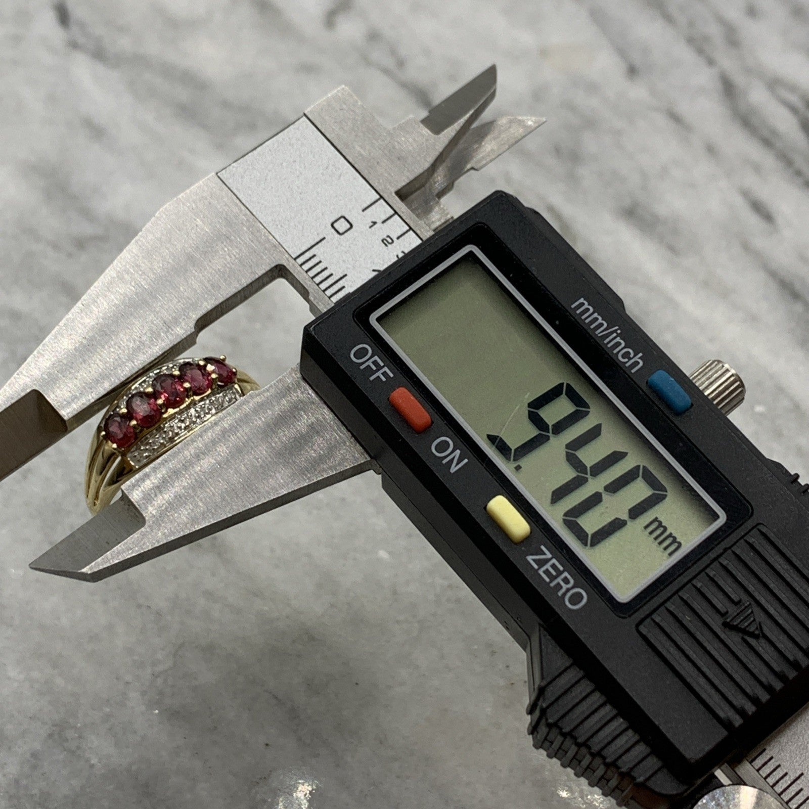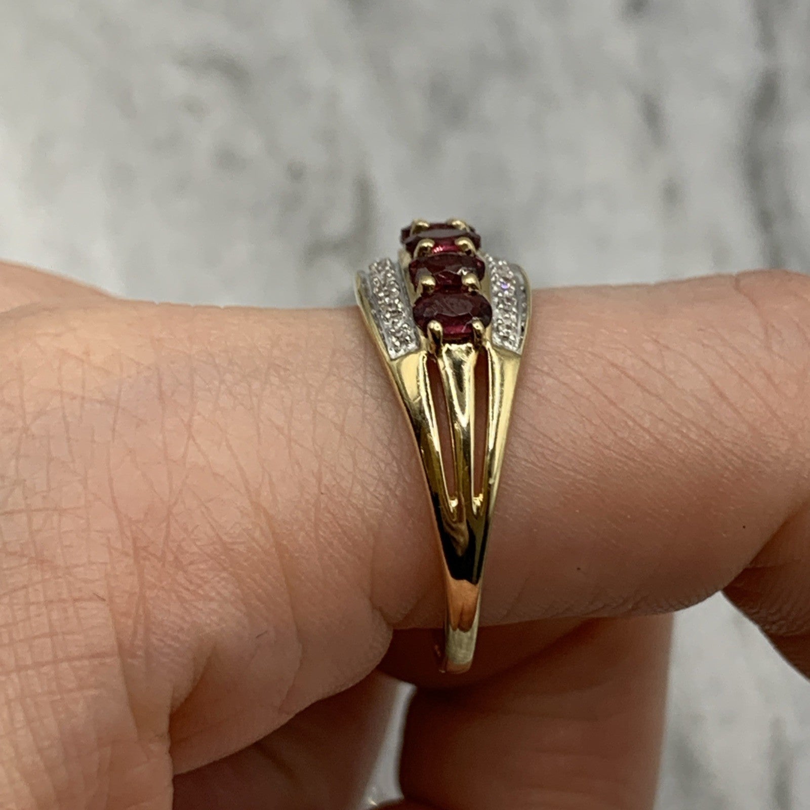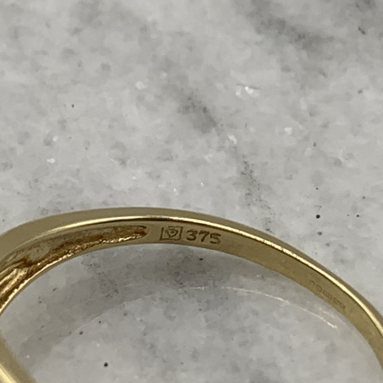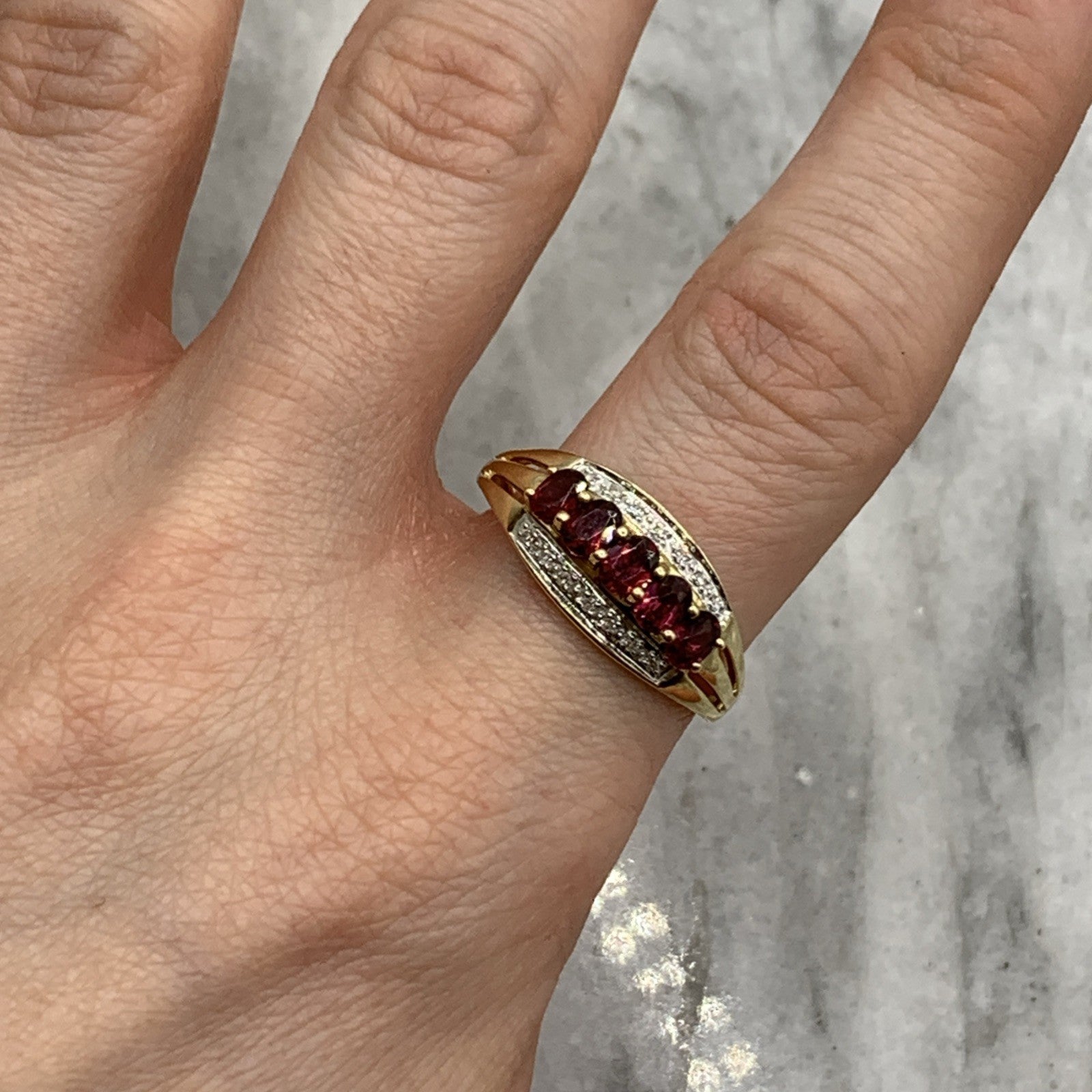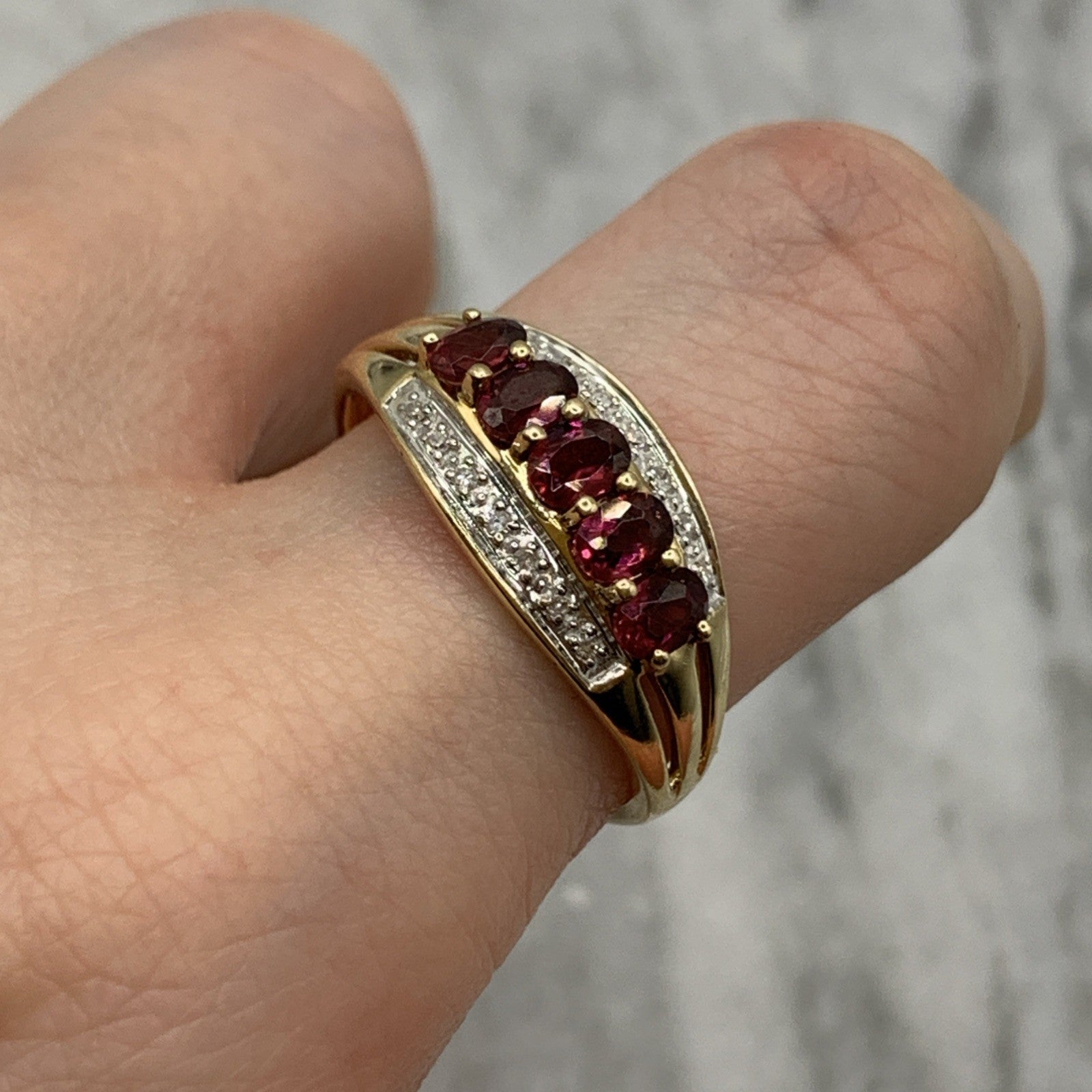 - A beautiful gold band ring featuring five pink tourmaline gemstones accented by parallel rows of petite diamonds. Hallmarked.